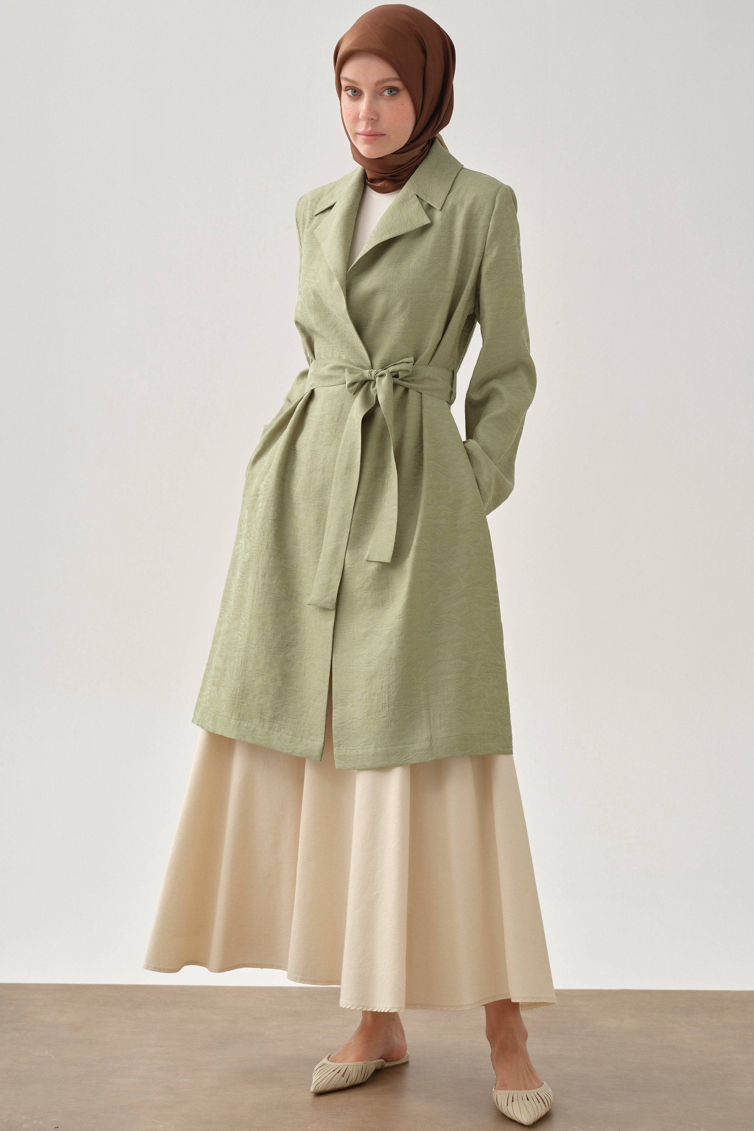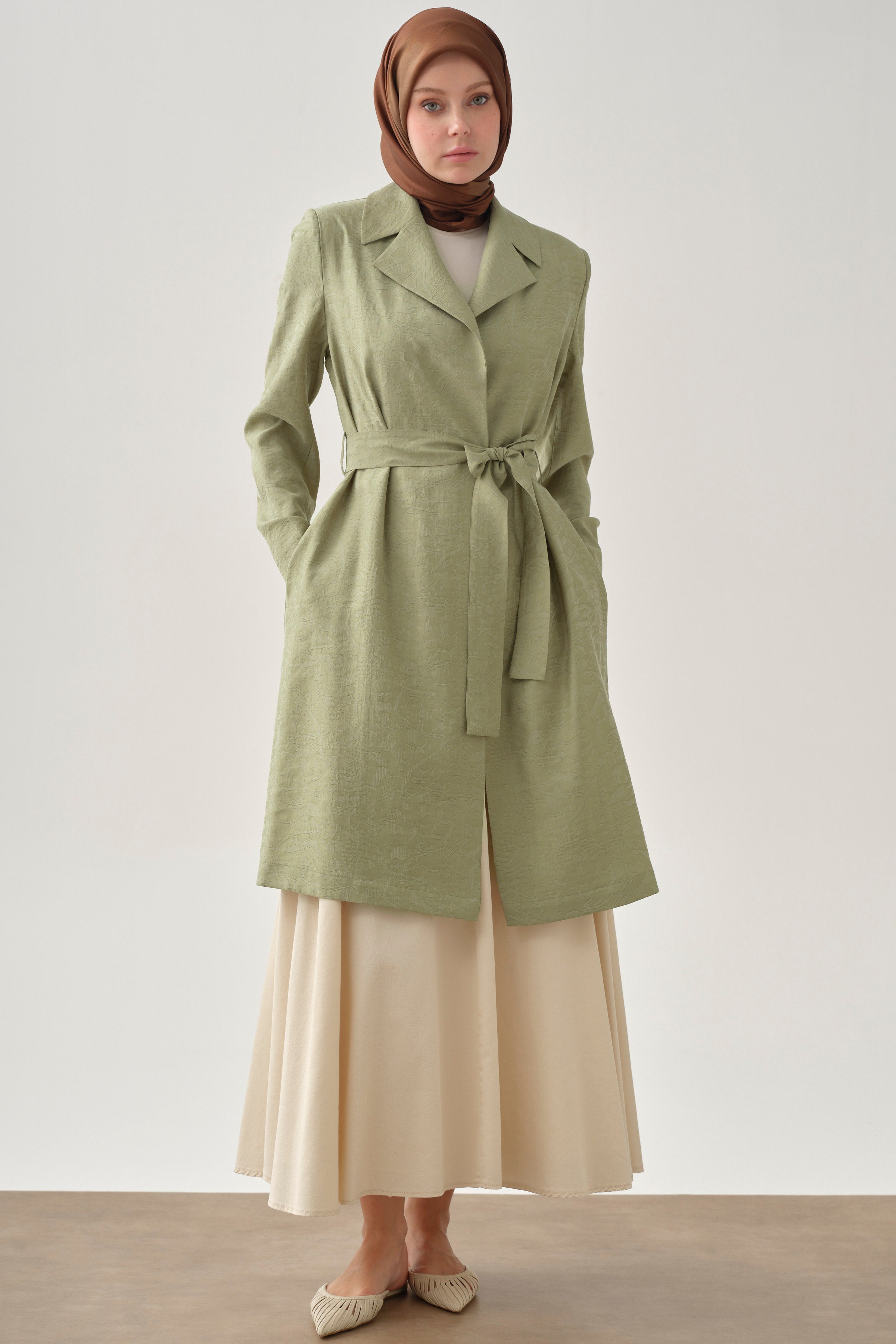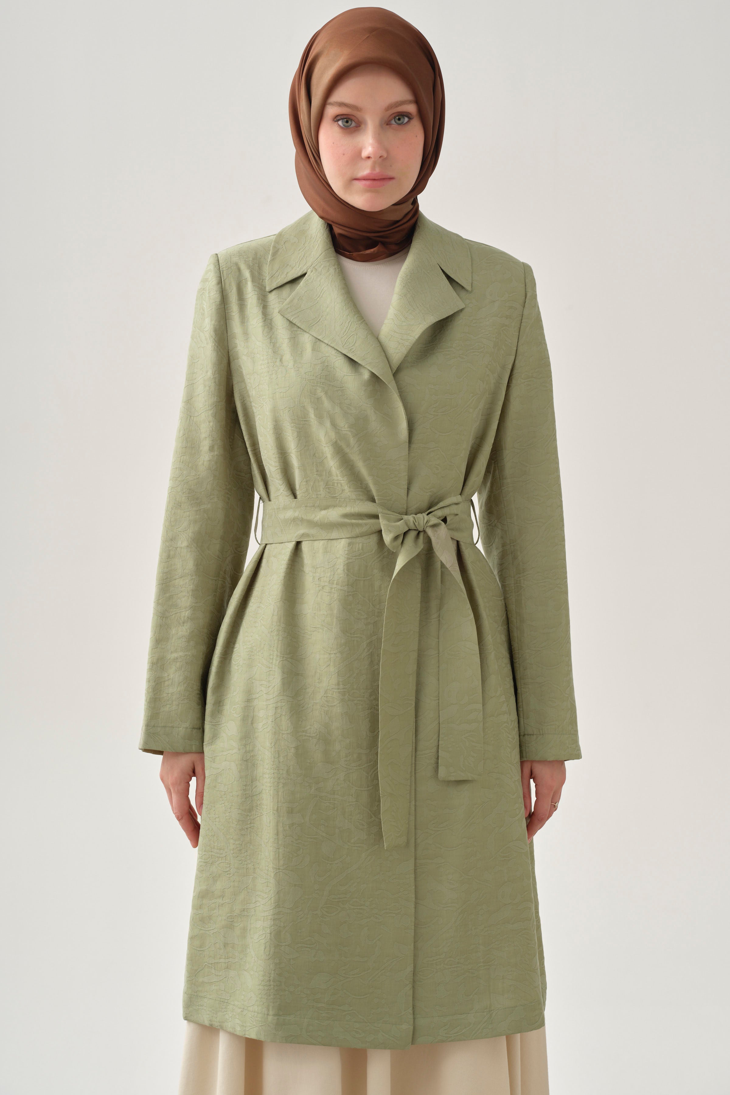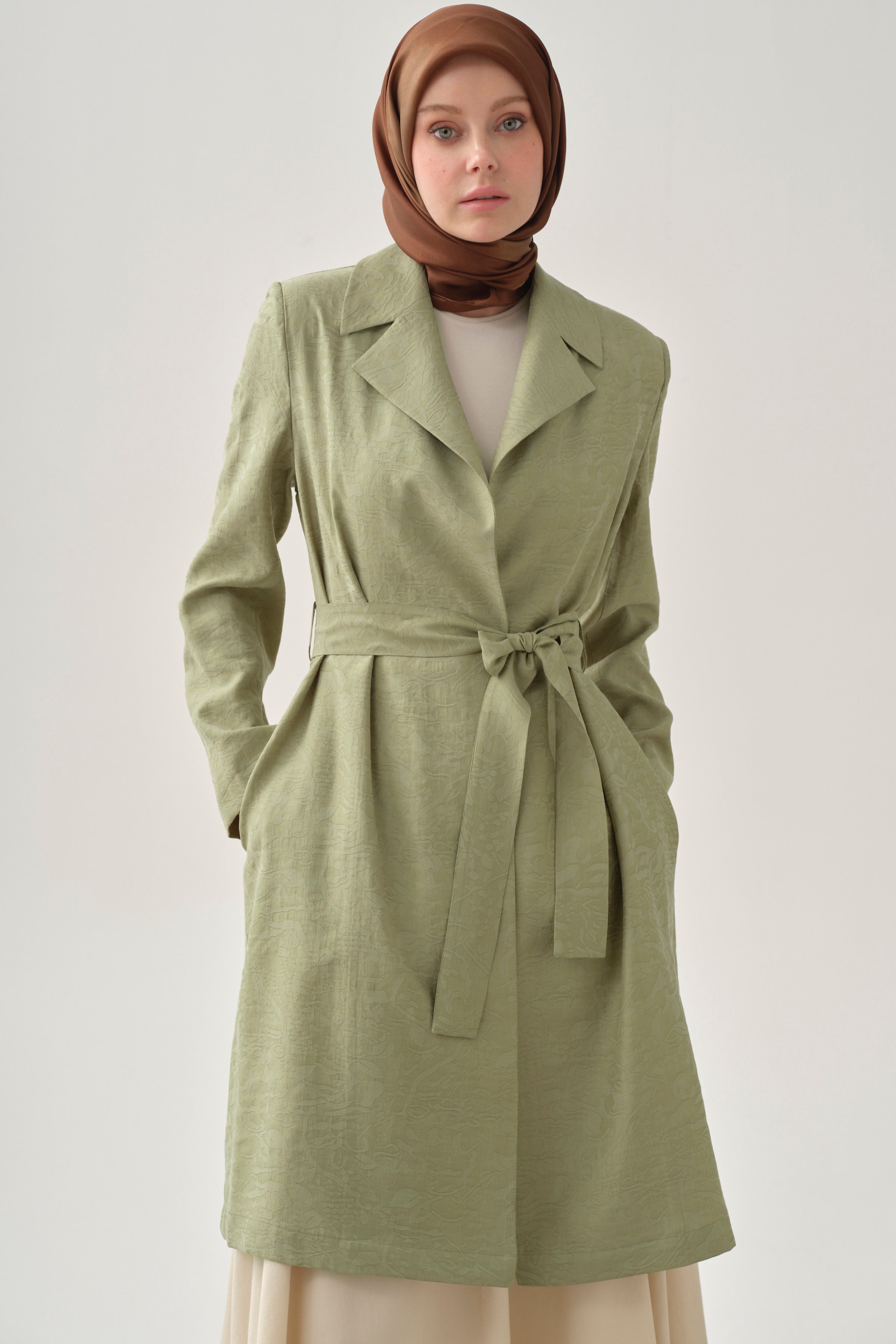 Zarif jakar dokusu ve kuşak detayıyla feminen bir siluet sunan bu ceket, şıklığı ön plana çıkarır. Özel günlerden günlük kombinlere kadar geniş bir kullanım alanı sunar.
