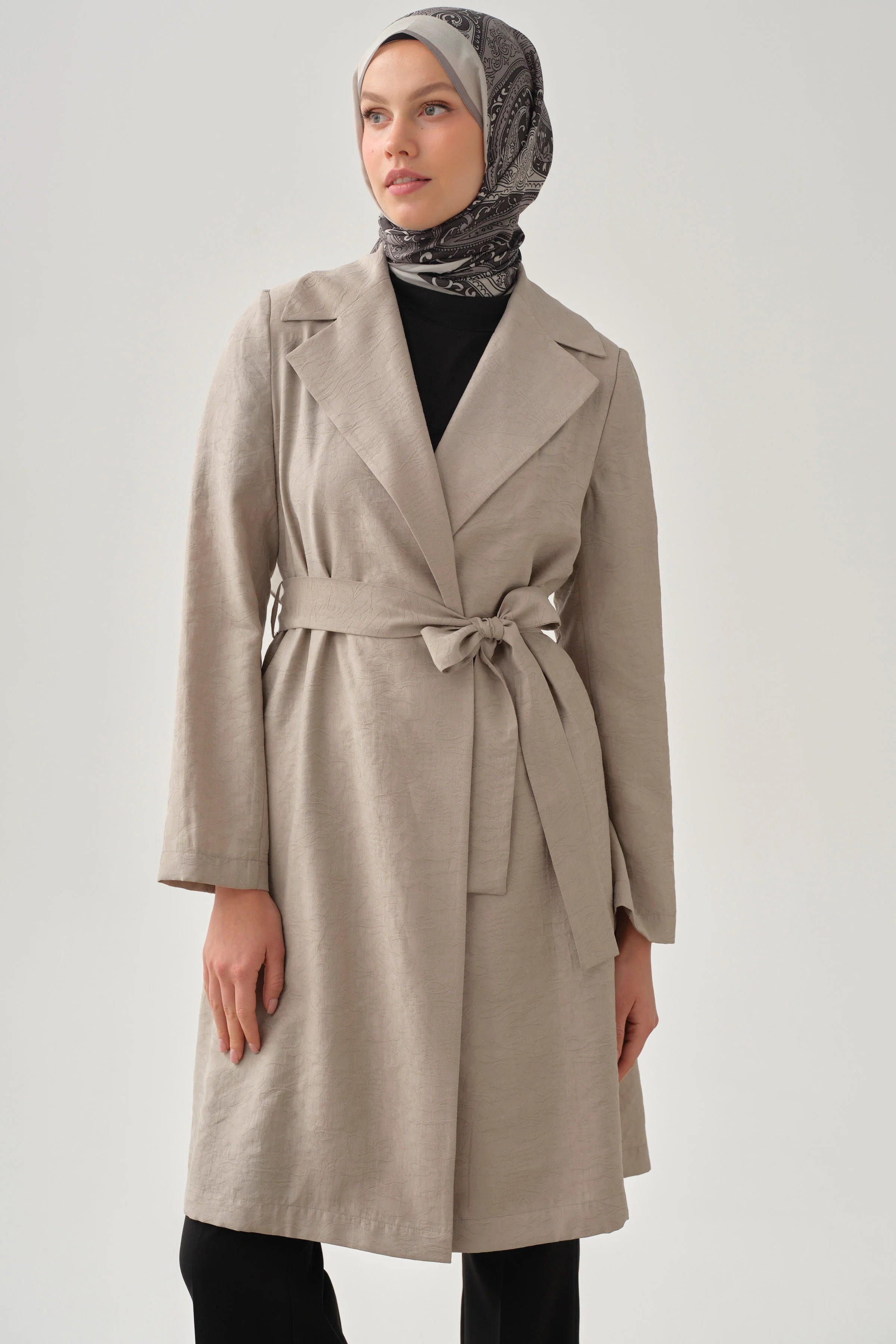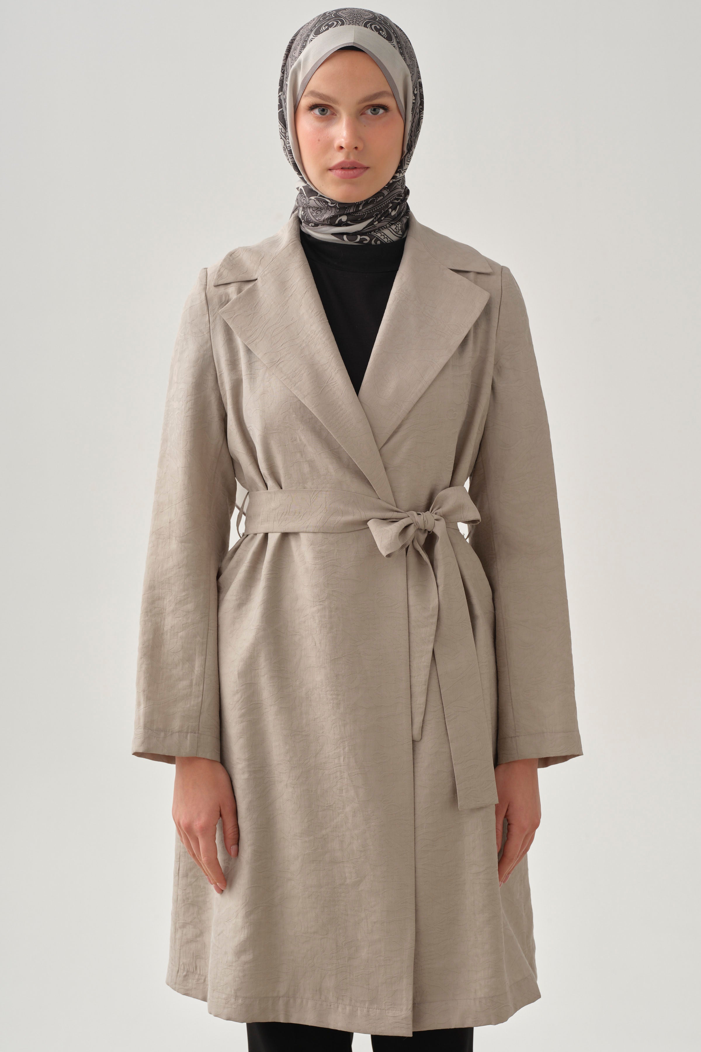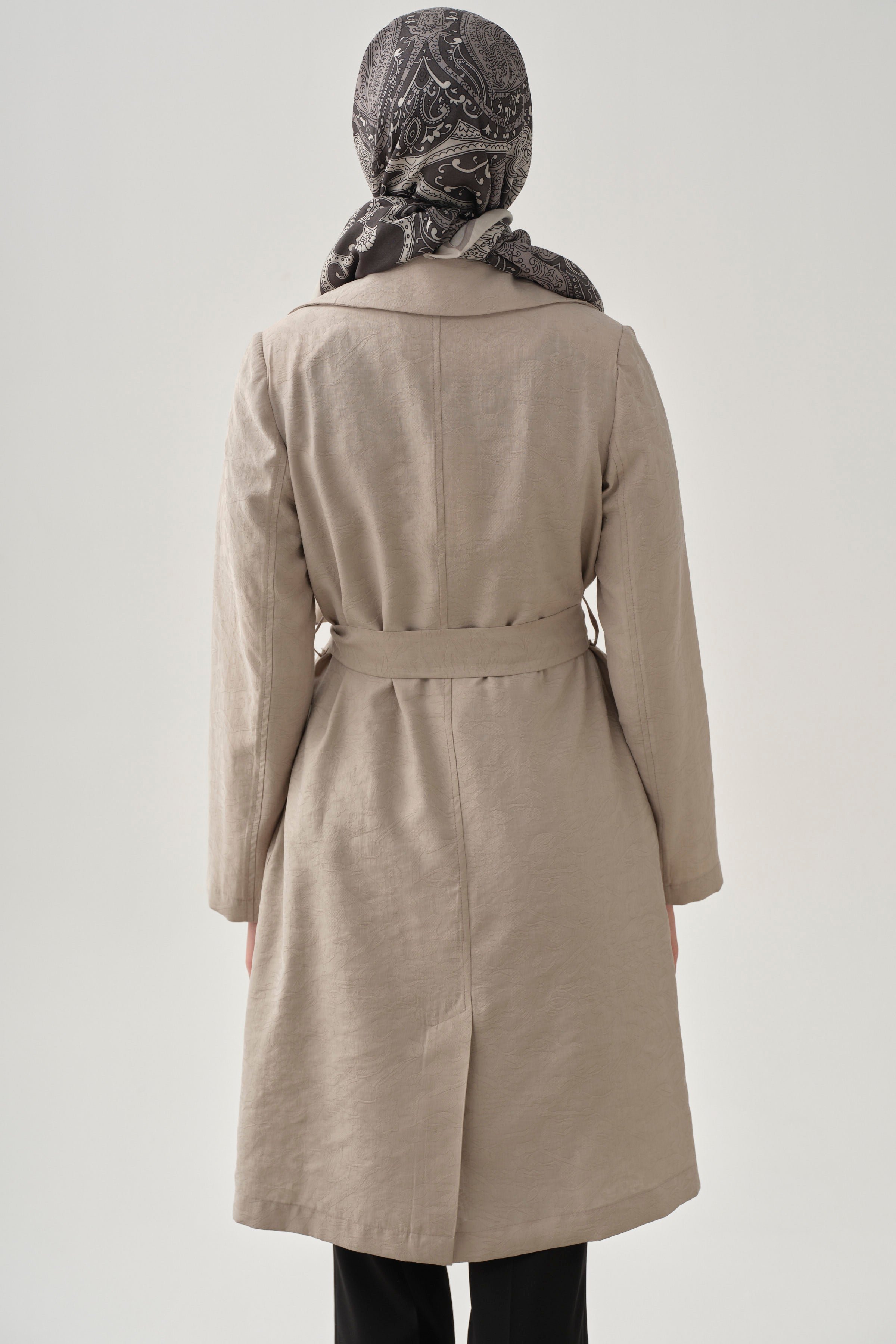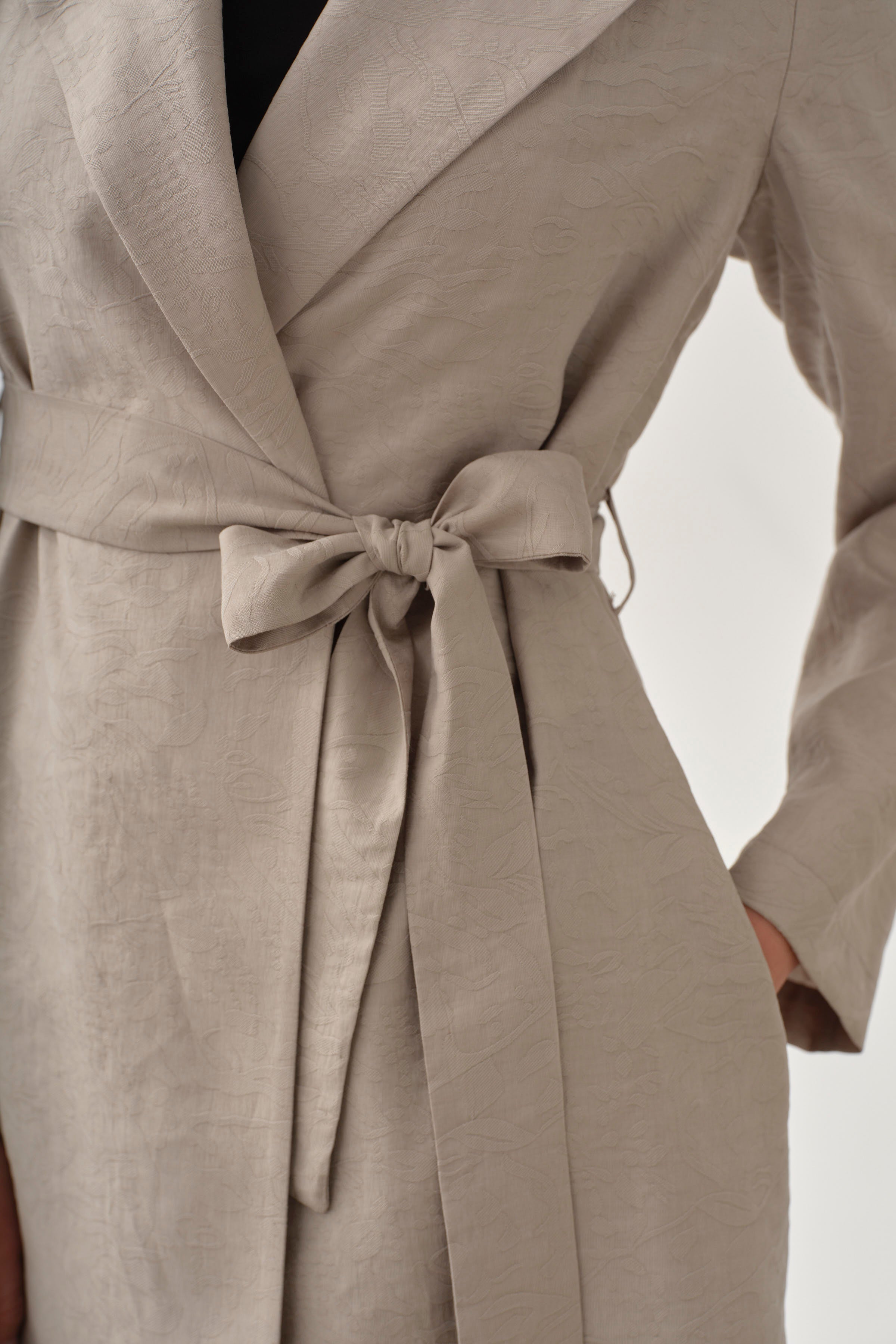 Zarif jakar dokusu ve kuşak detayıyla feminen bir siluet sunan bu ceket, şıklığı ön plana çıkarır. Özel günlerden günlük kombinlere kadar geniş bir kullanım alanı sunar.
