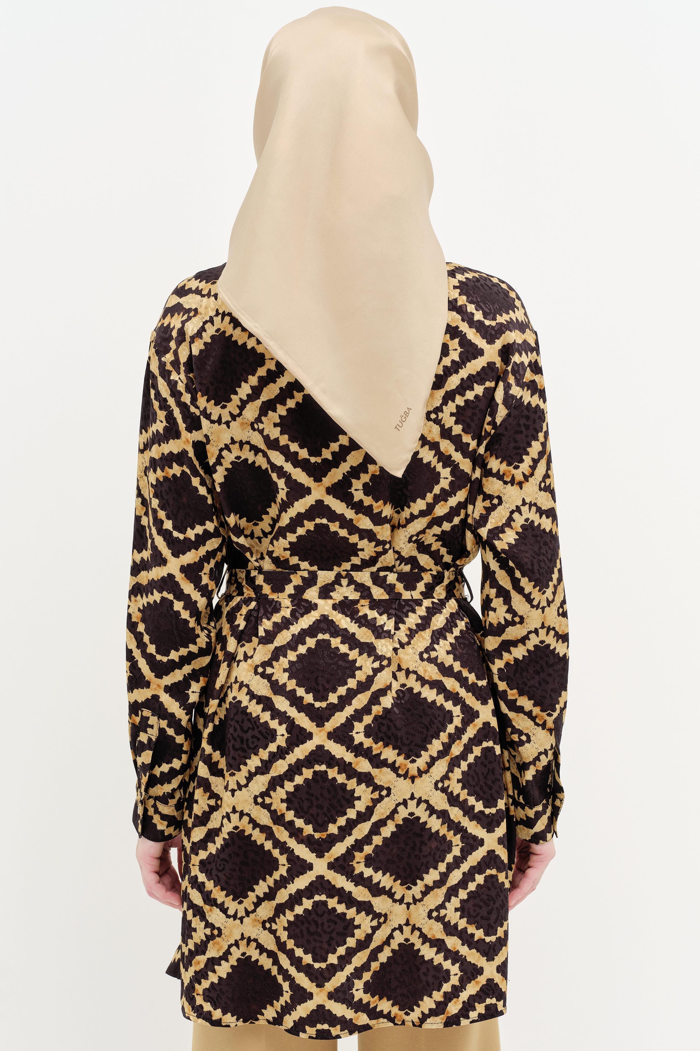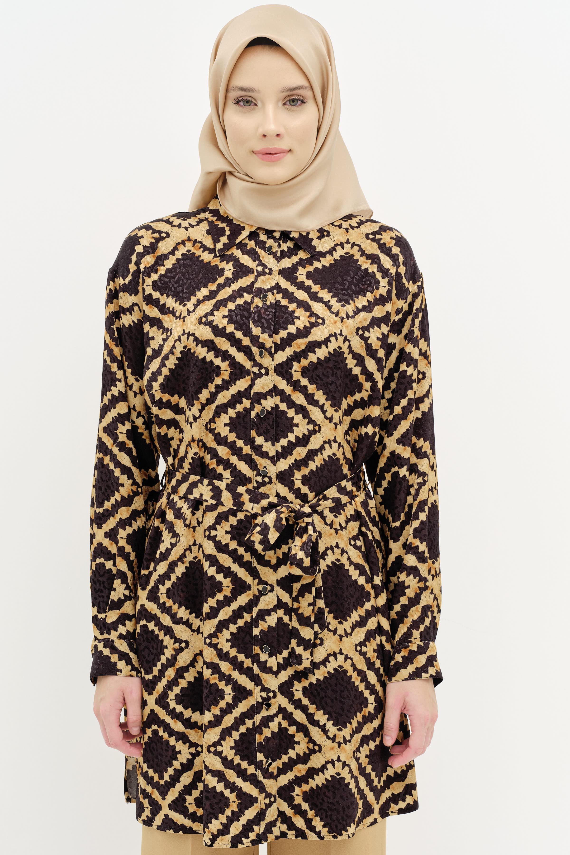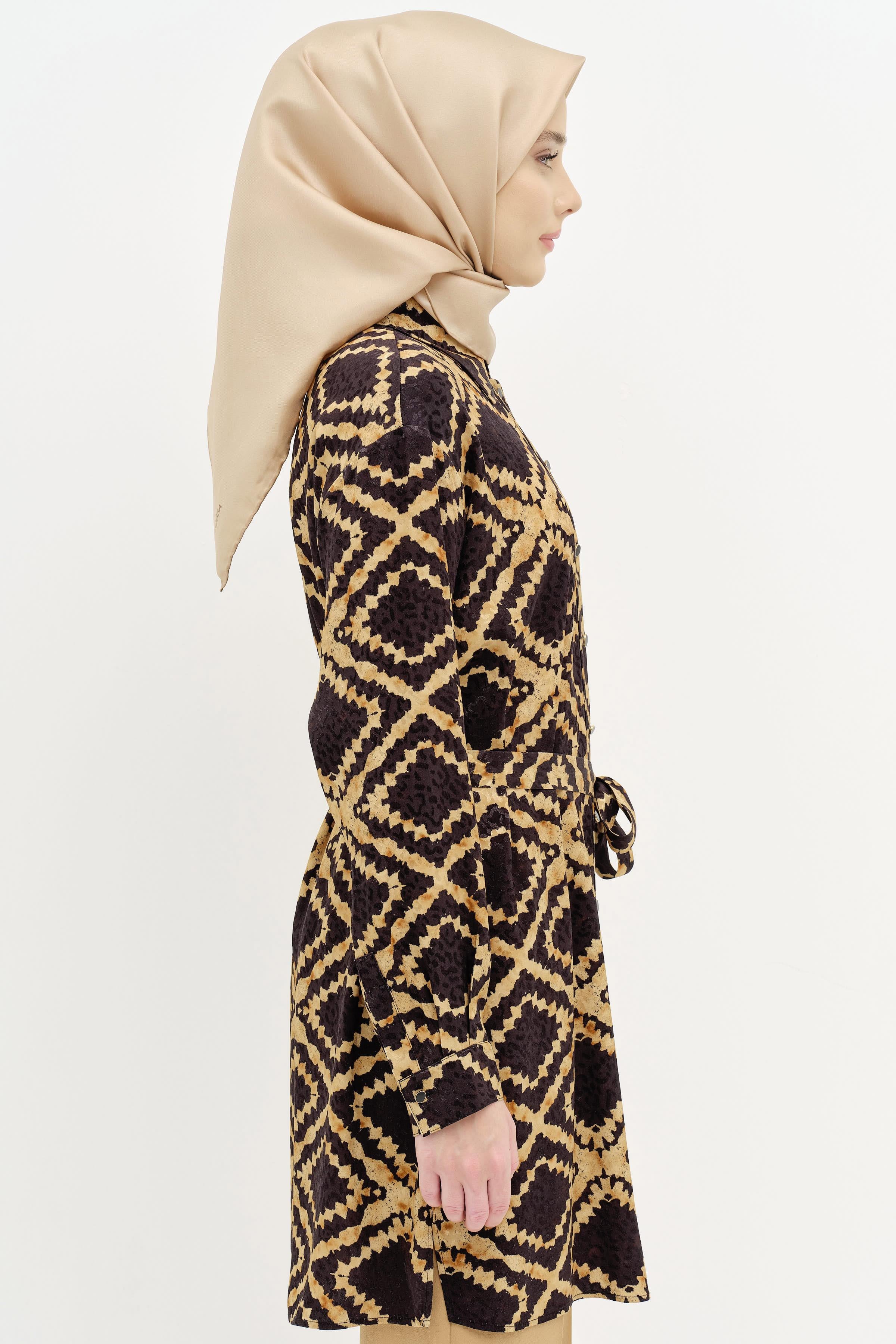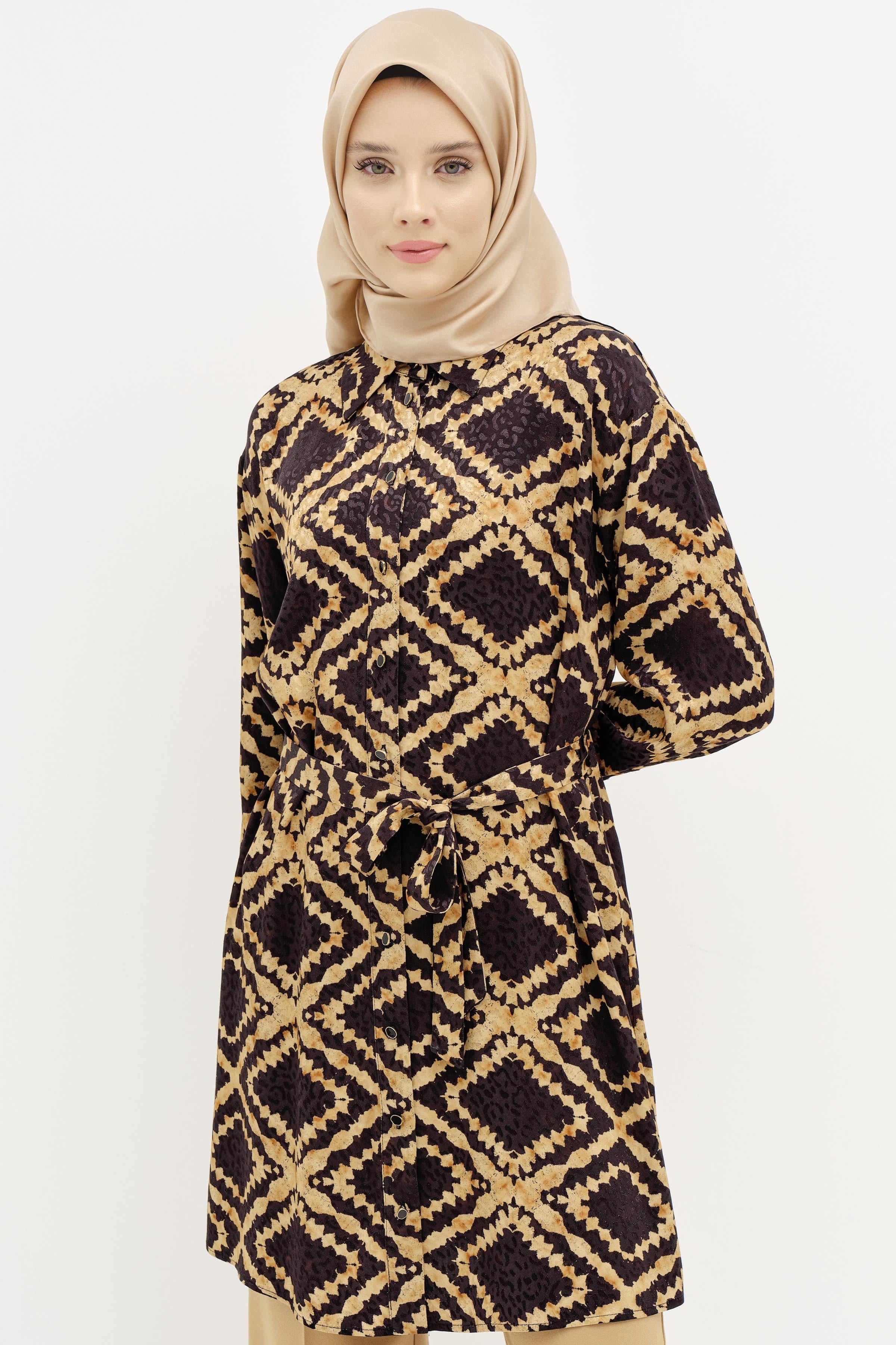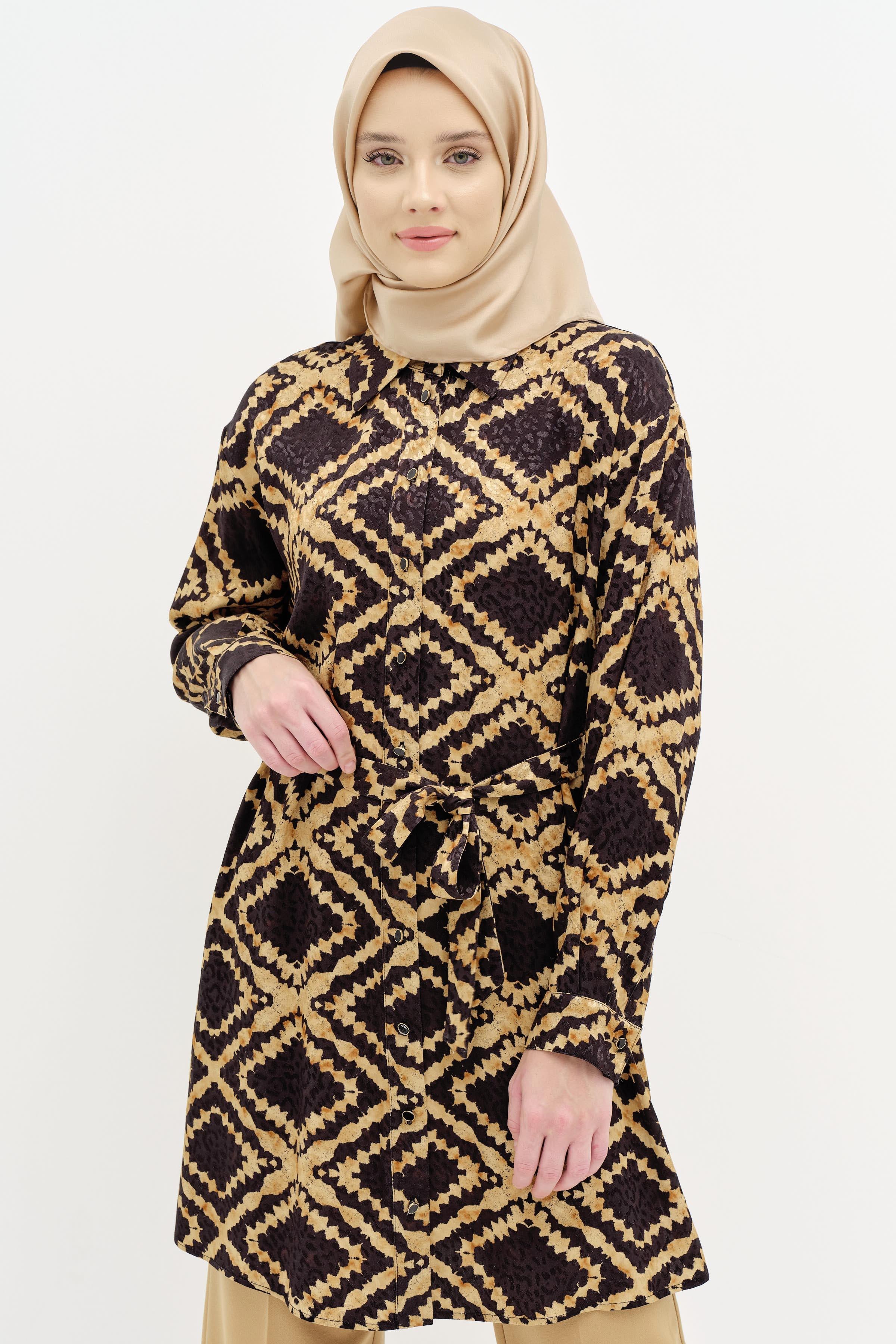 Kuşaklı Yırtmaç Detaylı Desenli Tunik - Taba