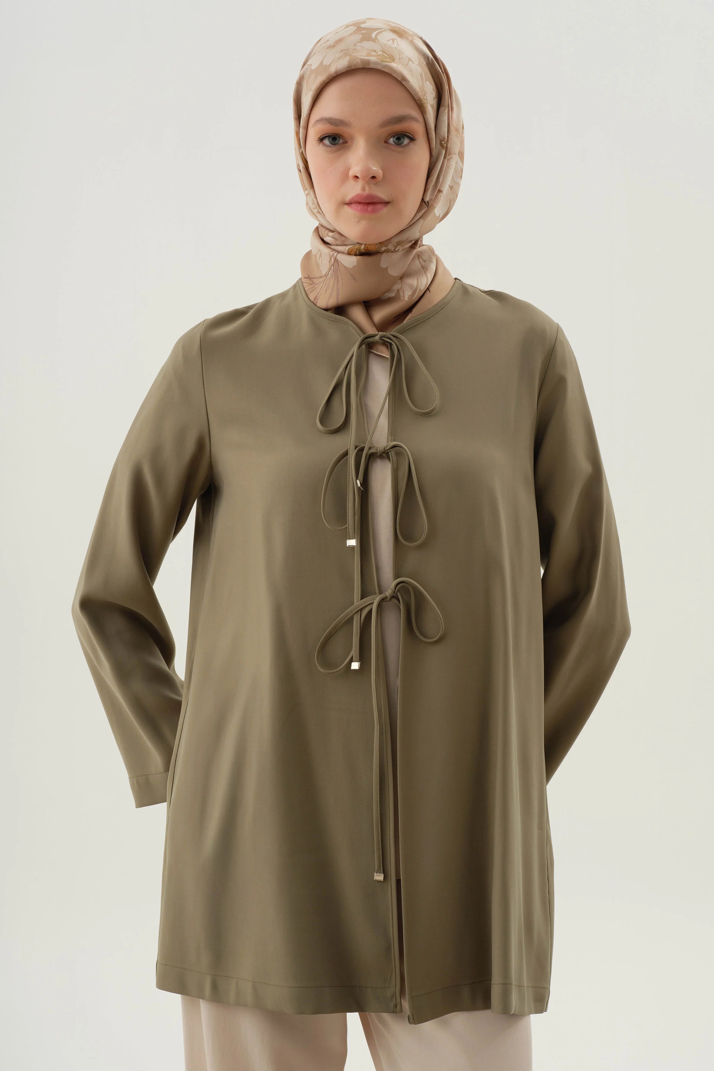 Ön kısmındaki biye bağlama detayıyla zarif bir duruş sergileyen bu kimono, hafif ve dökümlü yapısıyla modern bir görünüm sunar. Katmanlı kombinlerin vazgeçilmez tamamlayıcısıdır. Hem günlük hem özel stilinize şıklık katar.