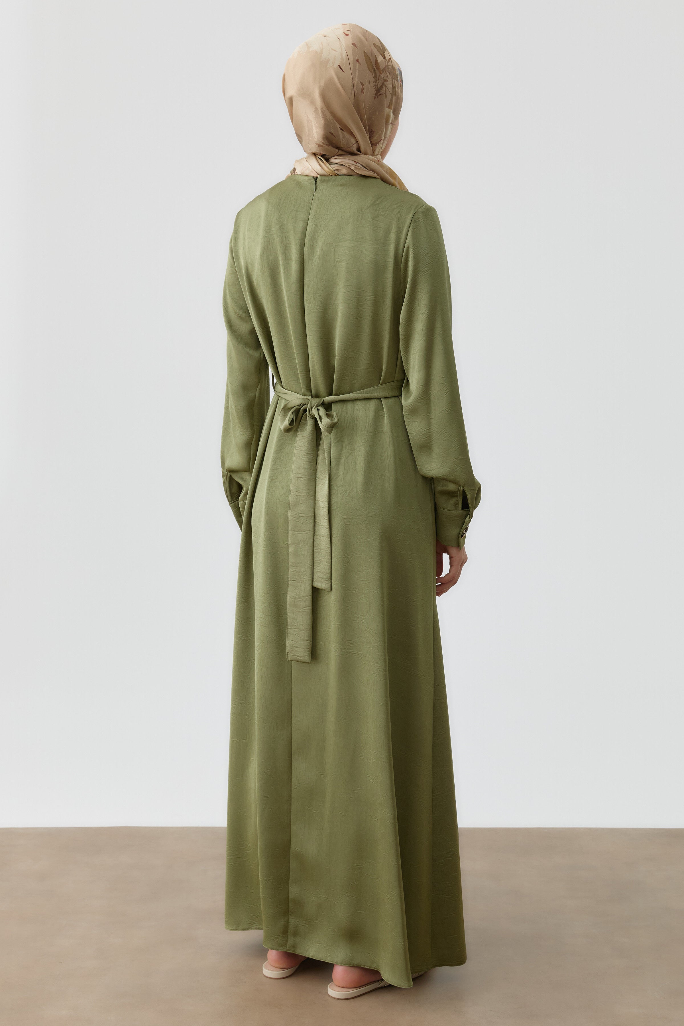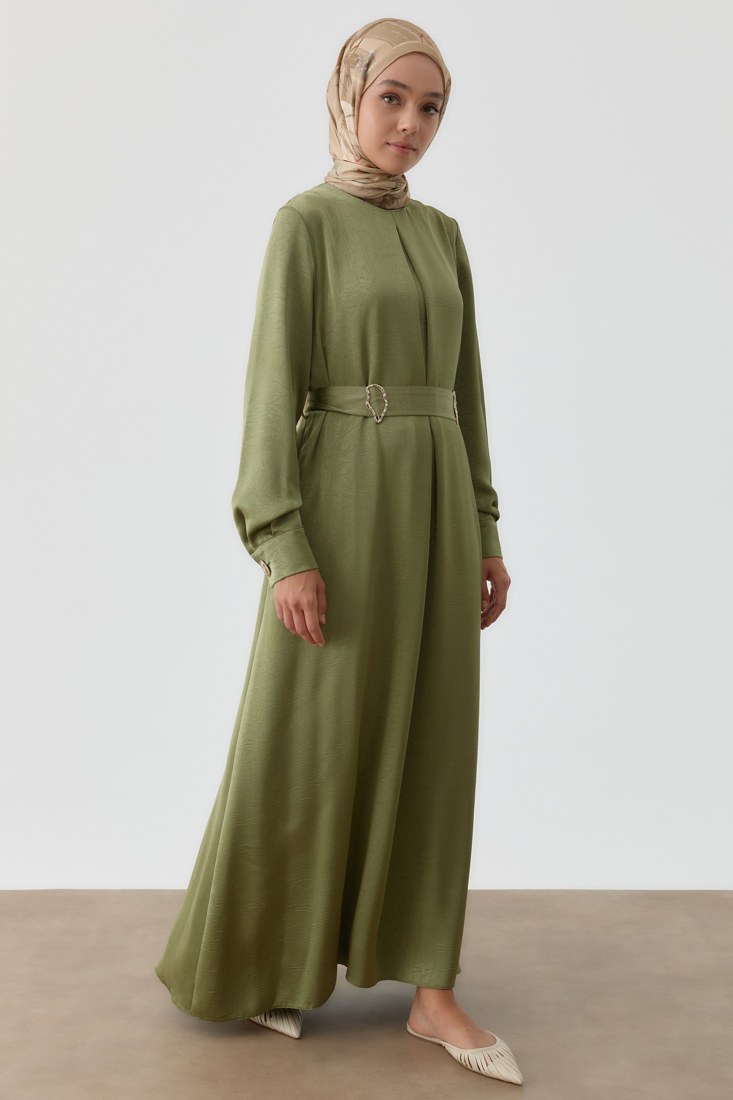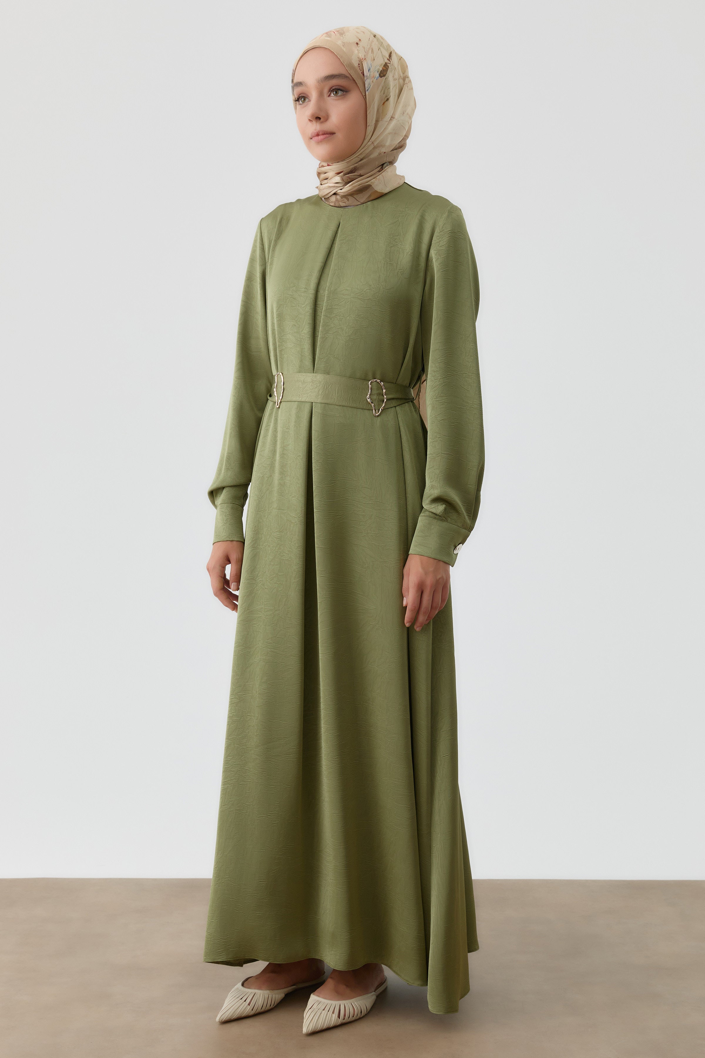 Plikaşe detaylarıyla hareket kazanan bu elbise, kemer aksesuarıyla belinizi vurgulayarak feminen bir siluet sunar. Günlük şıklıktan özel davetlere kadar her ortamda zarafetinizi yansıtacak bir parça.
