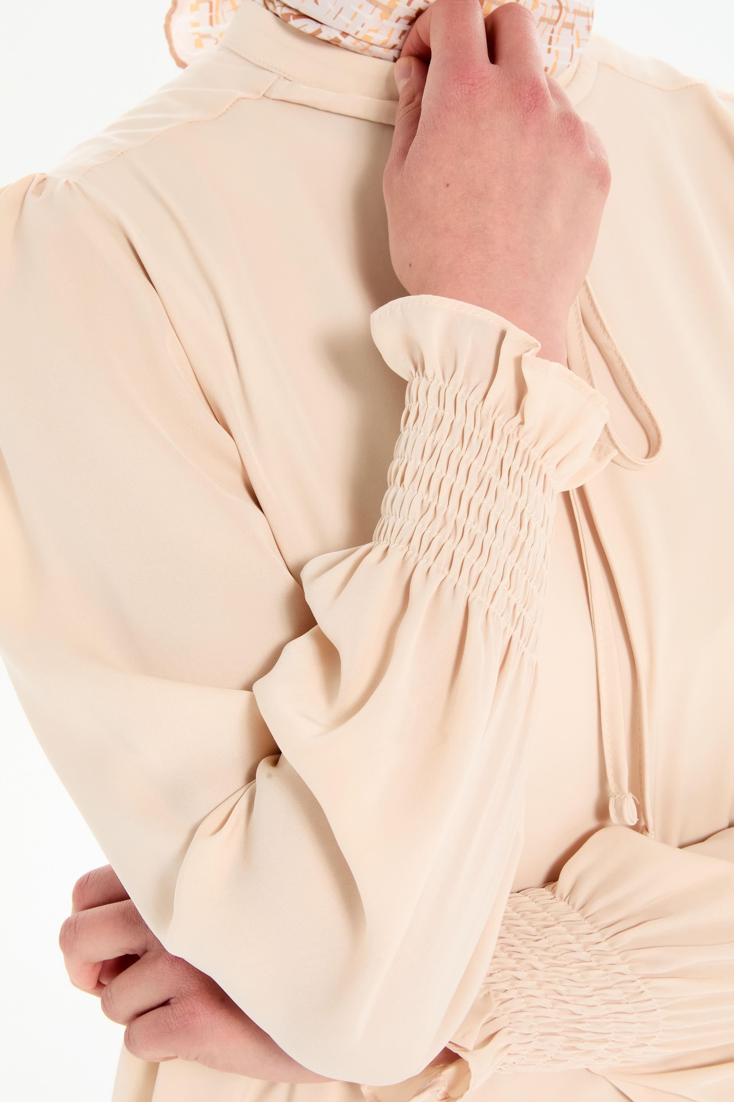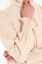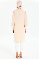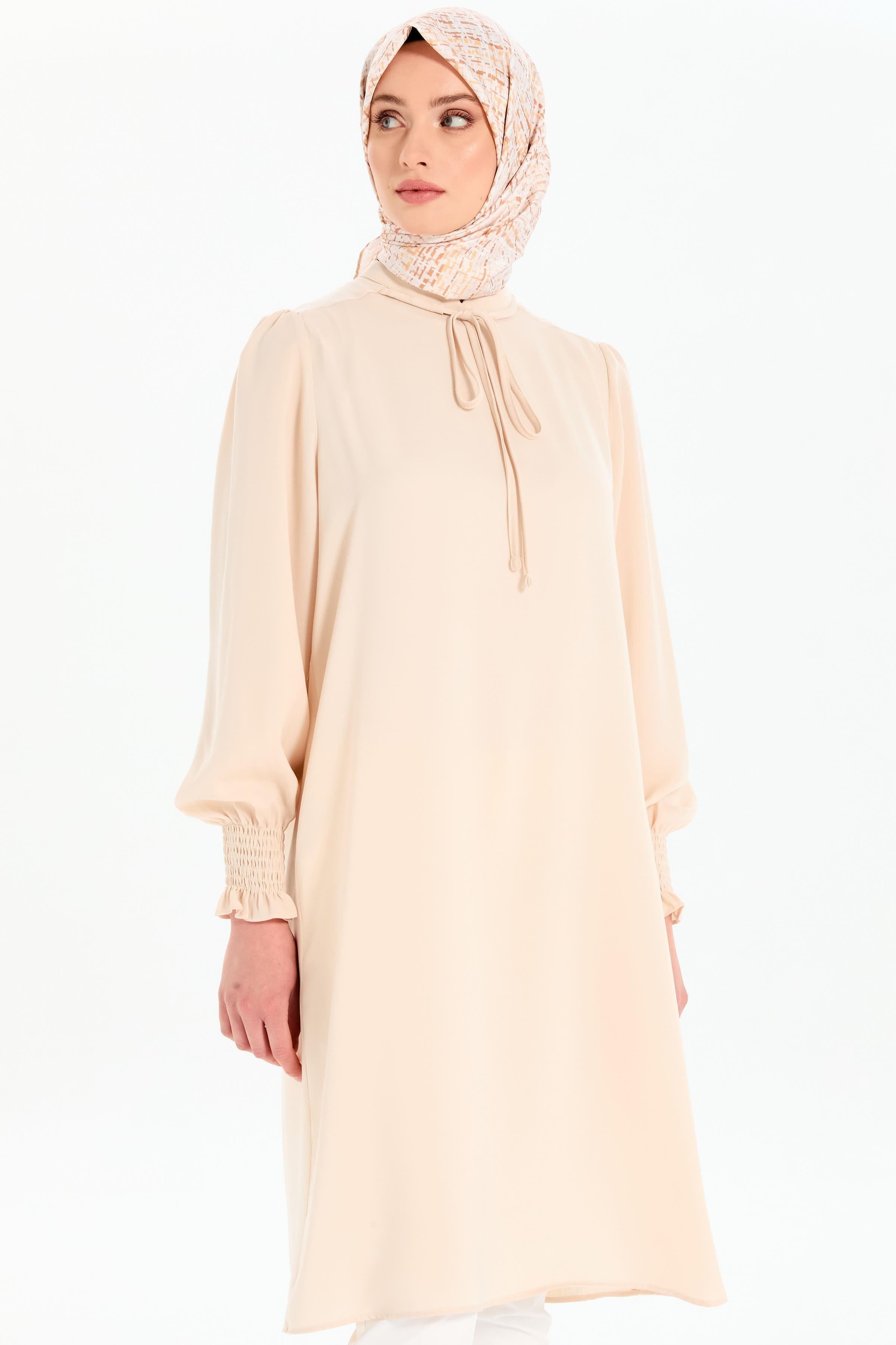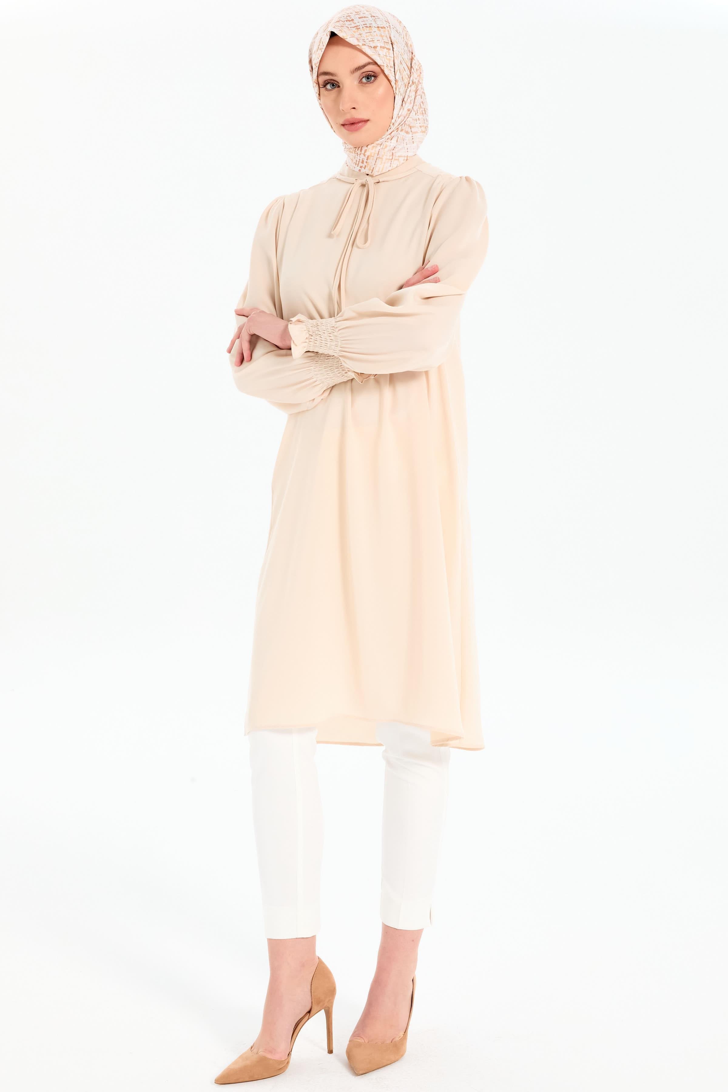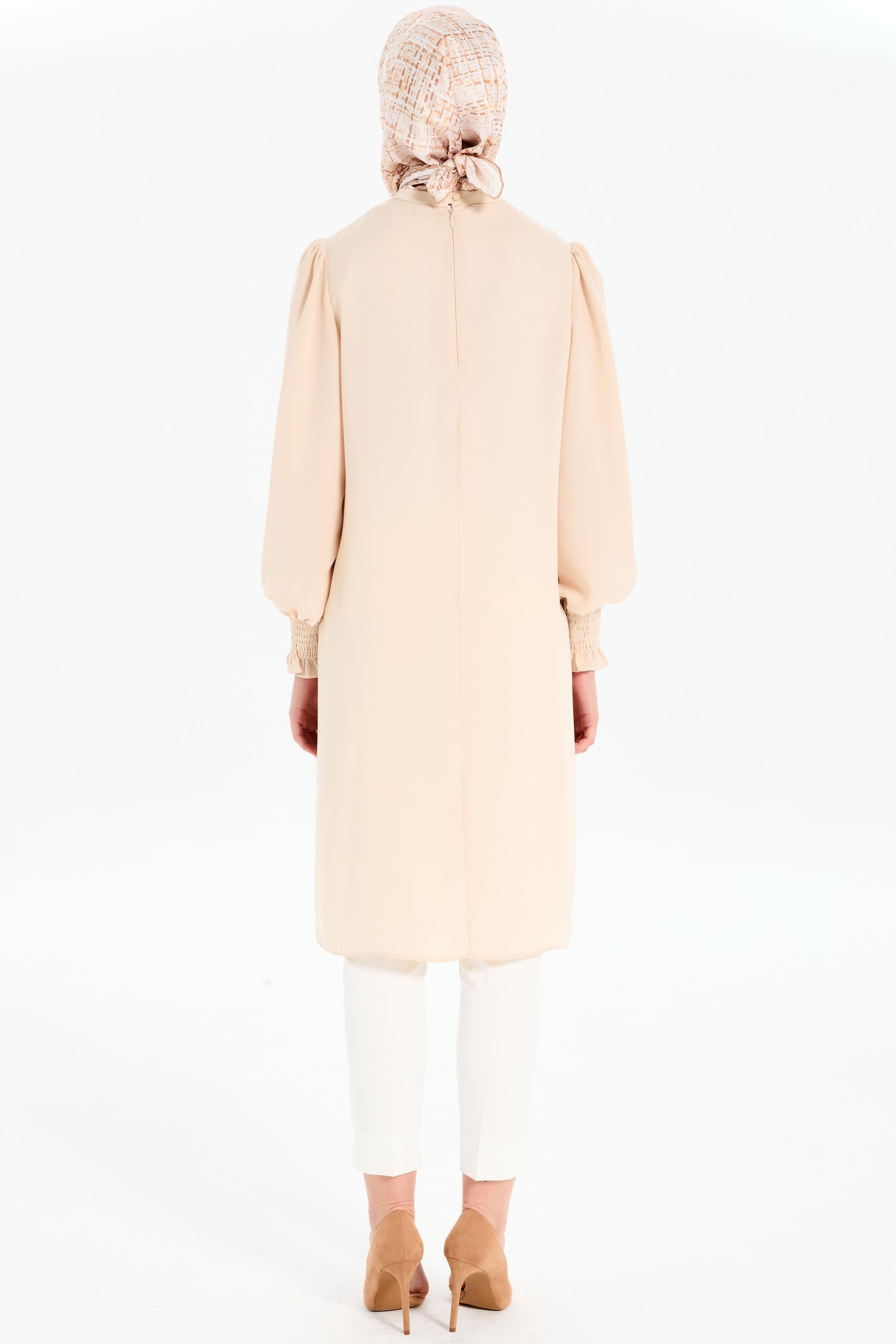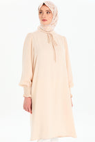 Yaka Bağcık Detaylı Kolları Lastikli Tunik - Bej