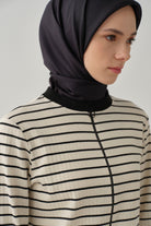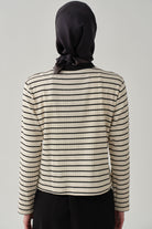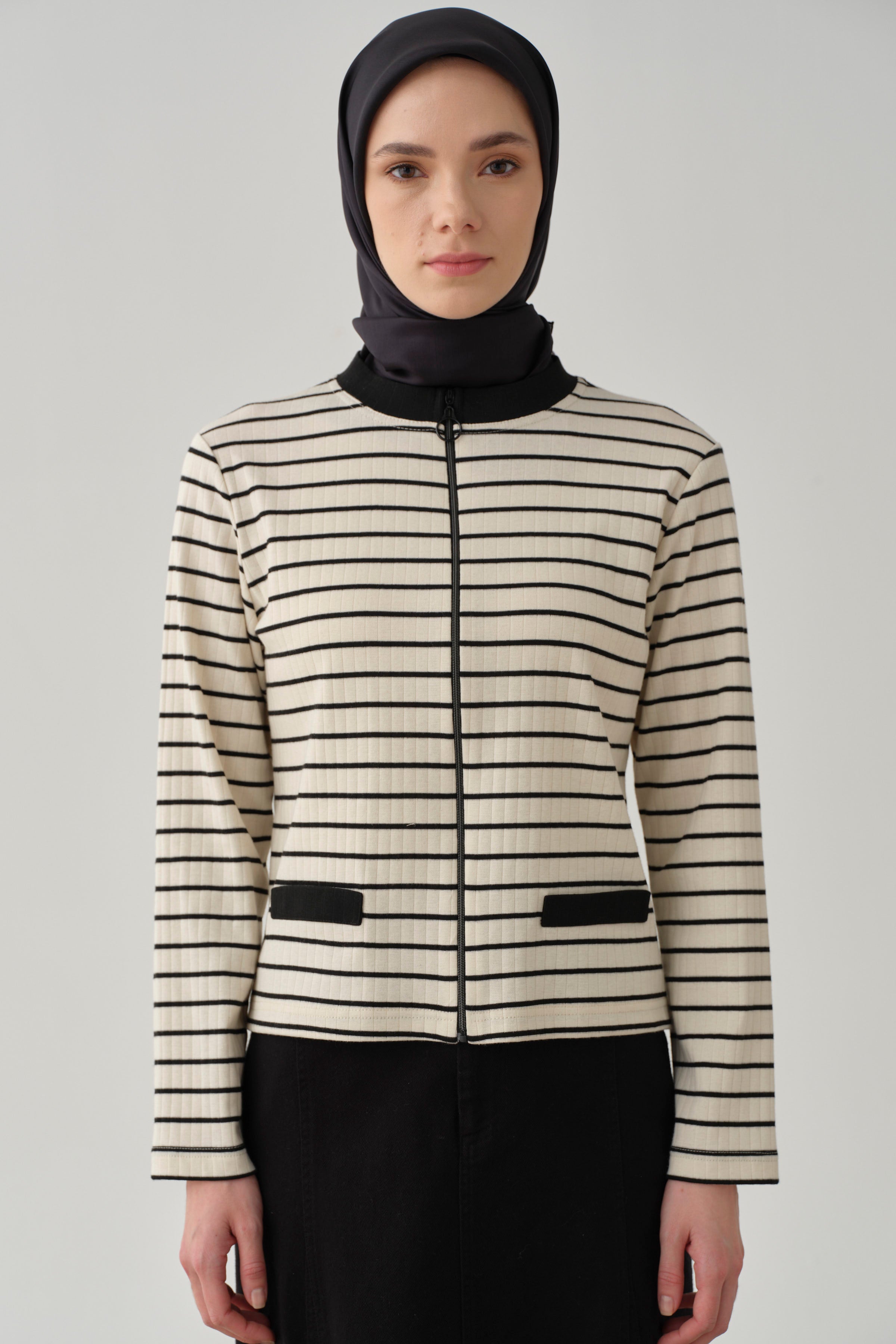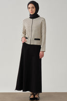 Önü Fermuarlı Çizgili Hırka - Bej - Siyah