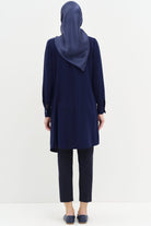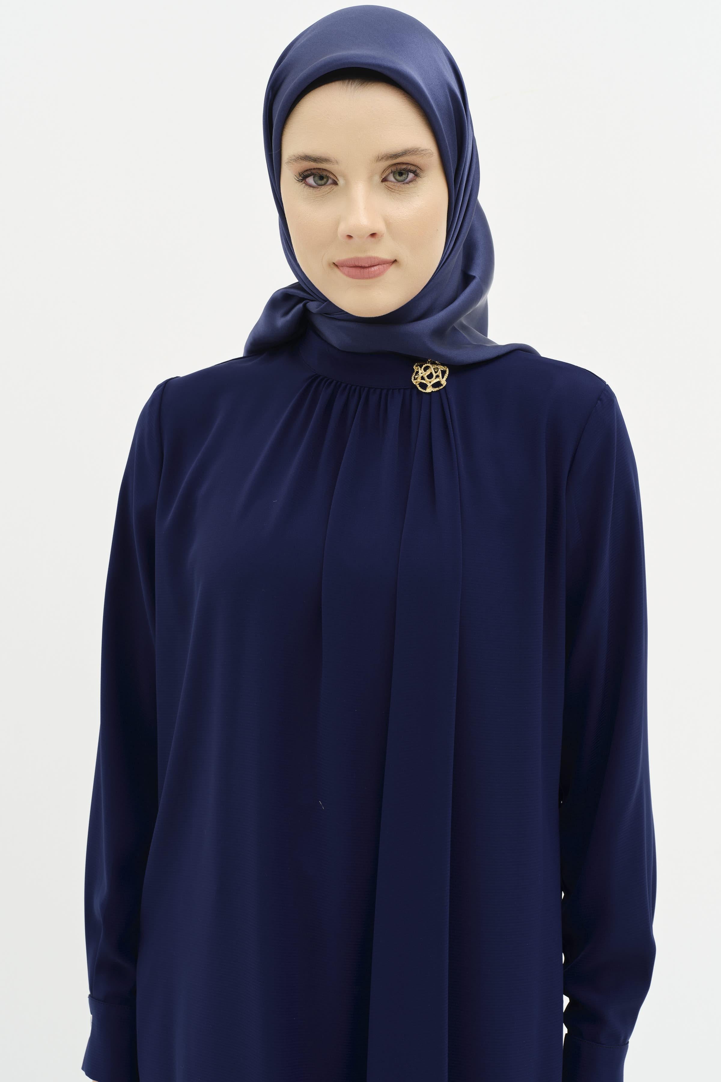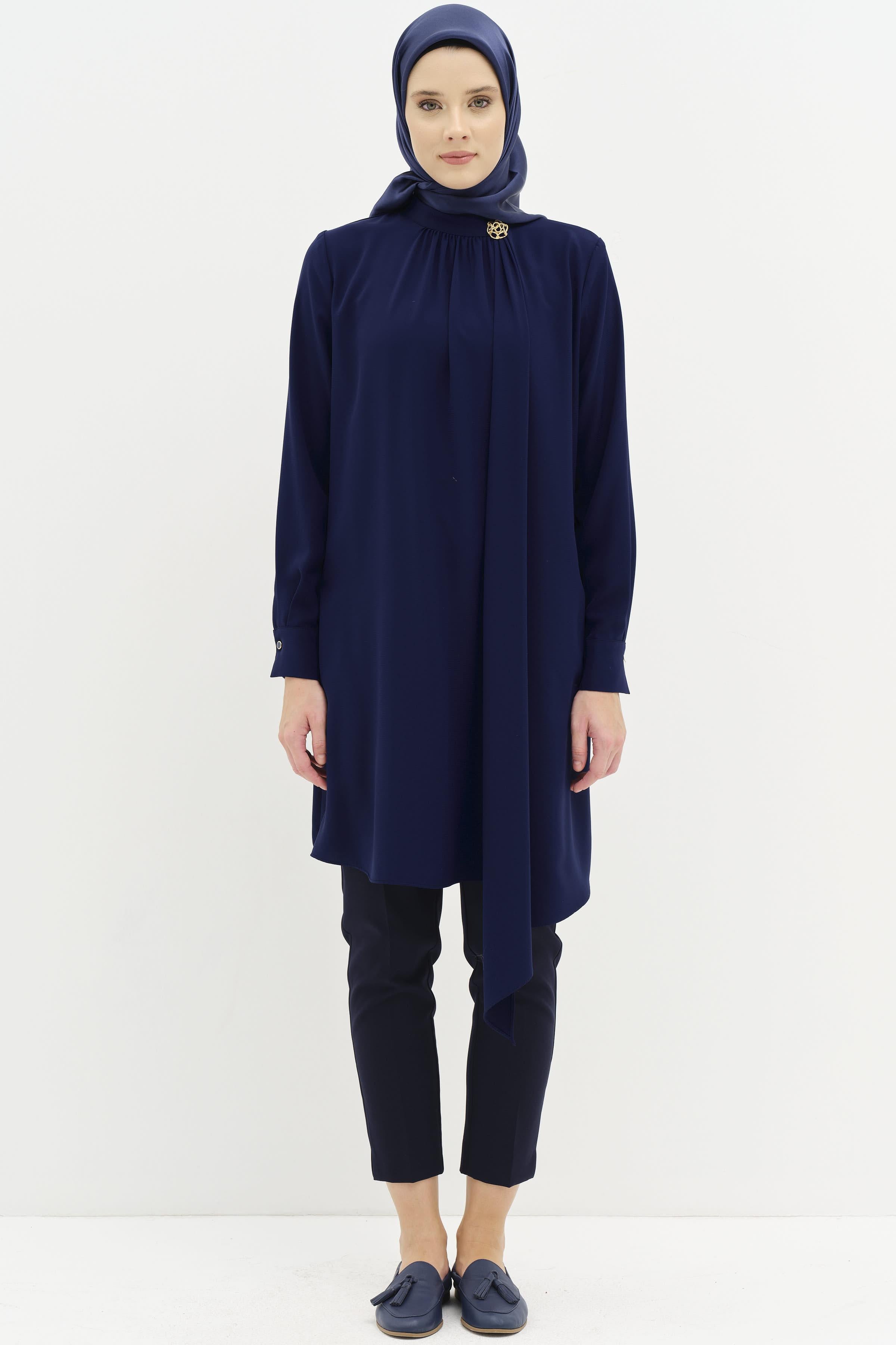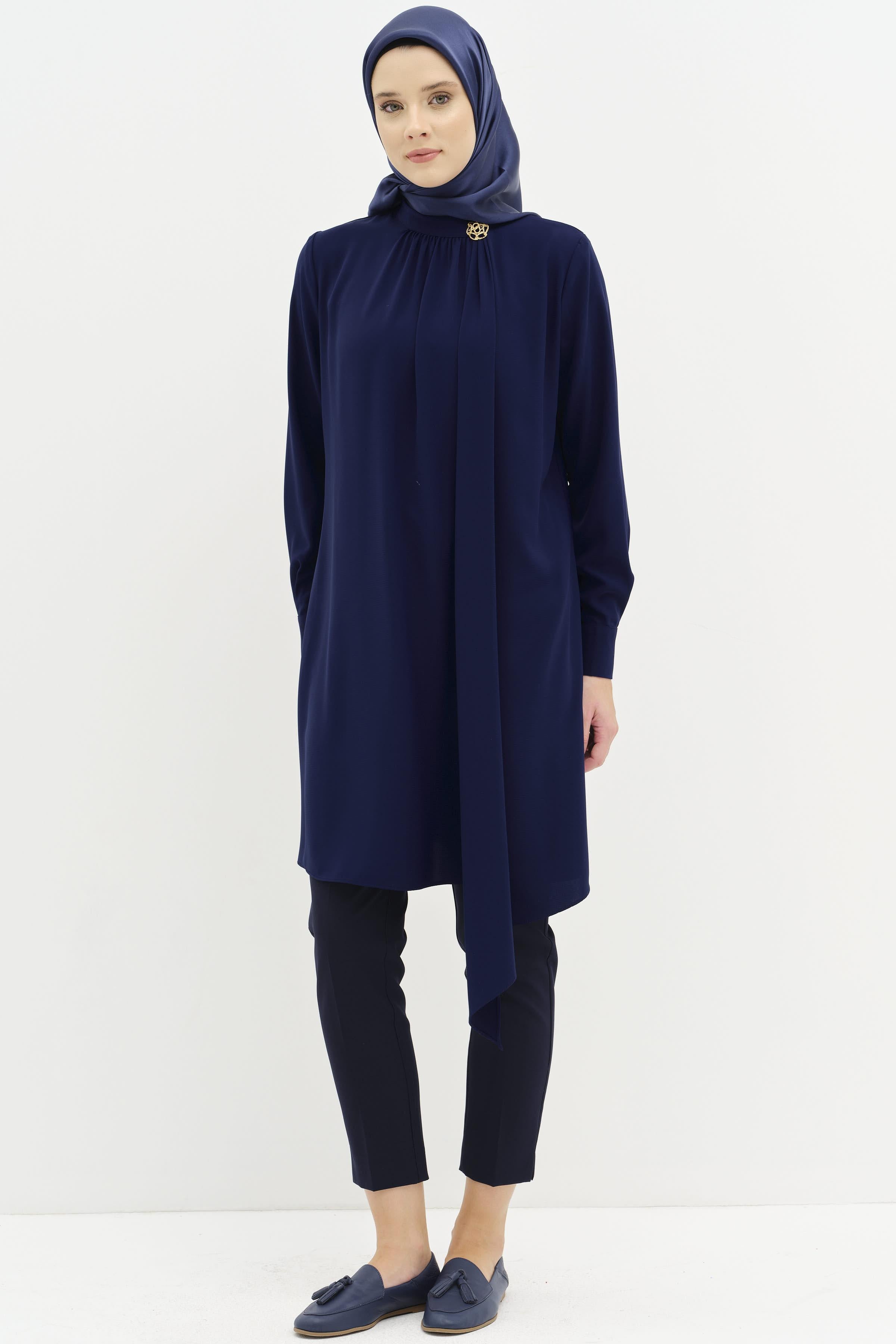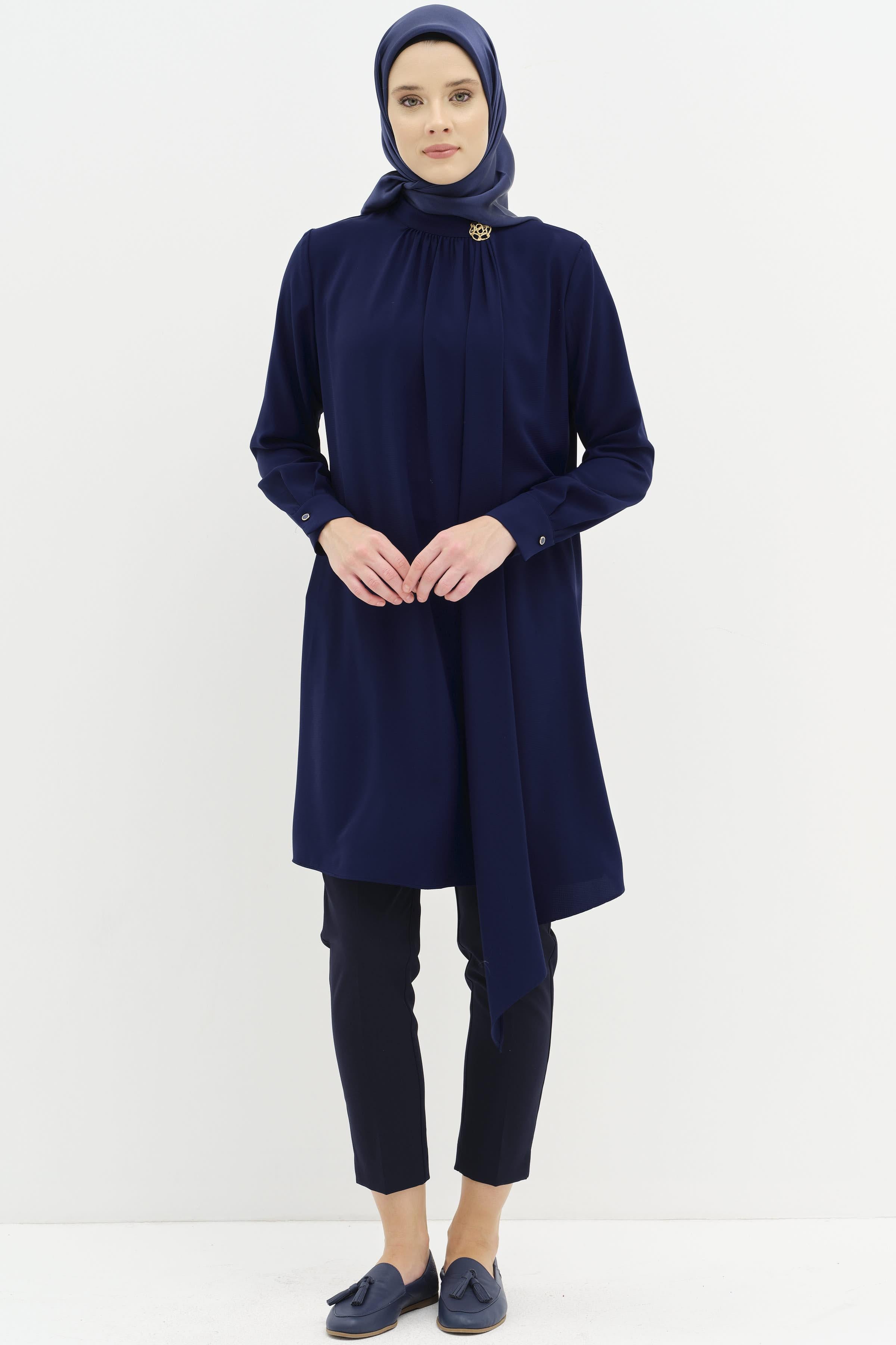 Büzgülü Broş Detaylı Asimetrik Tunik - Lacivert