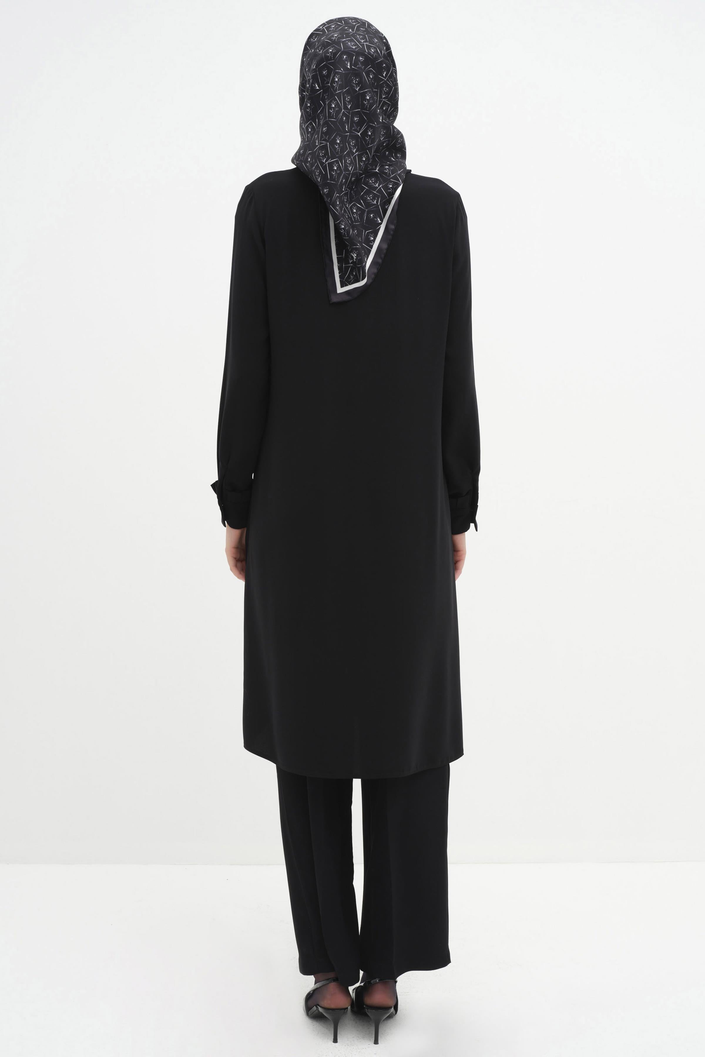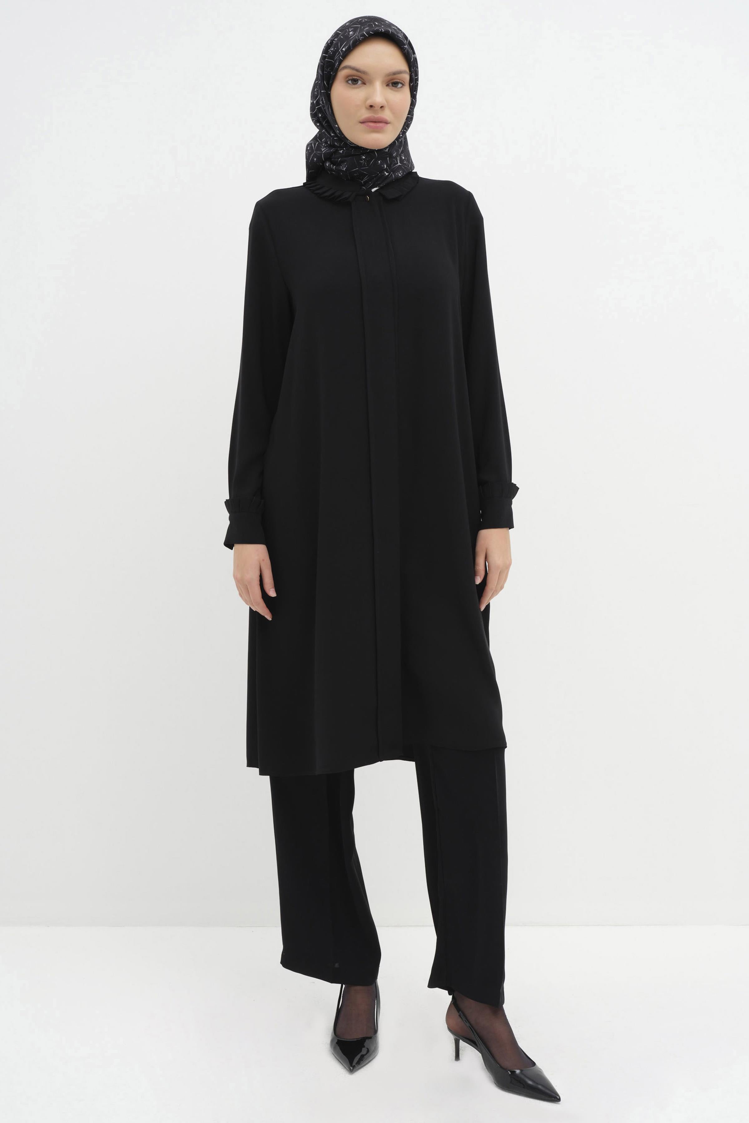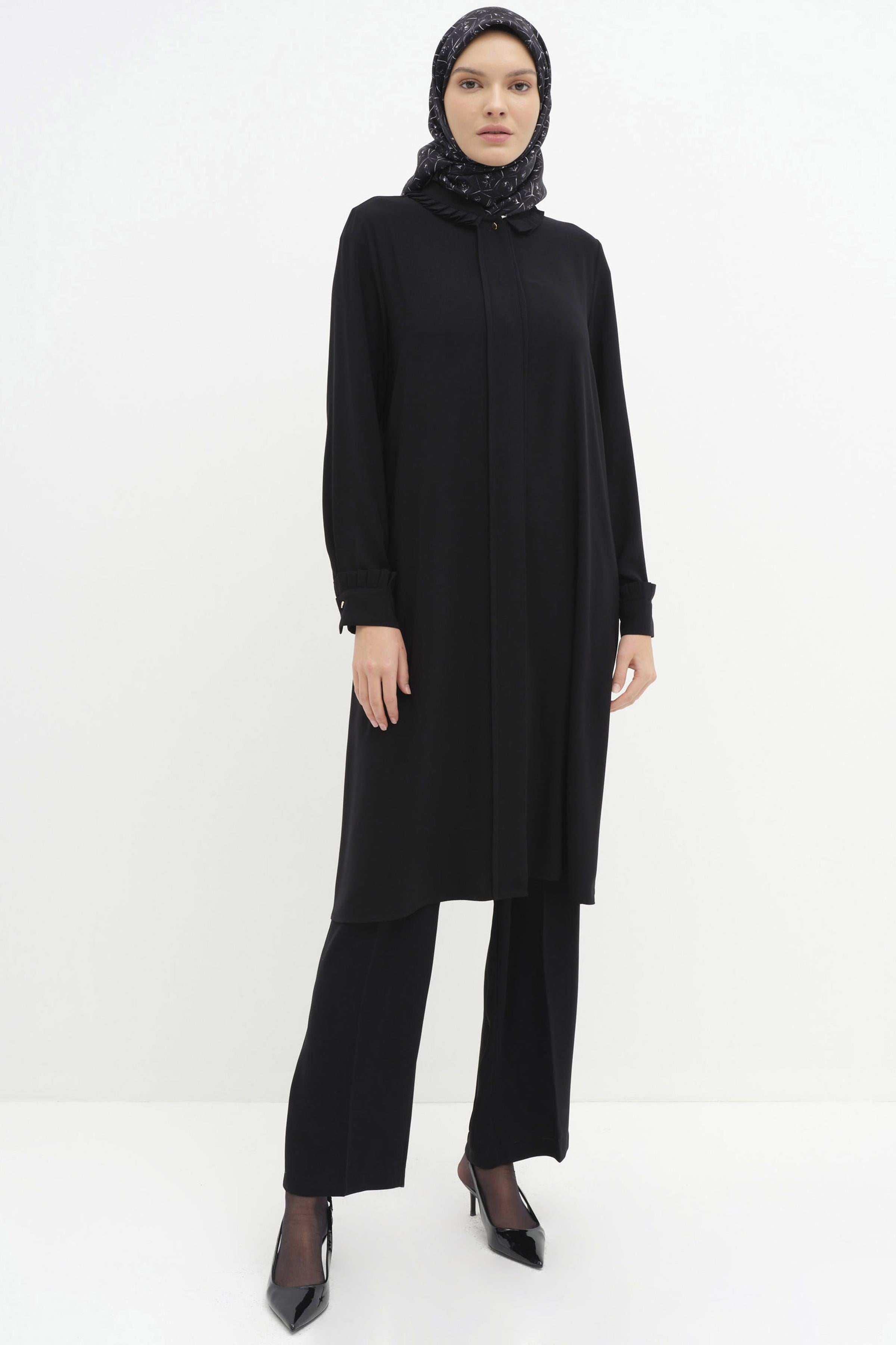 Yaka Ve Manşet Pile Detaylı Tunik - Siyah