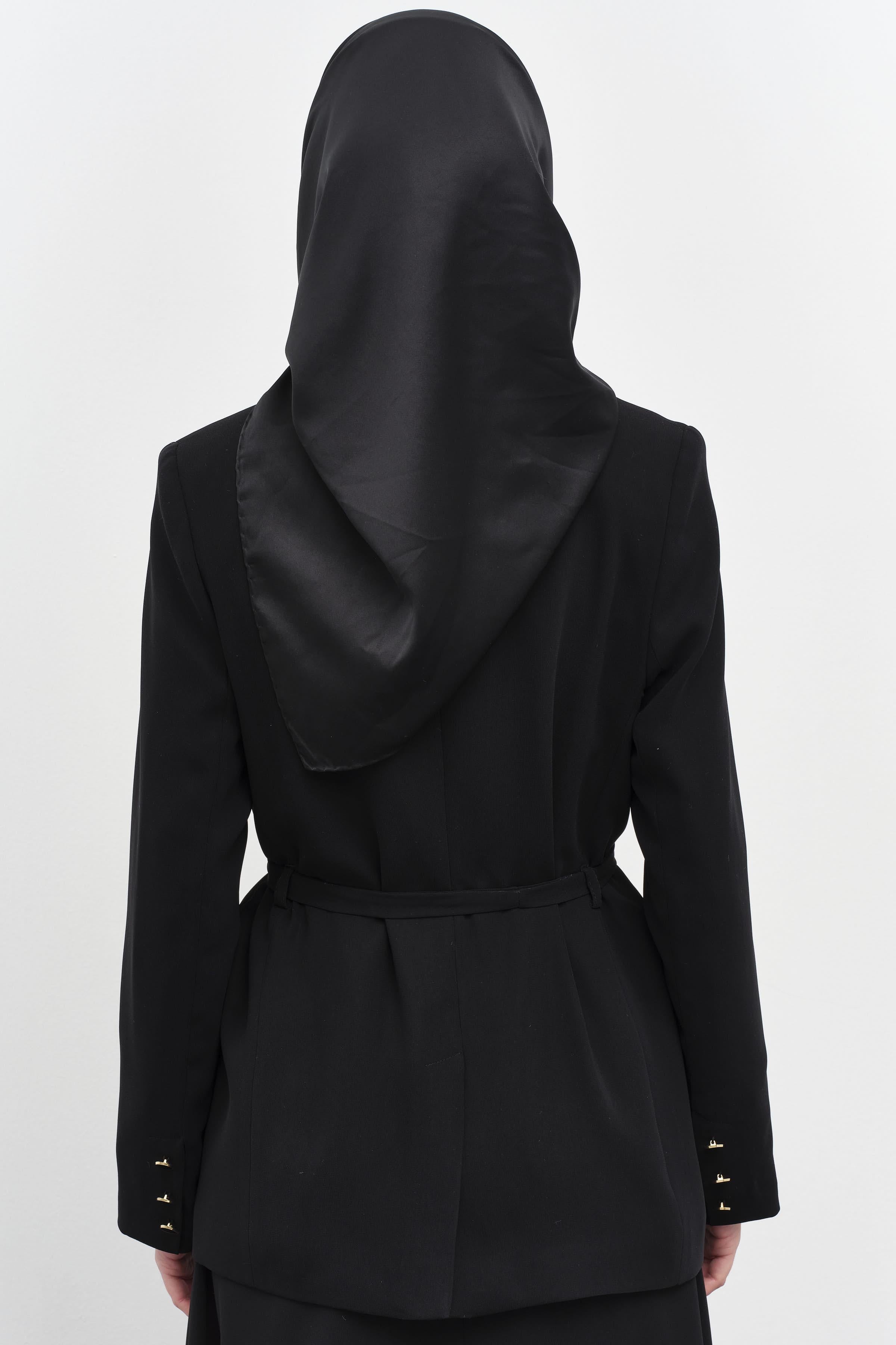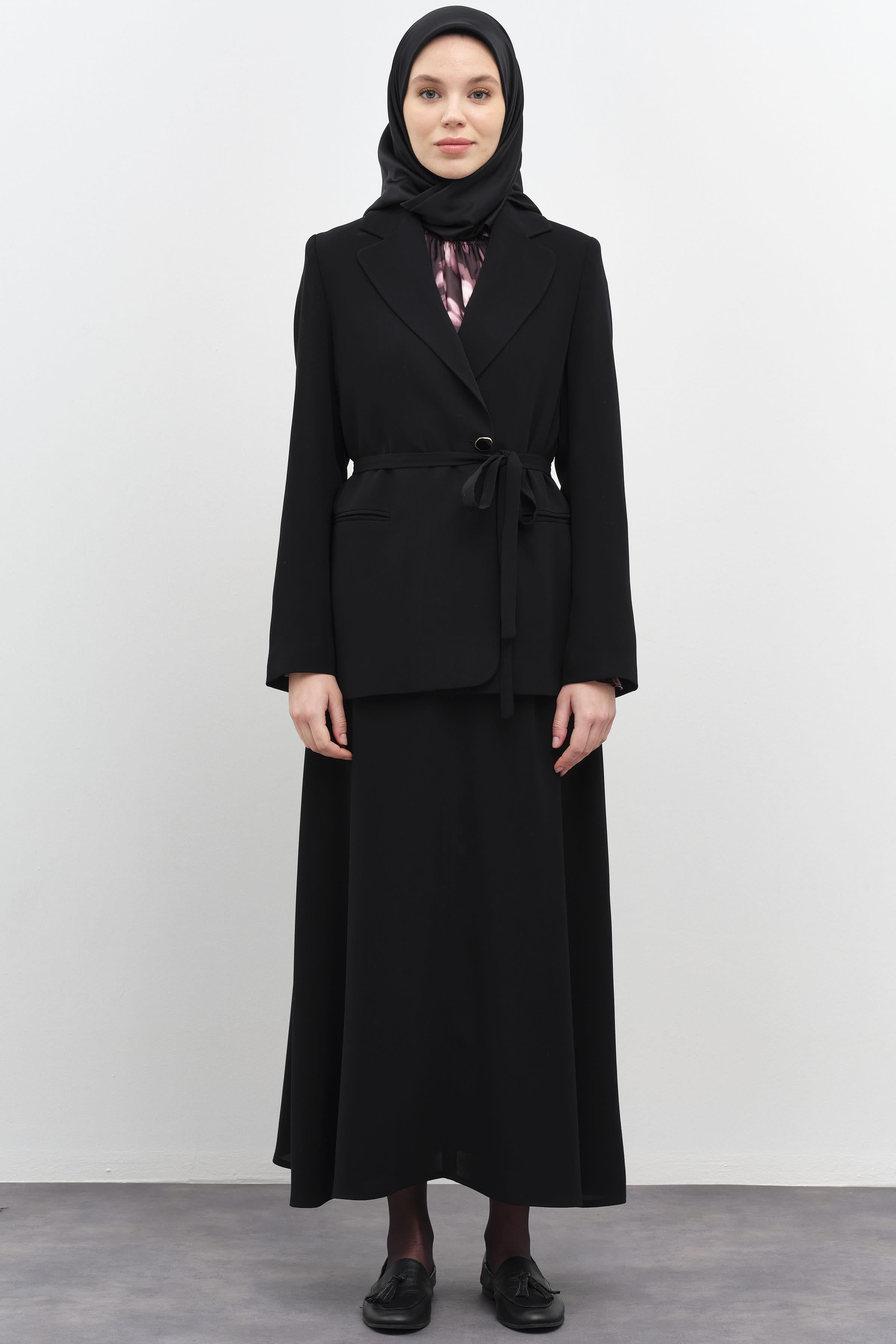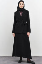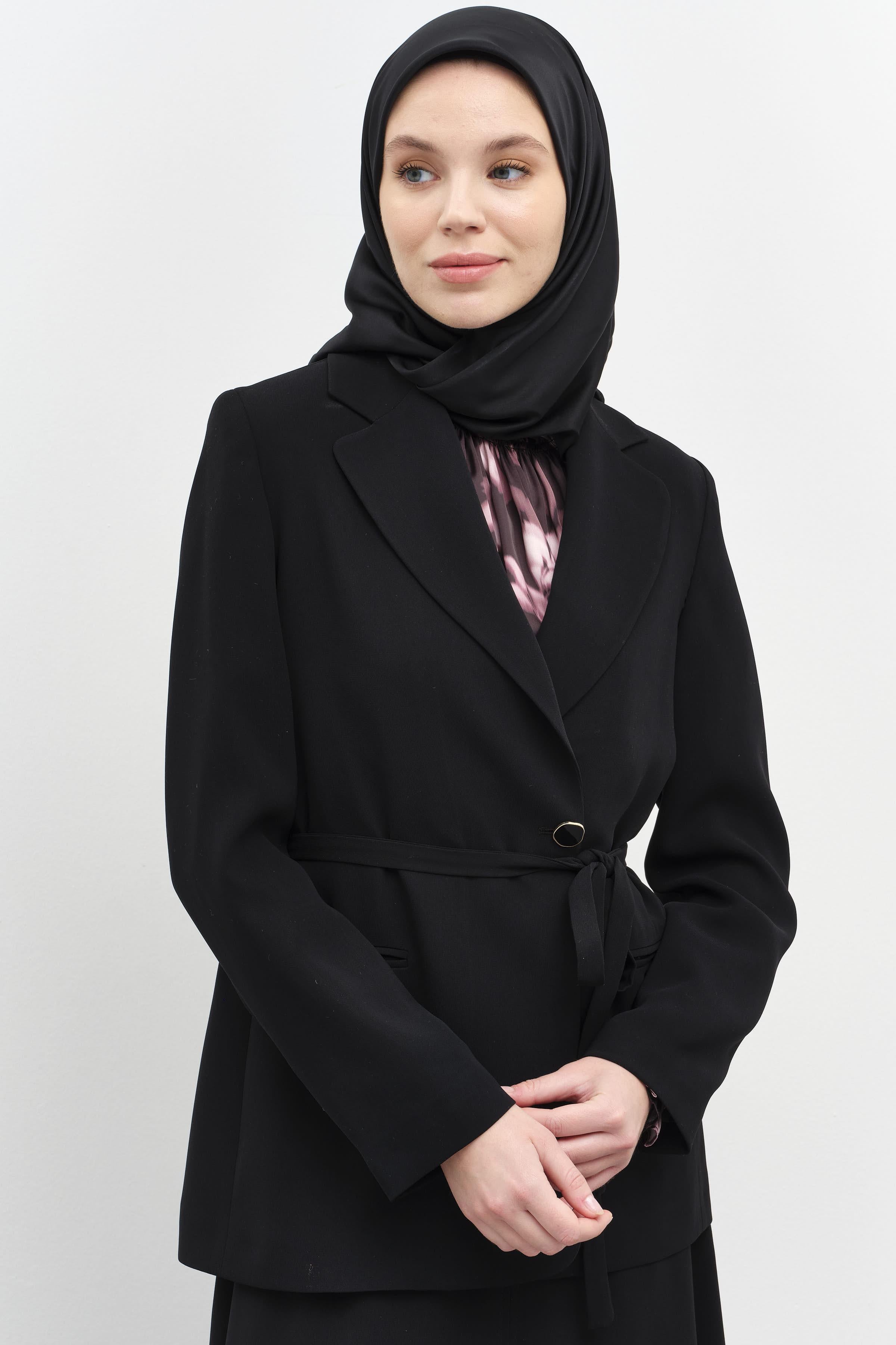Gizli Pat Düğmeli Beli Kuşaklı Ceket - Siyah