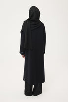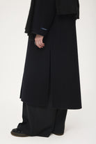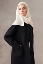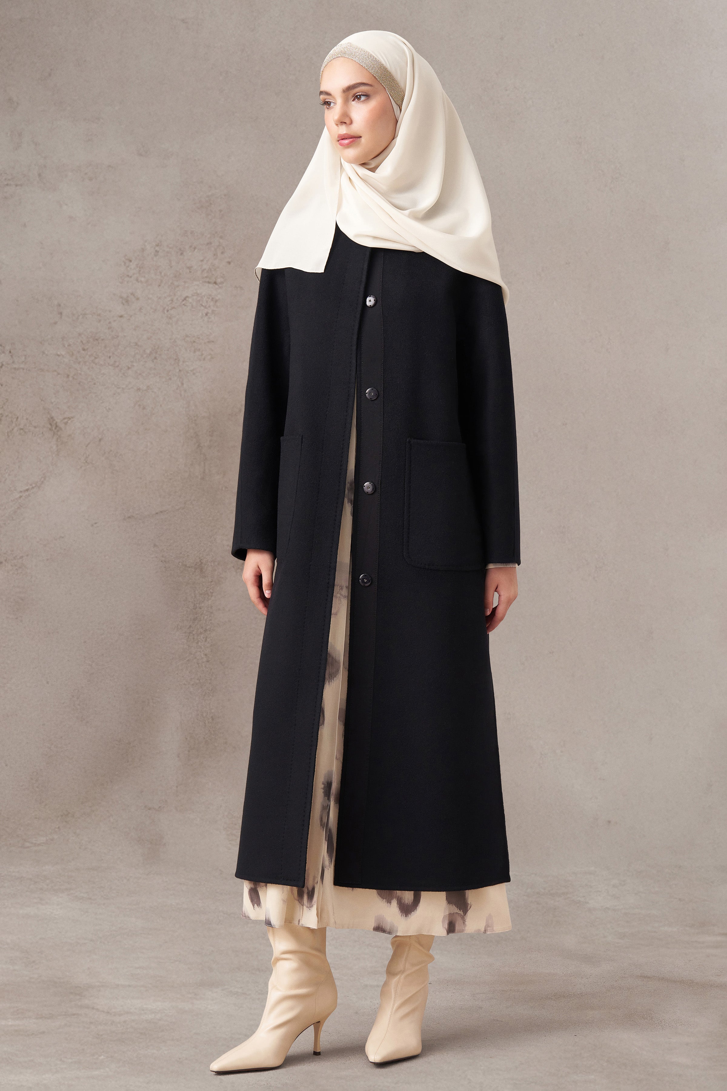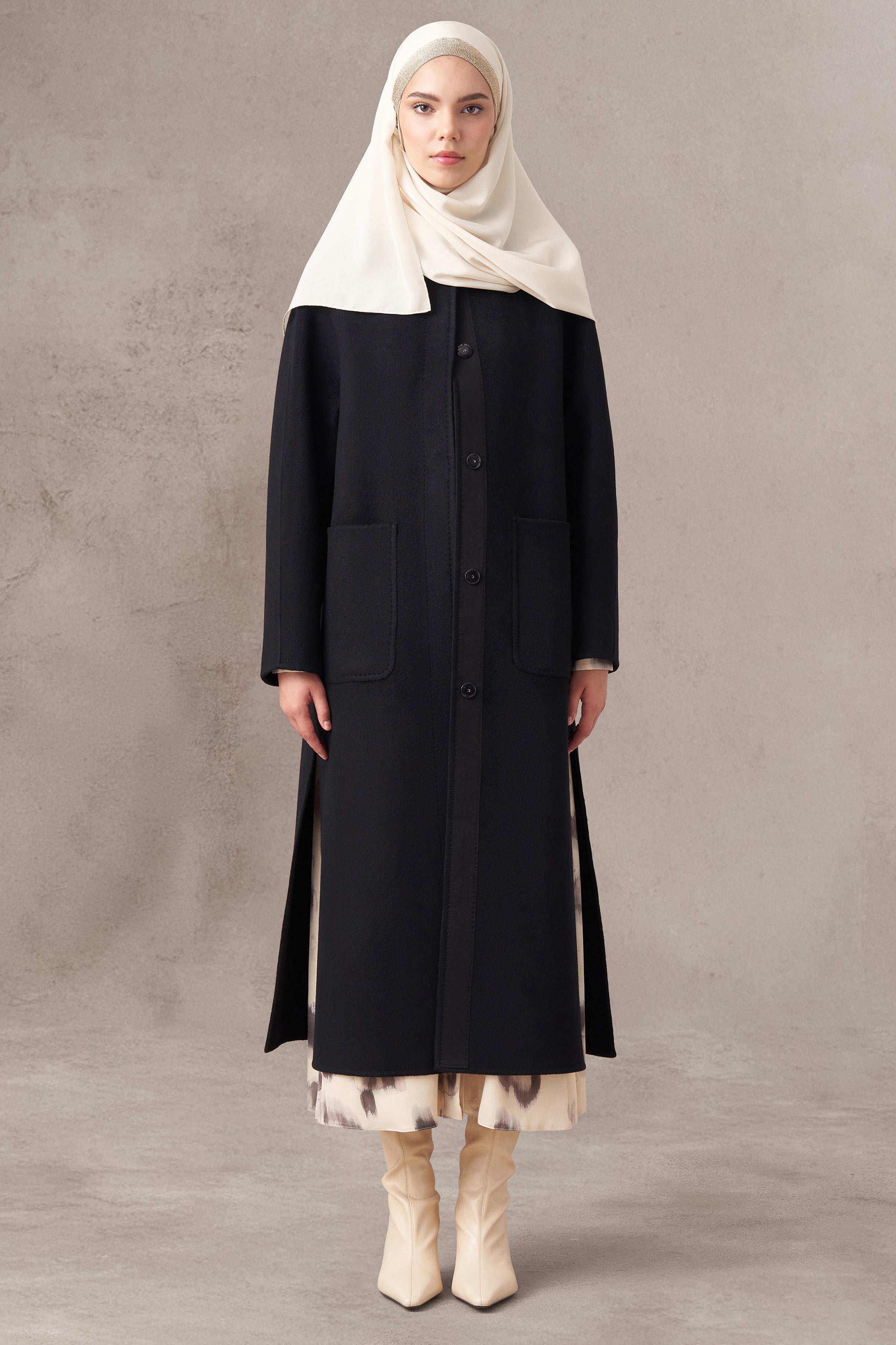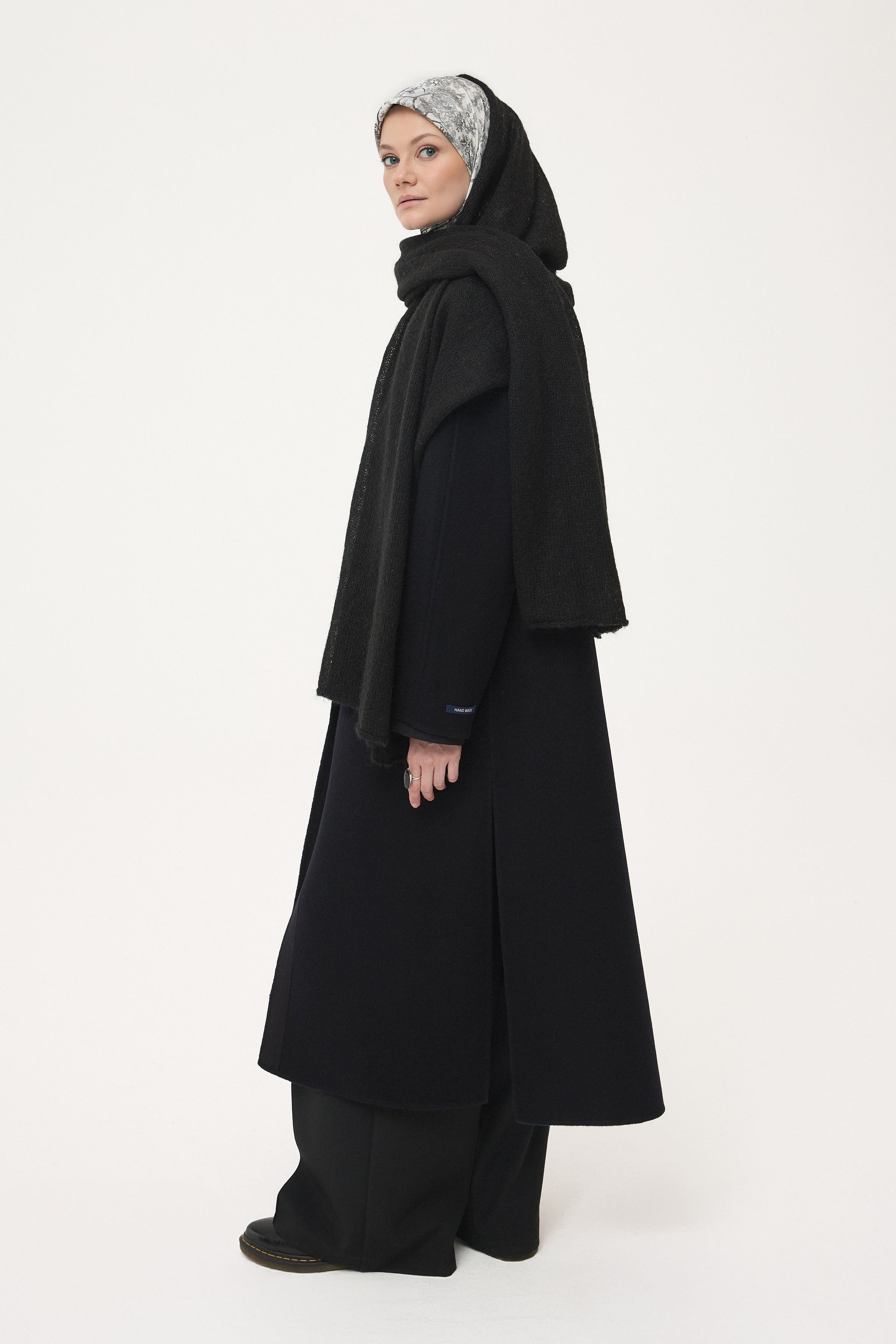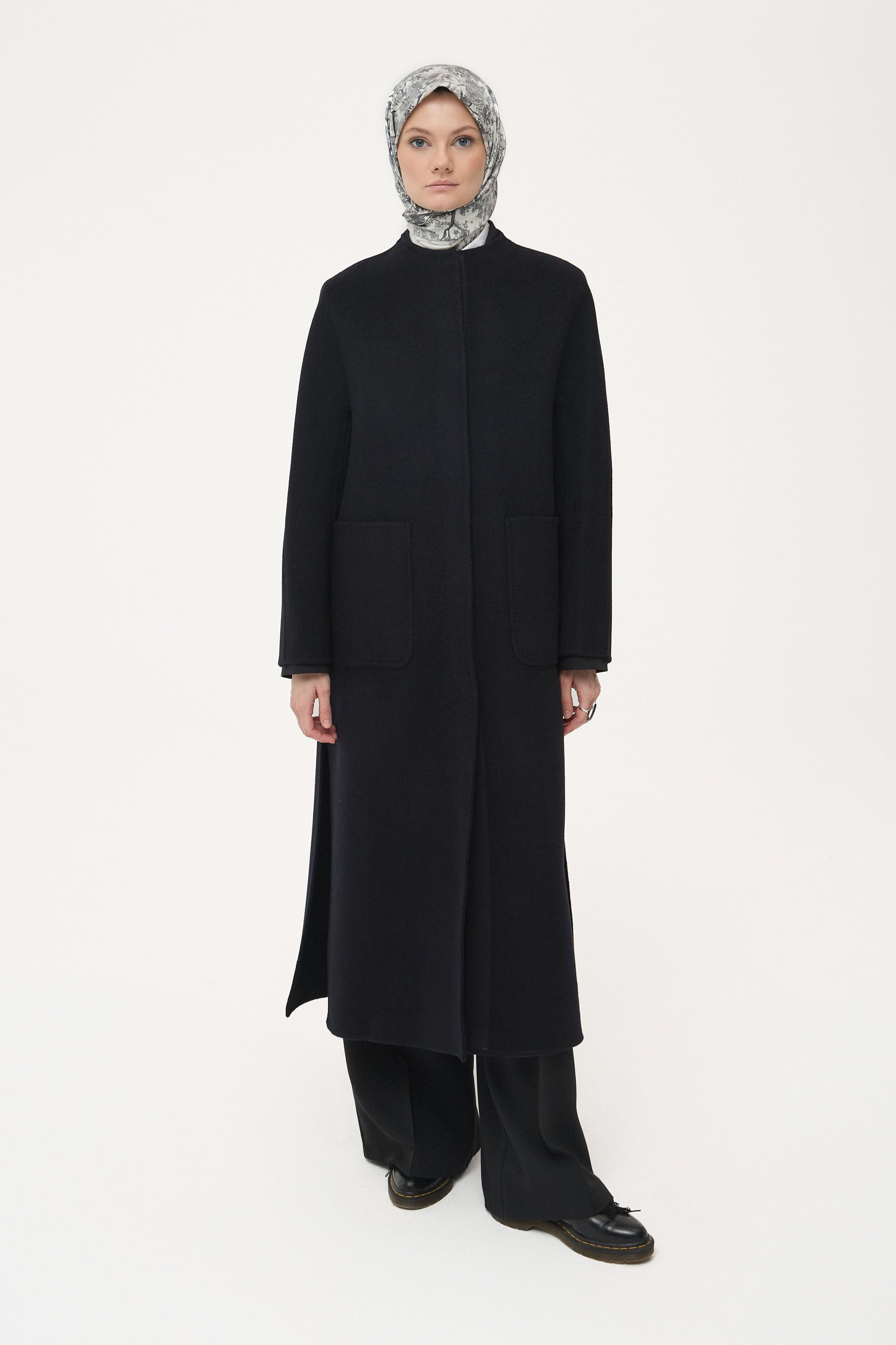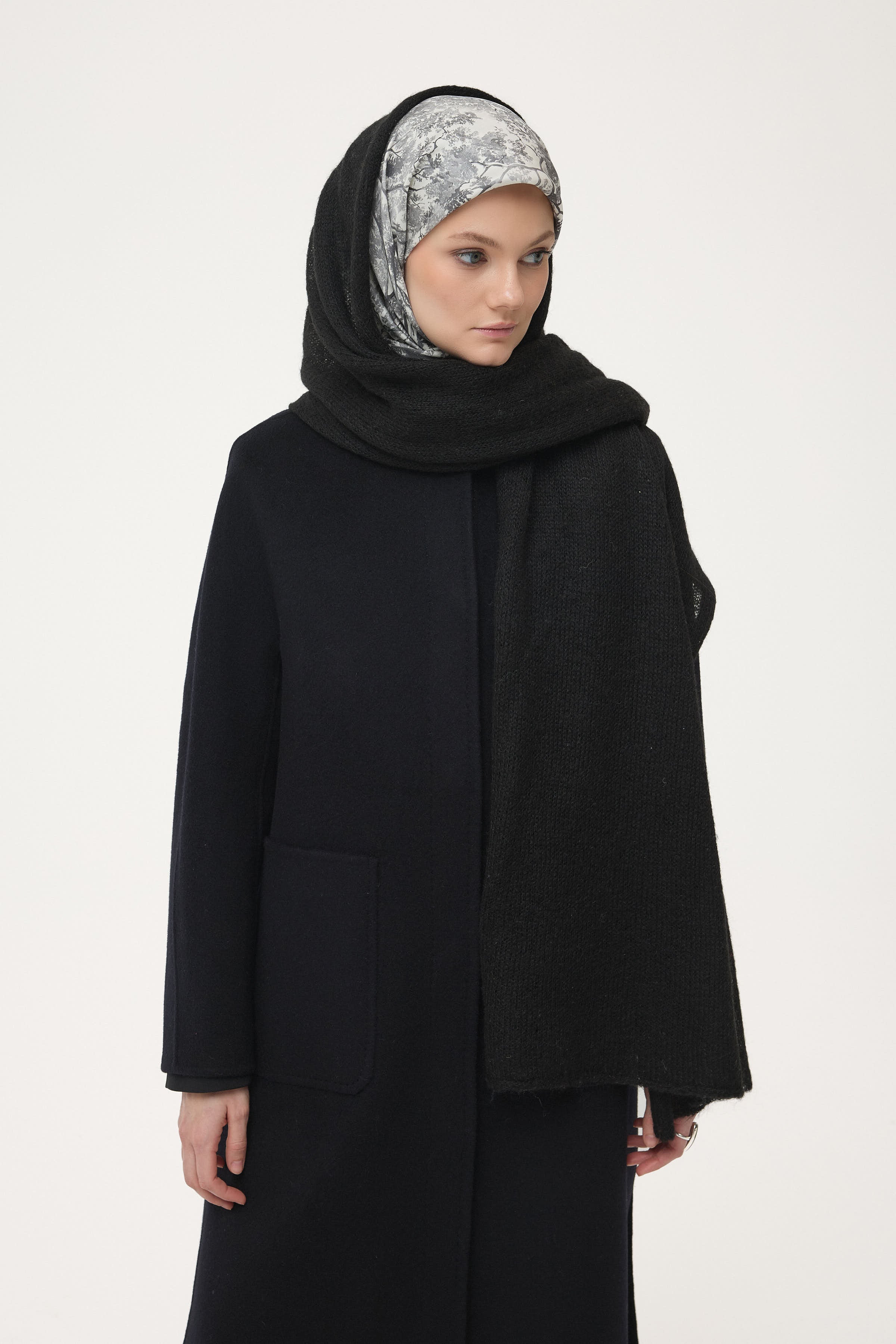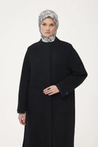 El Yapımı %100 Yün Aplike Cep Detaylı Manto - Siyah
