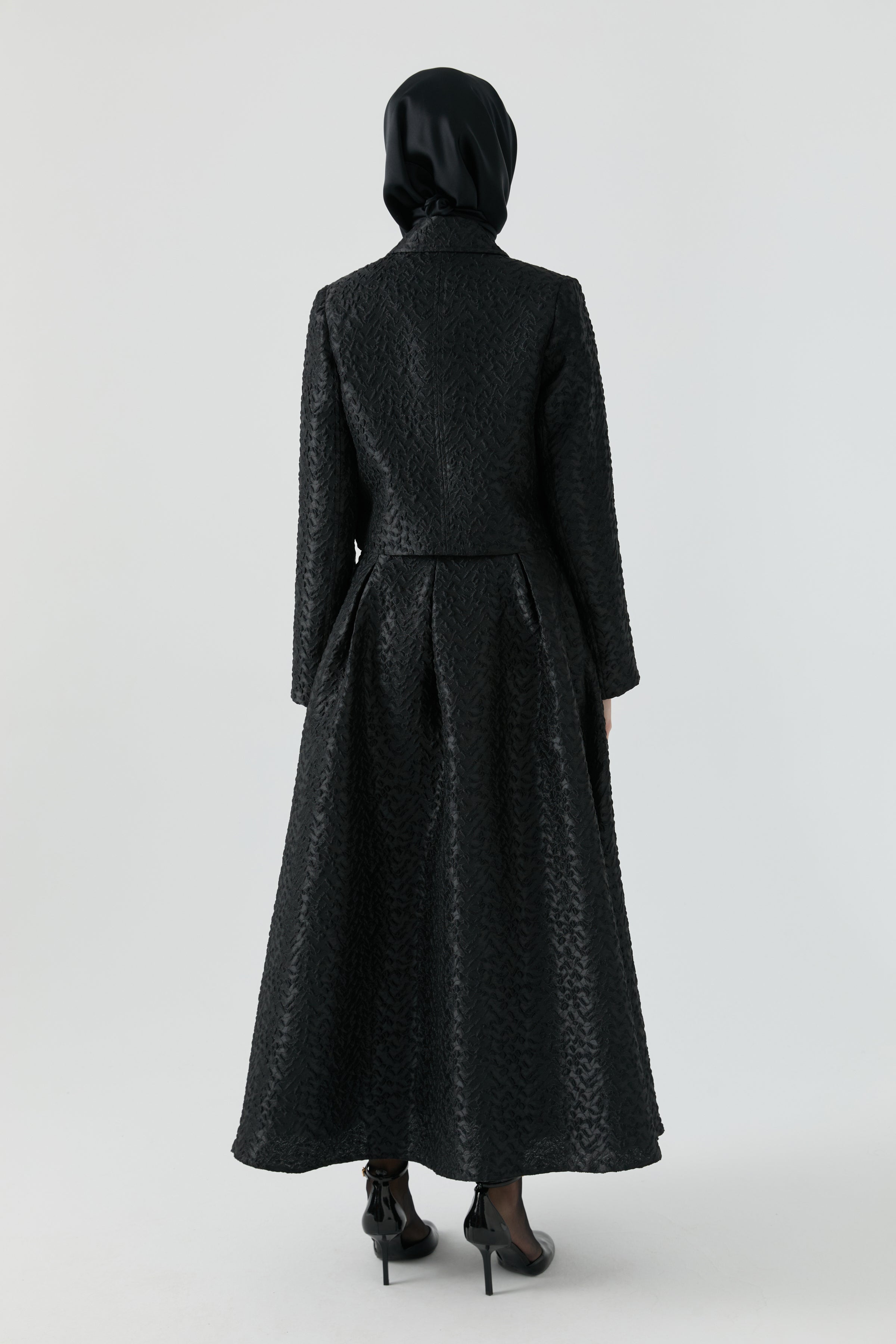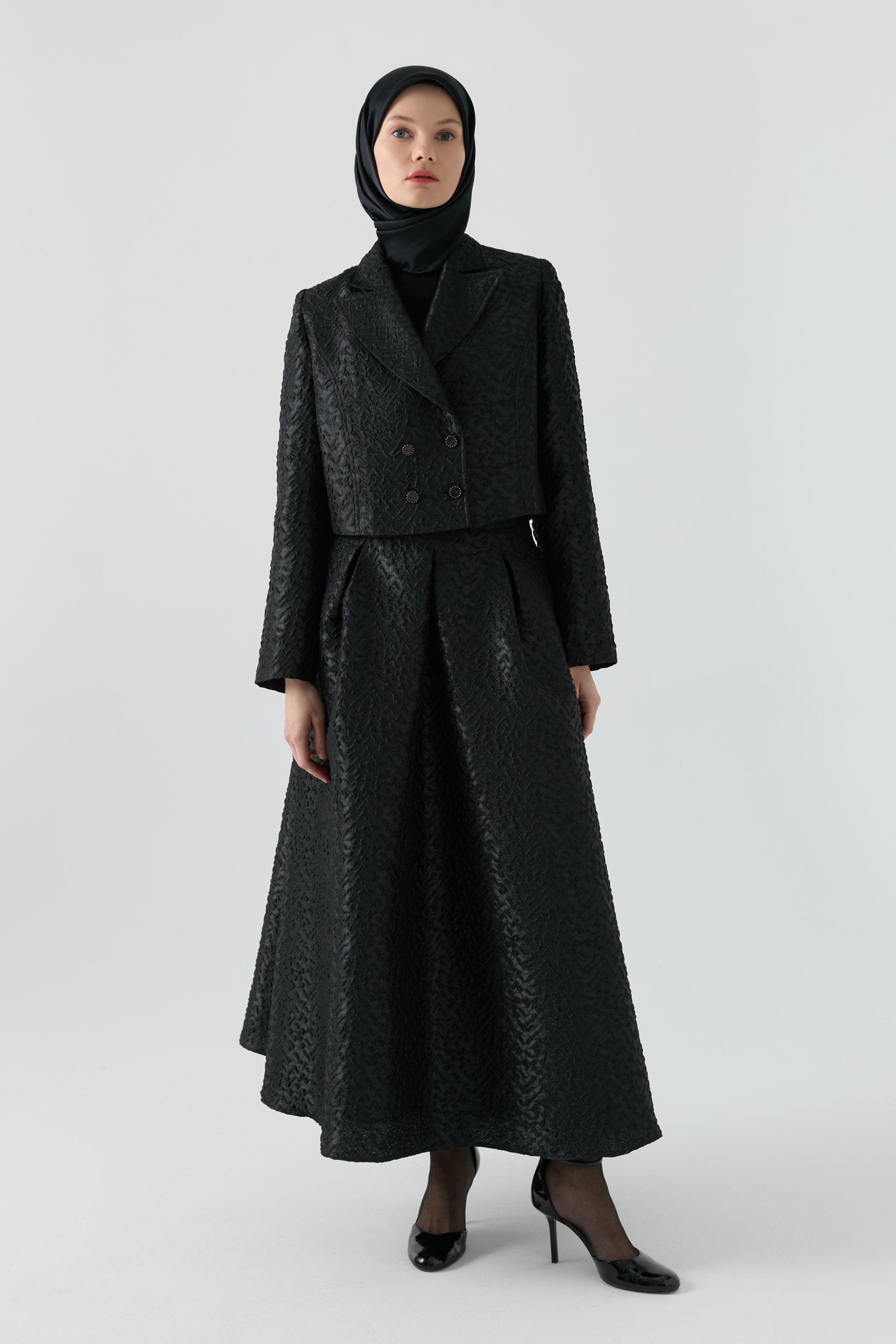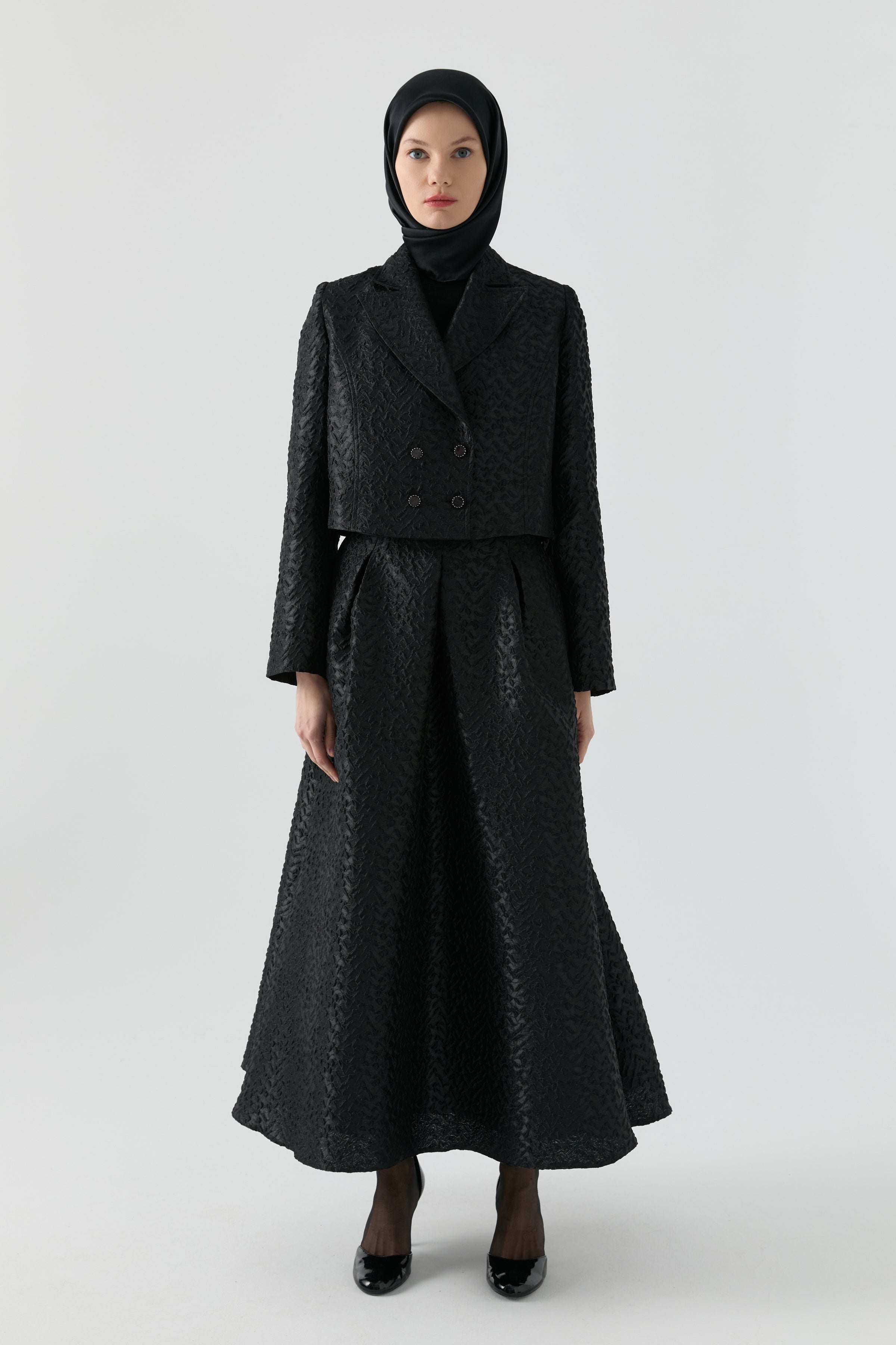 Zarif jakar dokusuyla dikkat çeken bu etek ceket takım, yapılandırılmış formu ve ince desen hareketiyle modern bir şıklık sunar. Etek ve ceketin uyumlu silueti, şehir stiline elegan bir bütünlük kazandırırken; dokulu yüzey tasarıma seçkin bir karakter ekler.