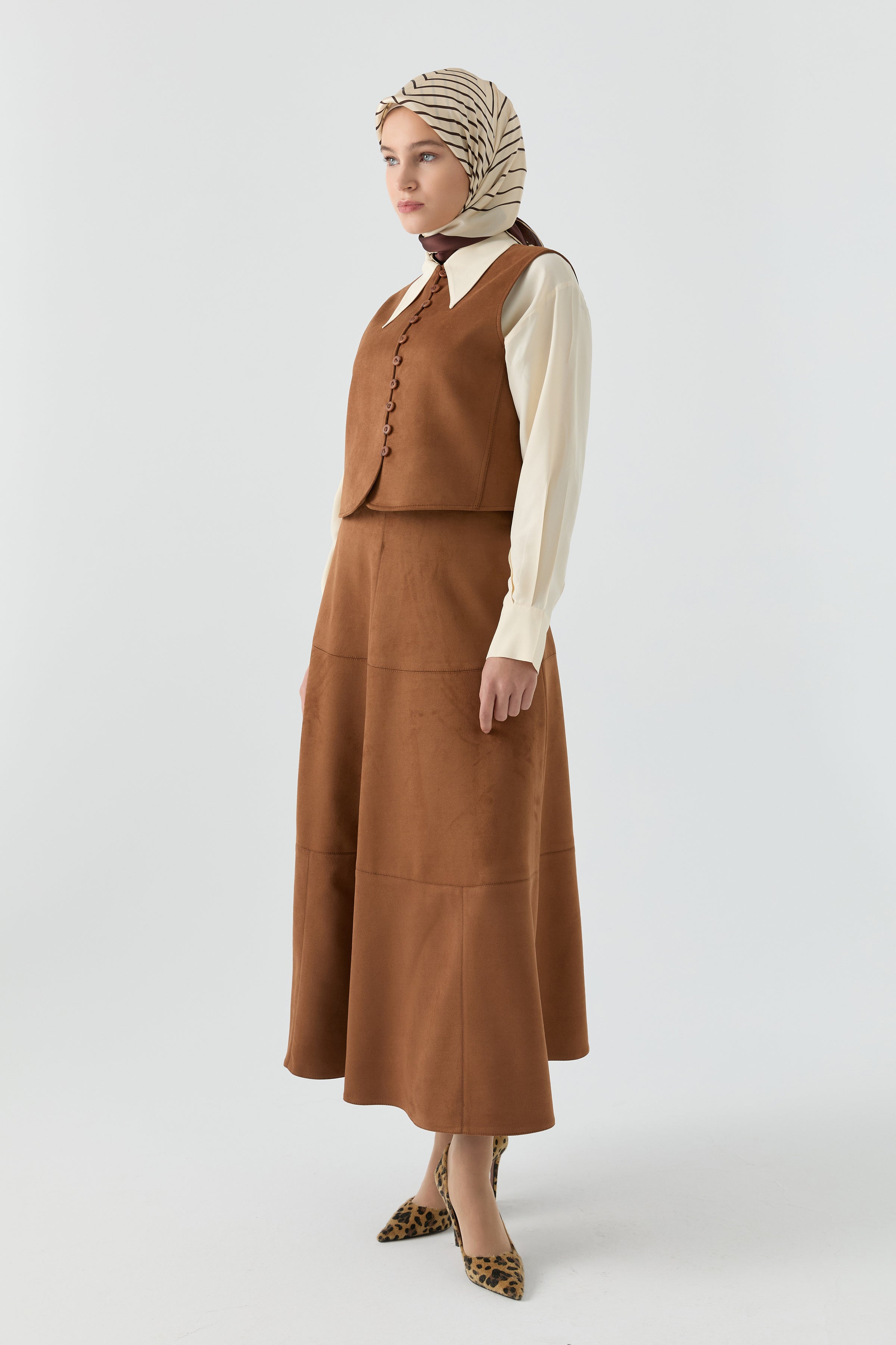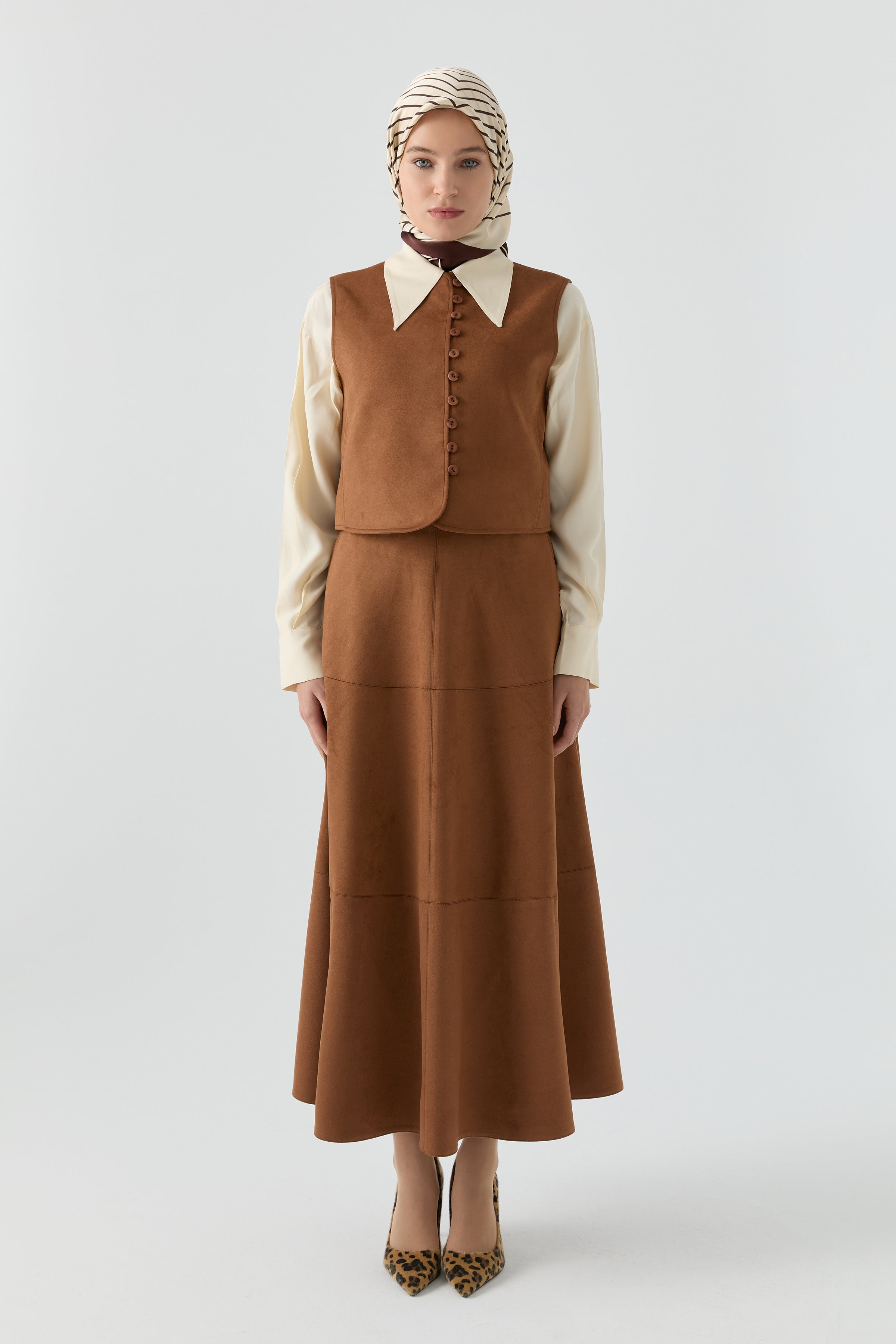 Zarif süet dokusuyla dikkat çeken bu takım, minimalist çizgileri modern bir şıklıkla buluşturur. Yumuşak yüzeyi ve akıcı formu hem konfor hem de seçkin bir duruş sunarken, takımın bütünlüklü silueti şehir stiline güçlü bir zarafet katar.