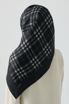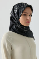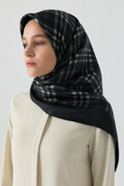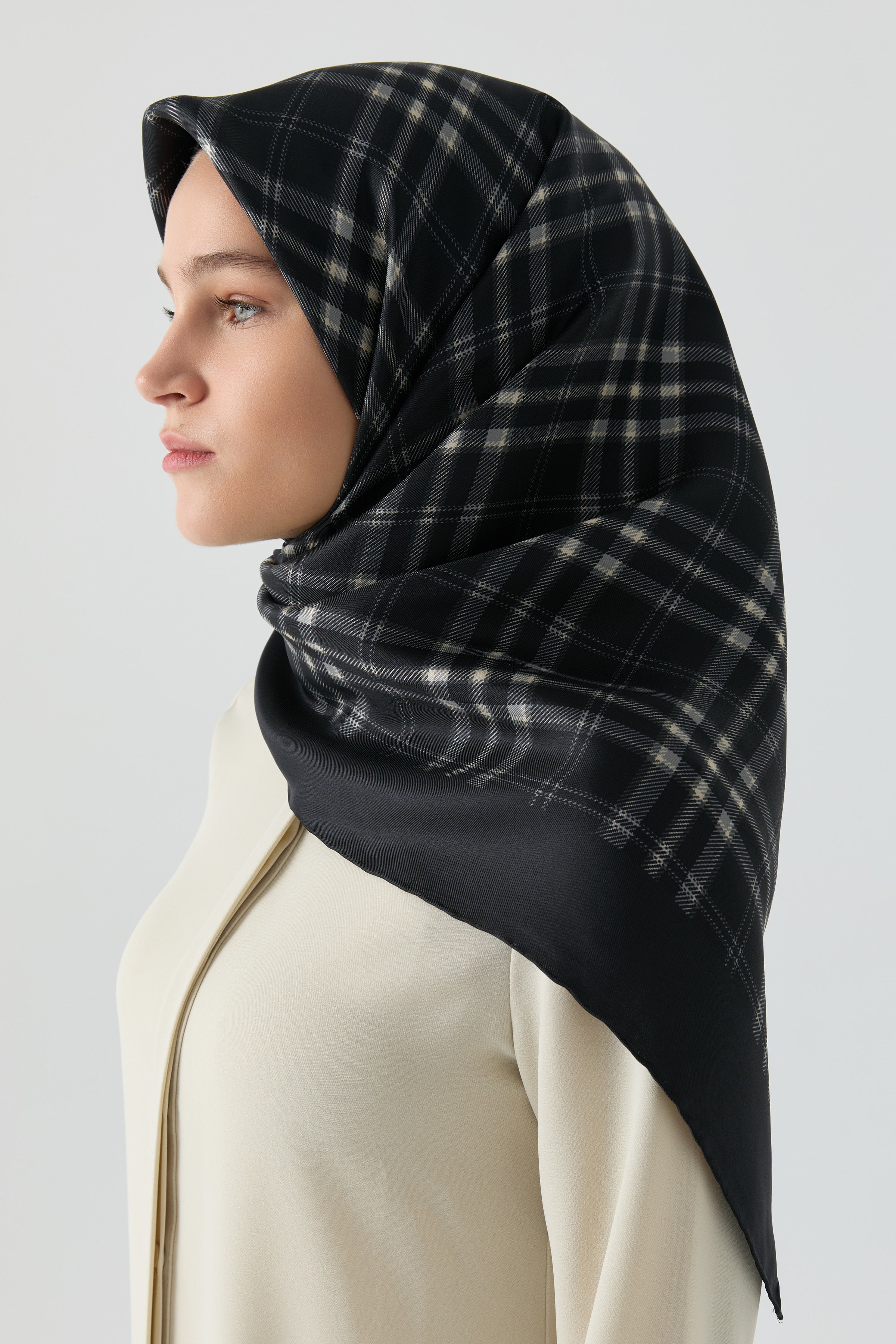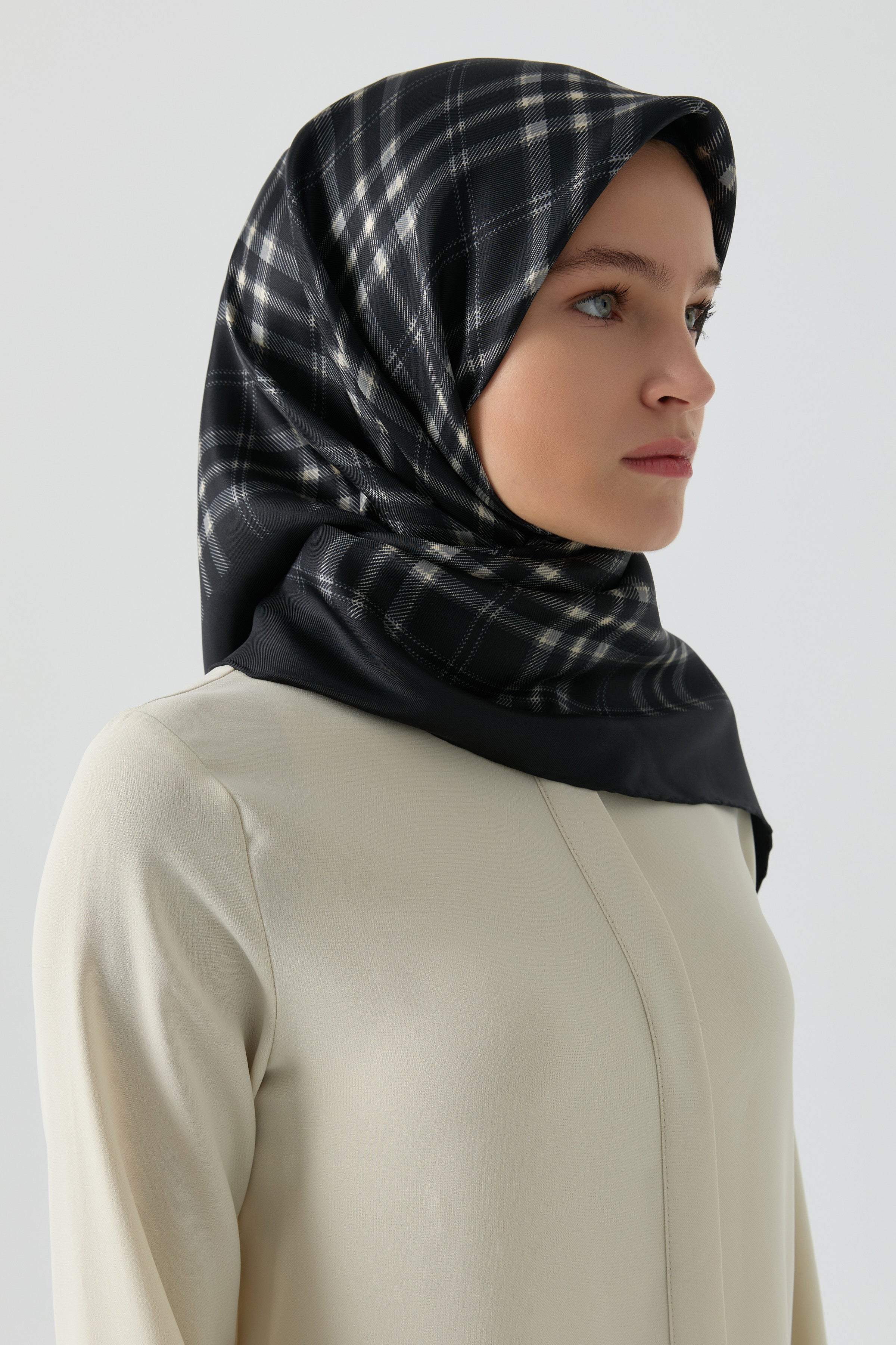 Satenimsi yüzeyi ışığı zarifçe yansıtarak eşarba modern bir ışıltı kazandırırken, ince çizgi kompozisyonu tasarımın sanatsal yönünü öne çıkarır.