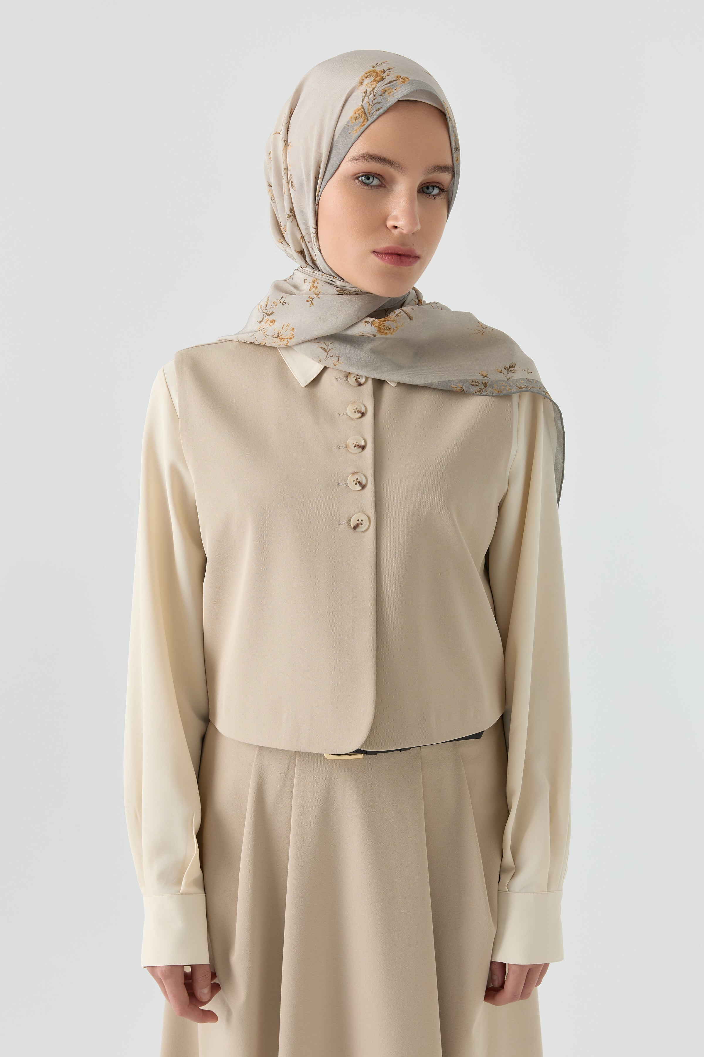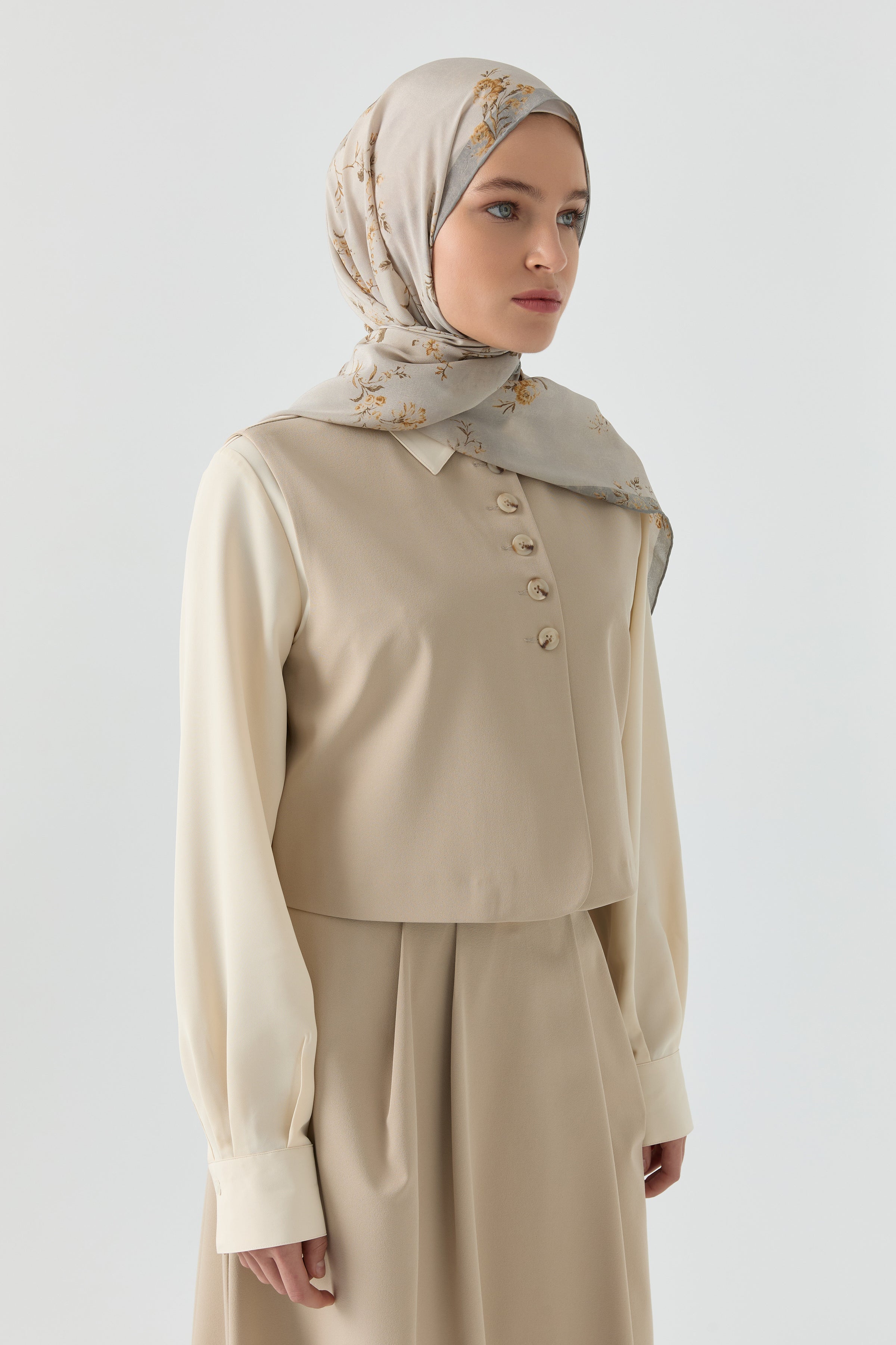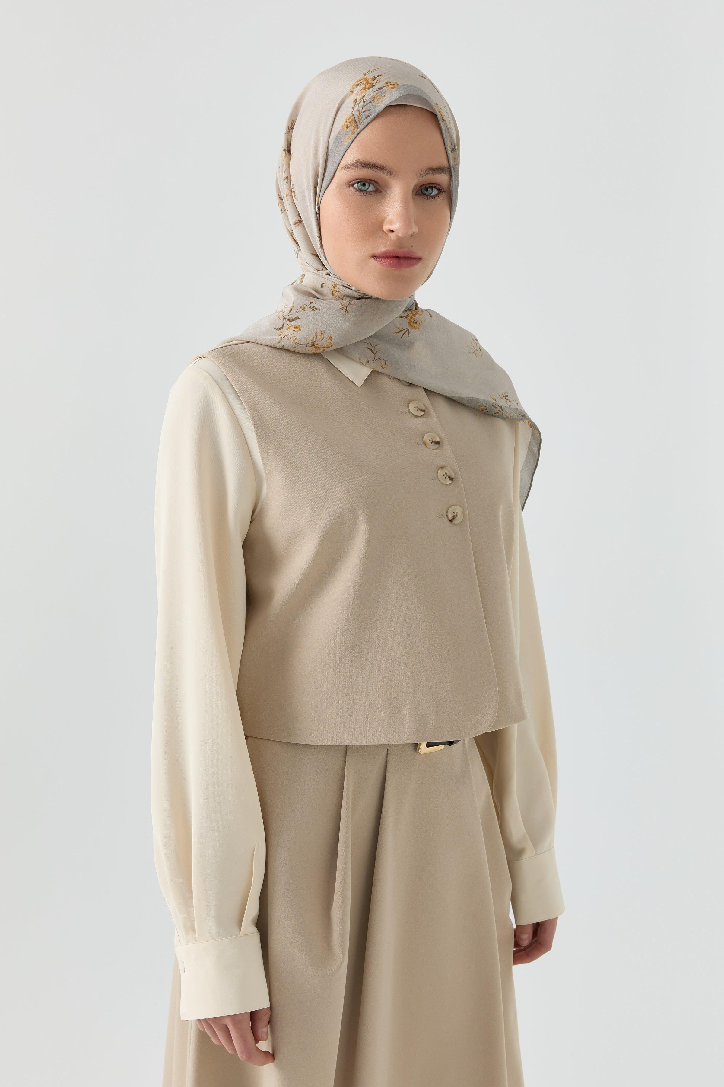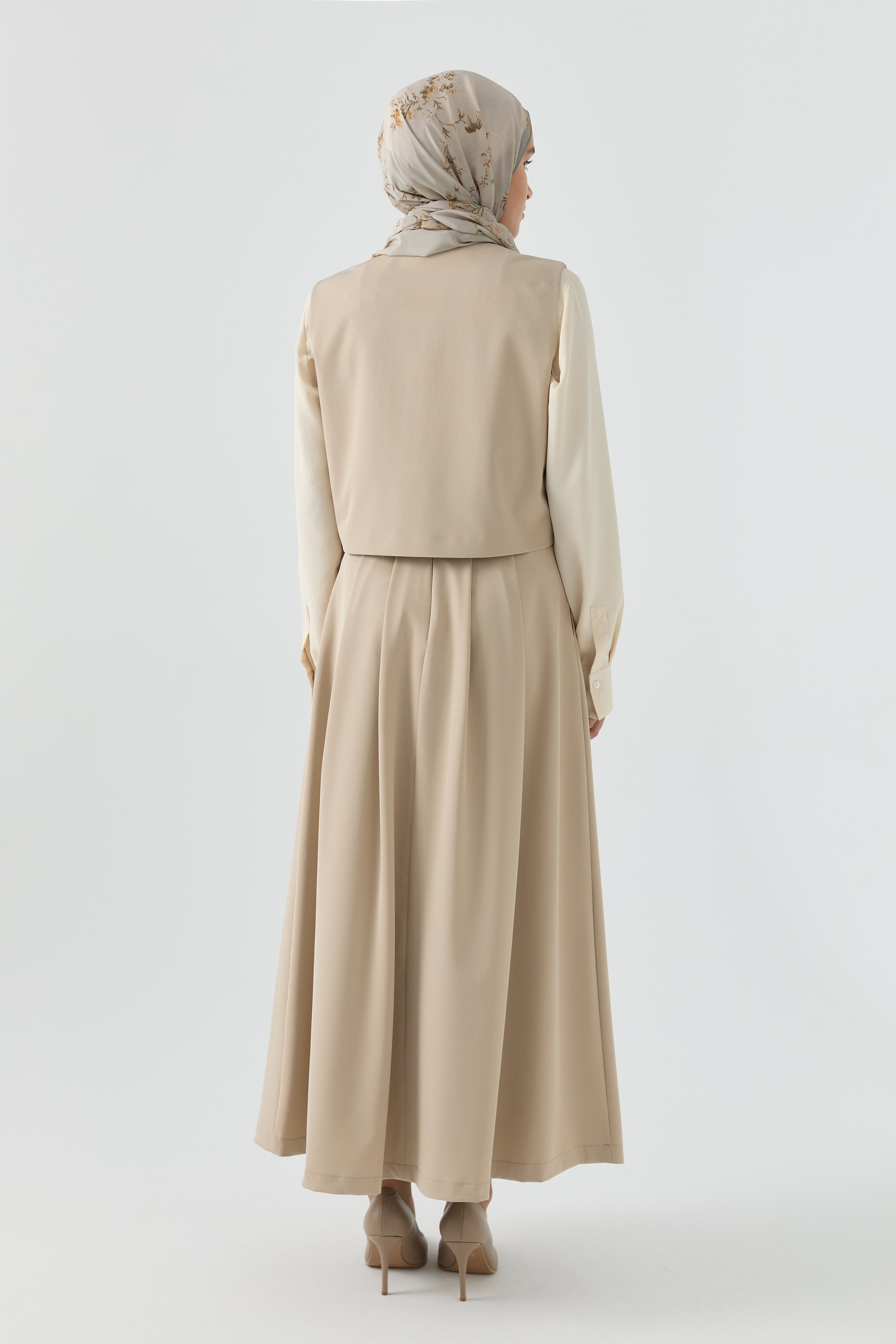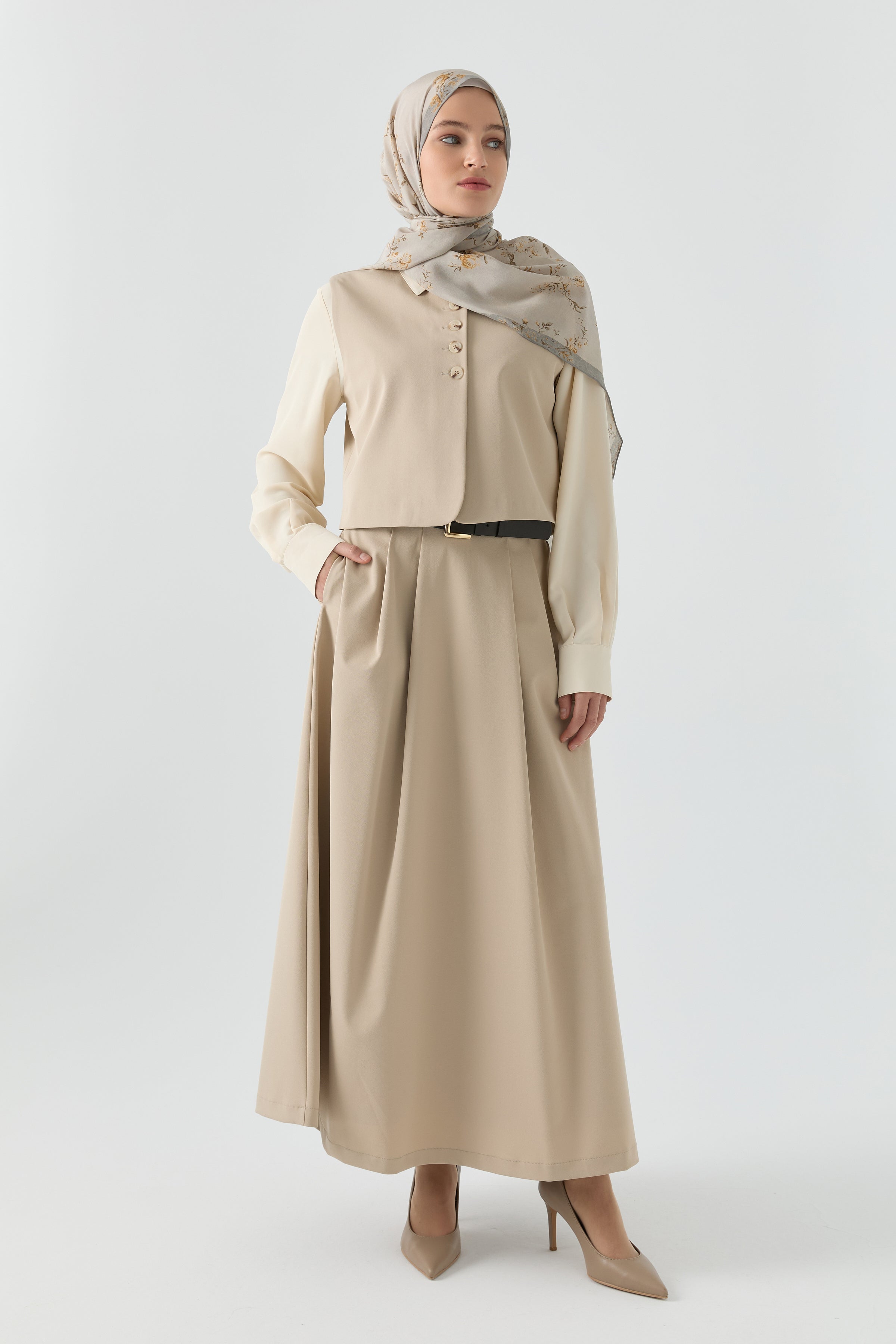 Şıklığı ve modern duruşu bir araya getiren bu takım, zarif yelek detayıyla klasik tarzı güncel dokunuşlarla buluşturur. Etek kesimi ve uyumlu tasarımı, feminen silueti ön plana çıkarırken, hafif kumaşı konforlu bir kullanım sağlar.