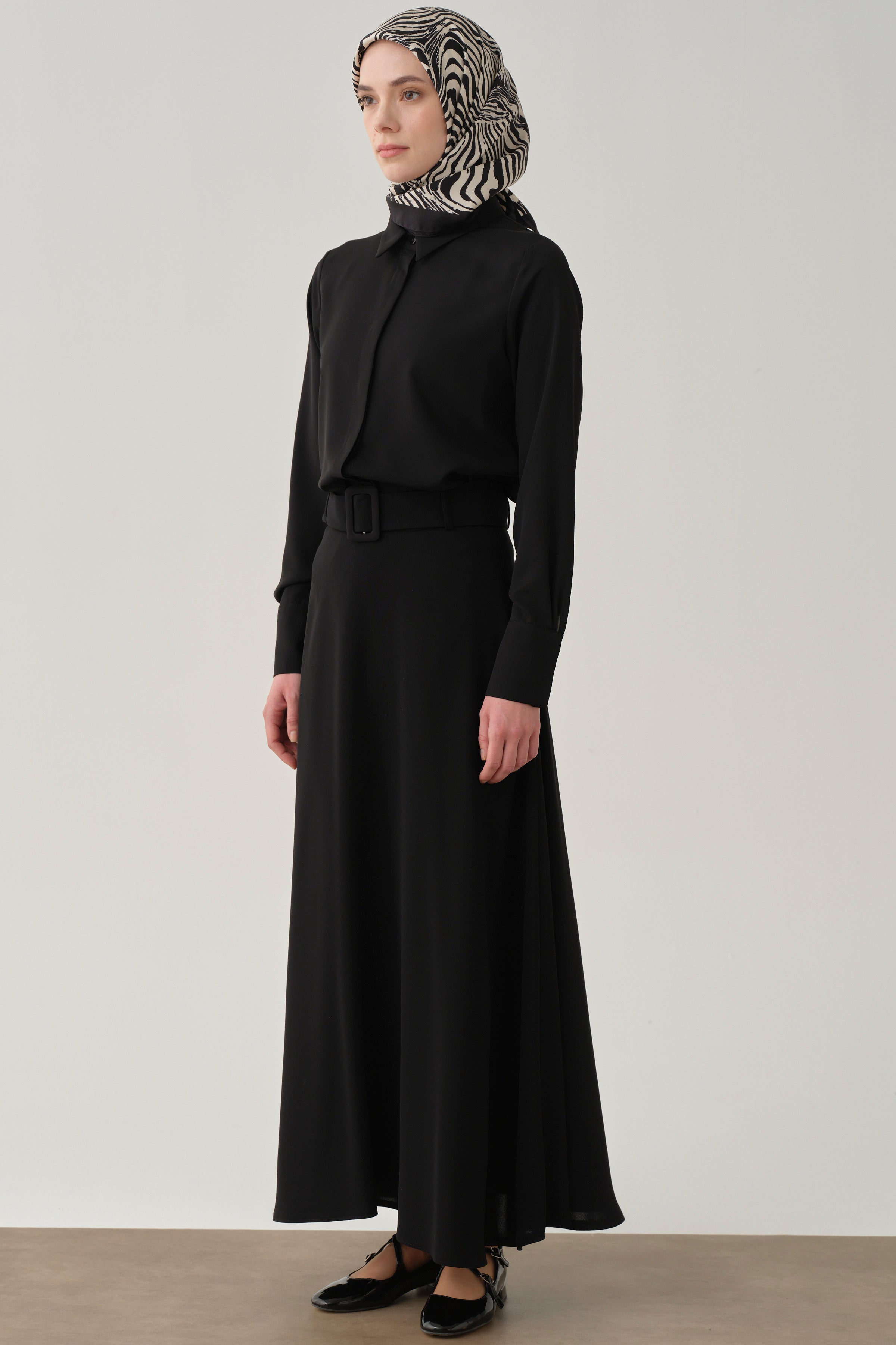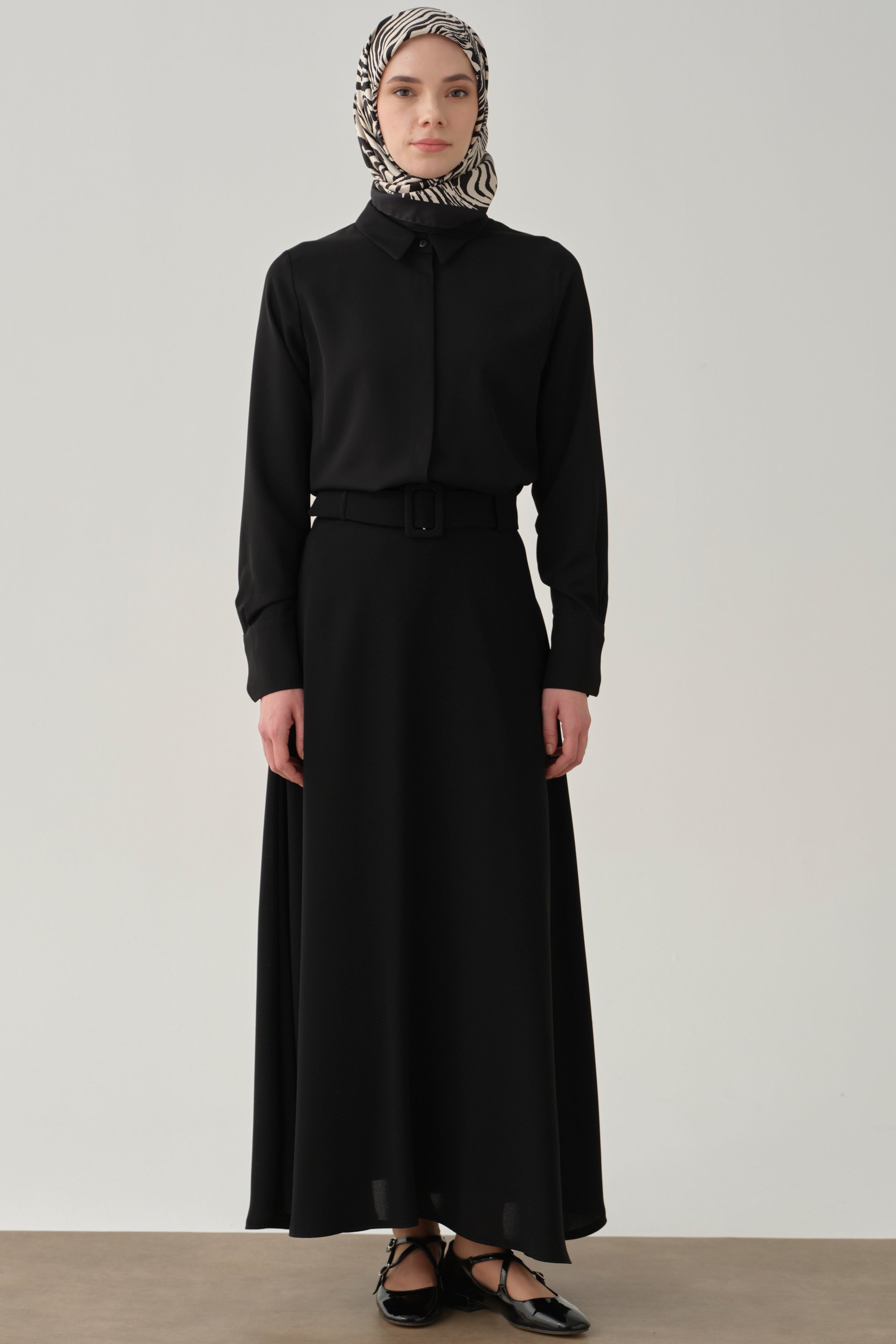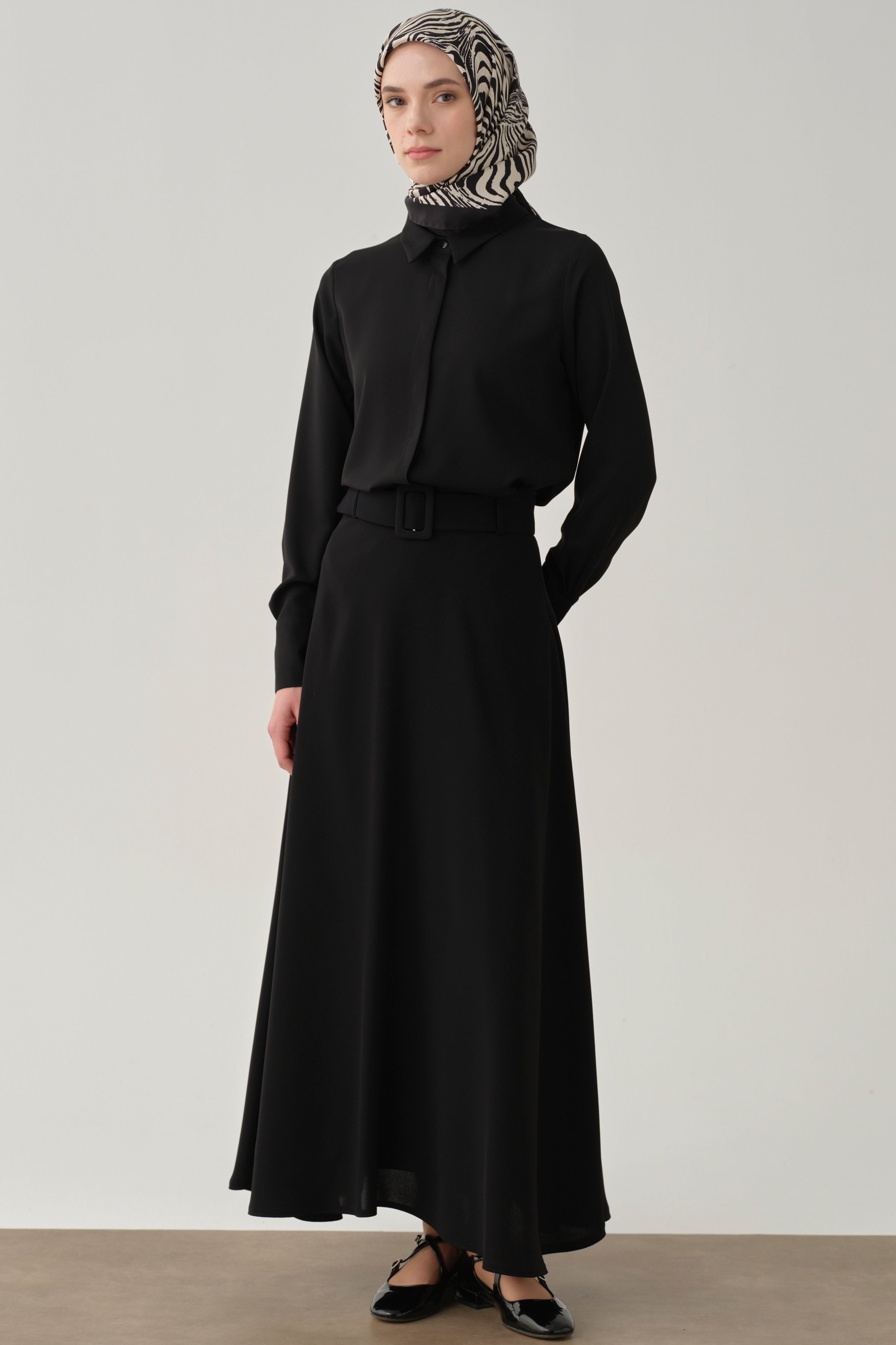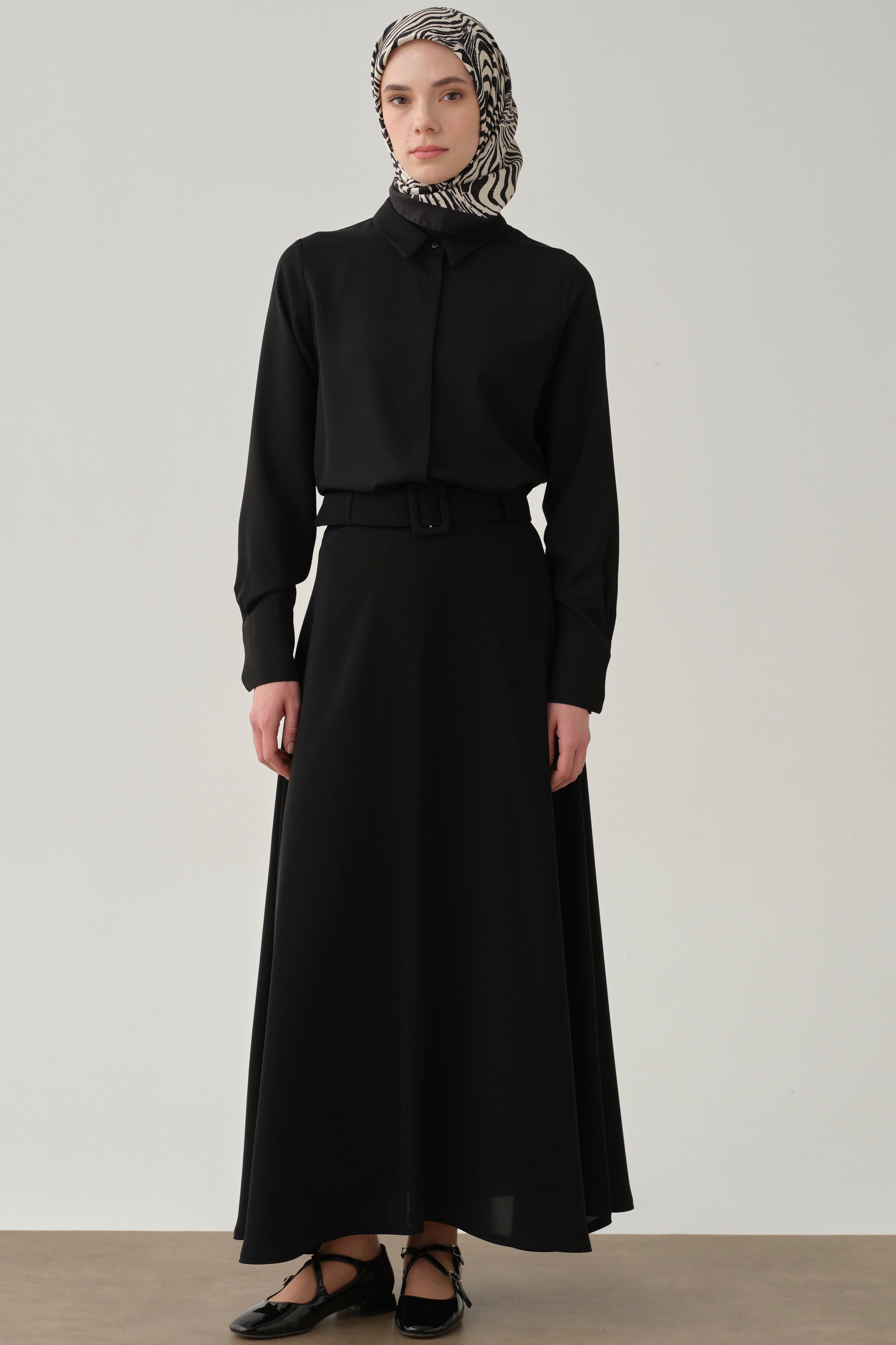 Yüksek Bel Kemerli Kloş Etek - Siyah