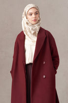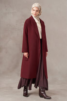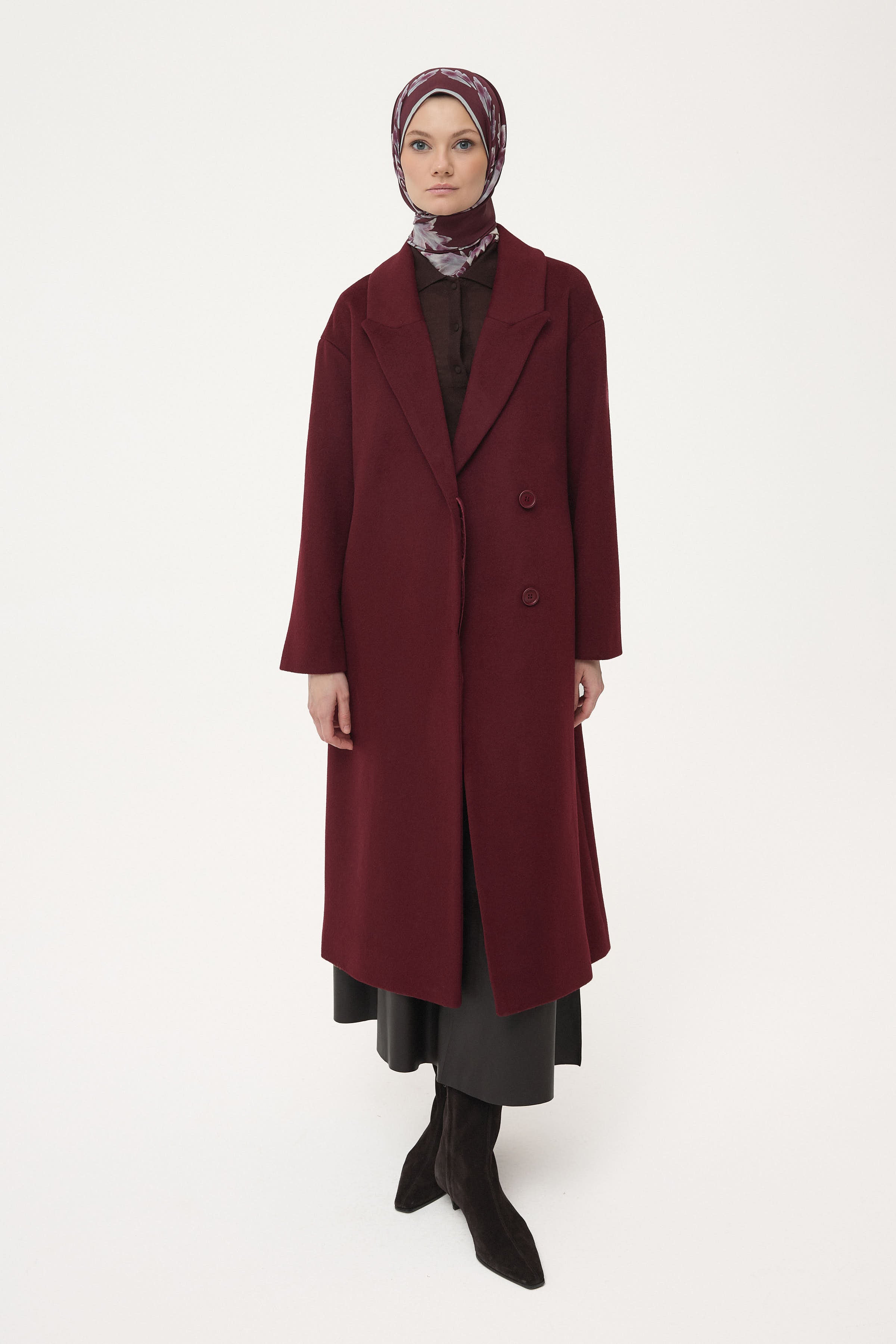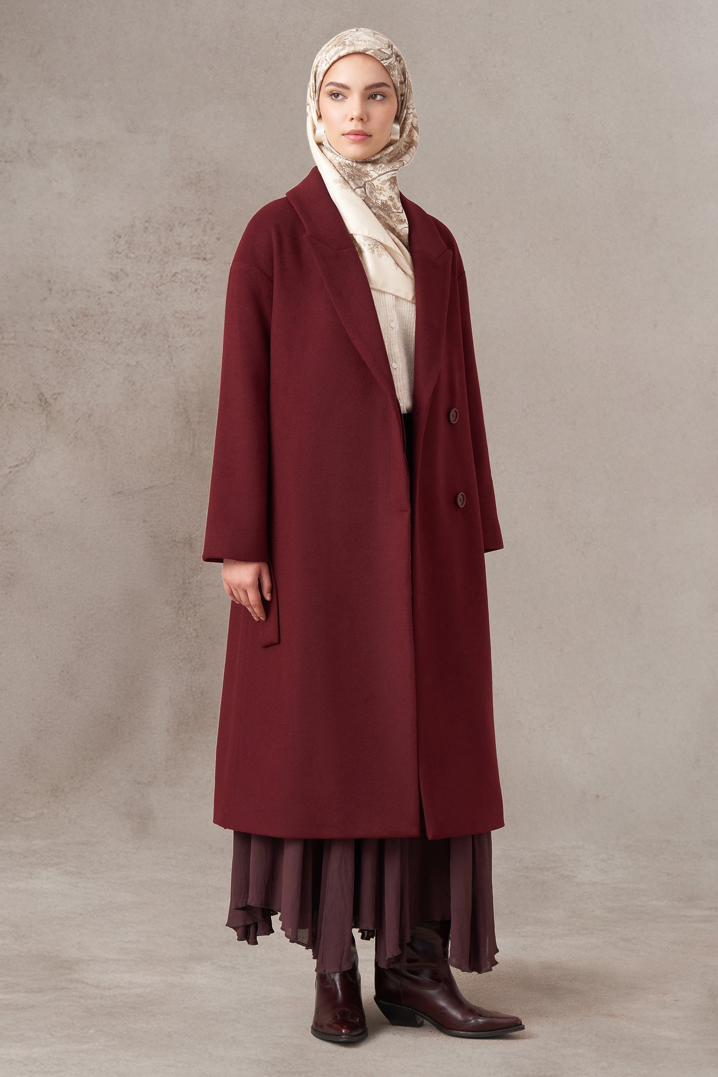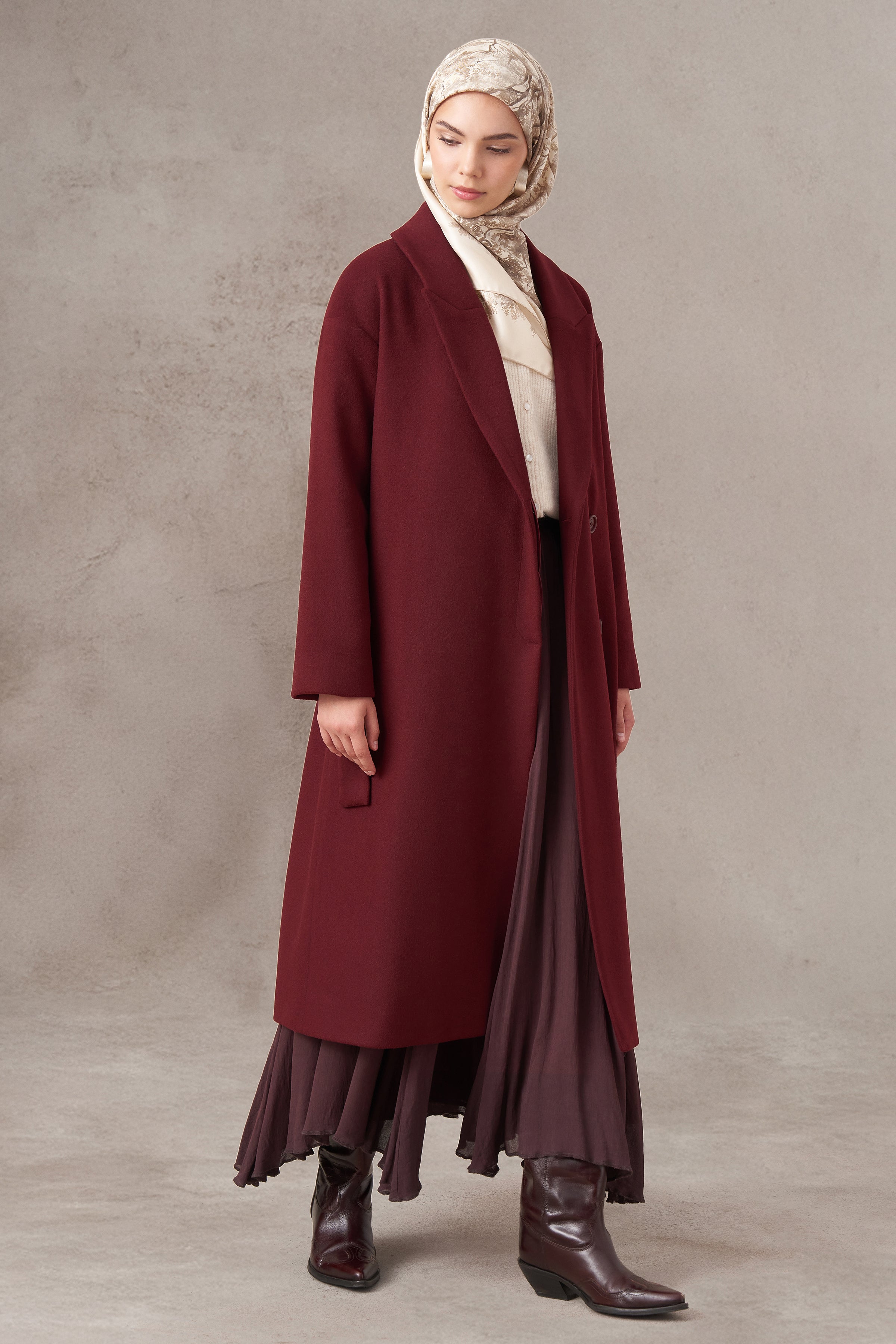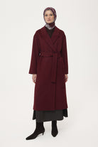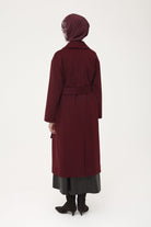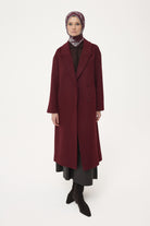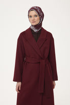 Yün Karışımlı Kuşaklı Kaban - Bordo
