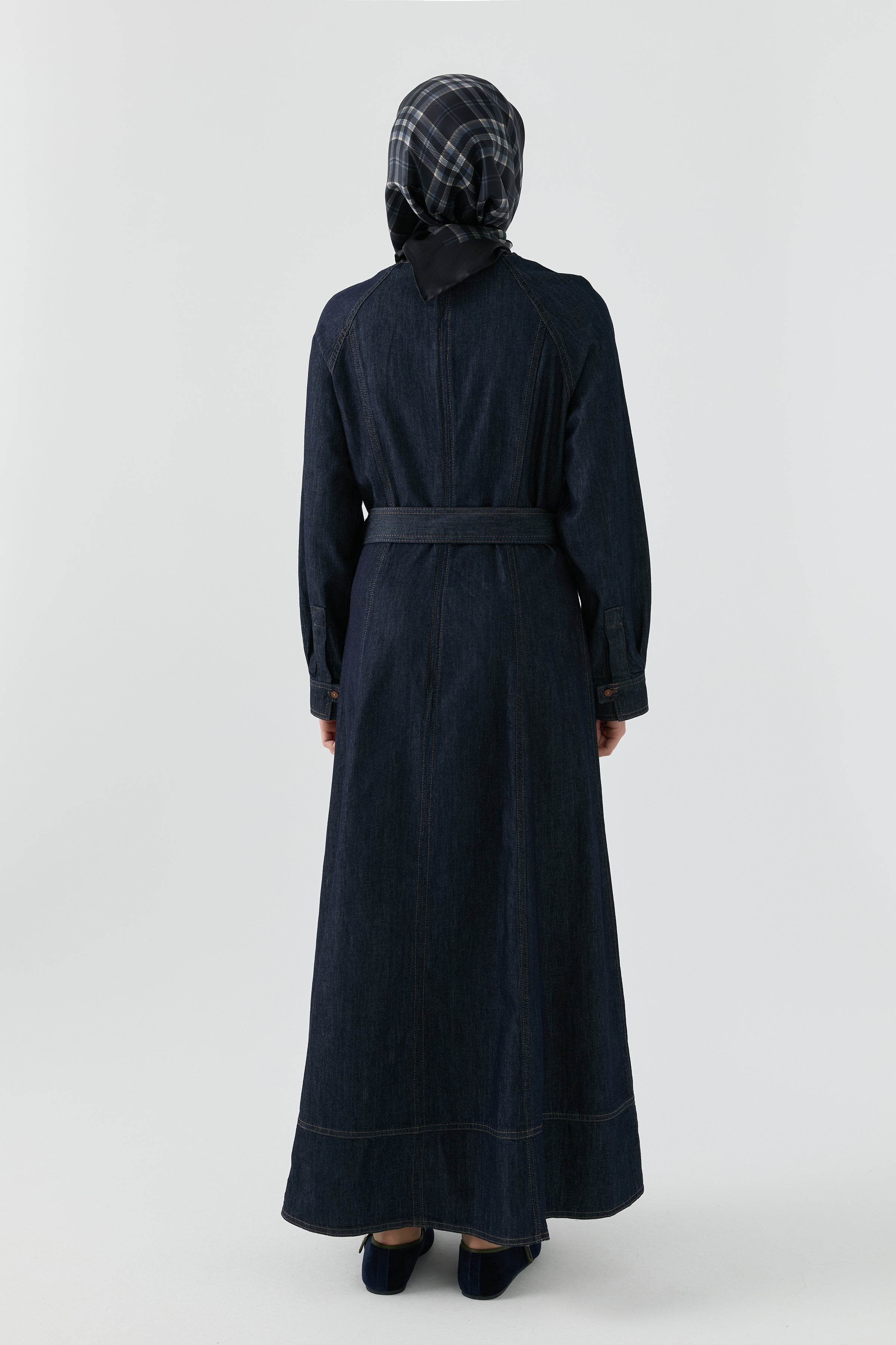 Zamansız denim dokusunu modern bir kesimle buluşturan bu elbise, sade ama güçlü bir siluet oluşturur. Hafif dokusu ve akıcı formu sayesinde gün boyu konfor sağlarken, özenli dikiş detayları tasarıma sofistike bir duruş kazandırır.