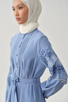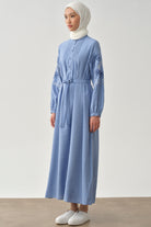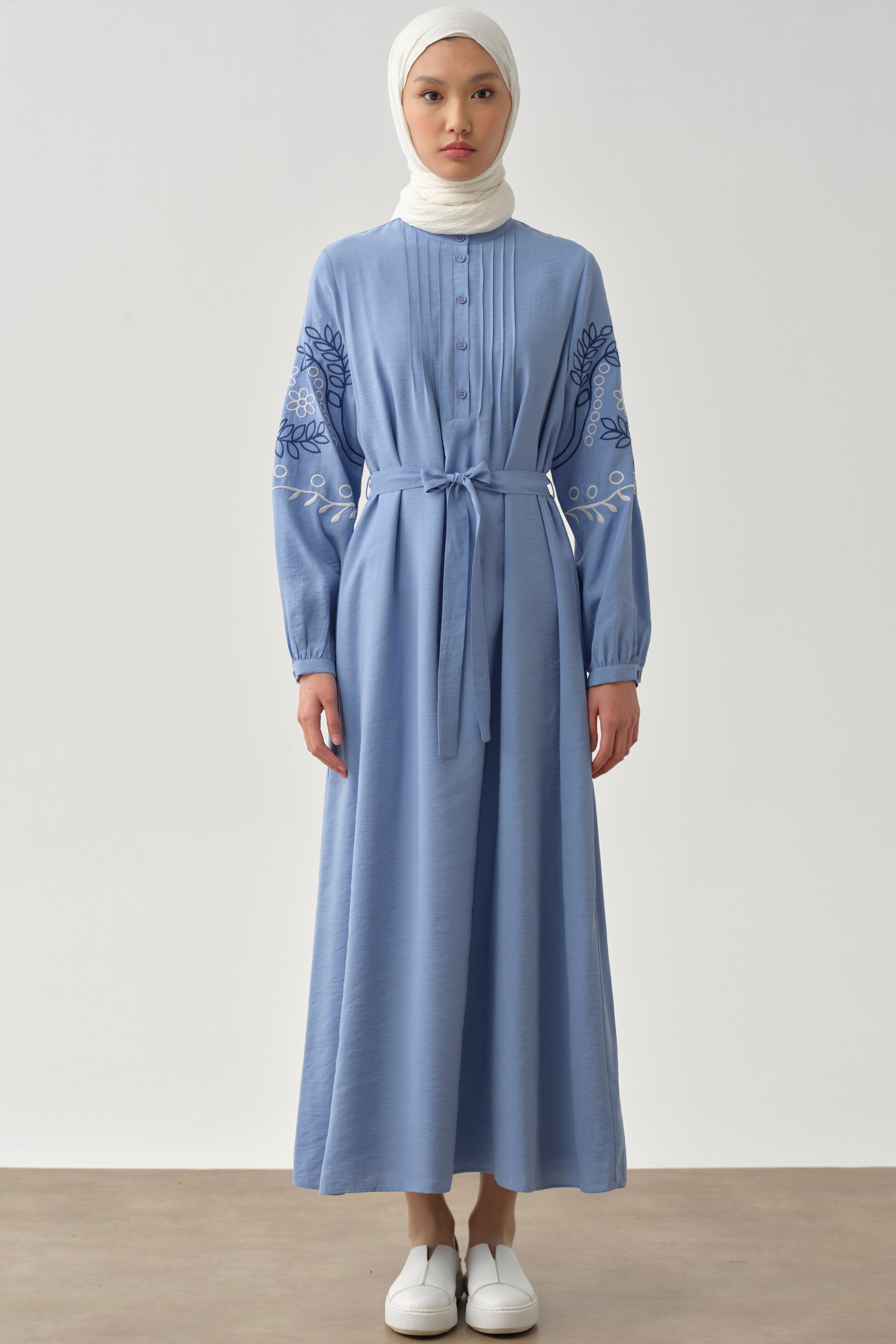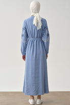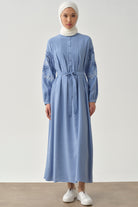 Hakim Yaka Kolları Nakışlı Elbise - Mavi