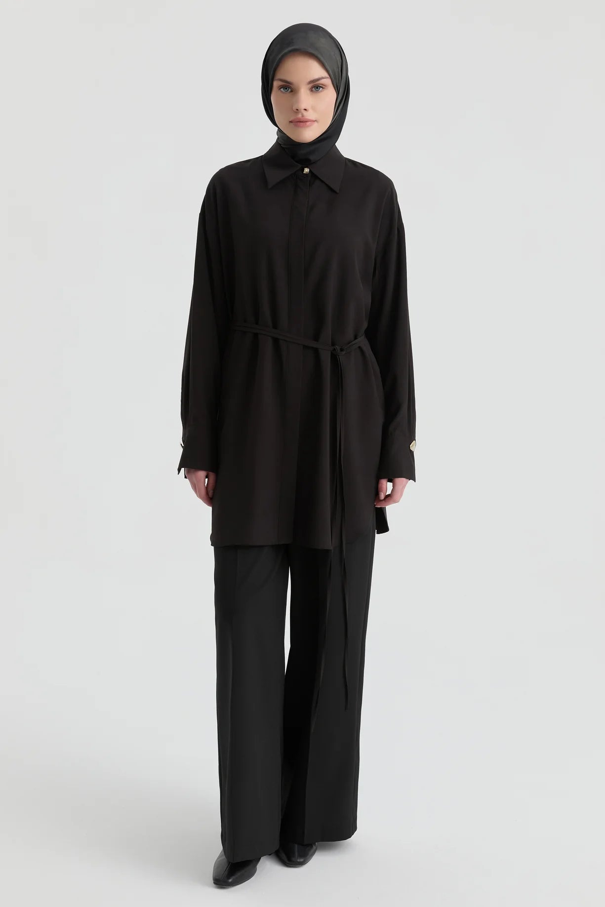 Biye detaylı bağlama formuyla tasarıma zarif bir hareket kazandıran bu tunik, akıcı yapısıyla gün boyu konfor sunar.