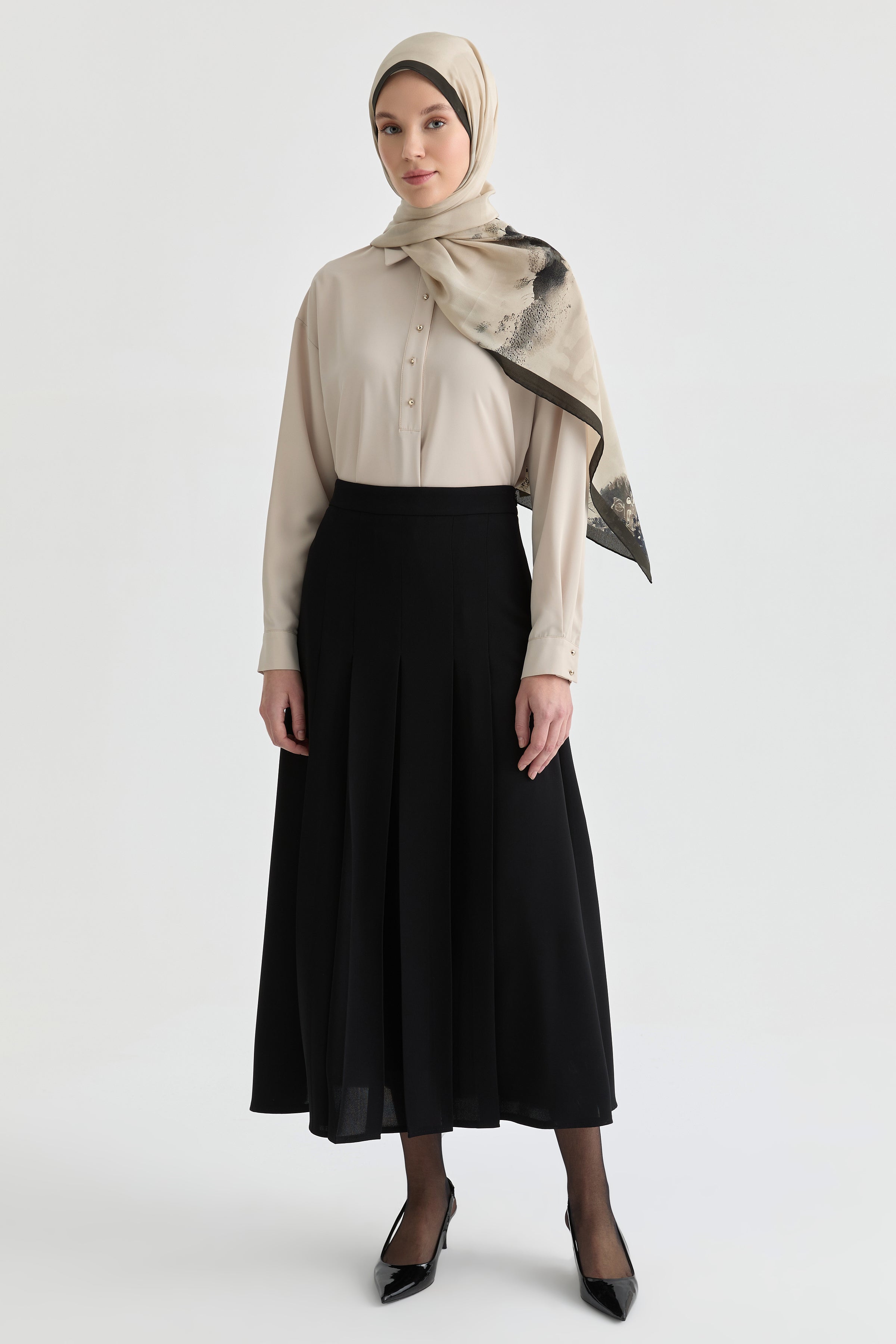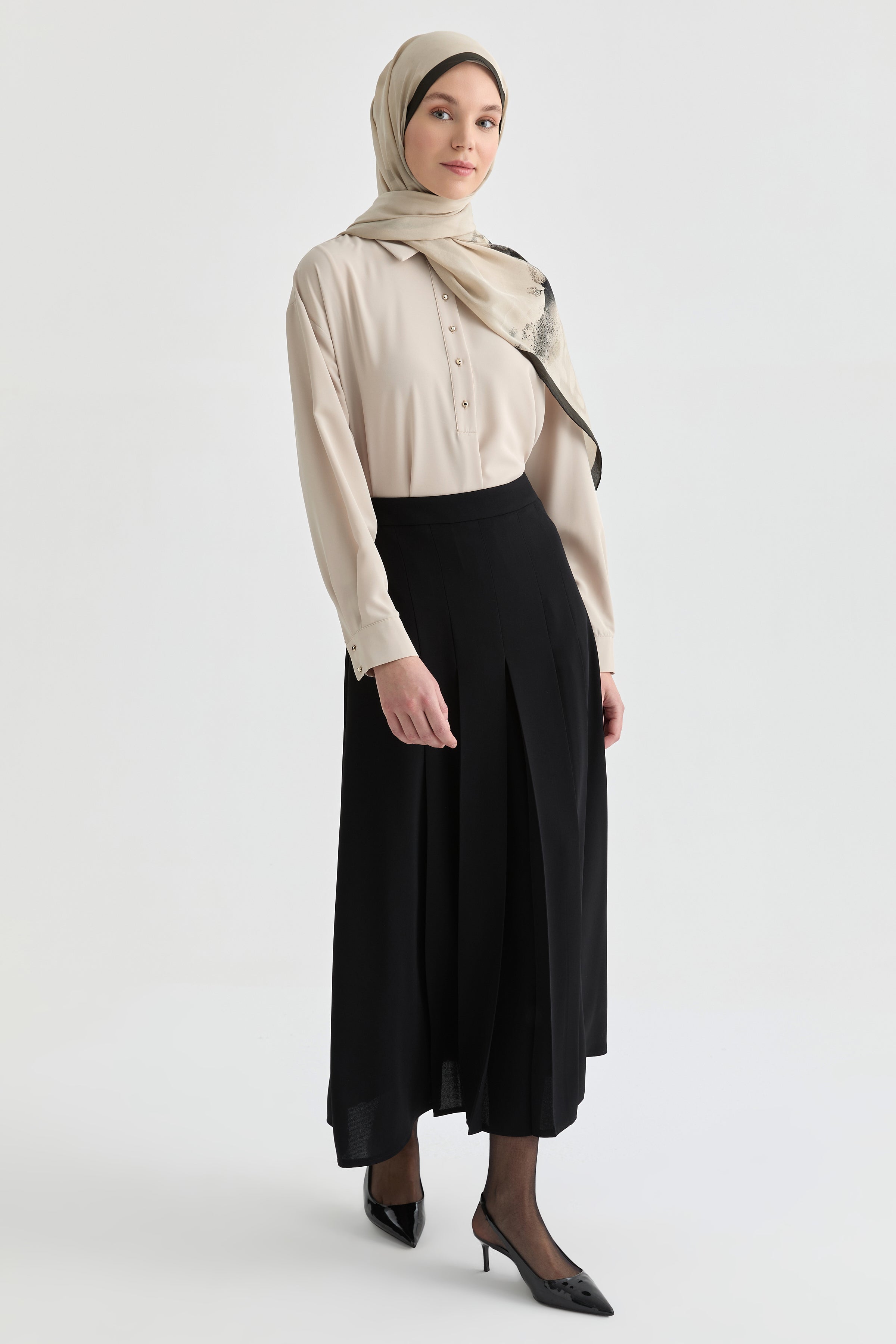 Basic gömlek ve topuklu ayakkabılar ile her ortamda şık bir görünüm elde edebilirsiniz.