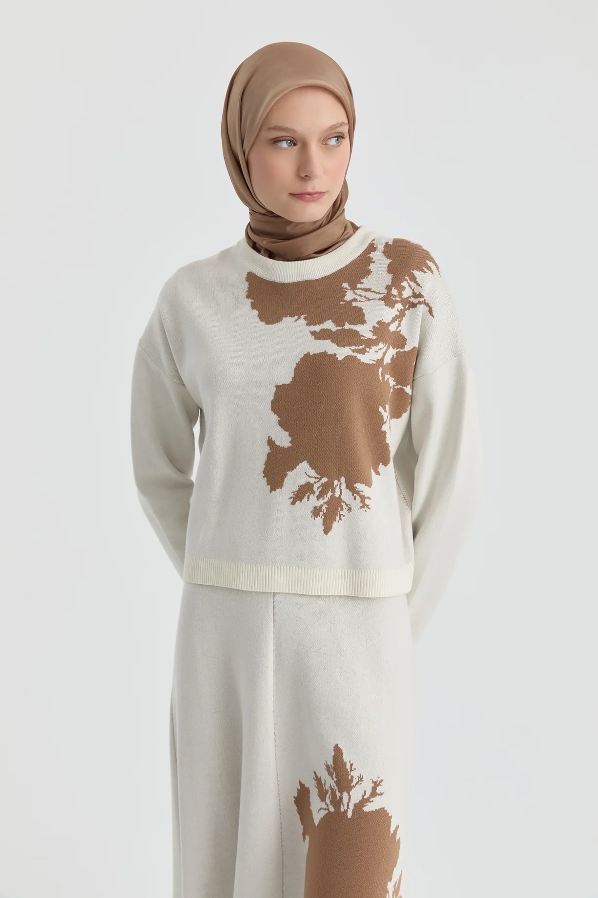Zarif çiçek desenleriyle bütünlük kazanan bu triko takım, yumuşak dokusu ve akıcı formuyla hem konforlu hem de modern bir görünüm sunar. Üst ve alt parçanın uyumlu silueti şehir stiline feminen bir zarafet katar.