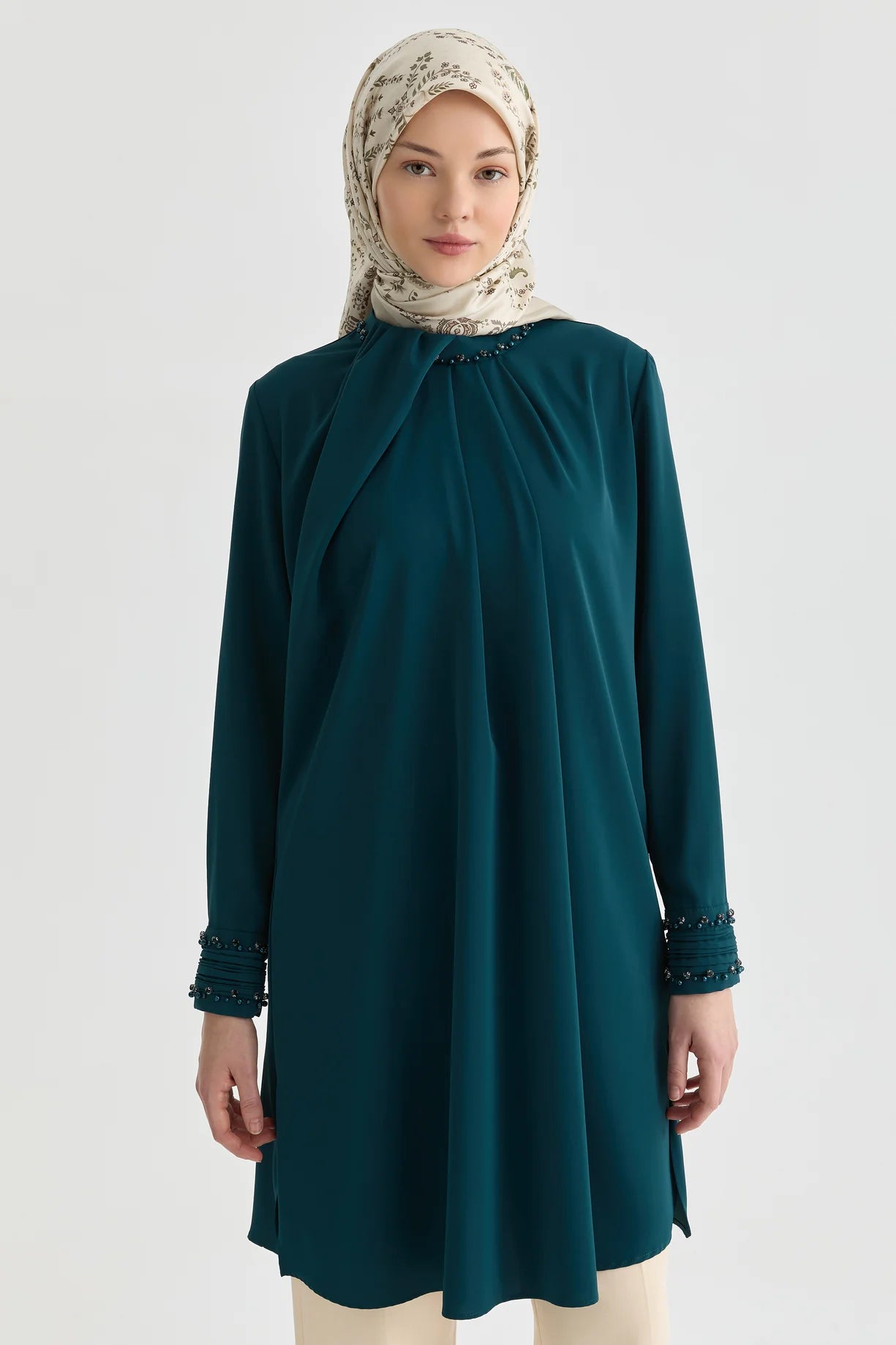 İşlemeli Pileli Tunik - Petrol