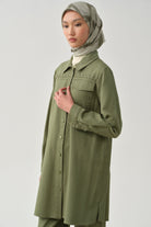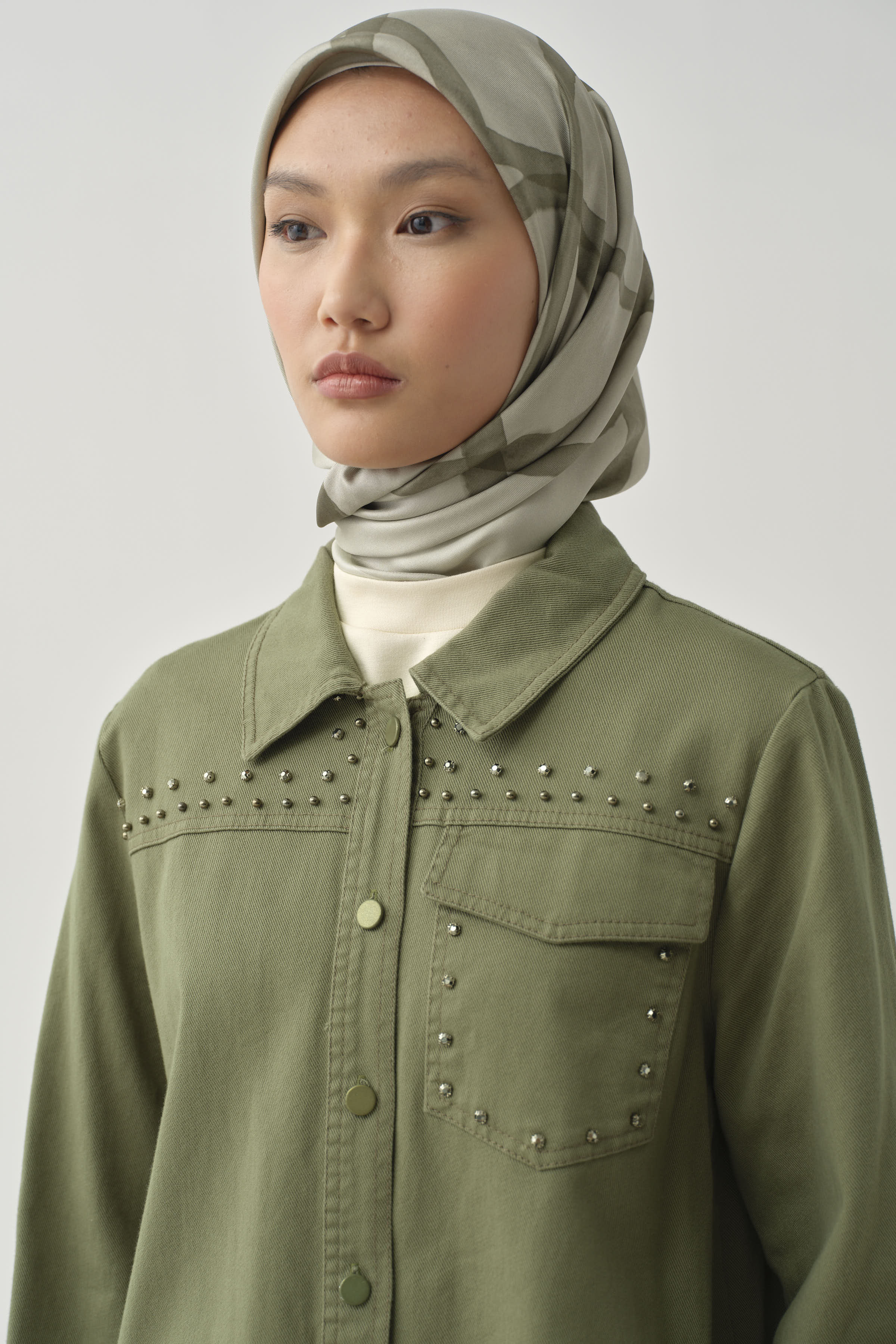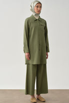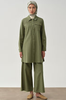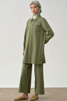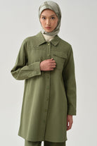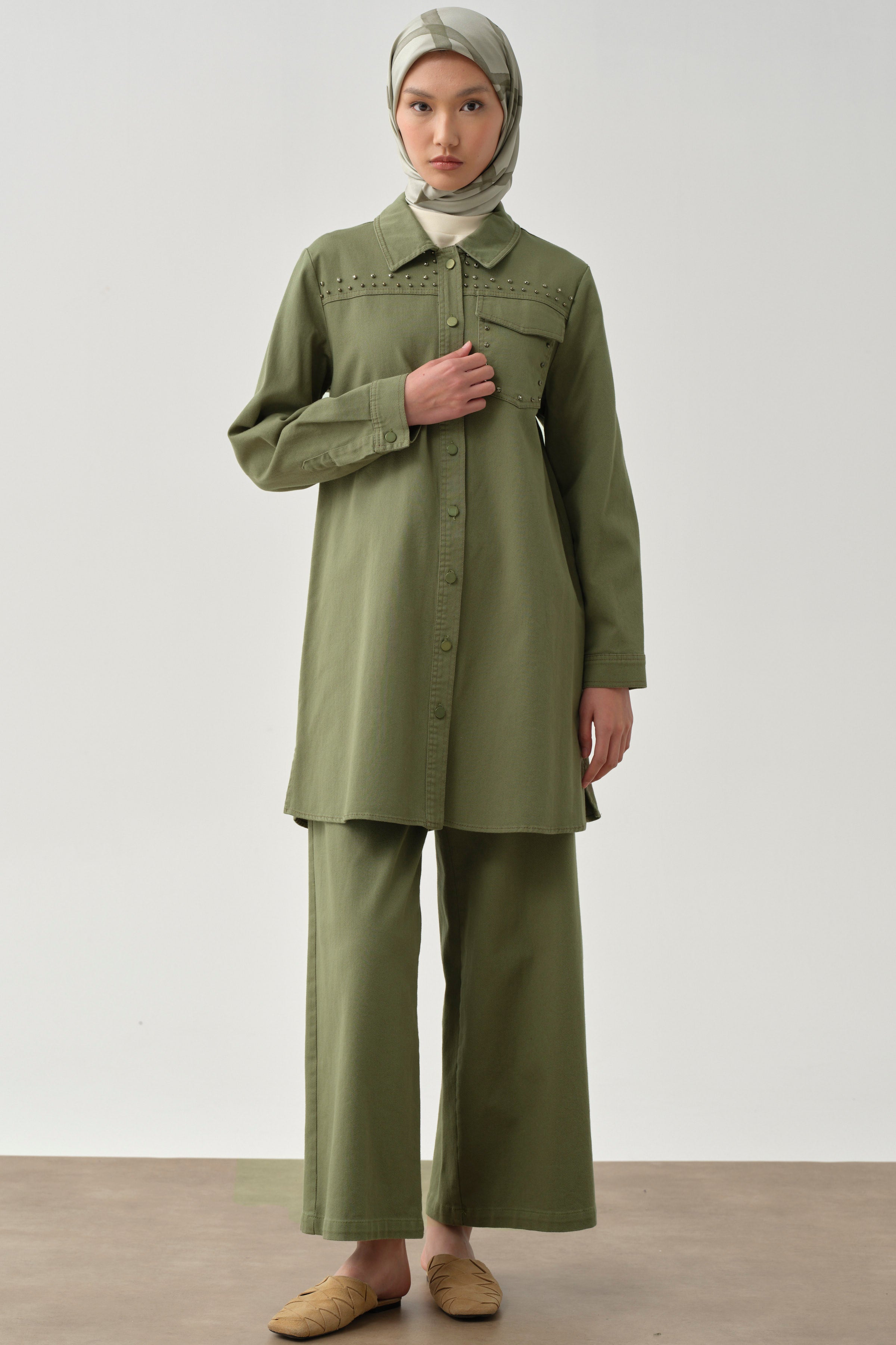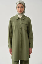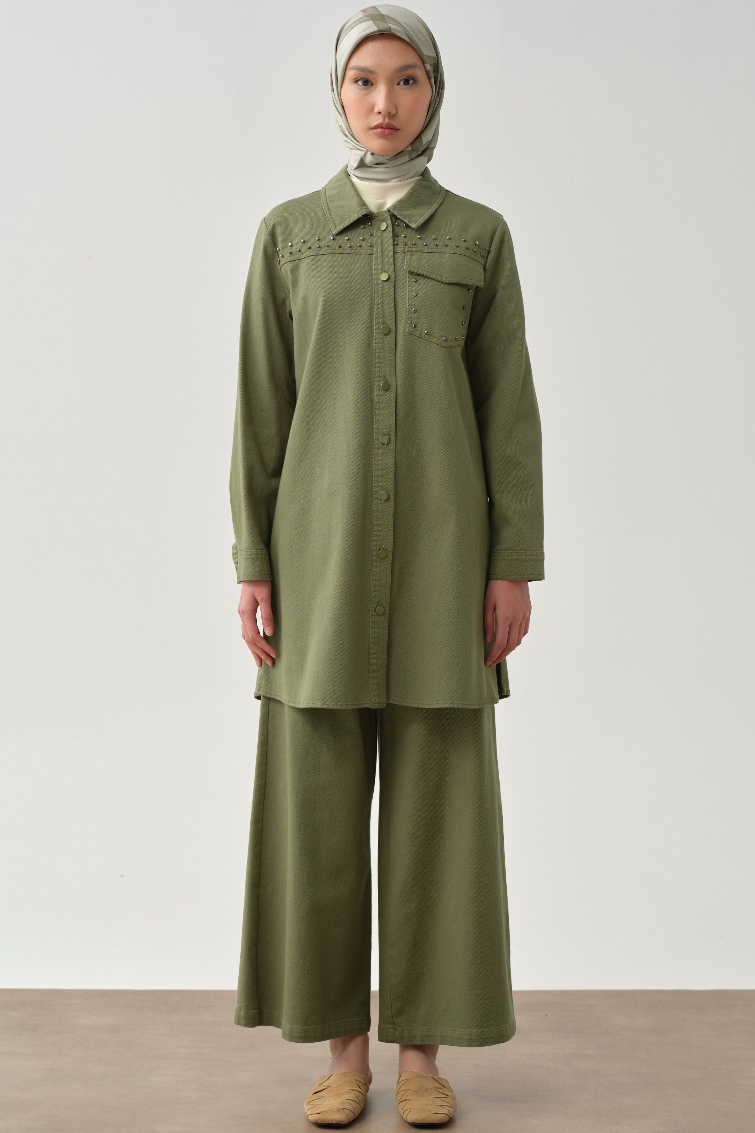 Taş Çakmalı Yırtmaçlı Canvas Gömlek - Haki