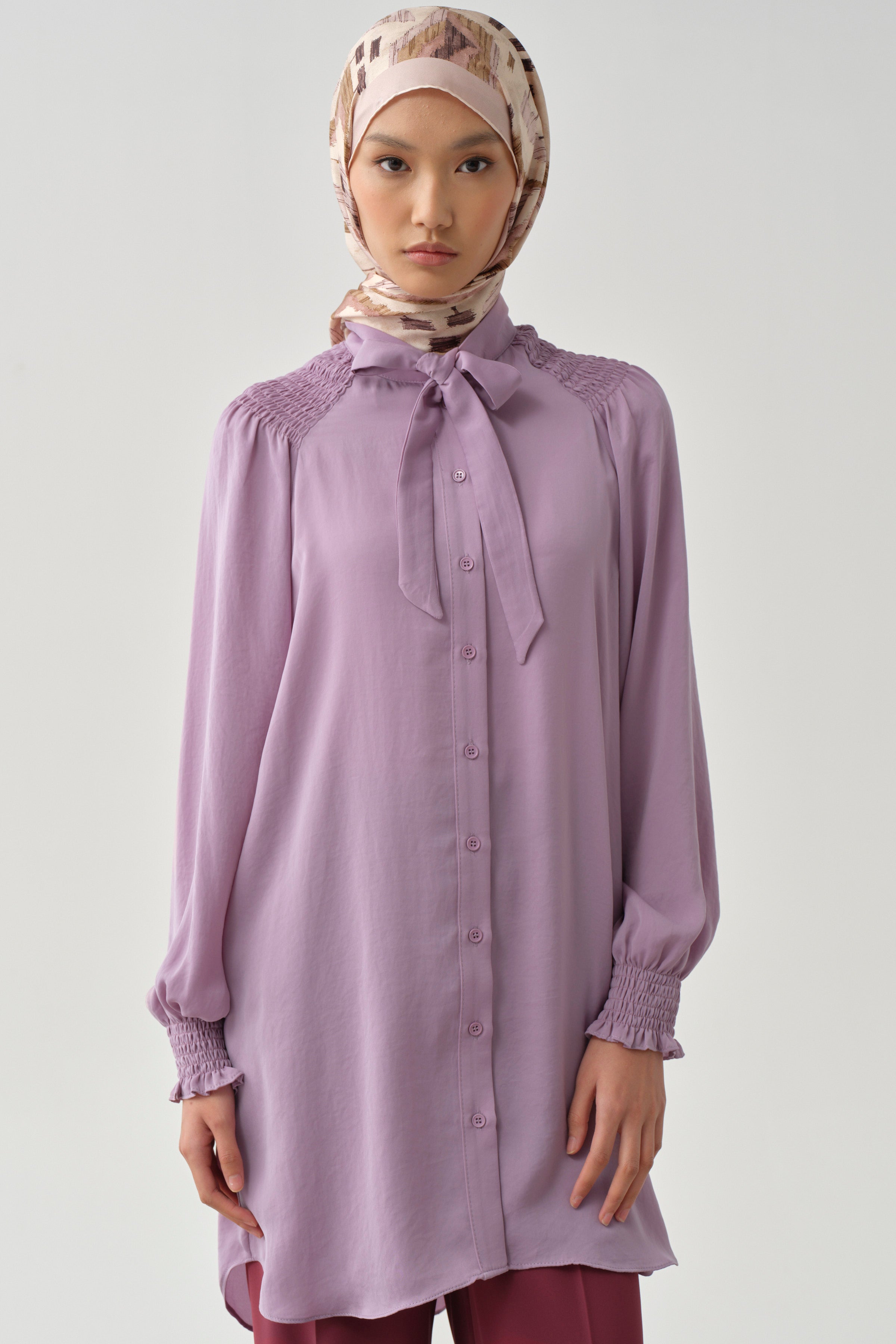 Fular Yaka Büzgü Detay Tunik - Lila