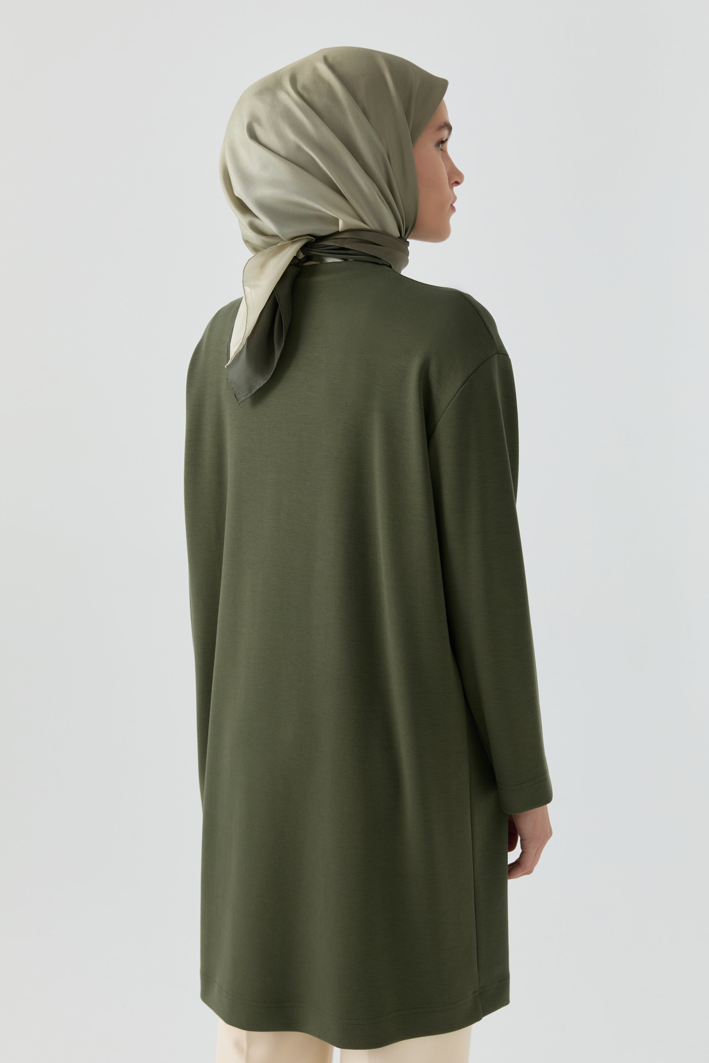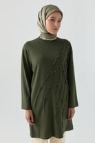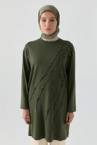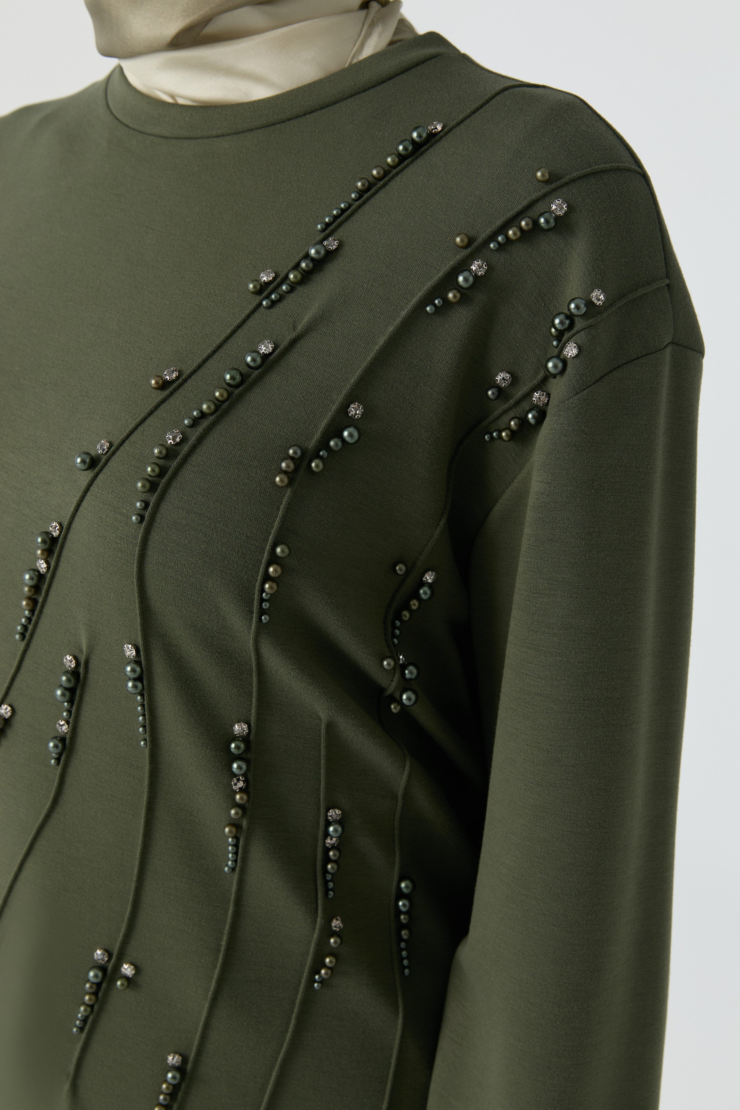 Minimal şıklığı ışıltılı dokunuşlarla buluşturan bu tunik, ön kısmındaki taş detaylarıyla zarif bir parlaklık kazanır.