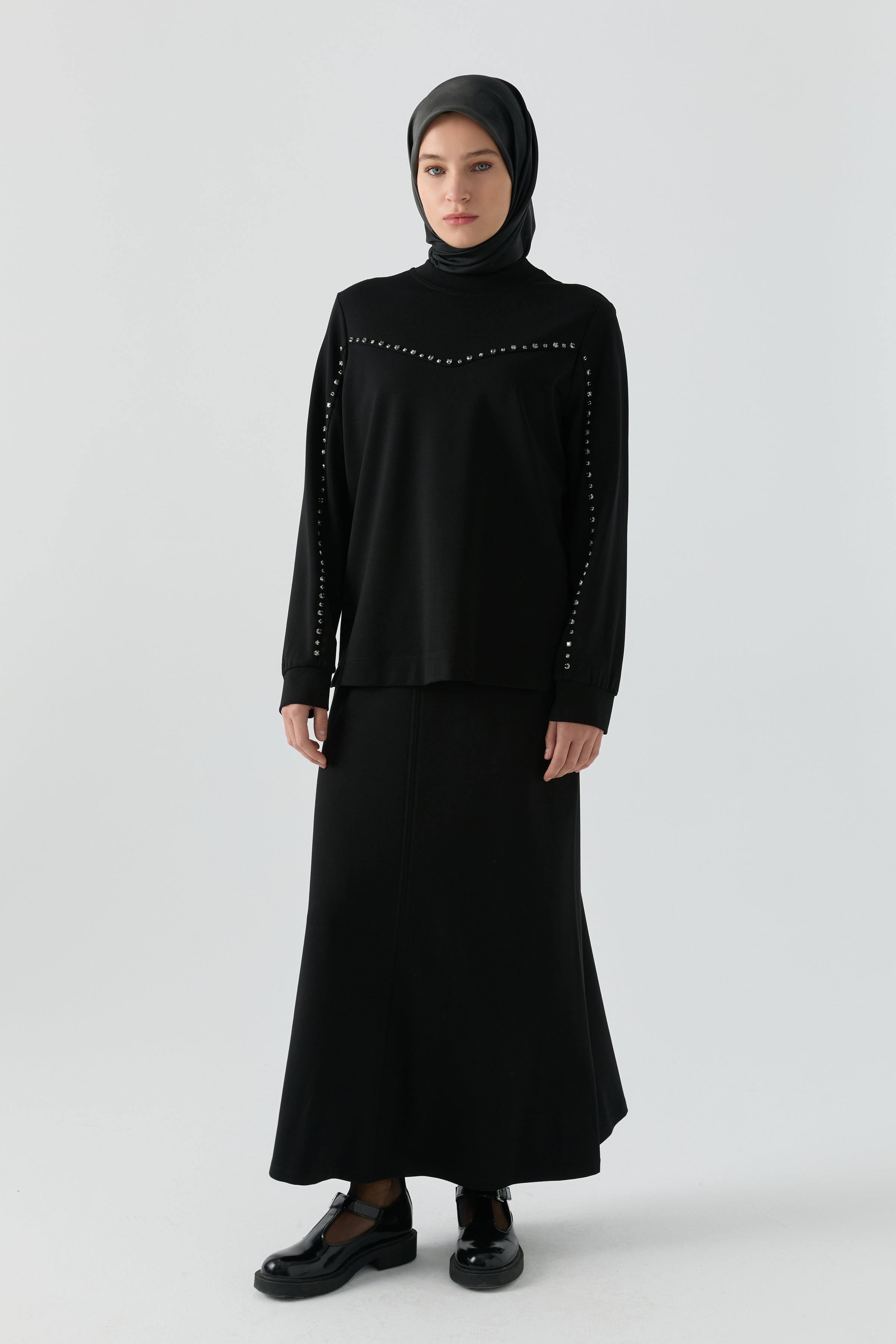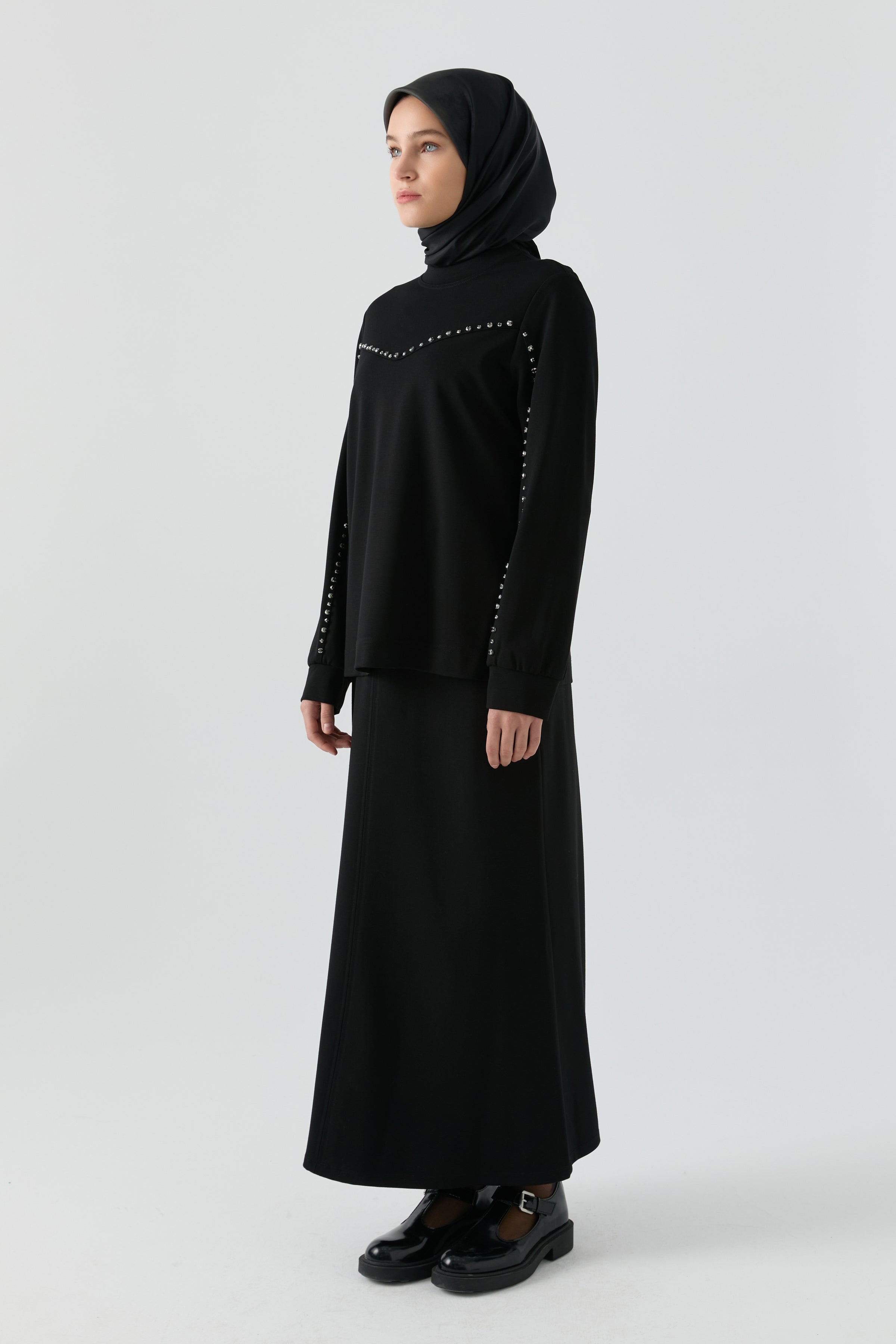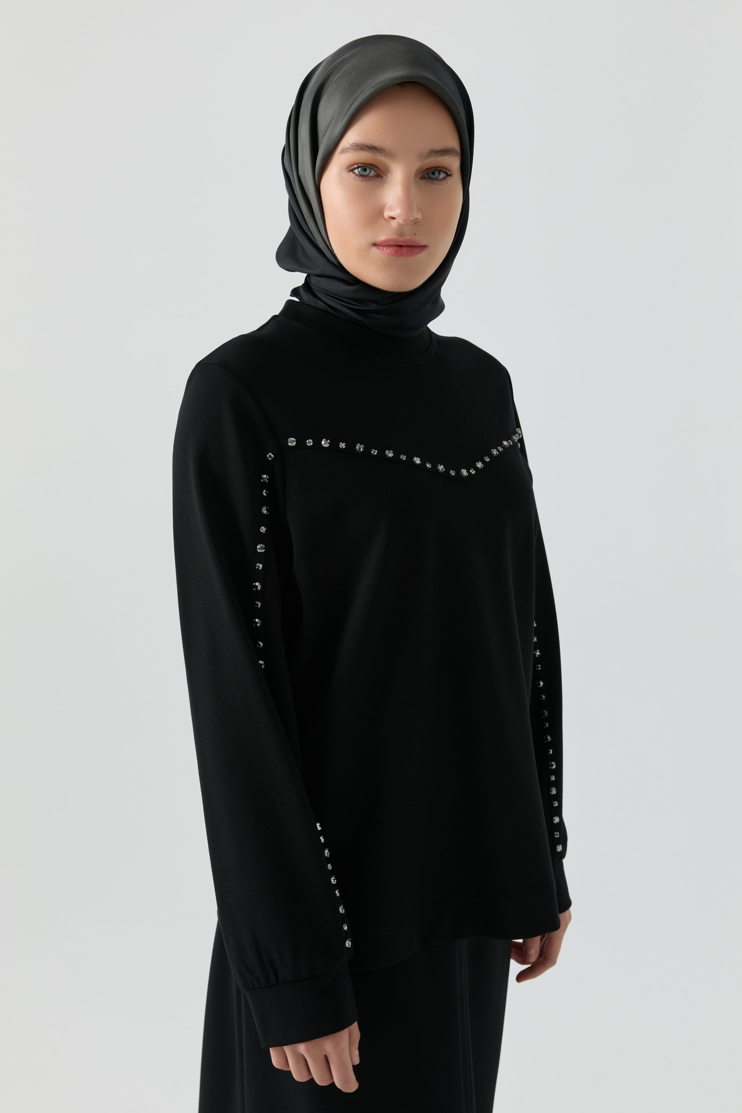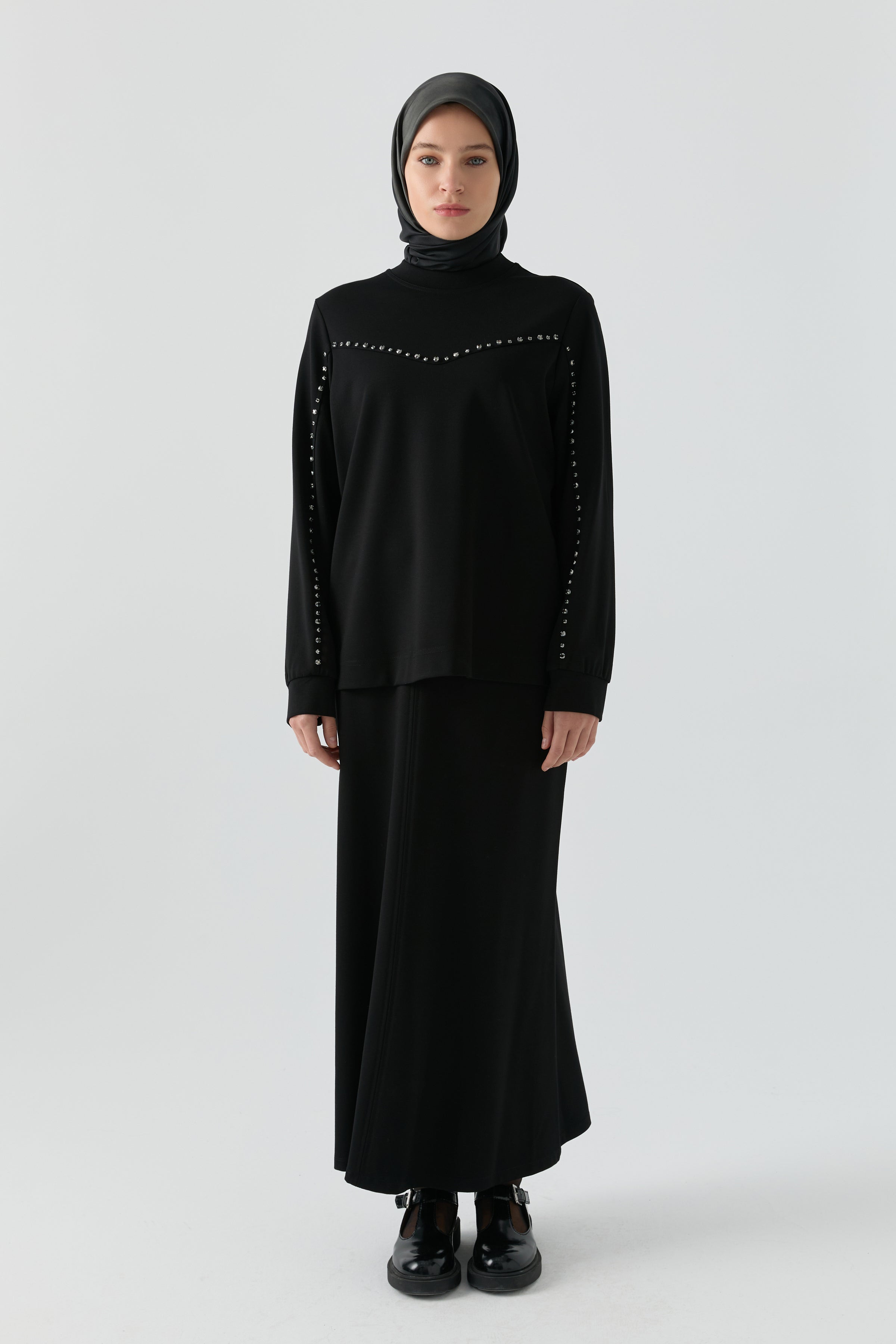 Zarif taş işlemeleriyle hareket kazanan bu takım, sade çizgisini ışığı yansıtan detaylarla şık bir görünüme taşır.