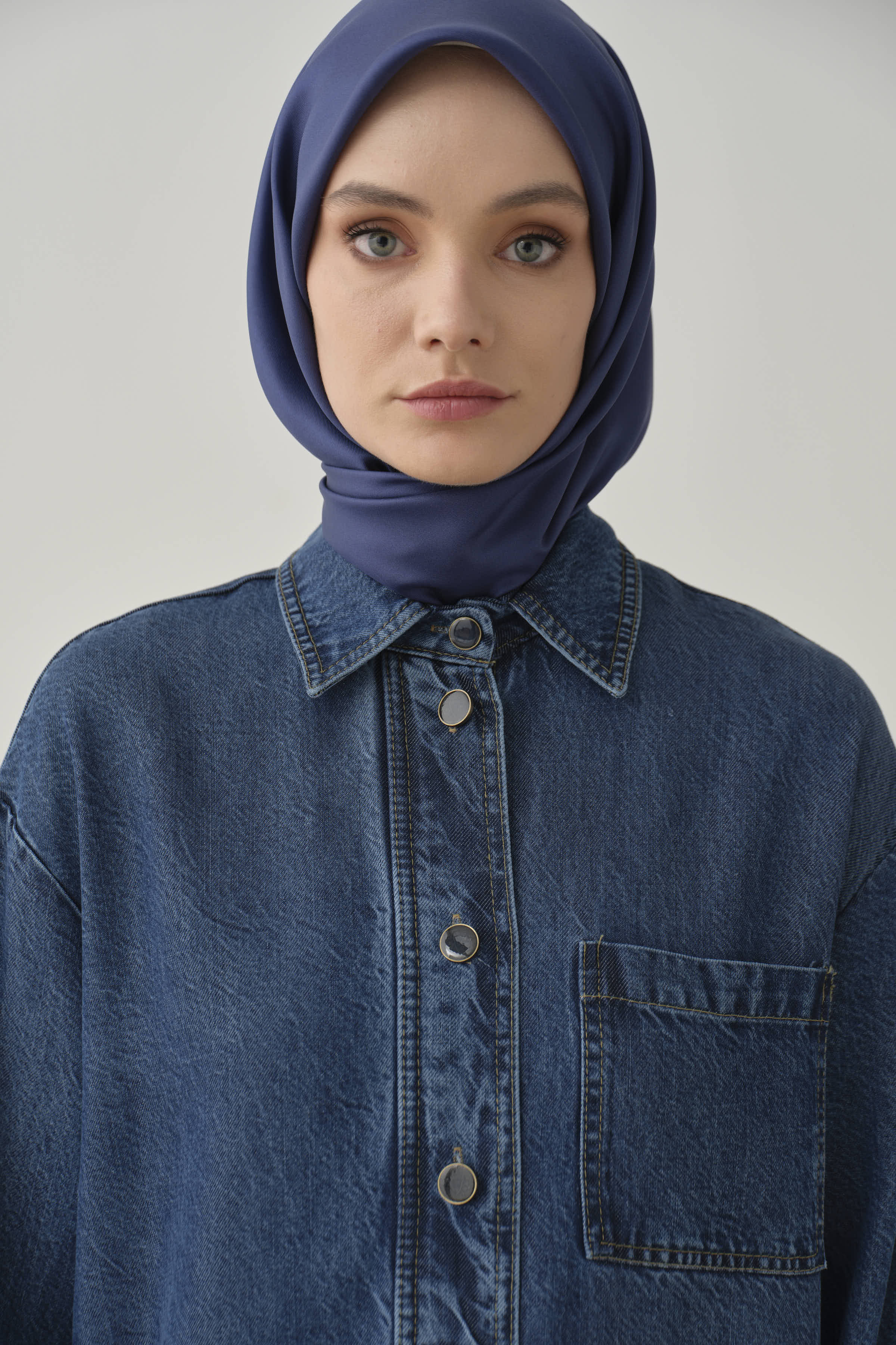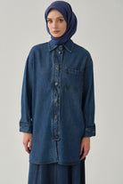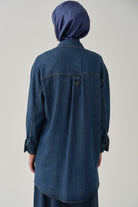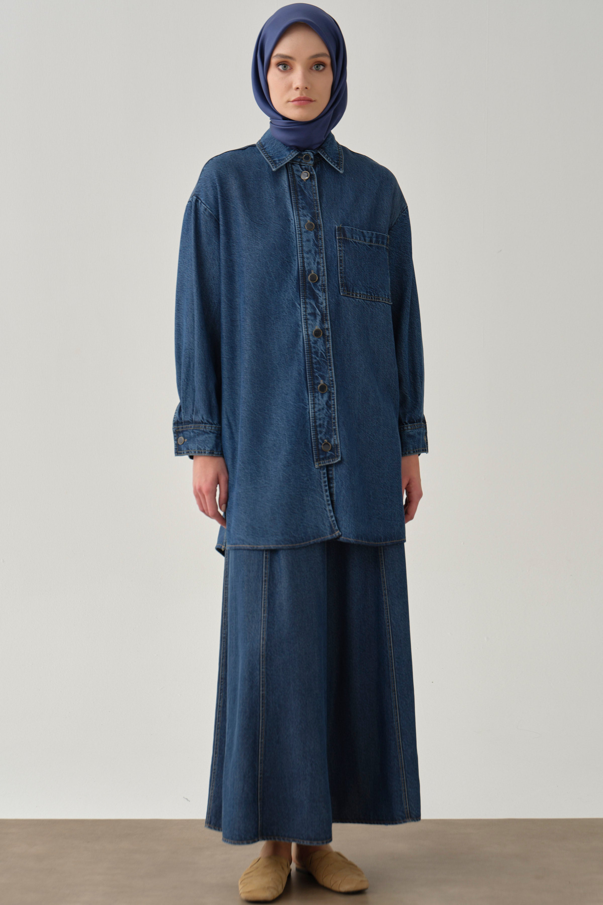 Modern ve şık tasarımıyla dikkat çeken yırtmaçlı pat detaylı tunik, klasik denim tarzını zarif detaylarla birleştiriyor.
