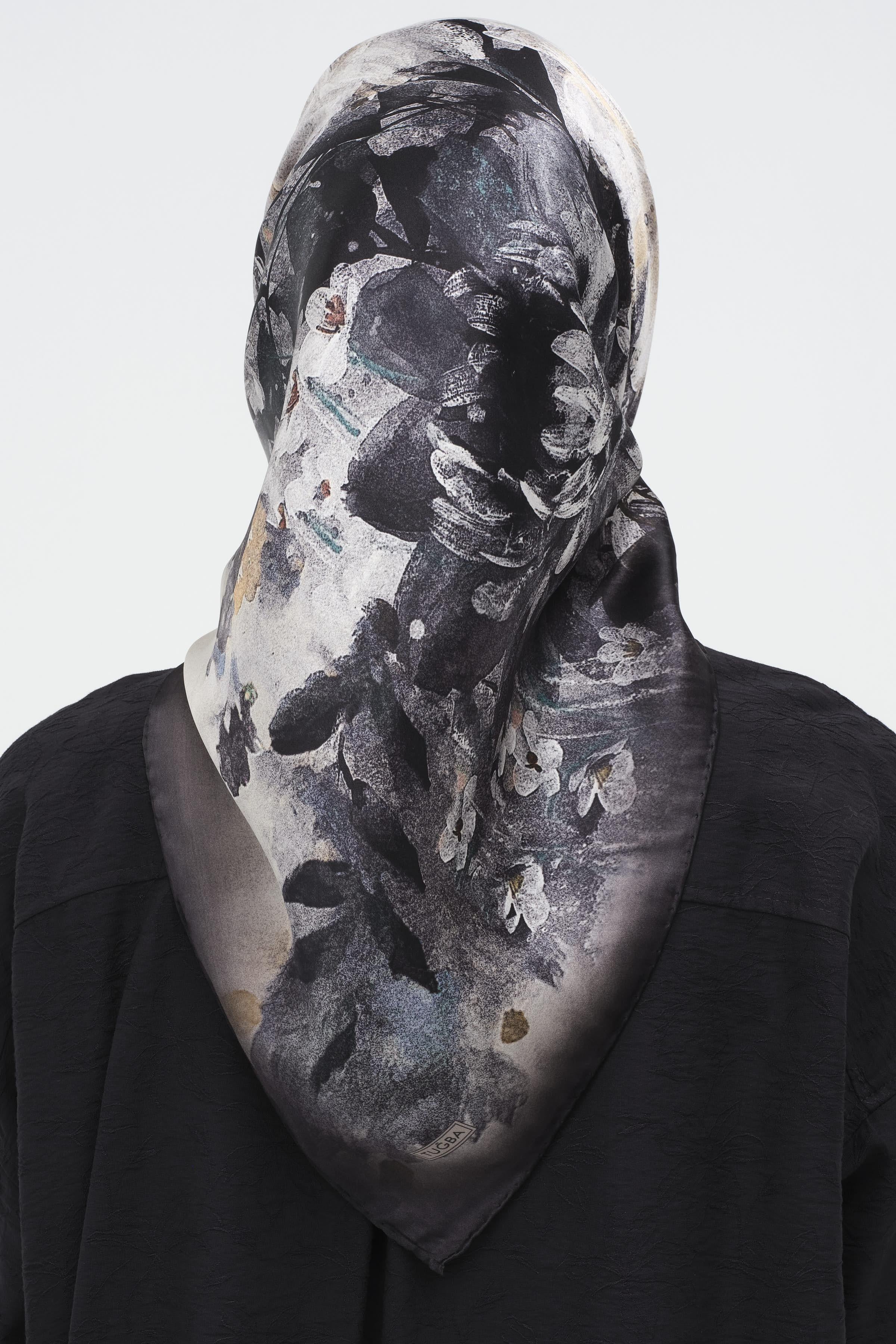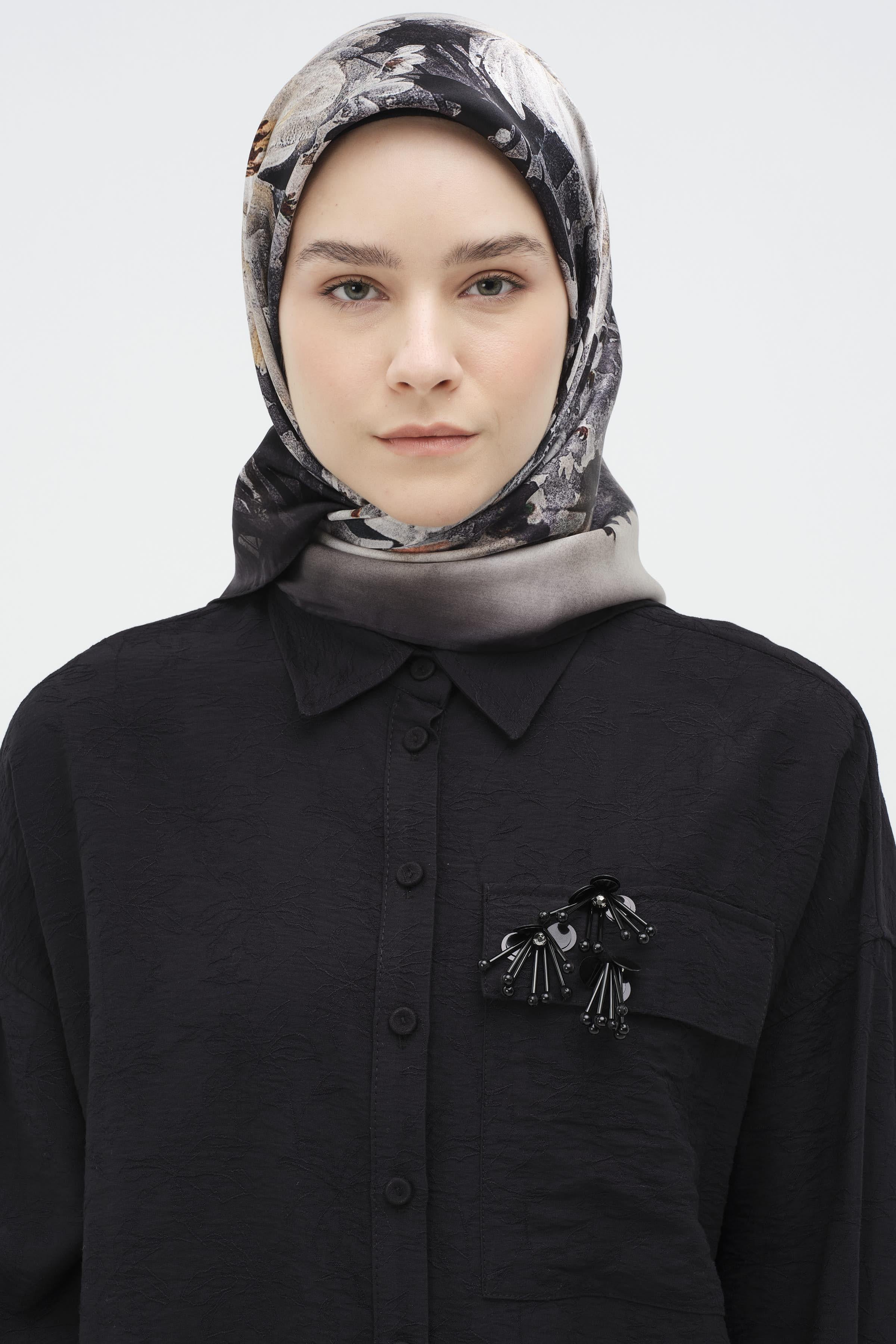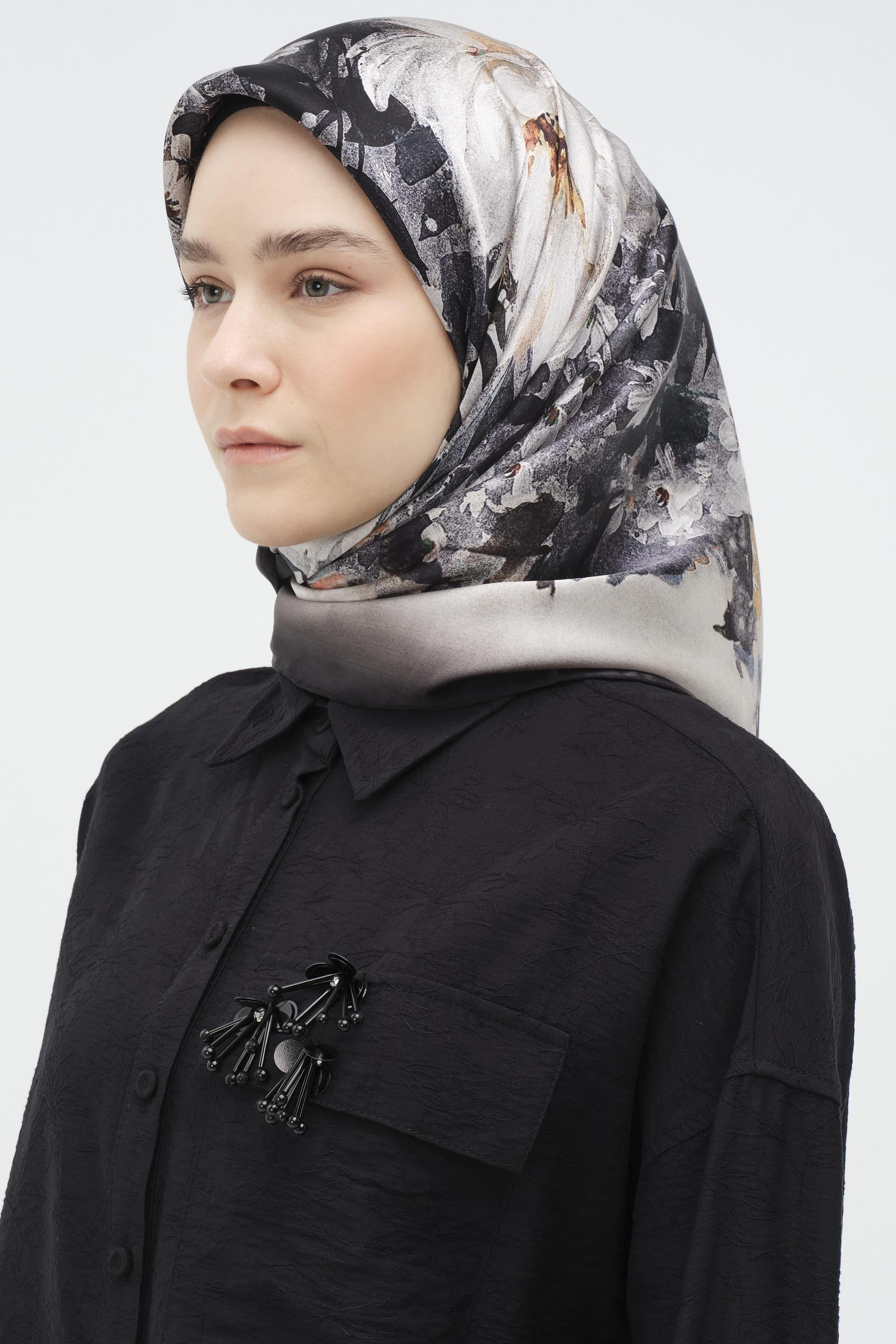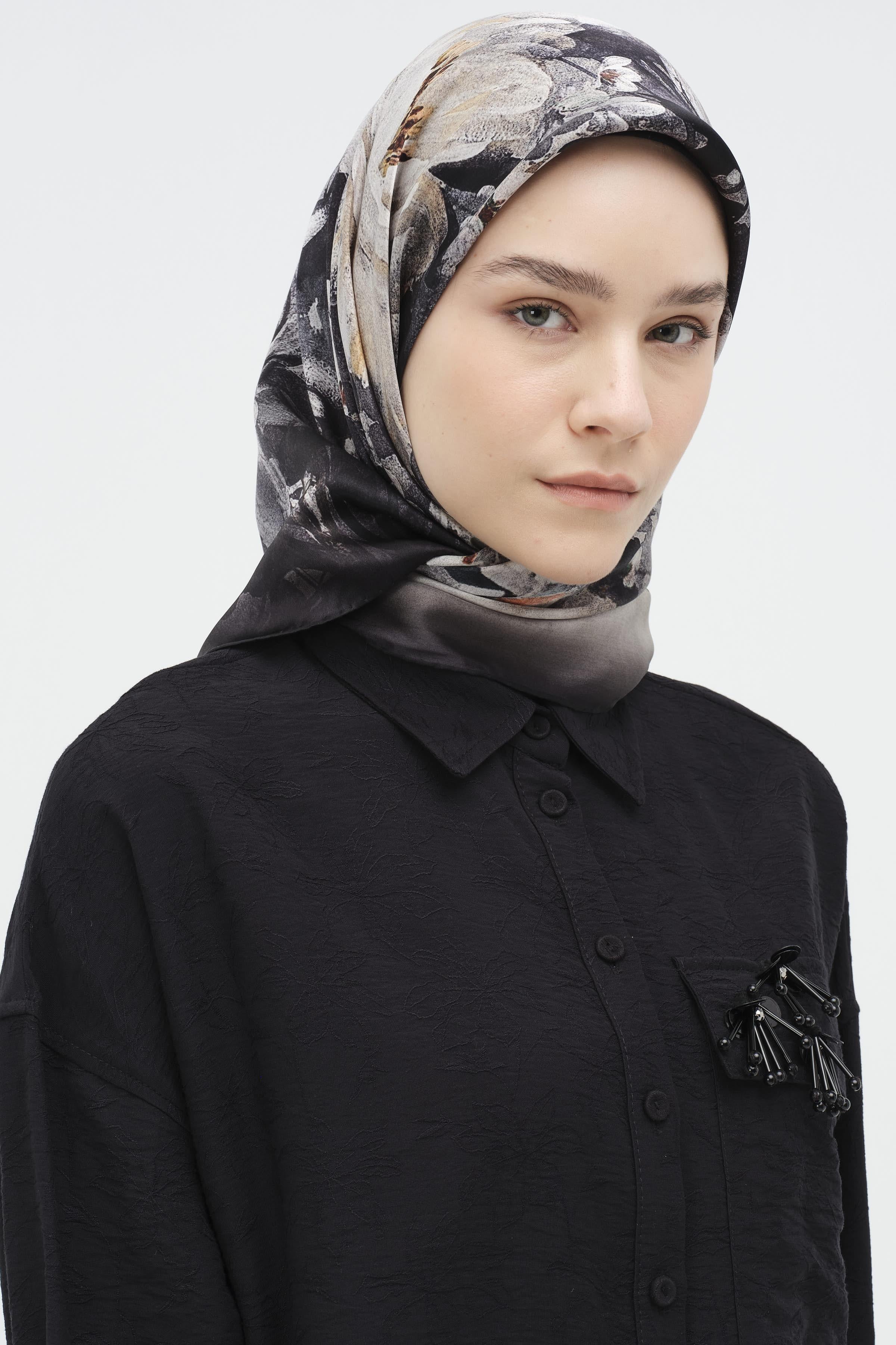Buket Desenli Sura İpek Eşarp - Antrasit