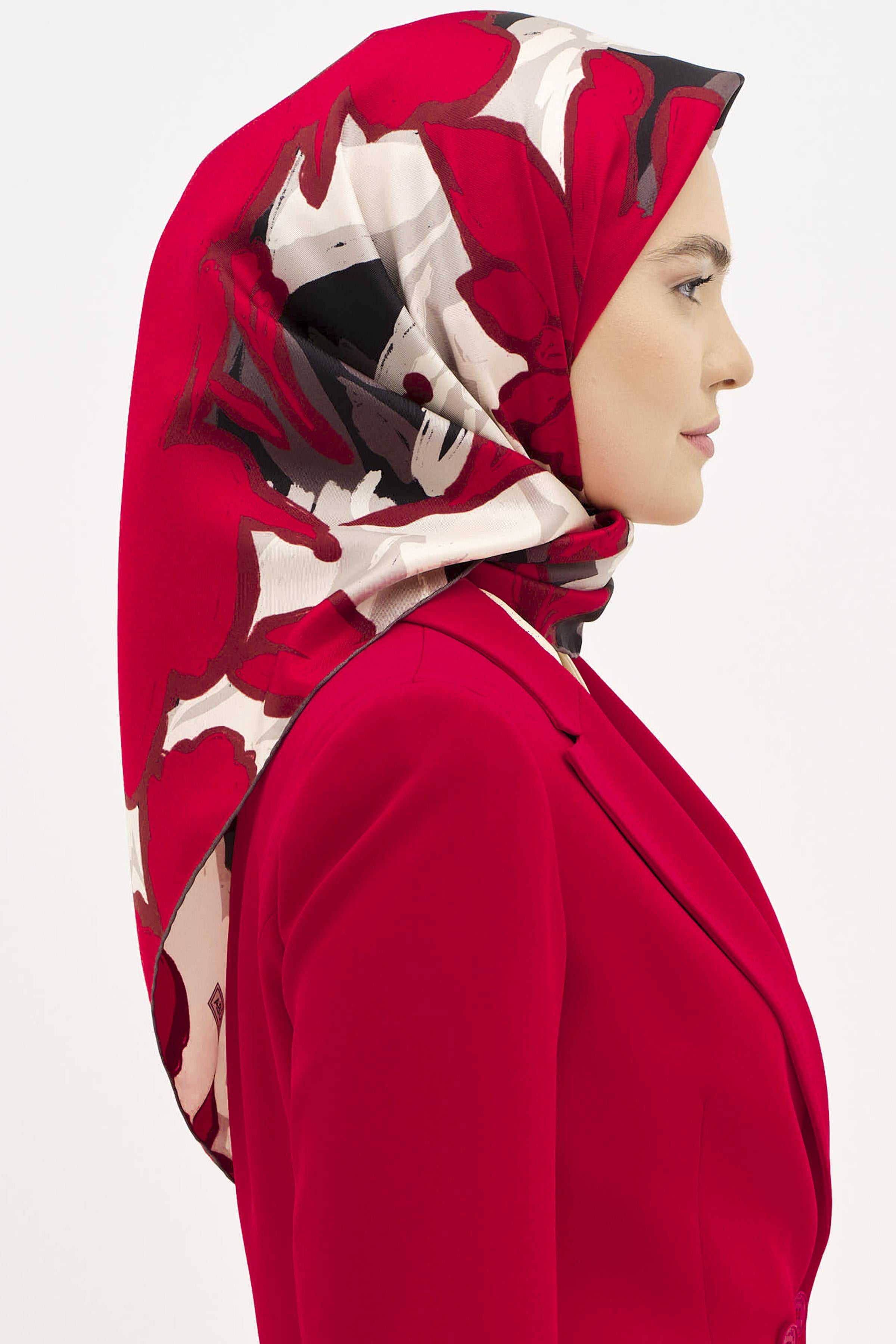 Multi Flower Desenli Twill İpek Eşarp - Kırmızı