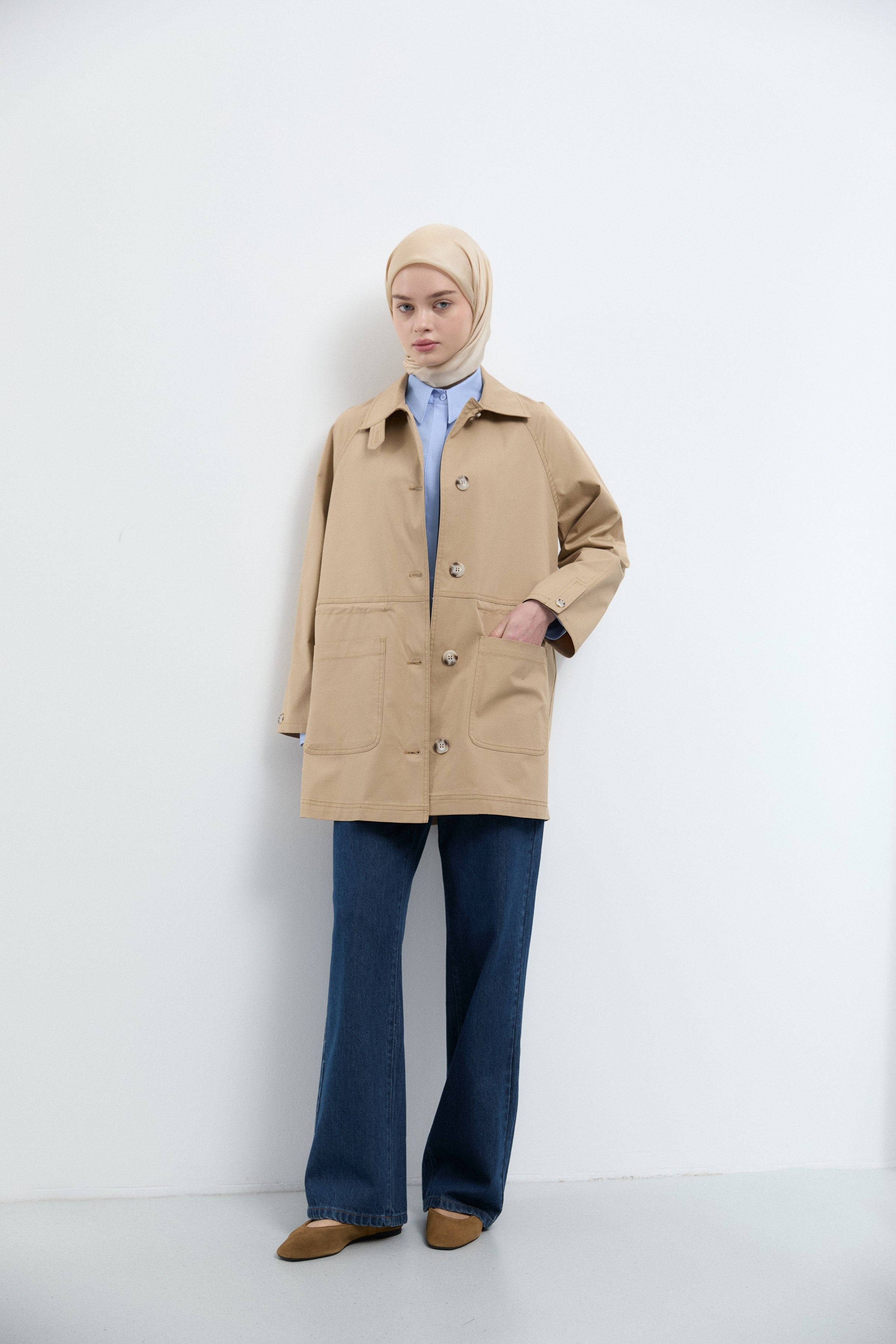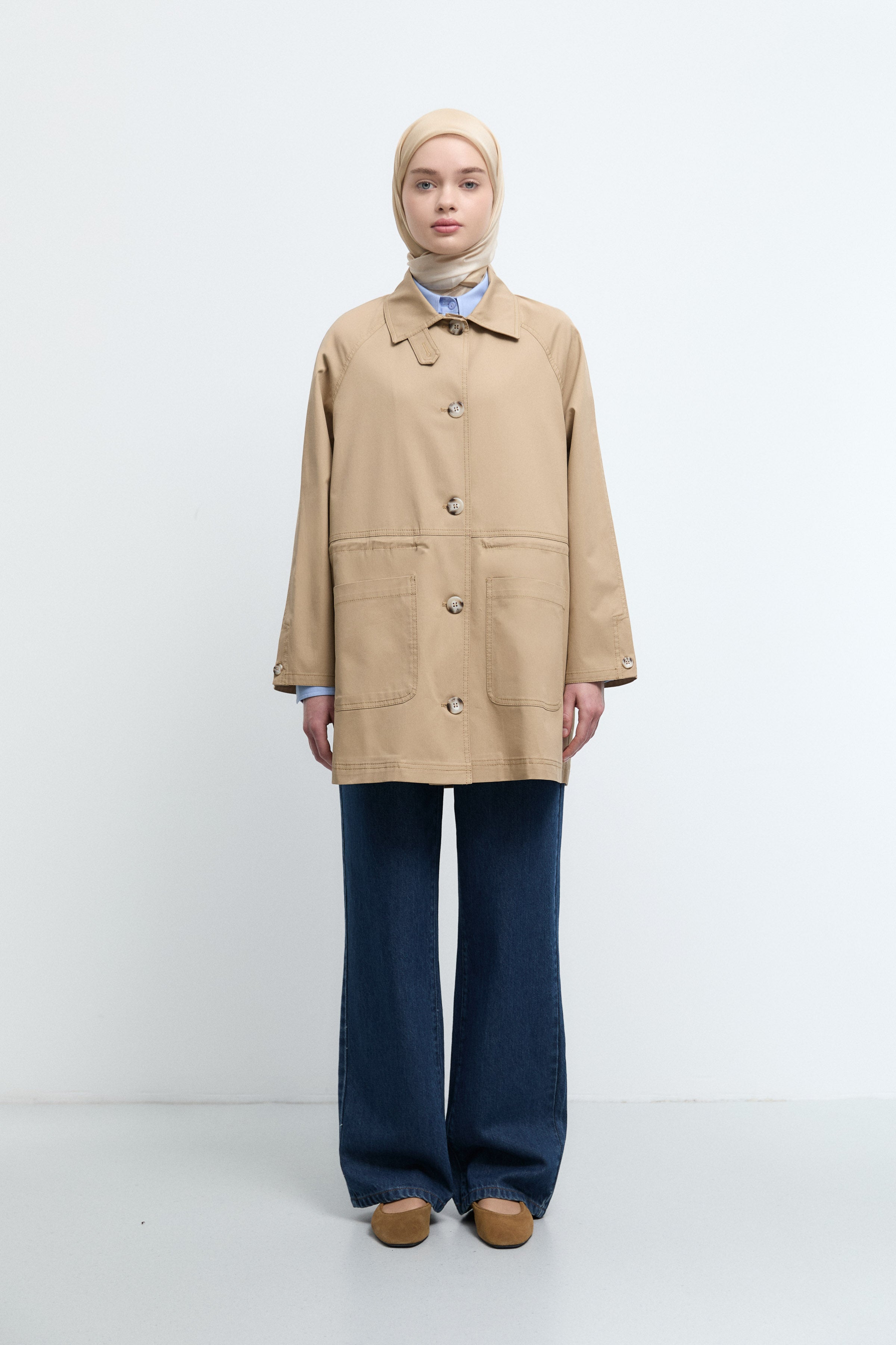 Önden Büyük Cepli Trençkot - Bej