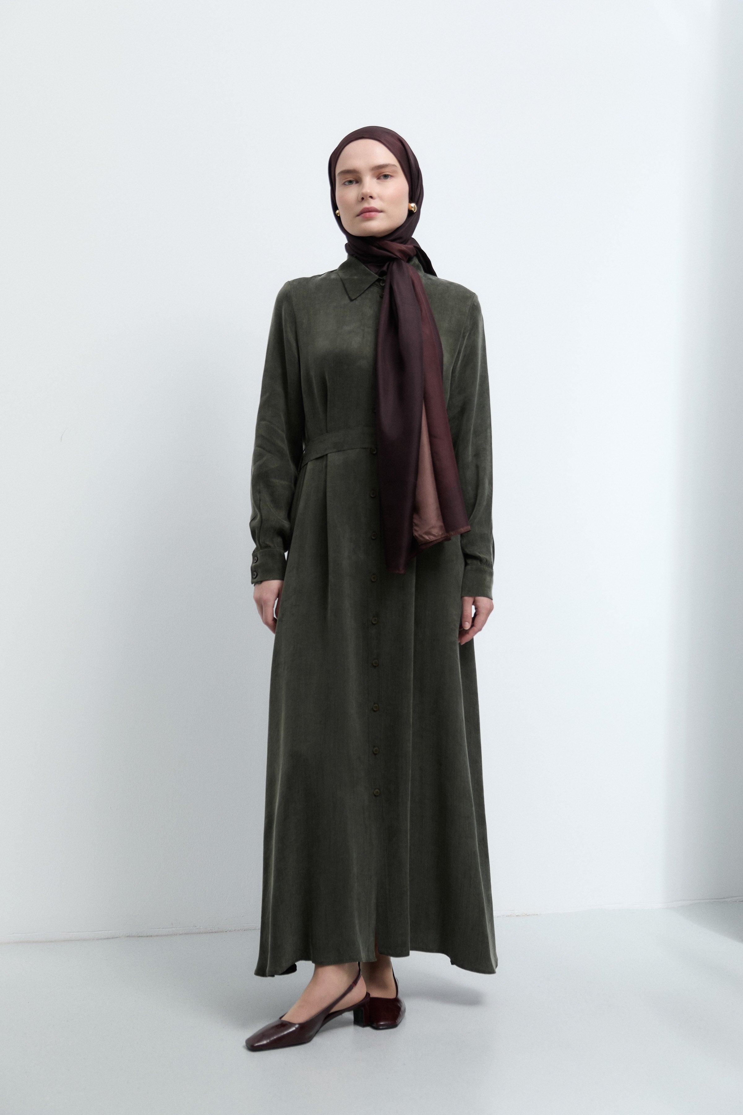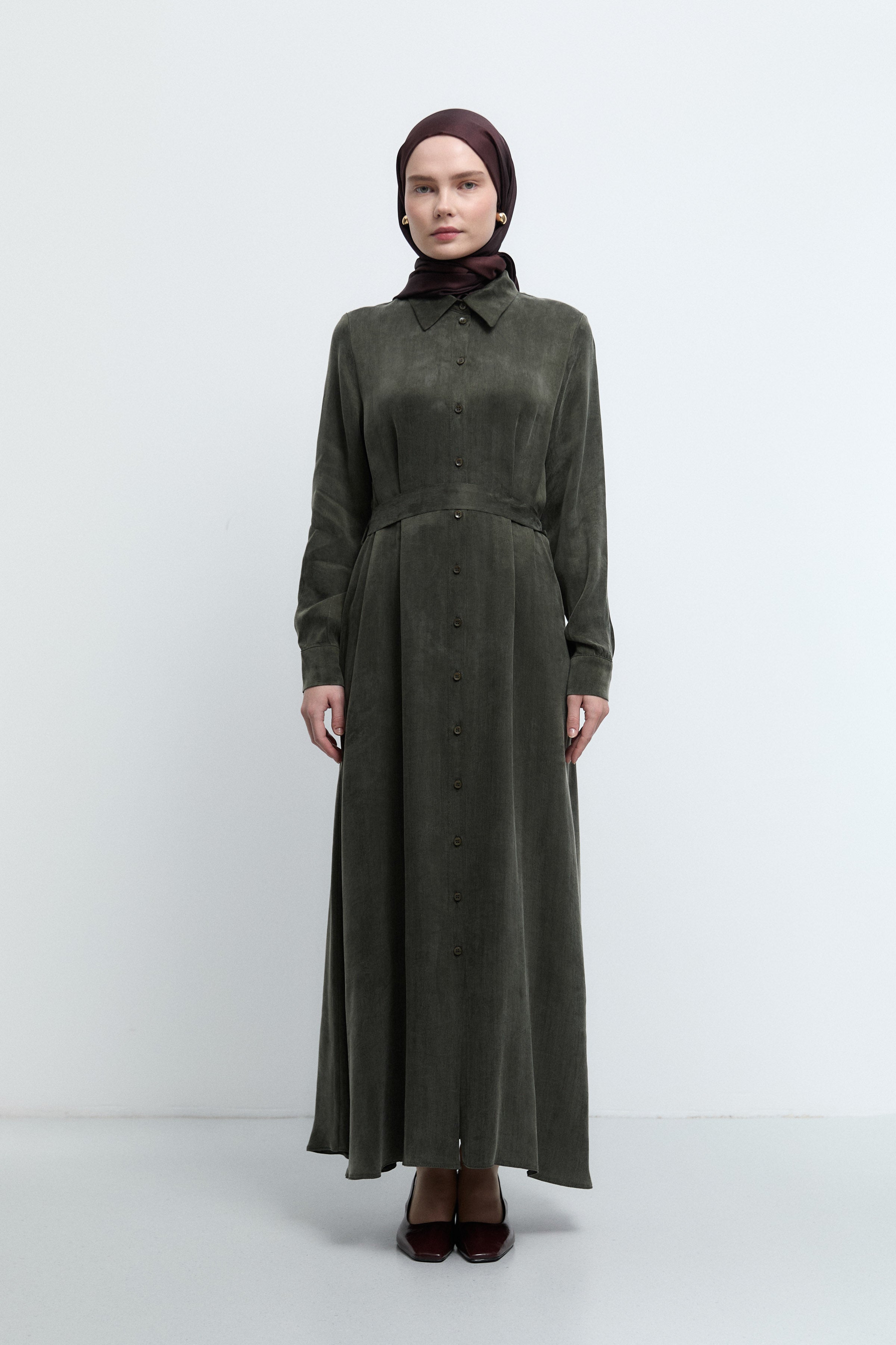 Gömlek Yaka Kemerli Elbise - Haki