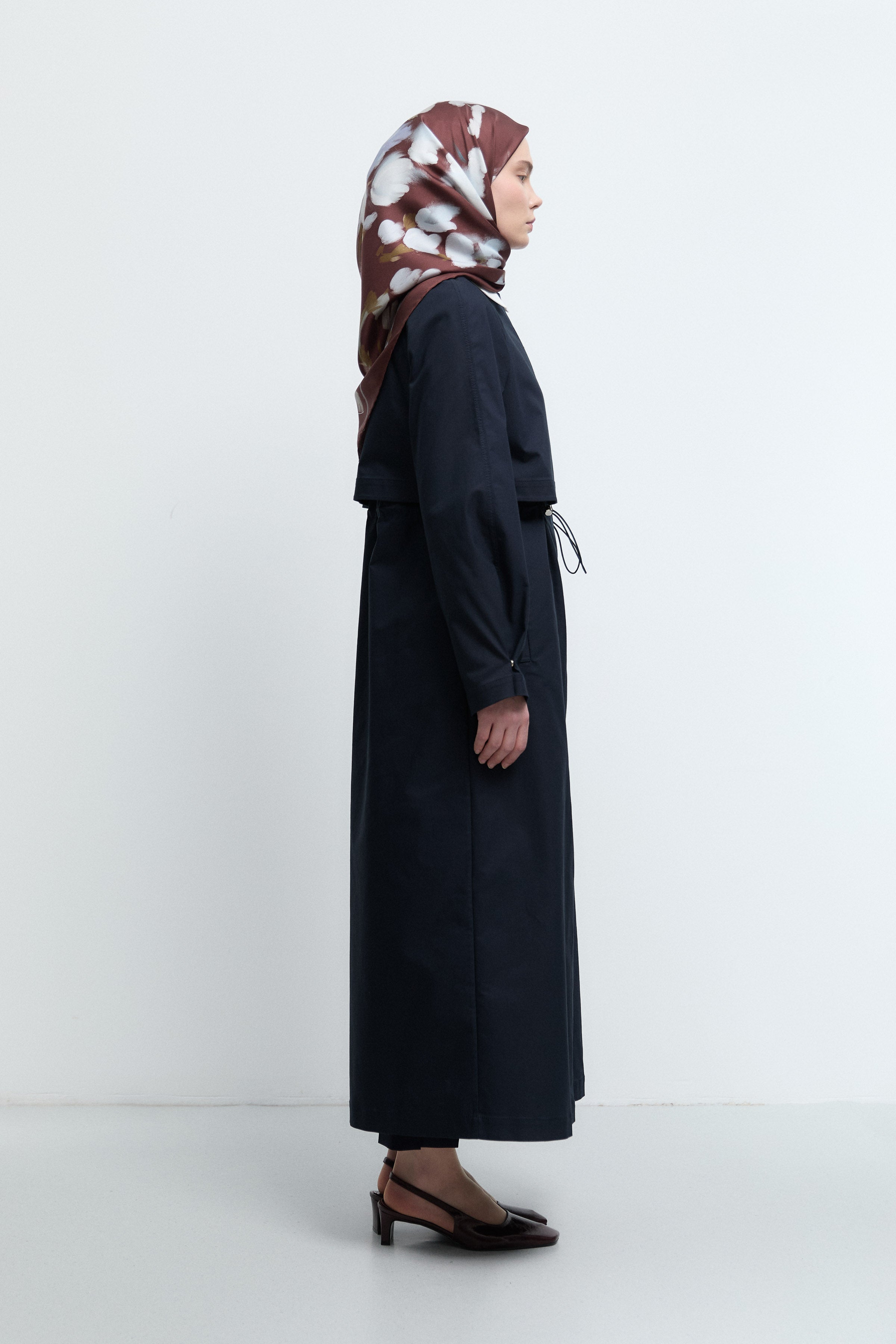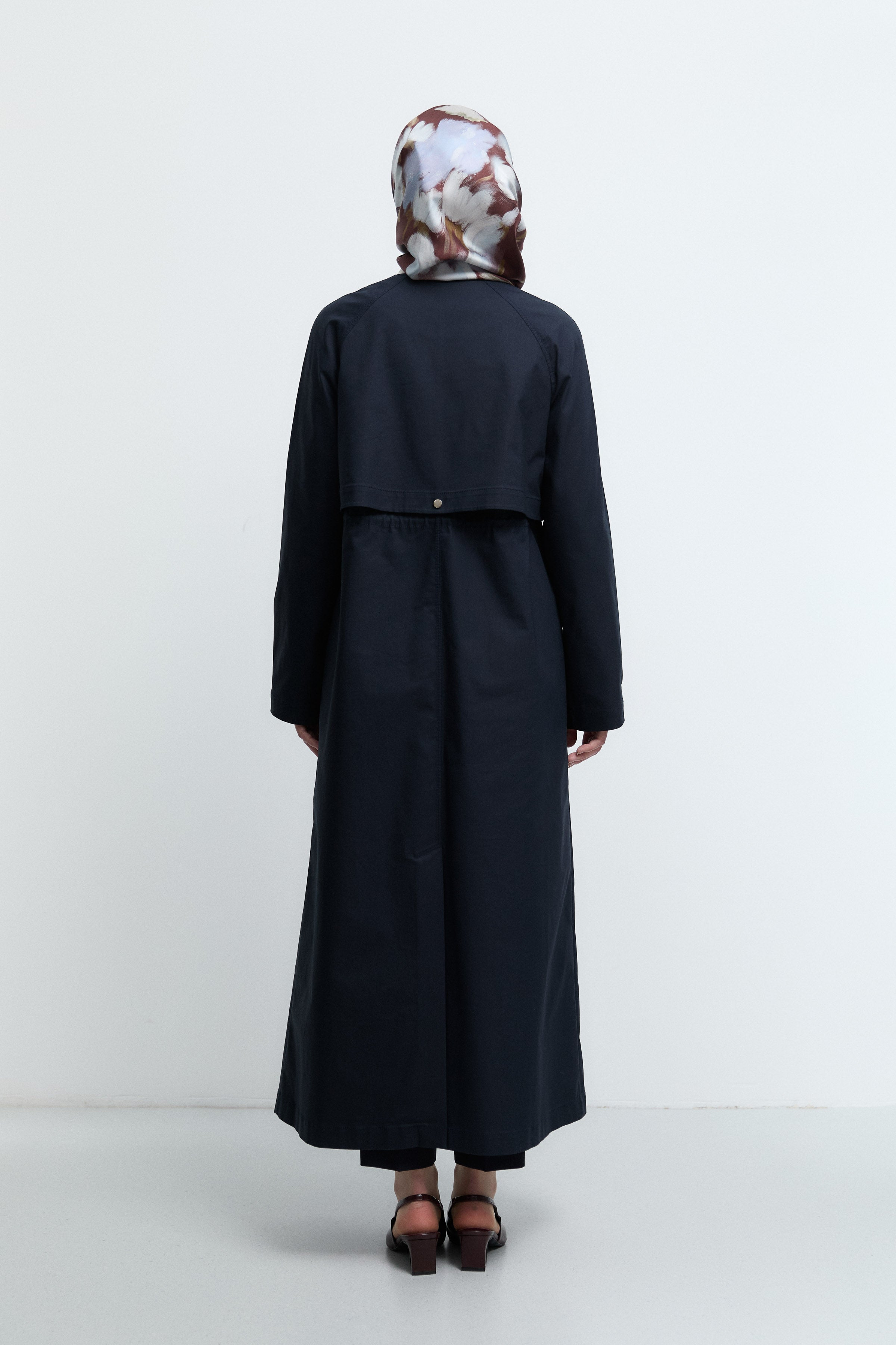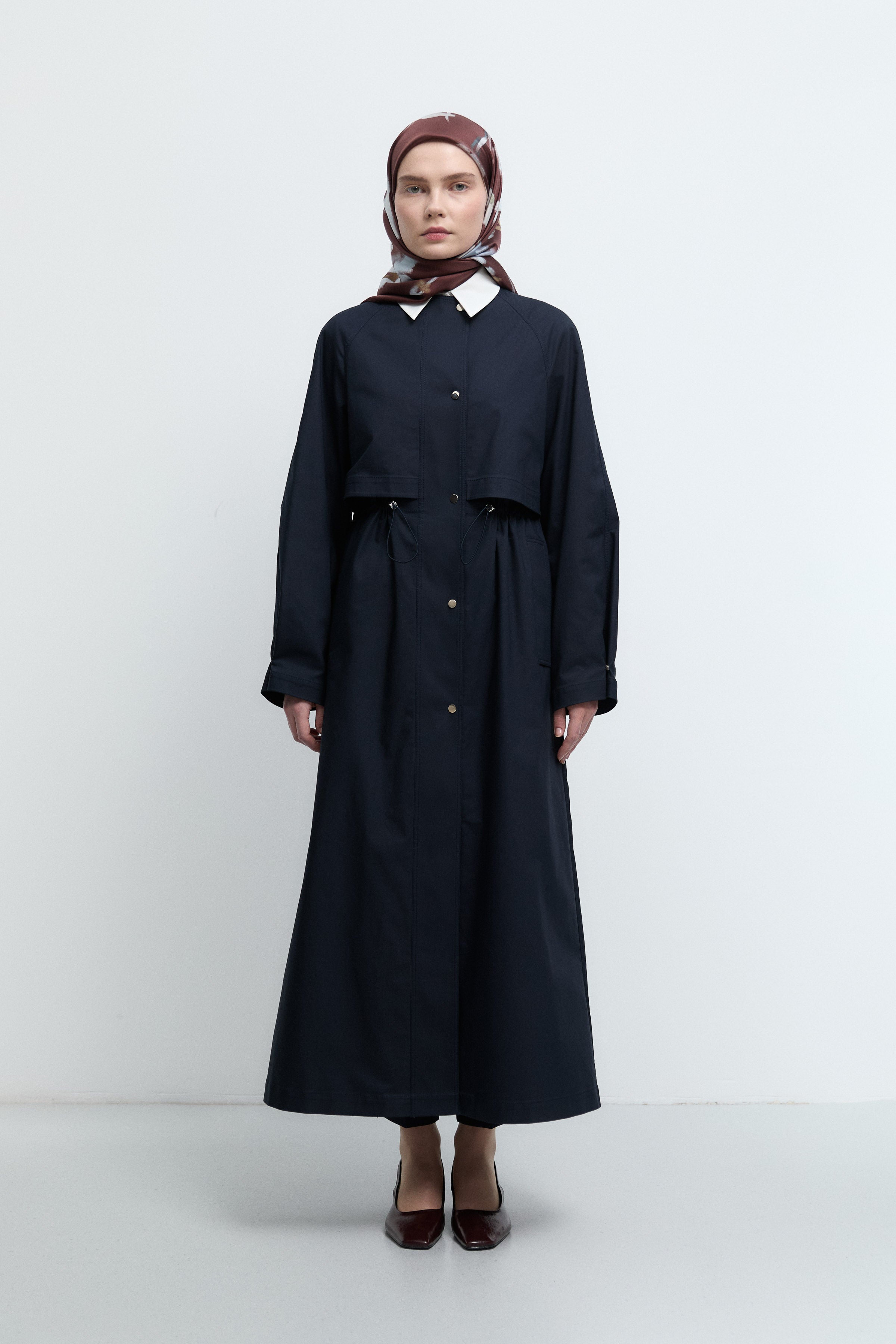 Beli büzgülü pardesü, formunu ayarlanabilir bel detayıyla şekillendiren zarif bir tasarıma sahiptir. Büzgü kısmı silueti toparlayarak daha dengeli bir görünüm sunar.