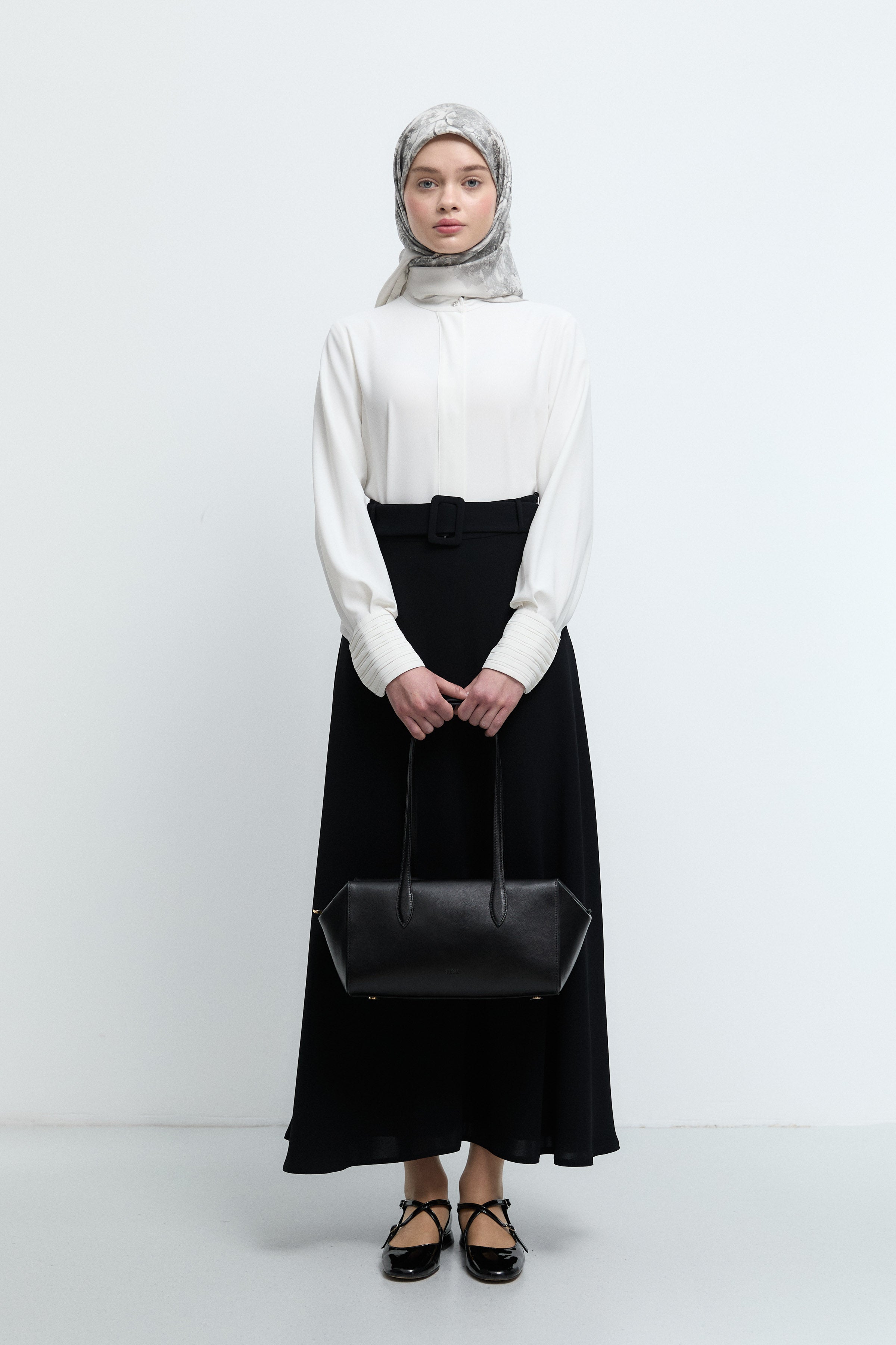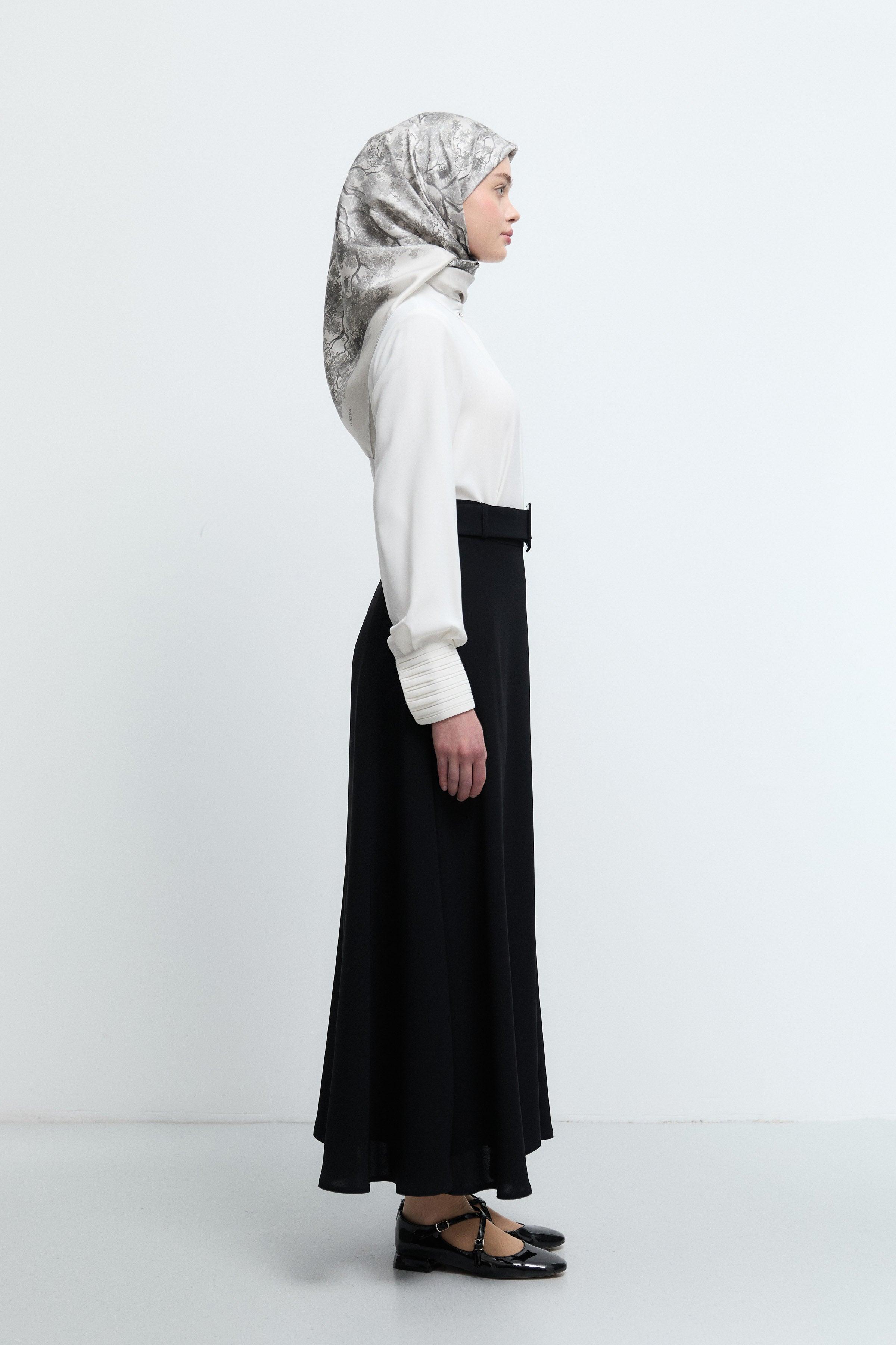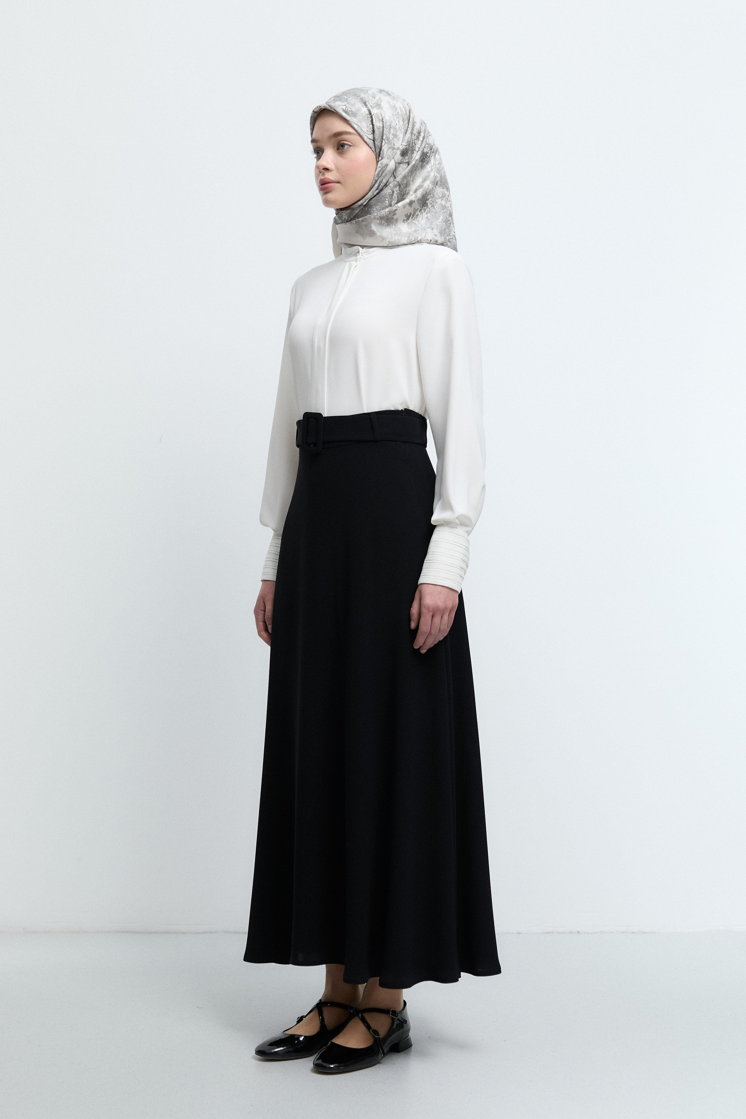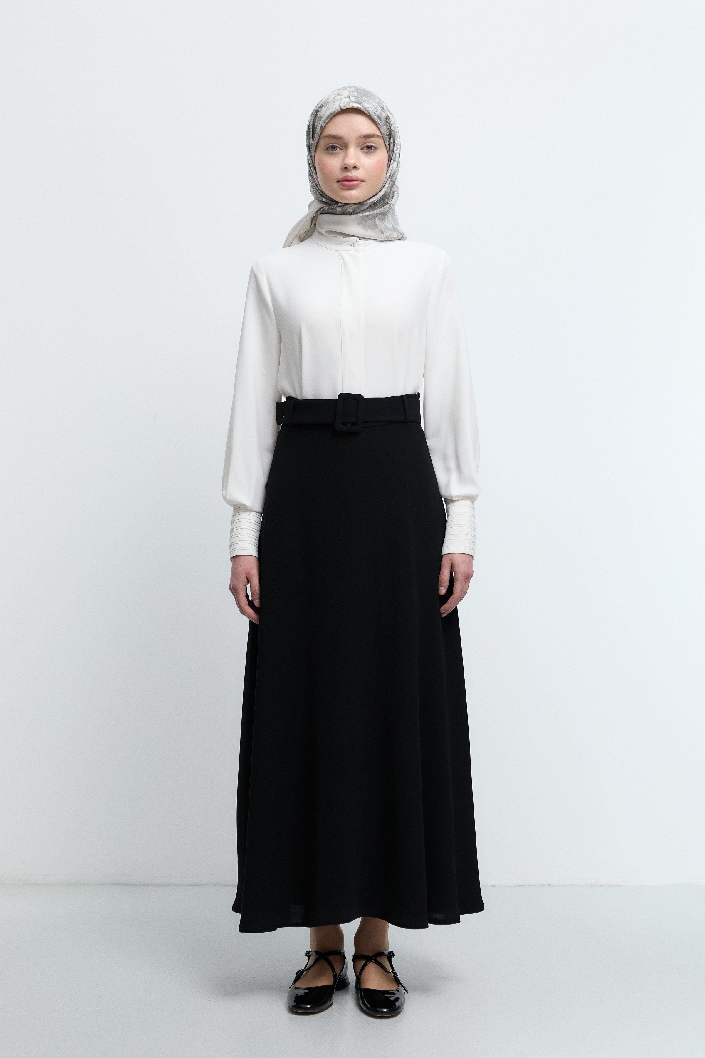 Kemer detayıyla silueti zarifçe vurgulayan bu etek, modern kesimi ve dengeli formuyla güçlü bir şıklık sunar.