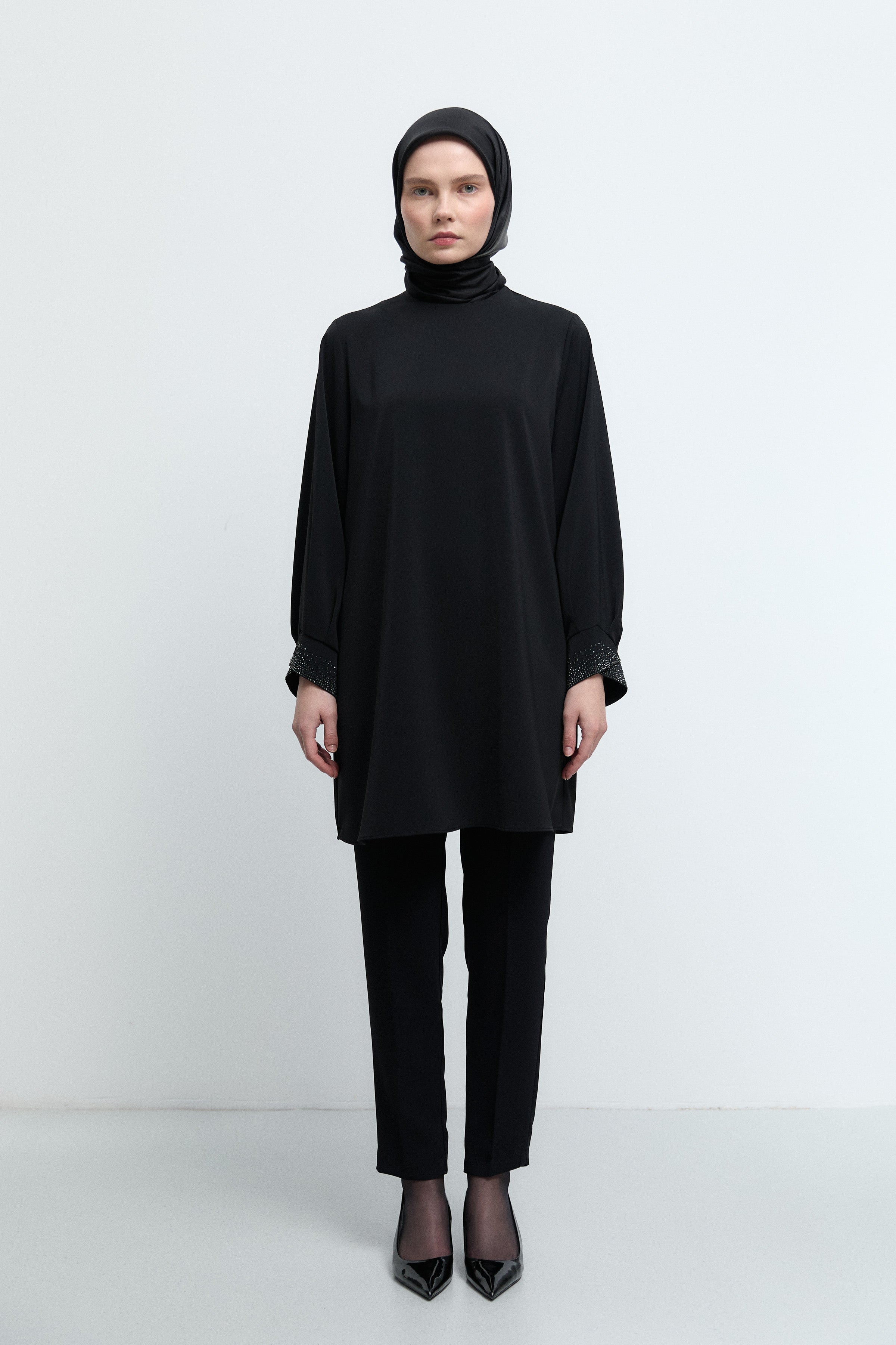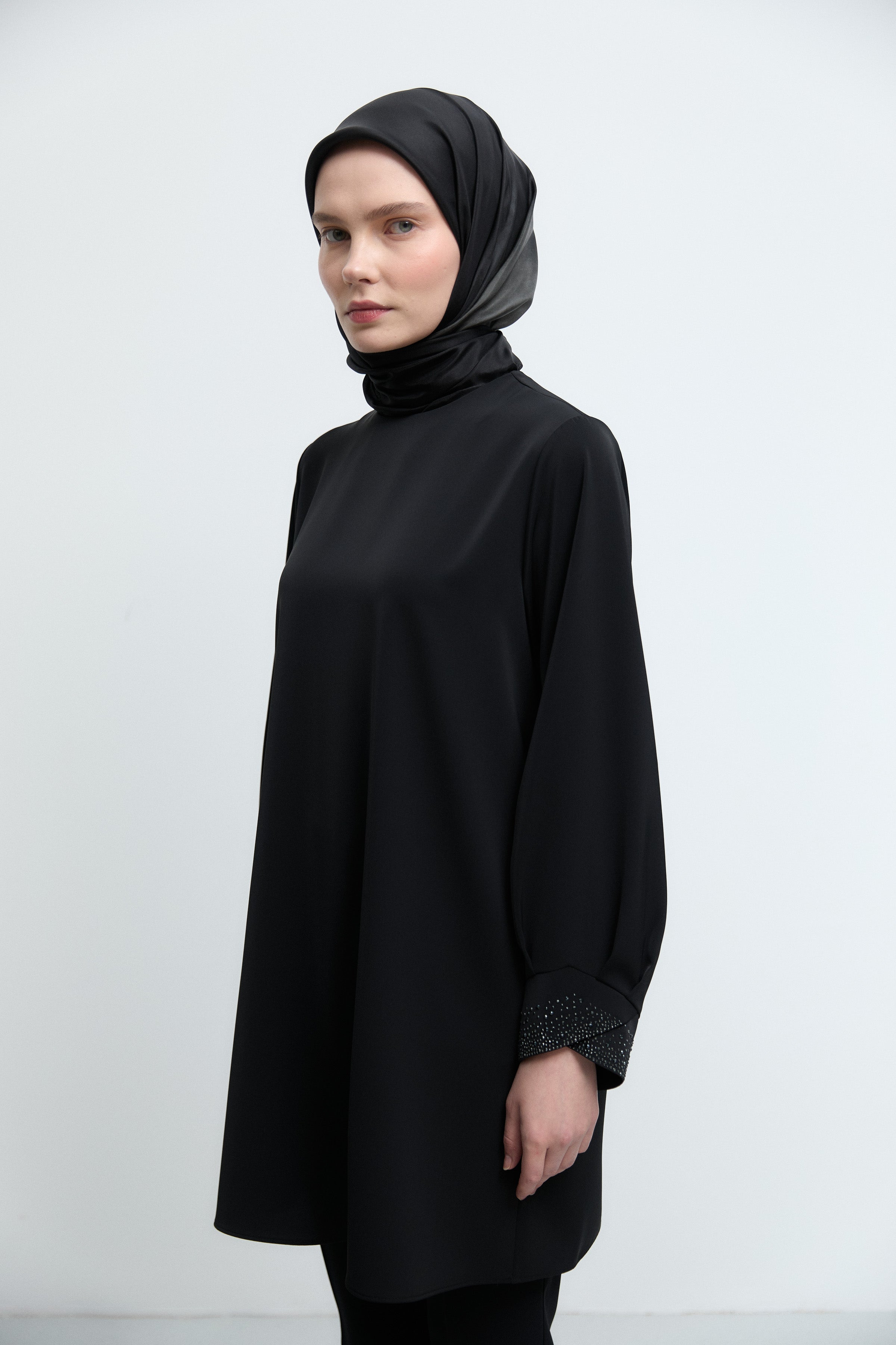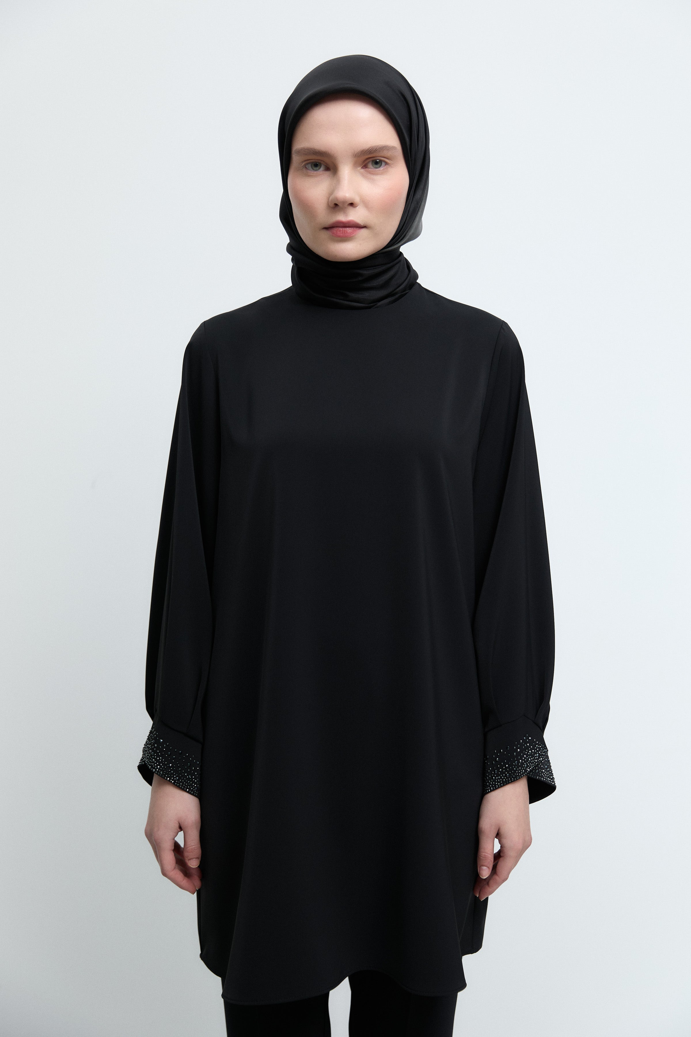 Kol ağzındaki zarif taş detaylarıyla ışıltılı bir vurgu sunan bu tunik, sade formunu sofistike bir dokunuşla tamamlar.
