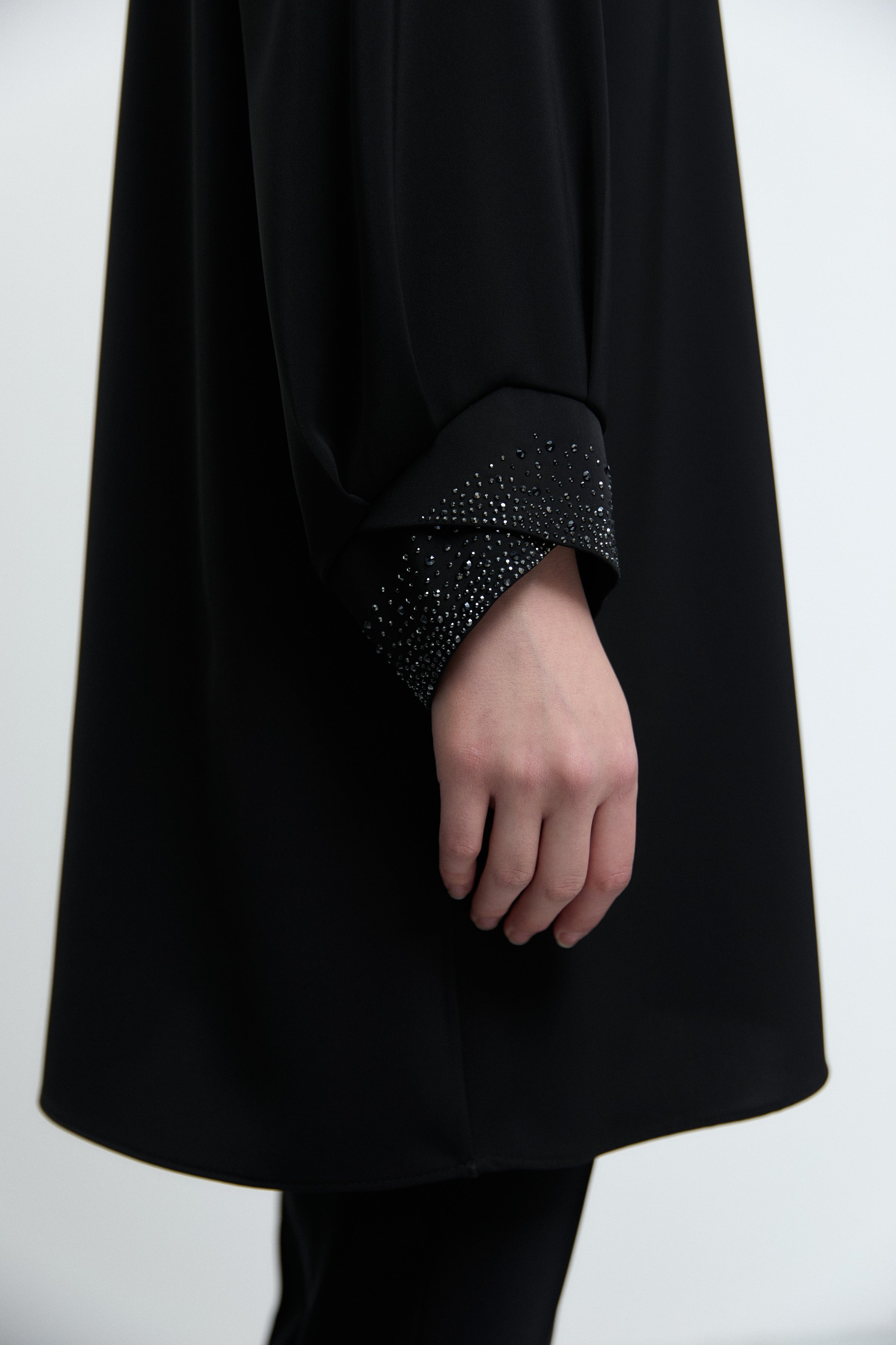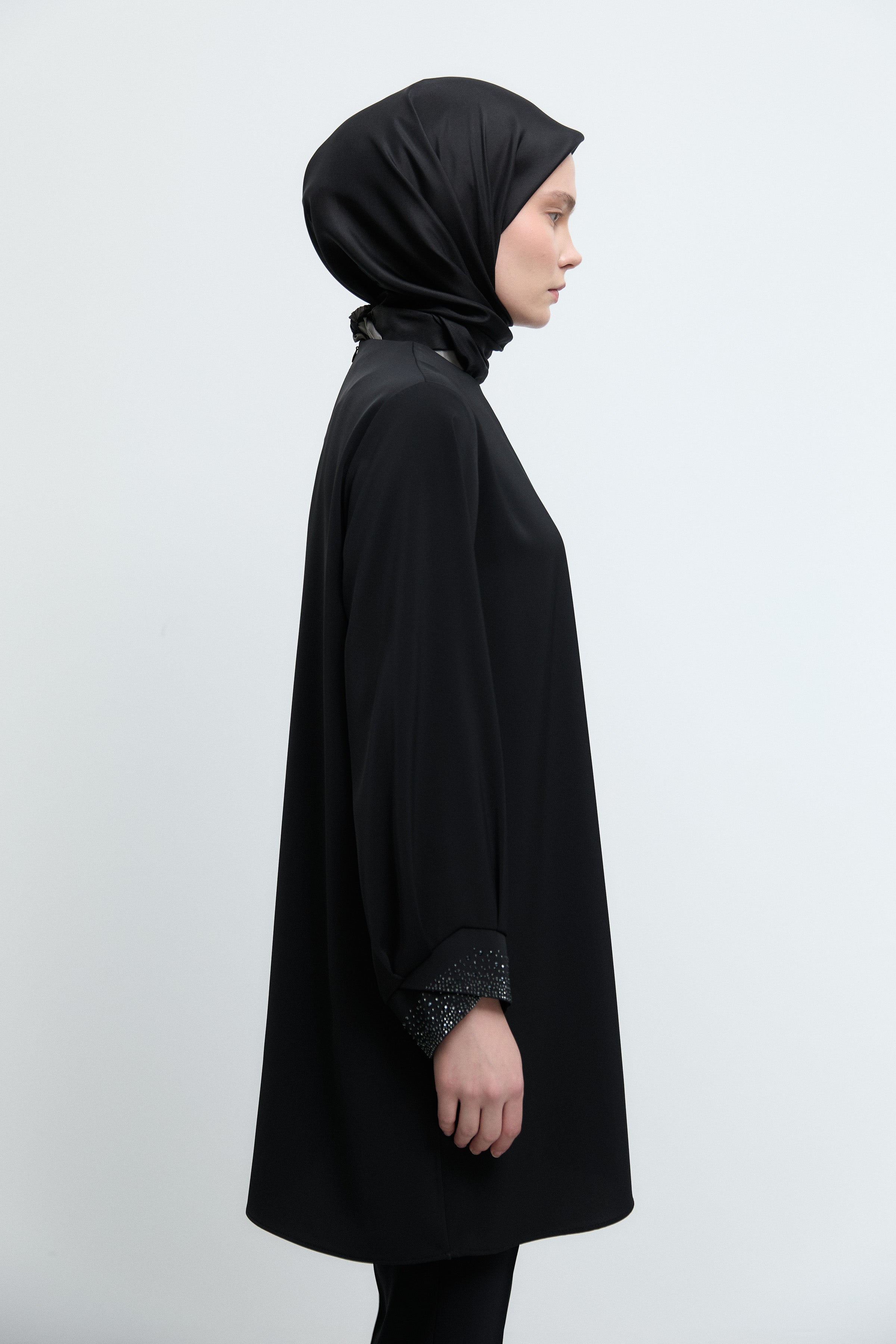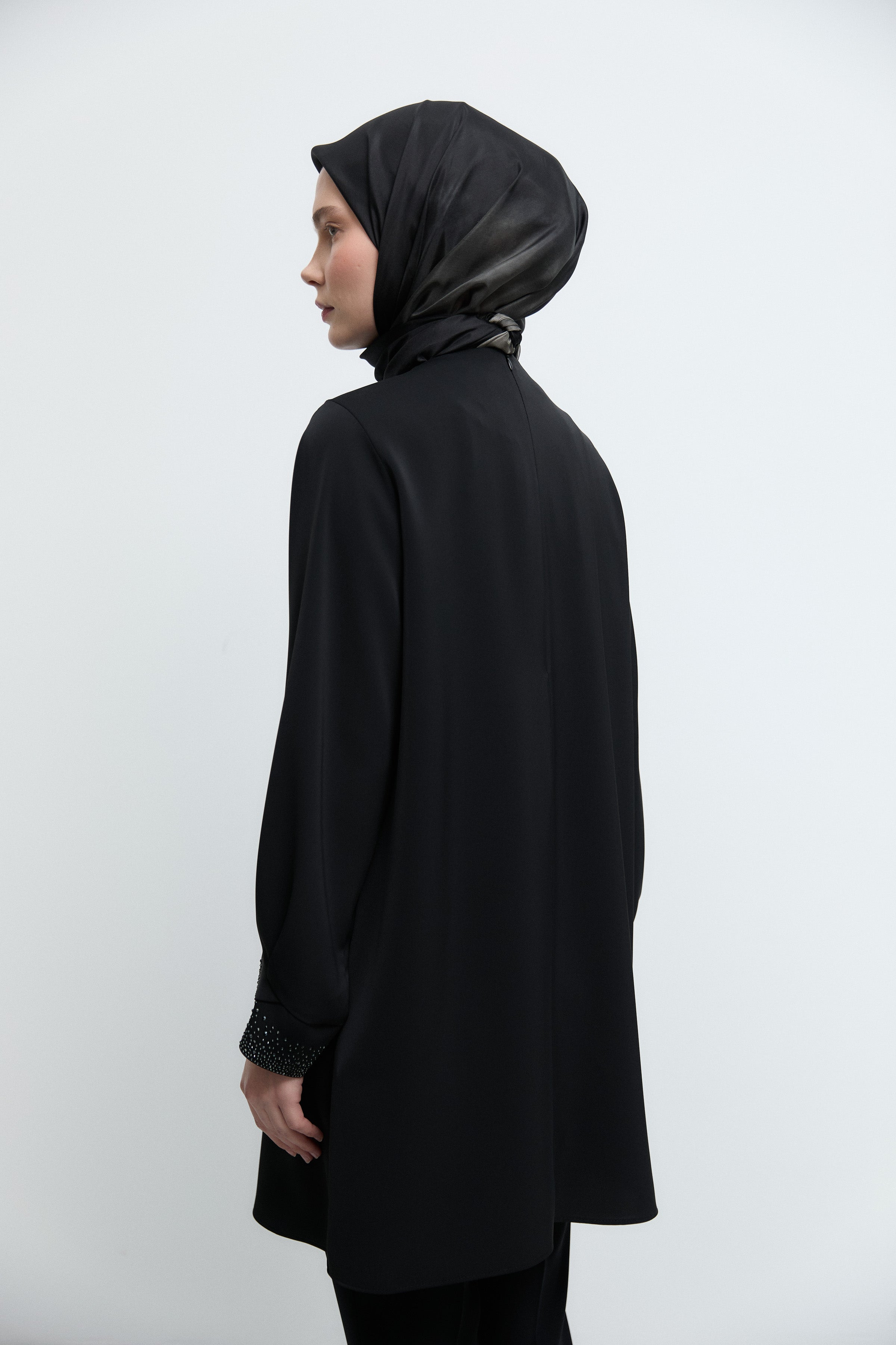 Kol ağzındaki zarif taş detaylarıyla ışıltılı bir vurgu sunan bu tunik, sade formunu sofistike bir dokunuşla tamamlar.