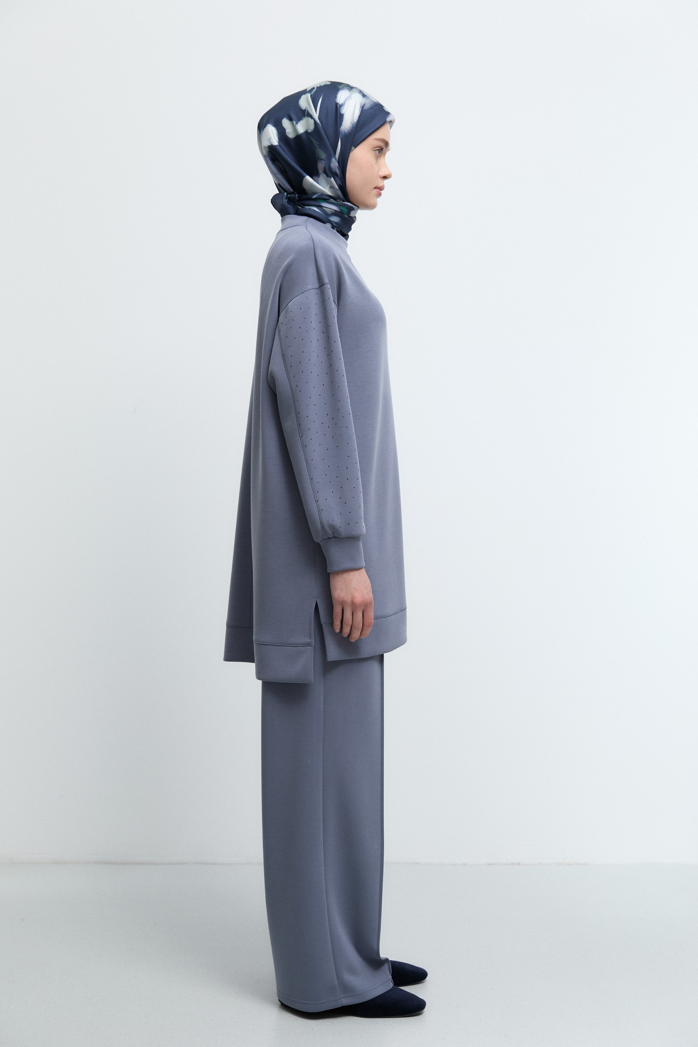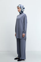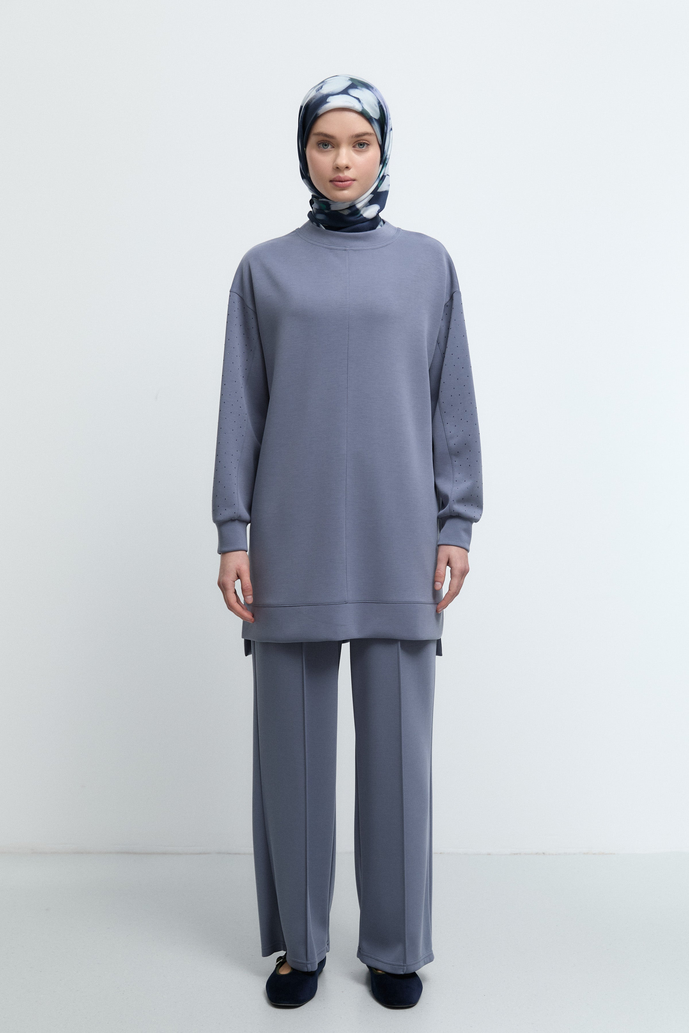 Kol detaylarında yer alan zarif taş dokunuşlarıyla ışıltılı bir etki sunan bu tunik, sade şıklığı güçlü bir vurguyla tamamlar.