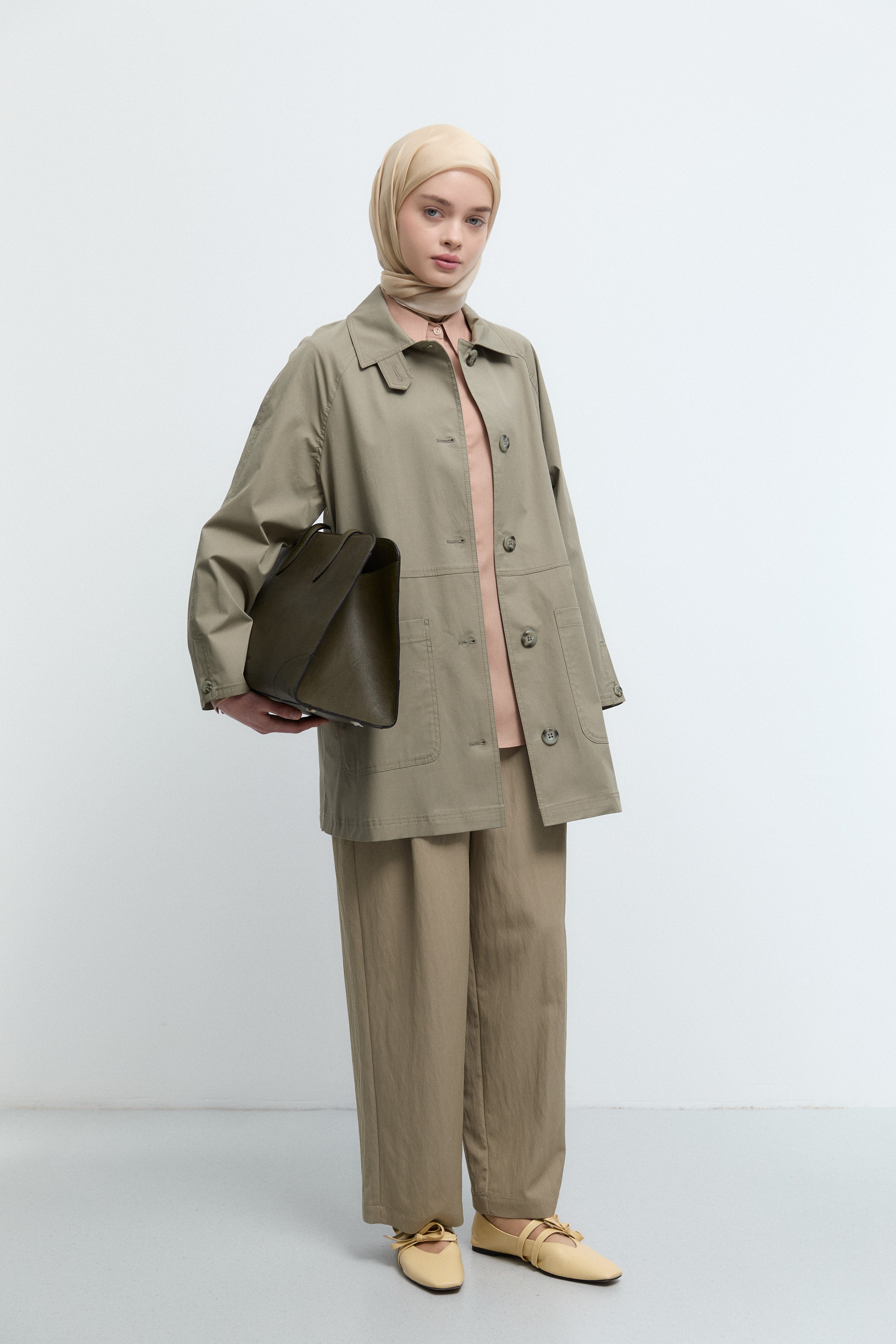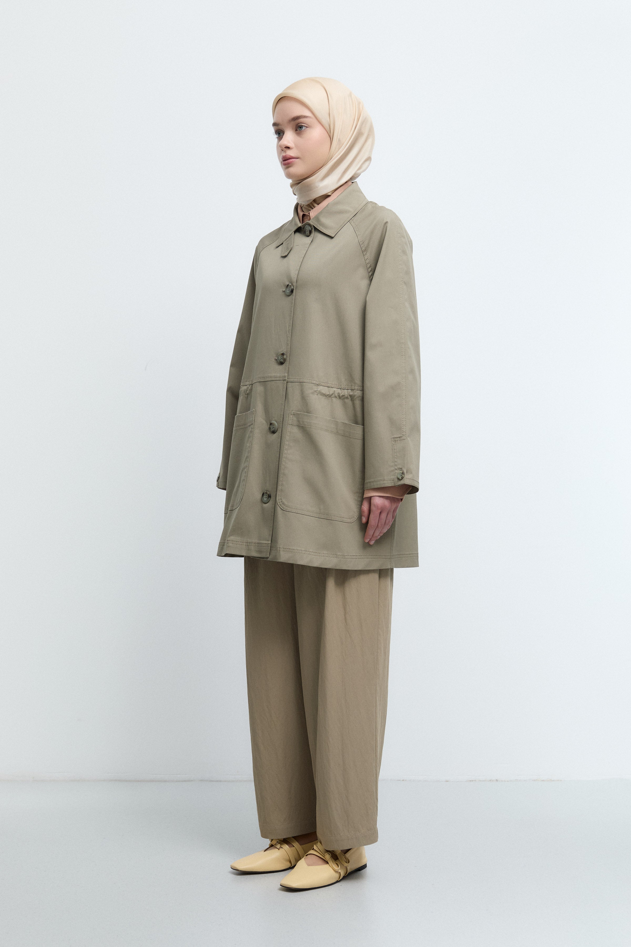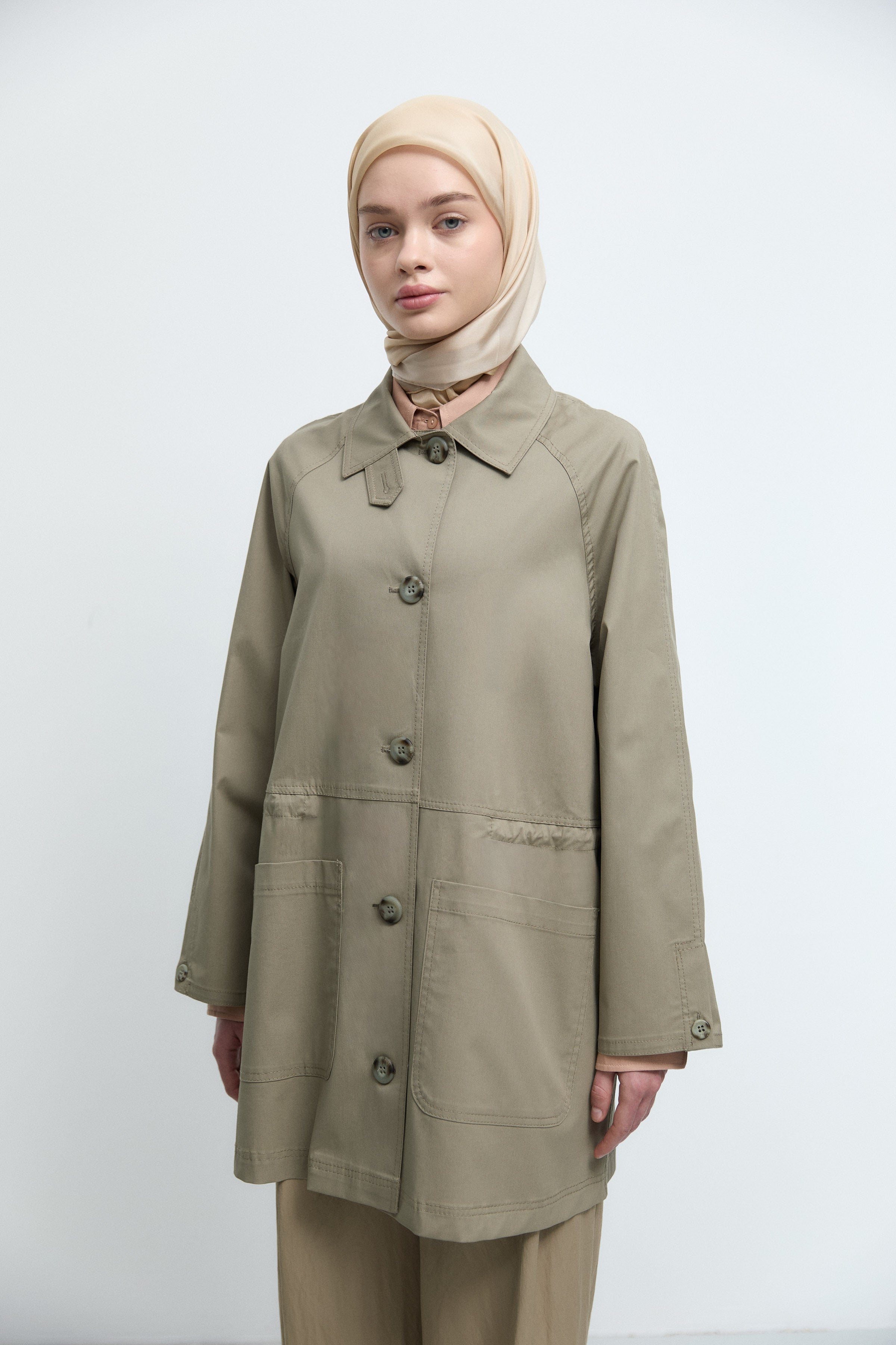 Önden Büyük Cepli Trençkot - Göl Yeşili