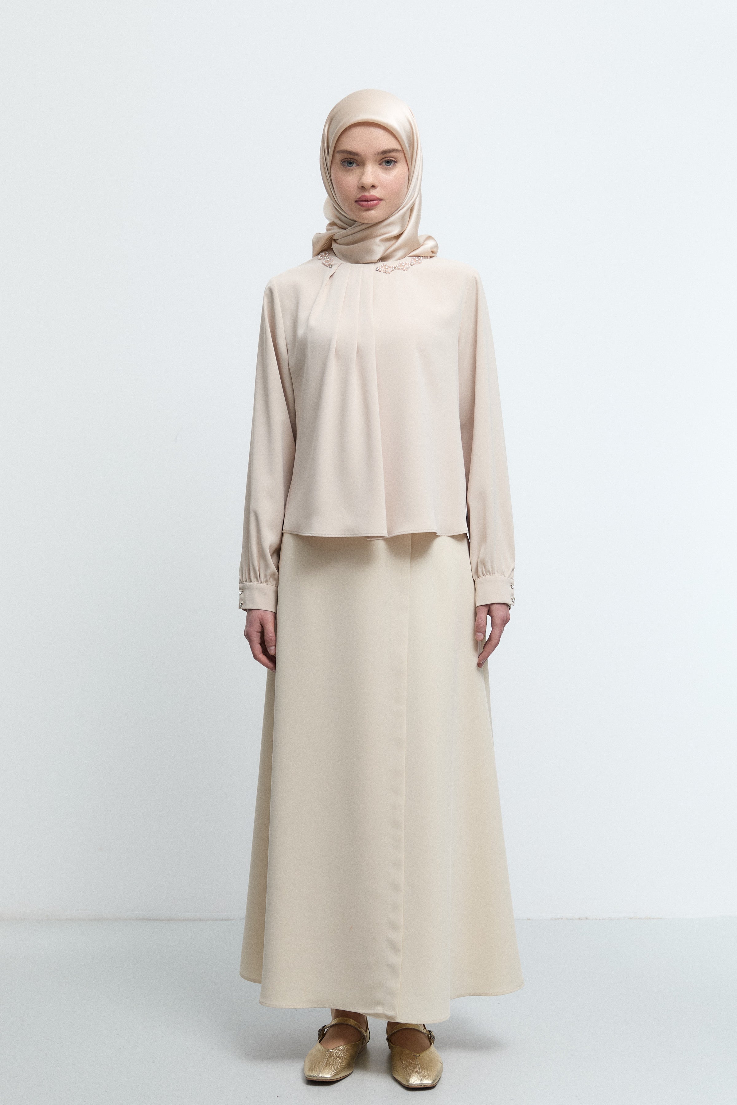 Yakadaki kırma detayıyla zarif bir hacim kazanan bu bluz, feminen dokunuşu modern bir çizgiyle buluşturur.
