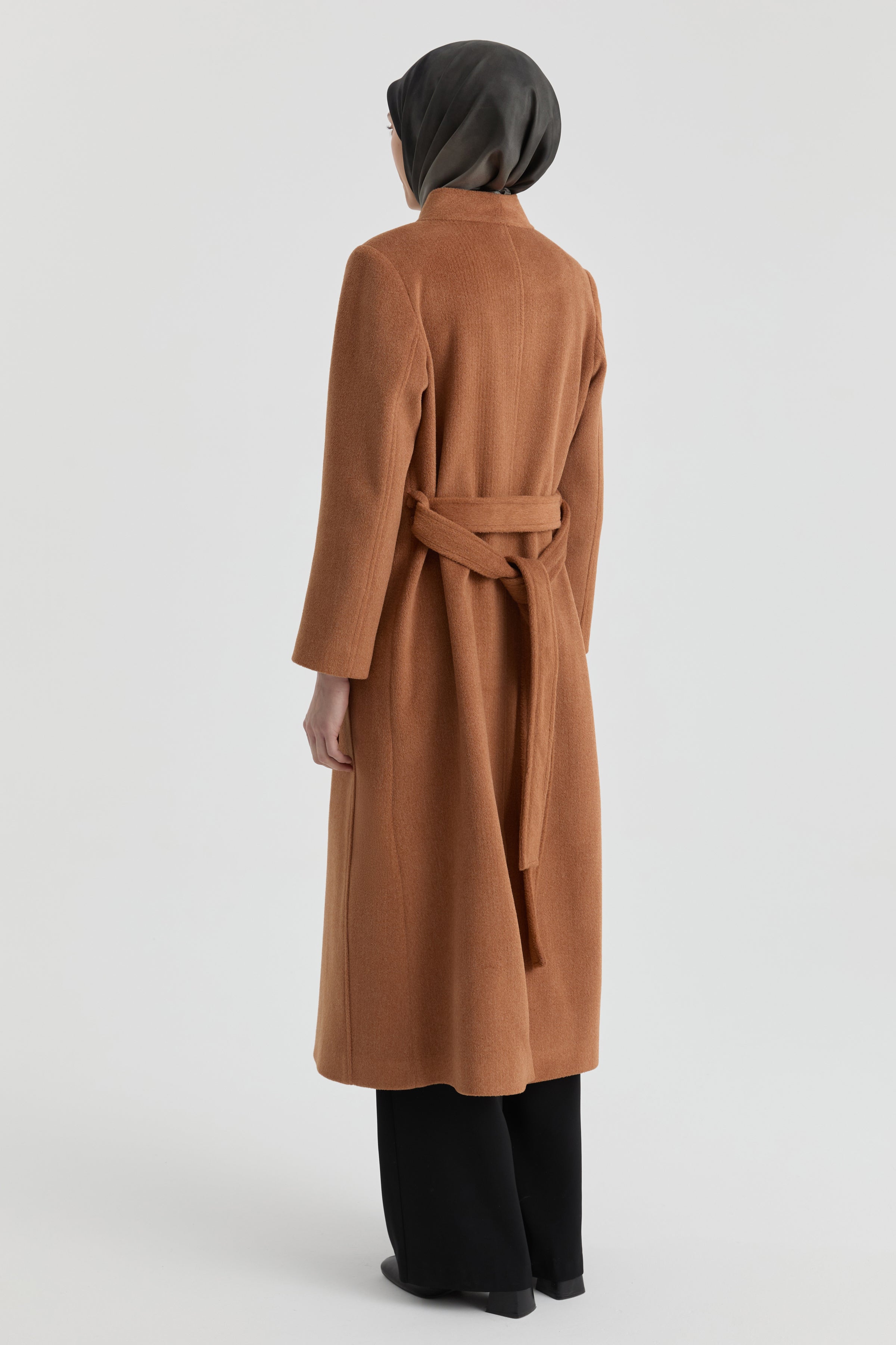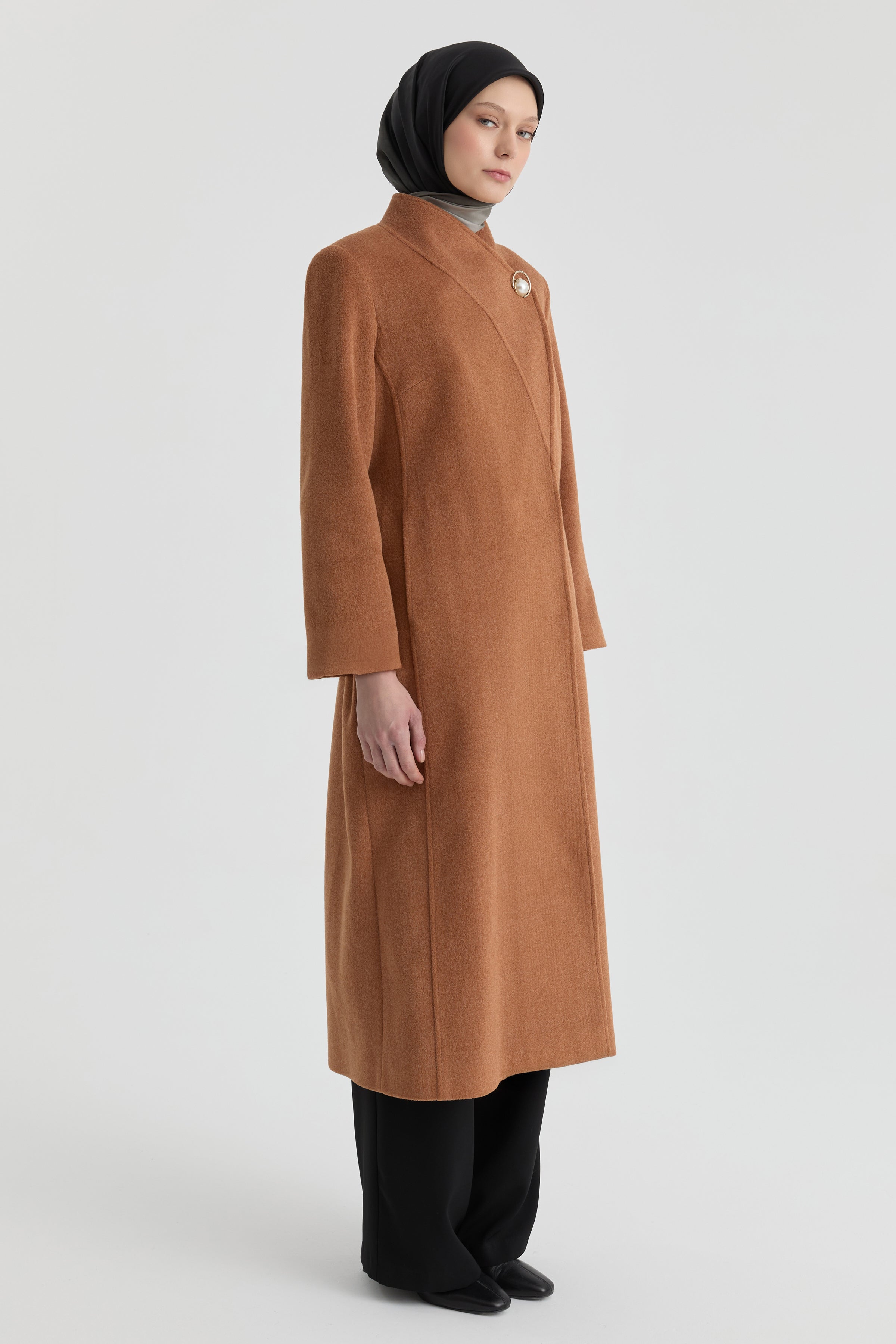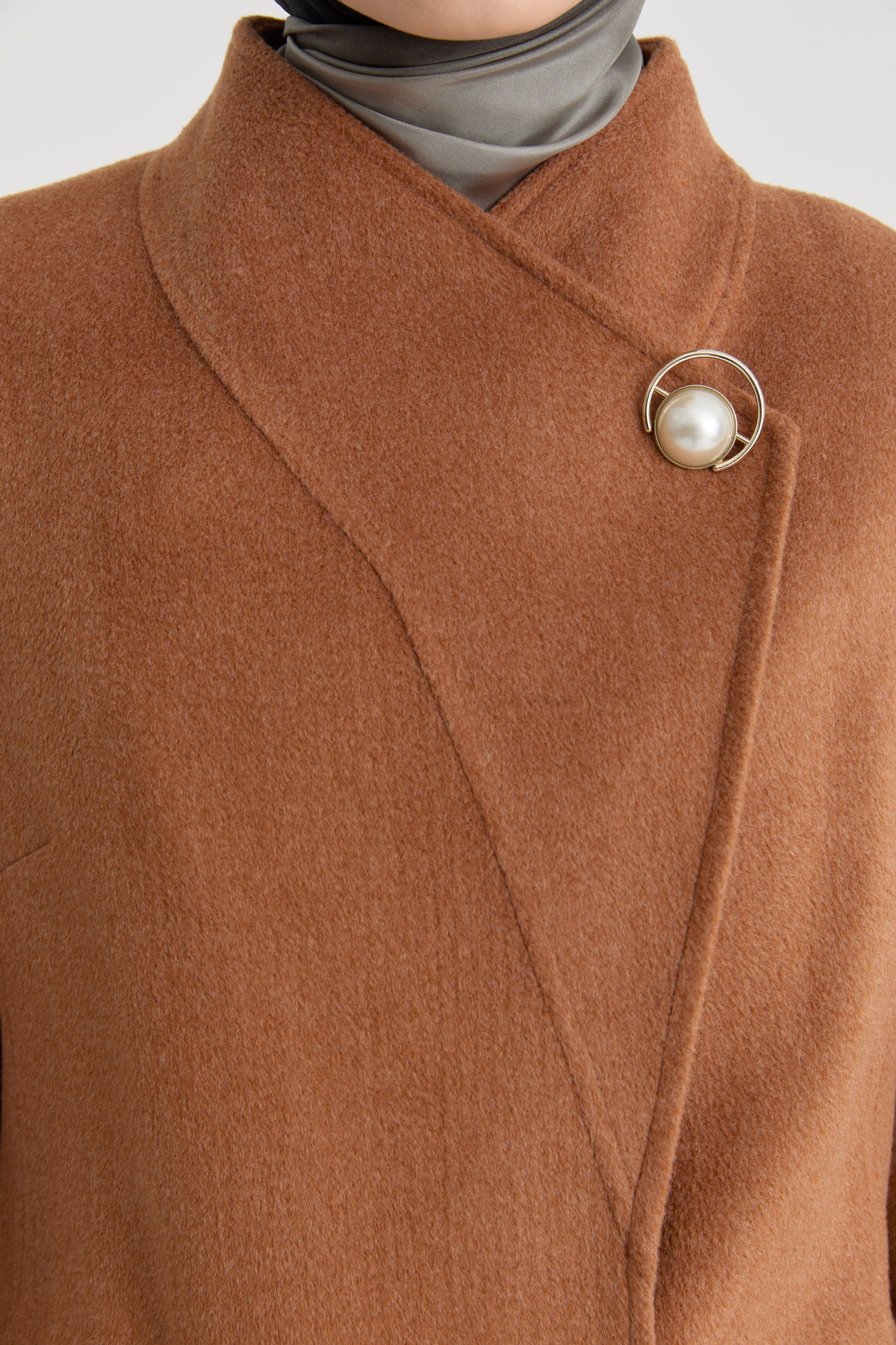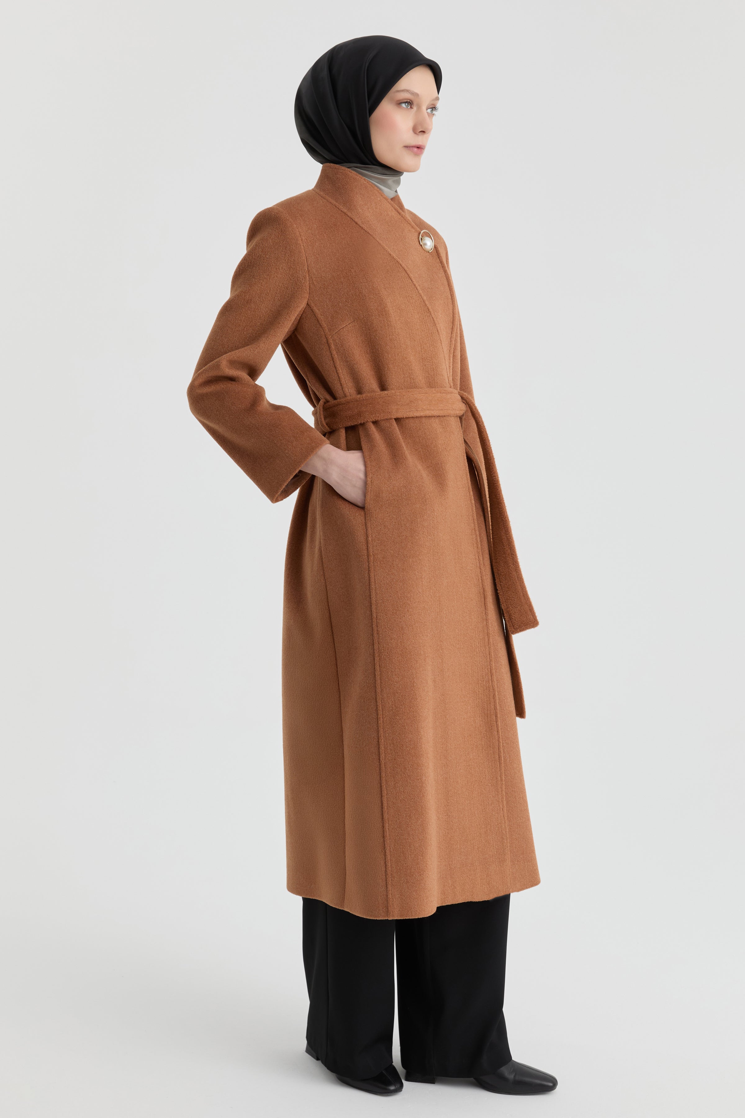 Broş Detaylı Kuşaklı Manto - Tarçın