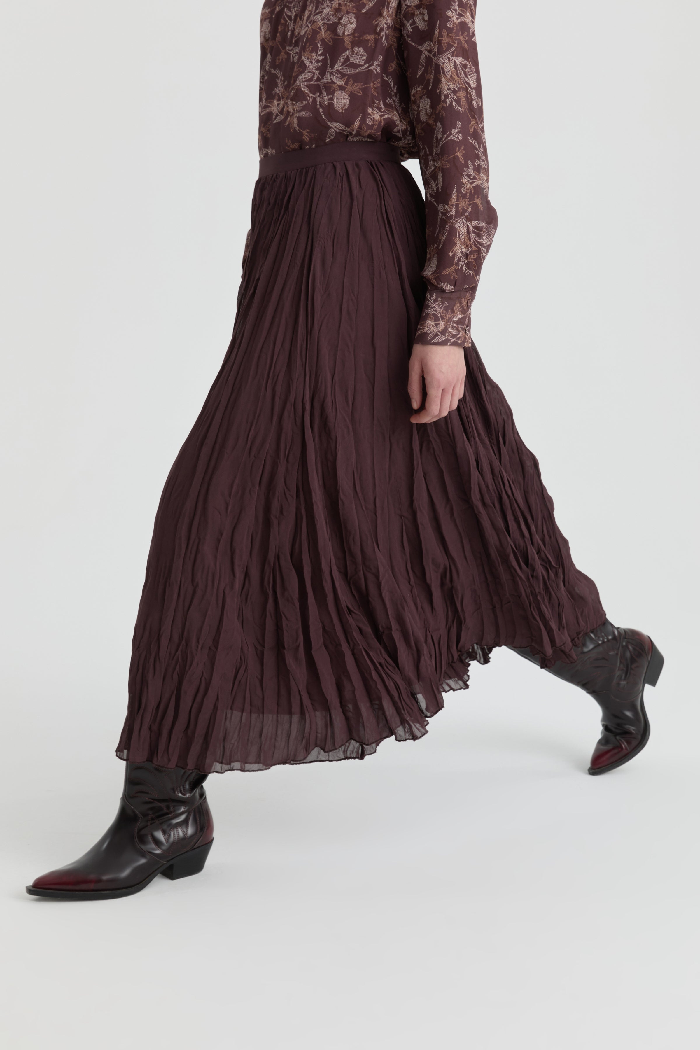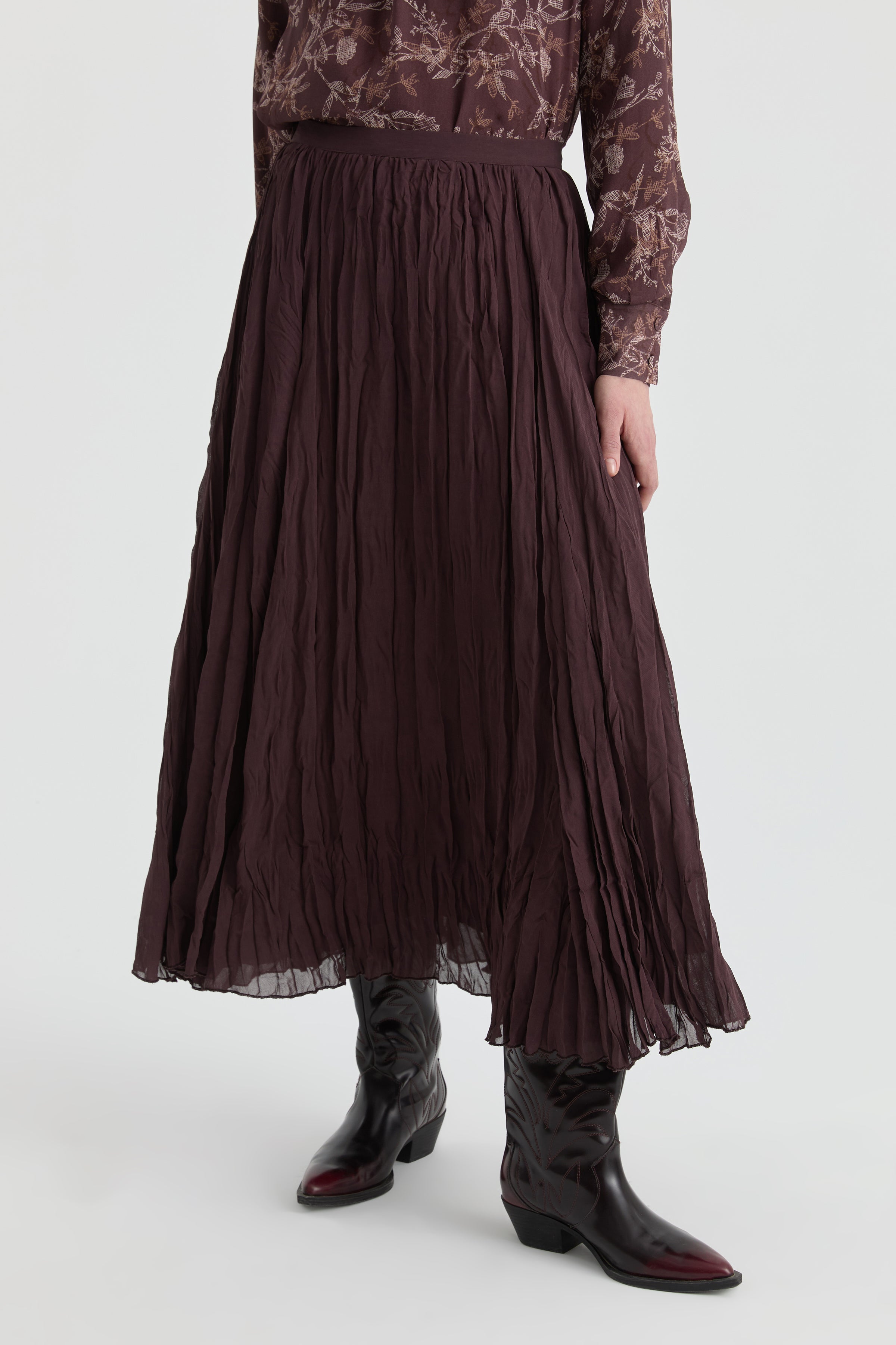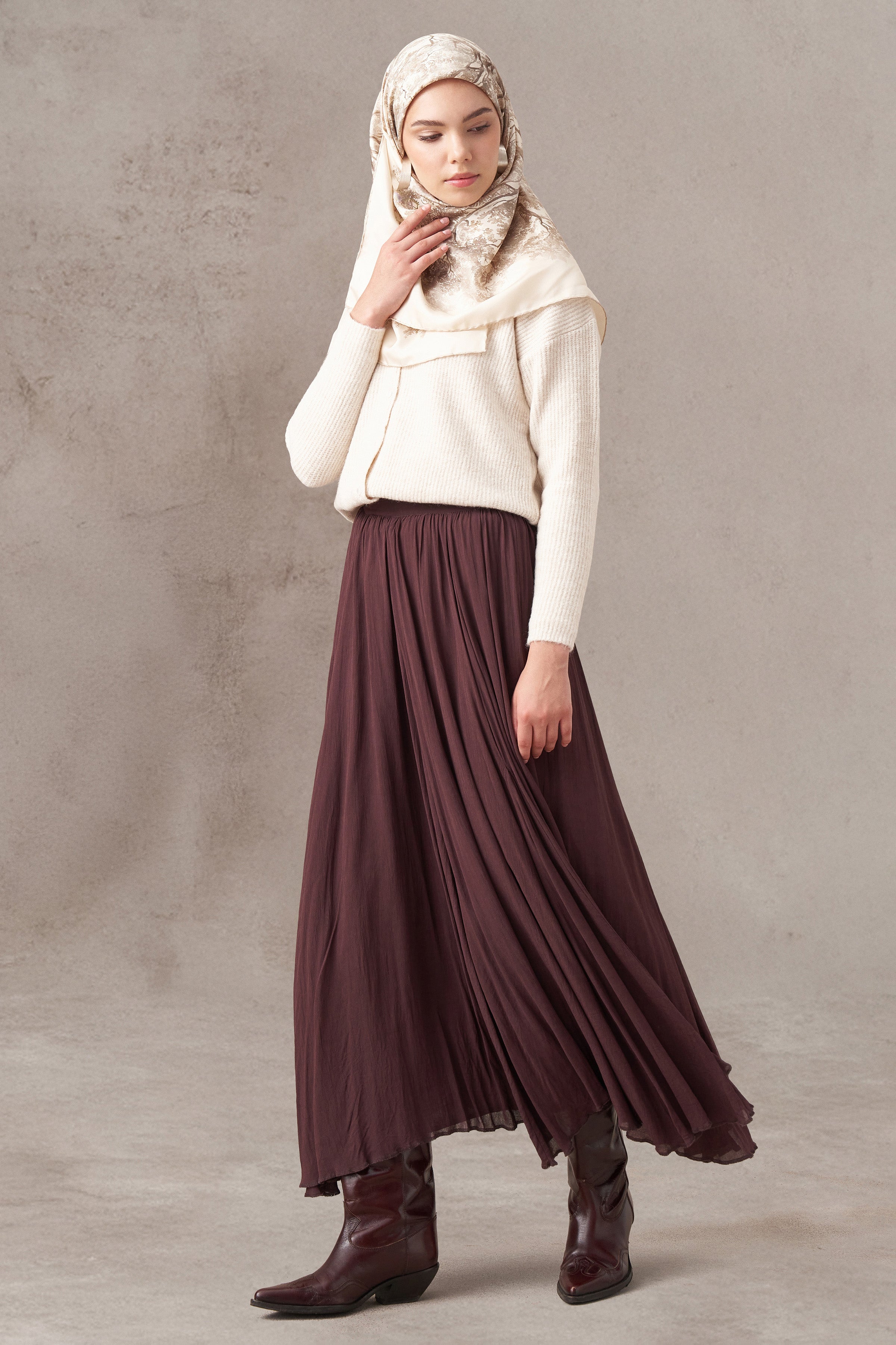 Crash dokusu eteğe doğal bir hareket kazandırırken, uzun formu silüeti zarif ve akıcı bir şekilde tamamlar. Tok yapısı ve sade tasarımıyla günlük kombinlerden daha özenli stillere kolayca uyum sağlar.