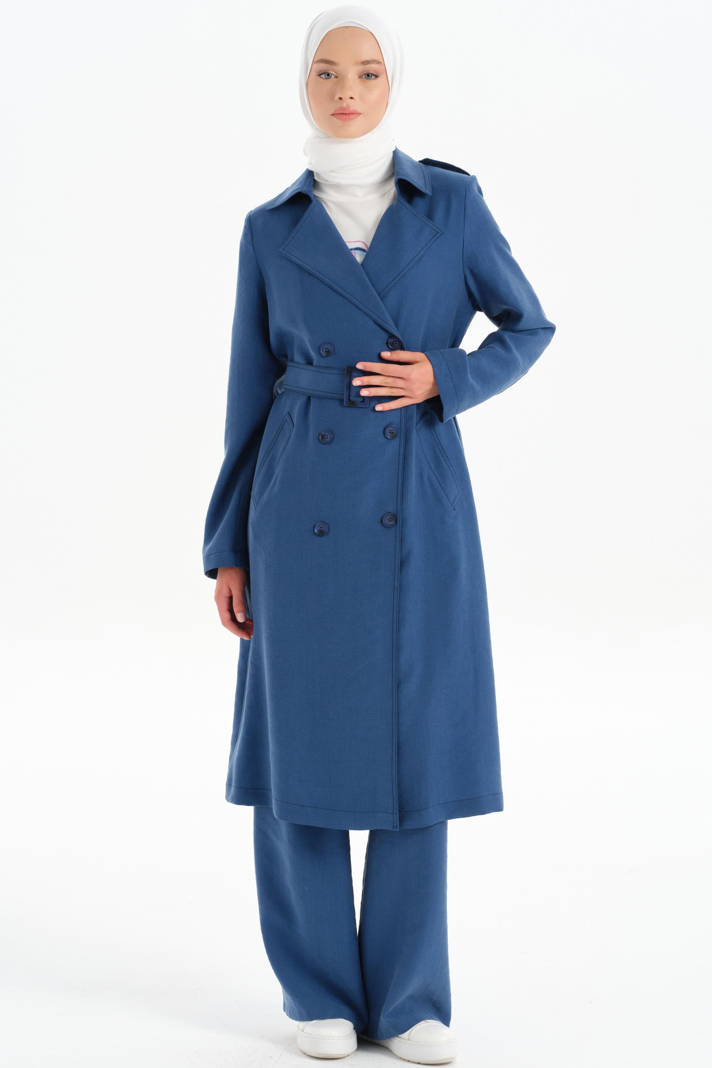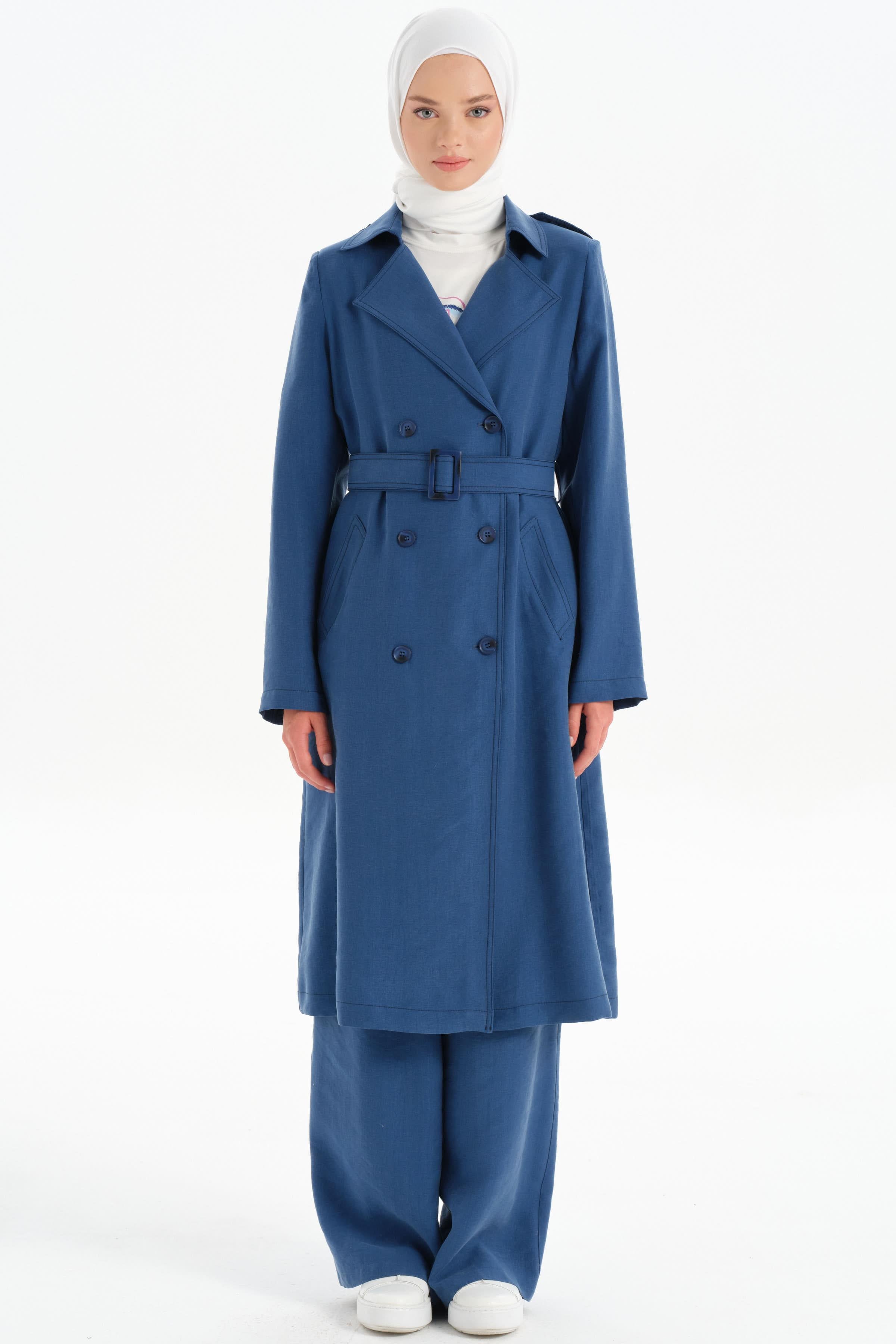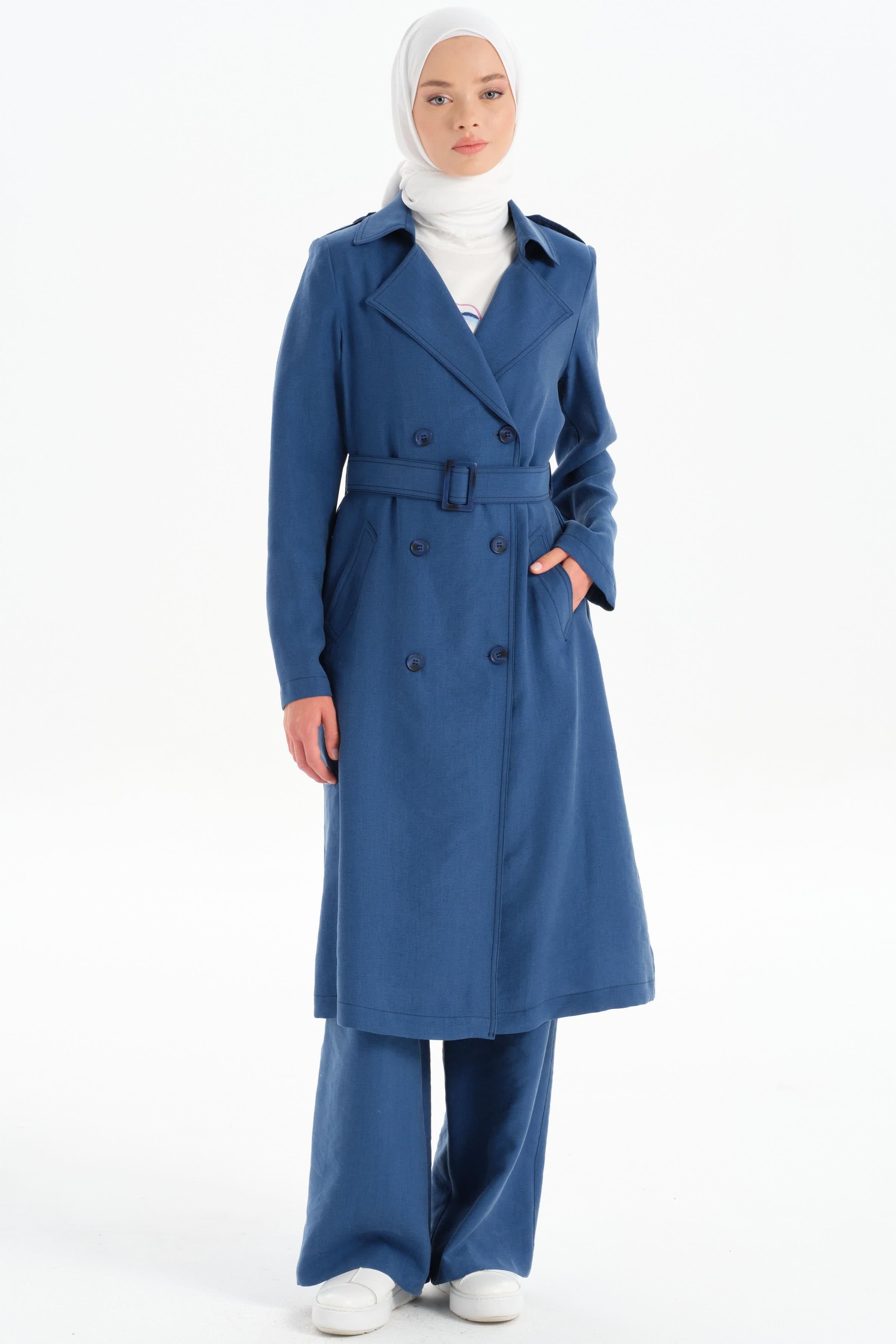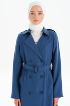 Apoletli Kruvaze Düğmeli Trenç - İndigo