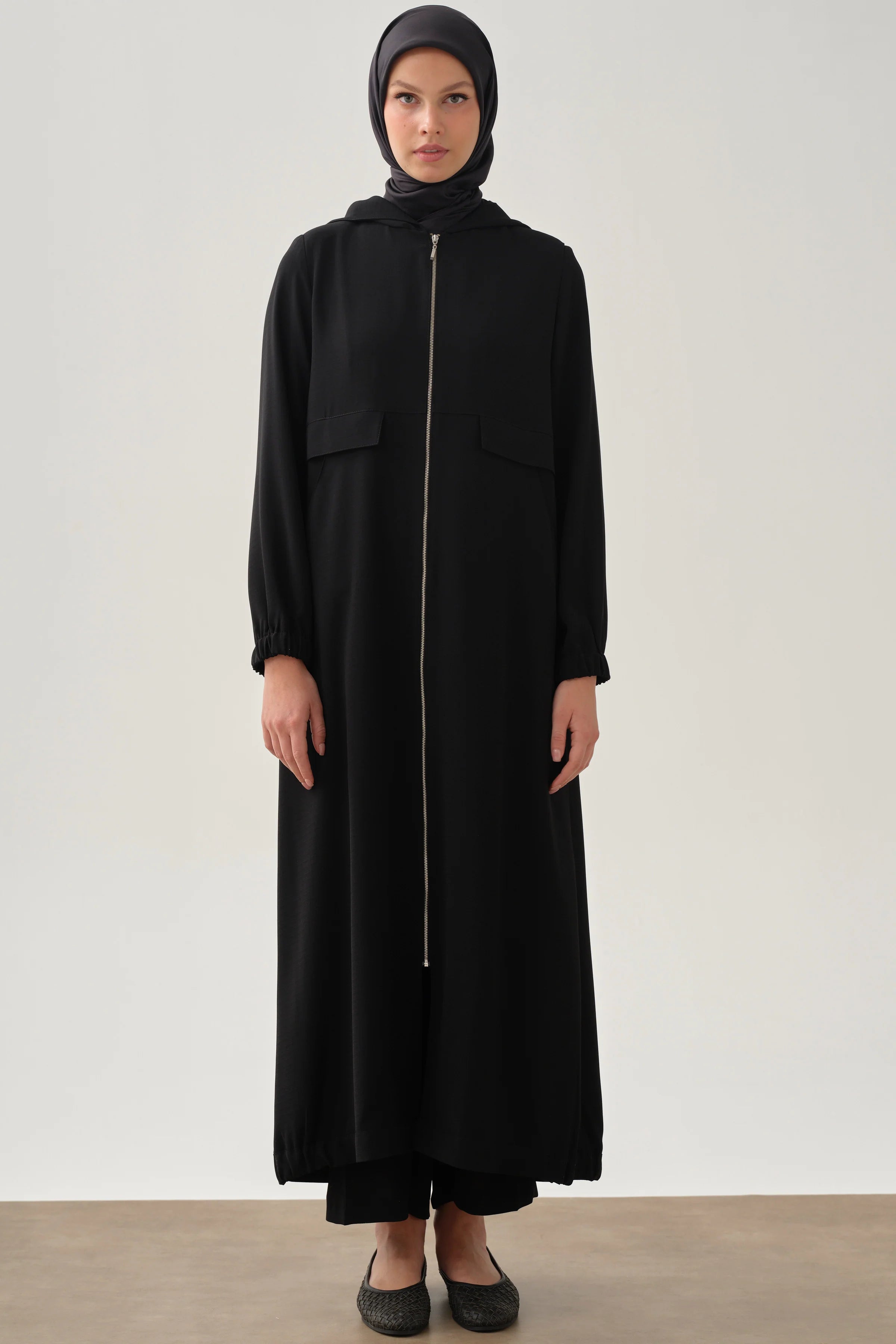 Kapüşonlu Fermuar Kapamalı Ferace - Siyah