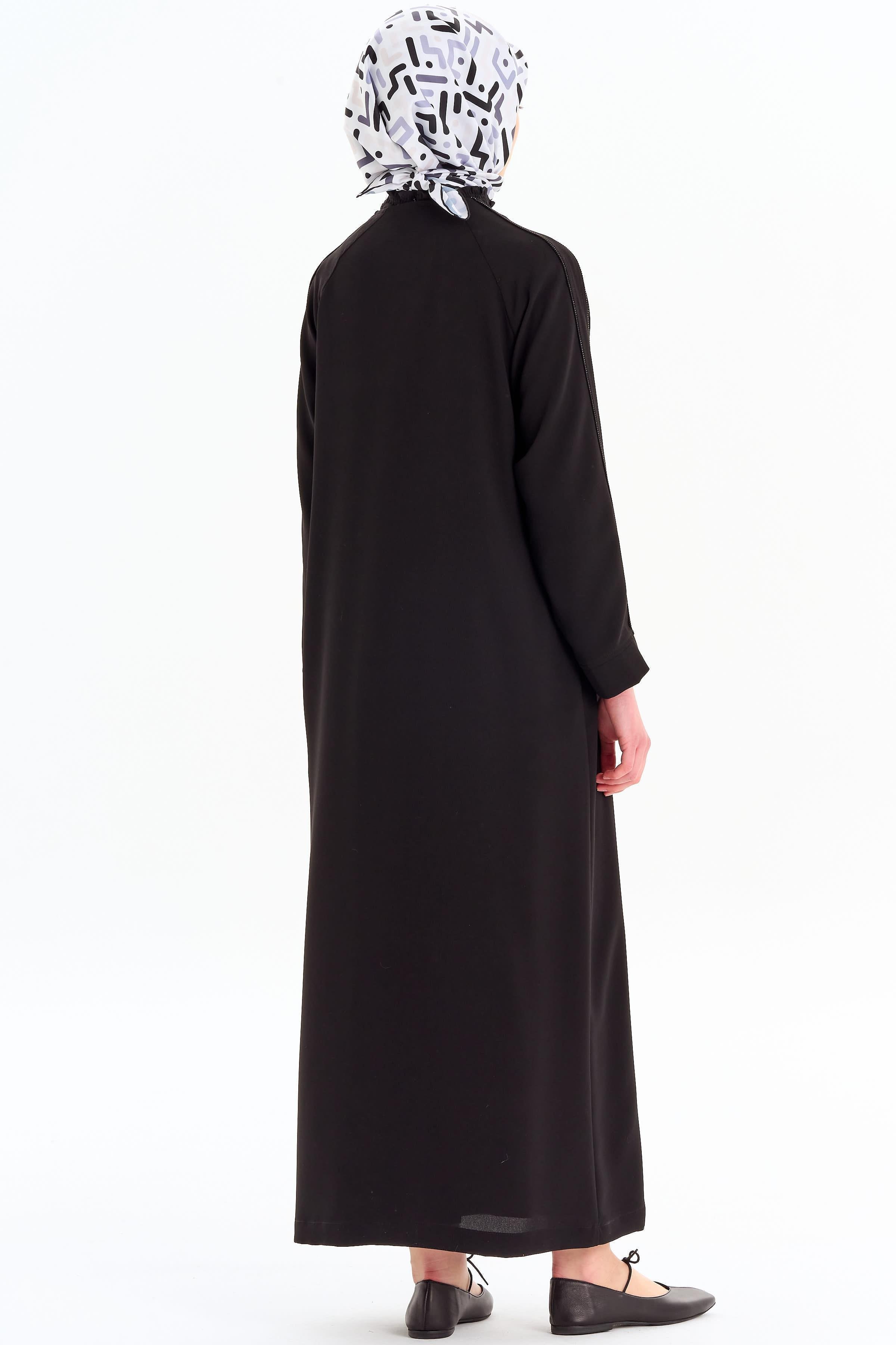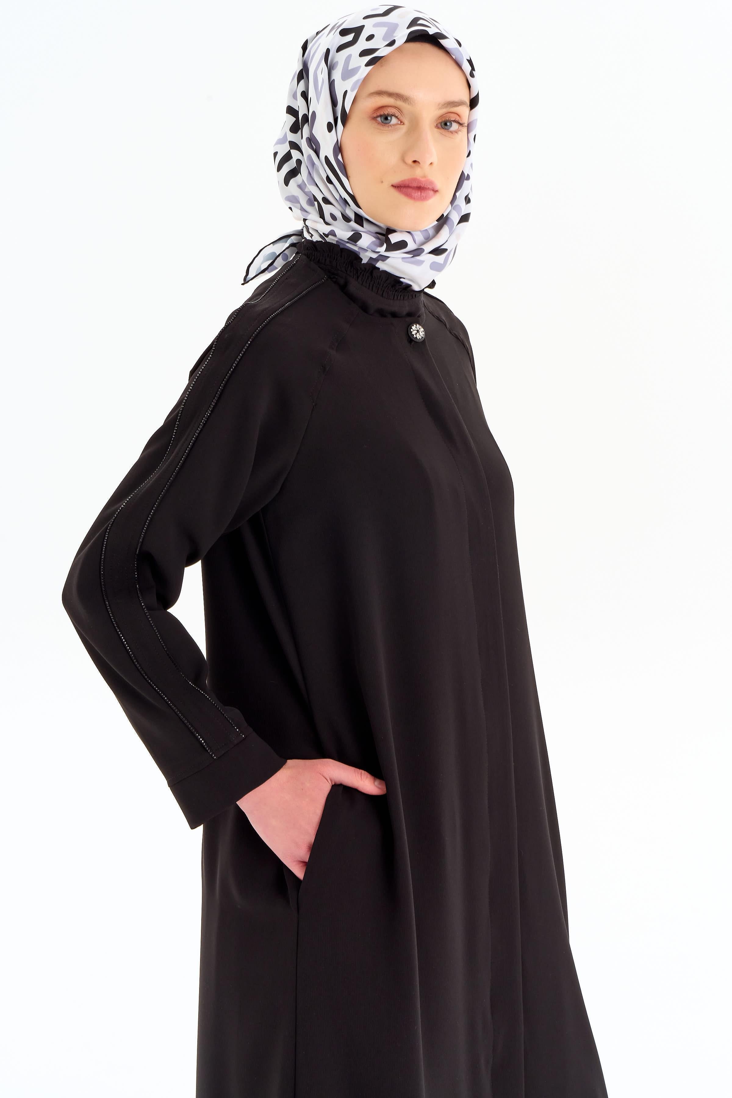 Kolları taş biyeli ferace, zarafeti ve şıklığı bir araya getiriyor. Kol detaylarındaki taş biyeler, feraceye göz alıcı ve sofistike bir dokunuş katarken, geniş kesimi ile rahat bir kullanım sunar.