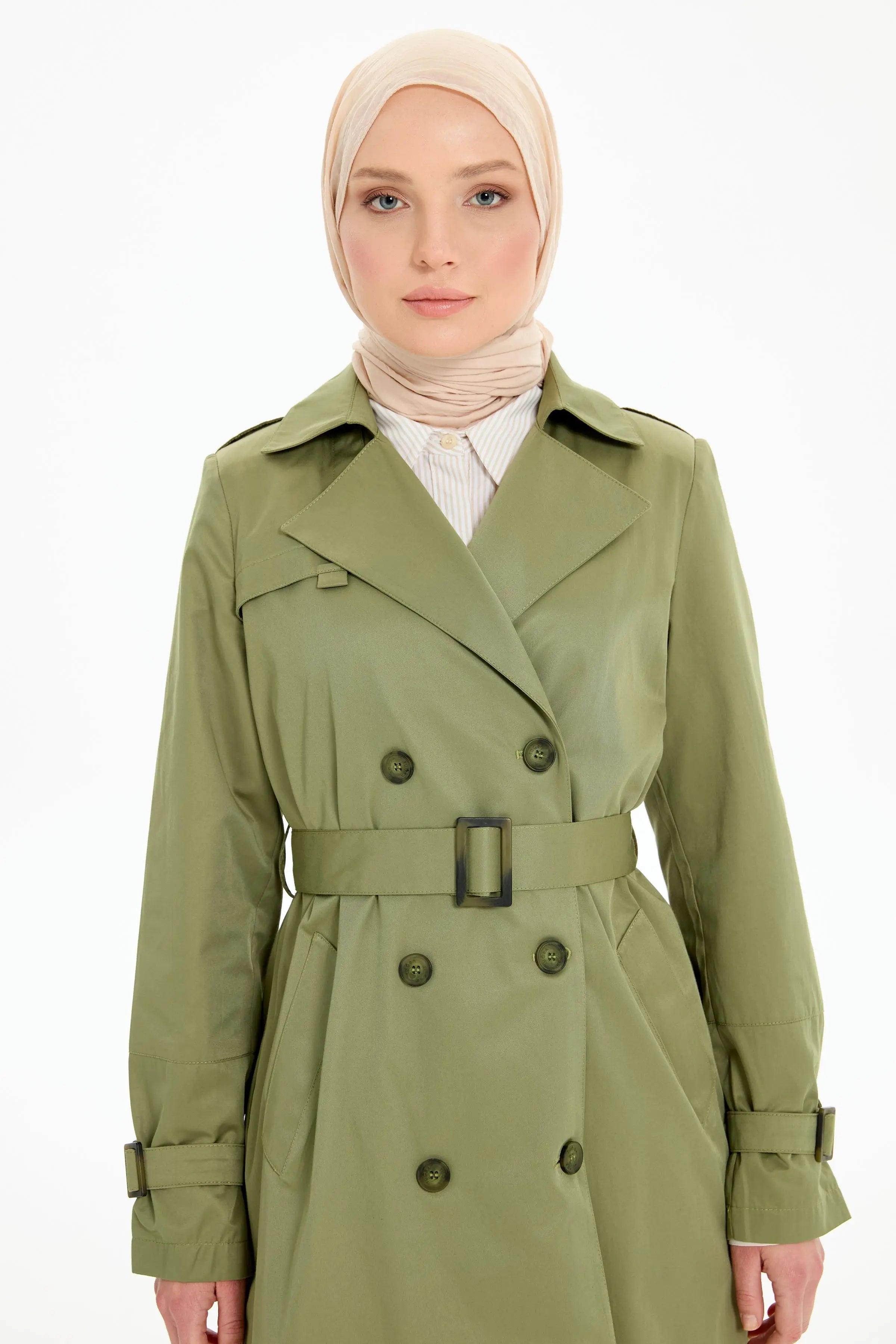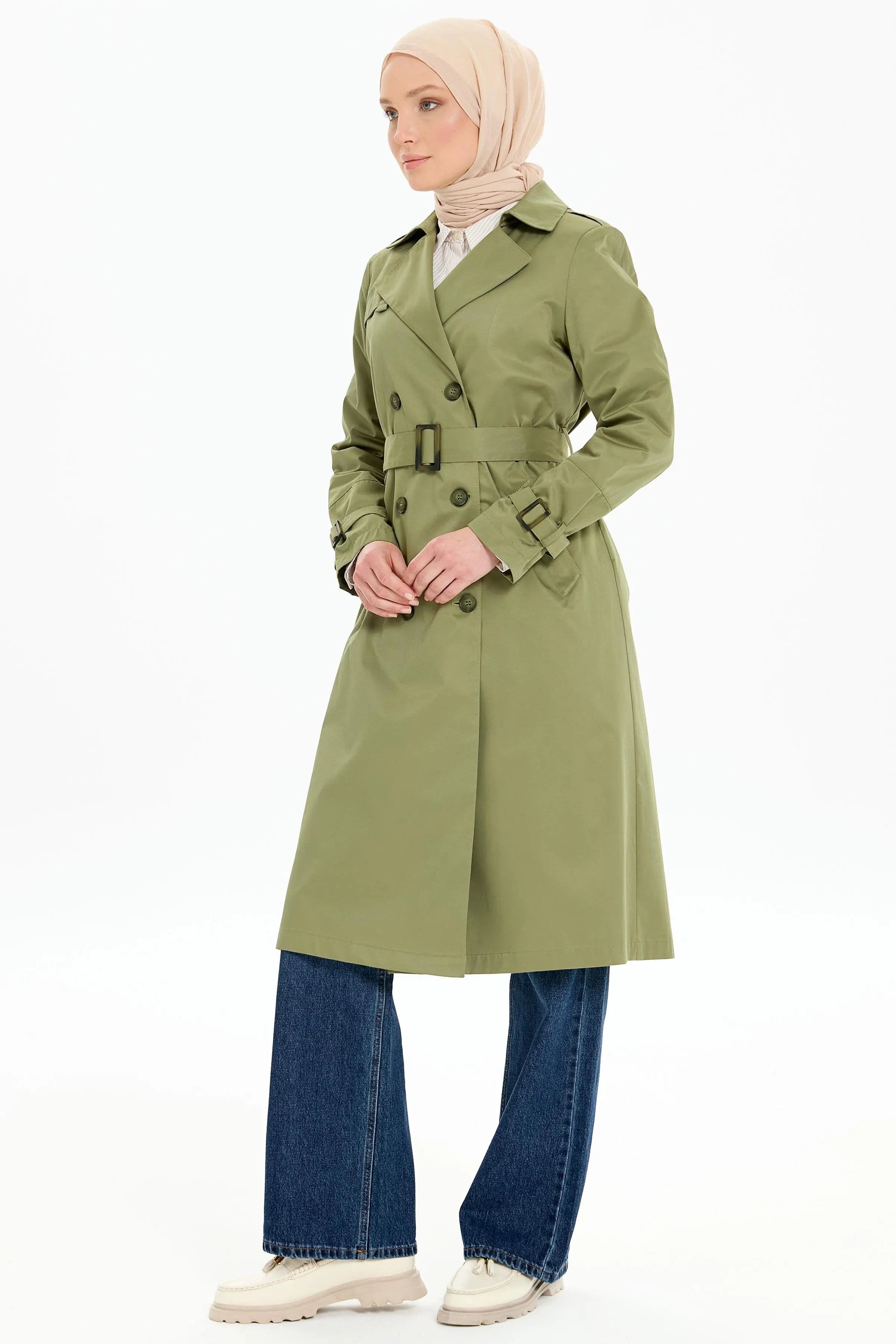 Trençkot, kruvaze yakasıyla sofistike bir görünüm sunarken, kemer detayıyla belinizi vurgular ve siluetinizi şekillendirir.