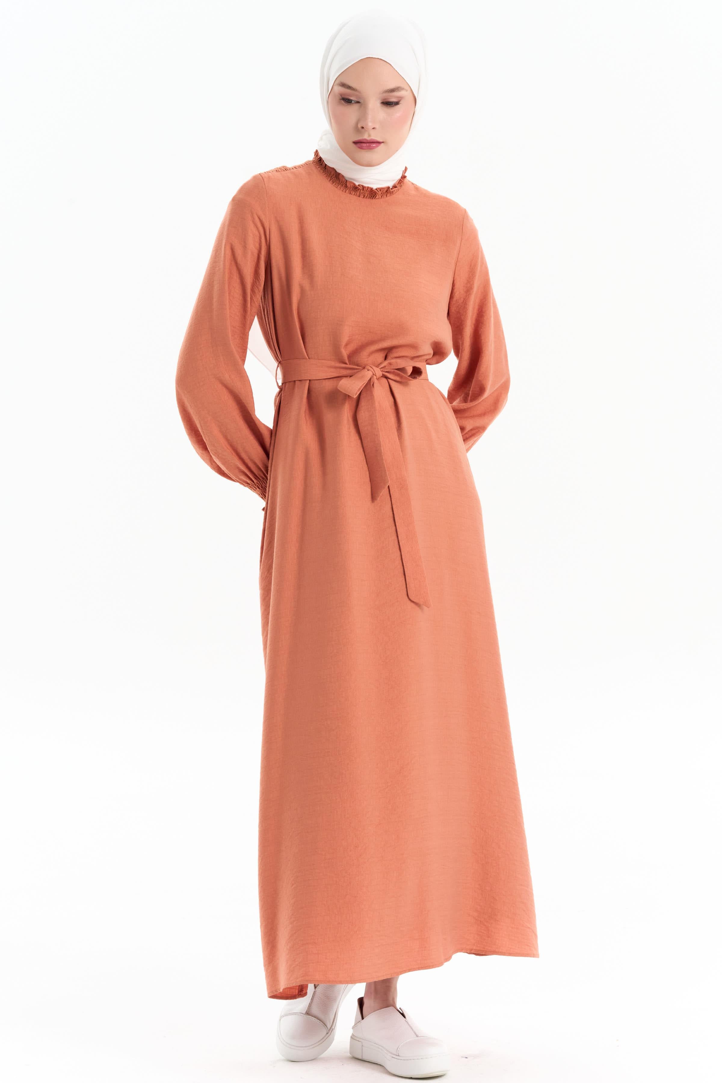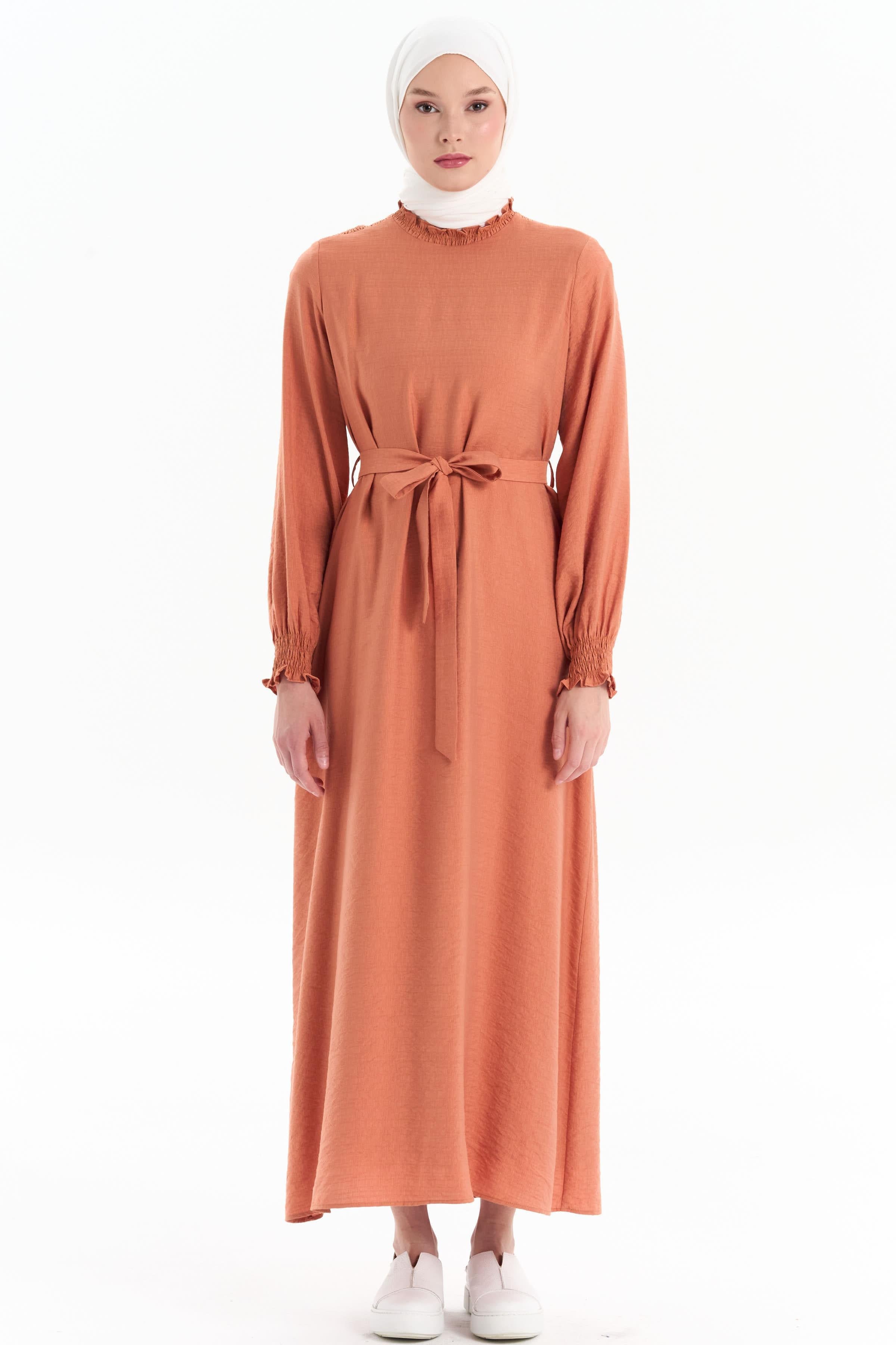 Lastik Detaylı Kuşaklı Elbise - Kiremit