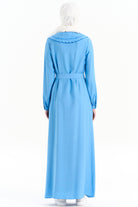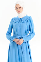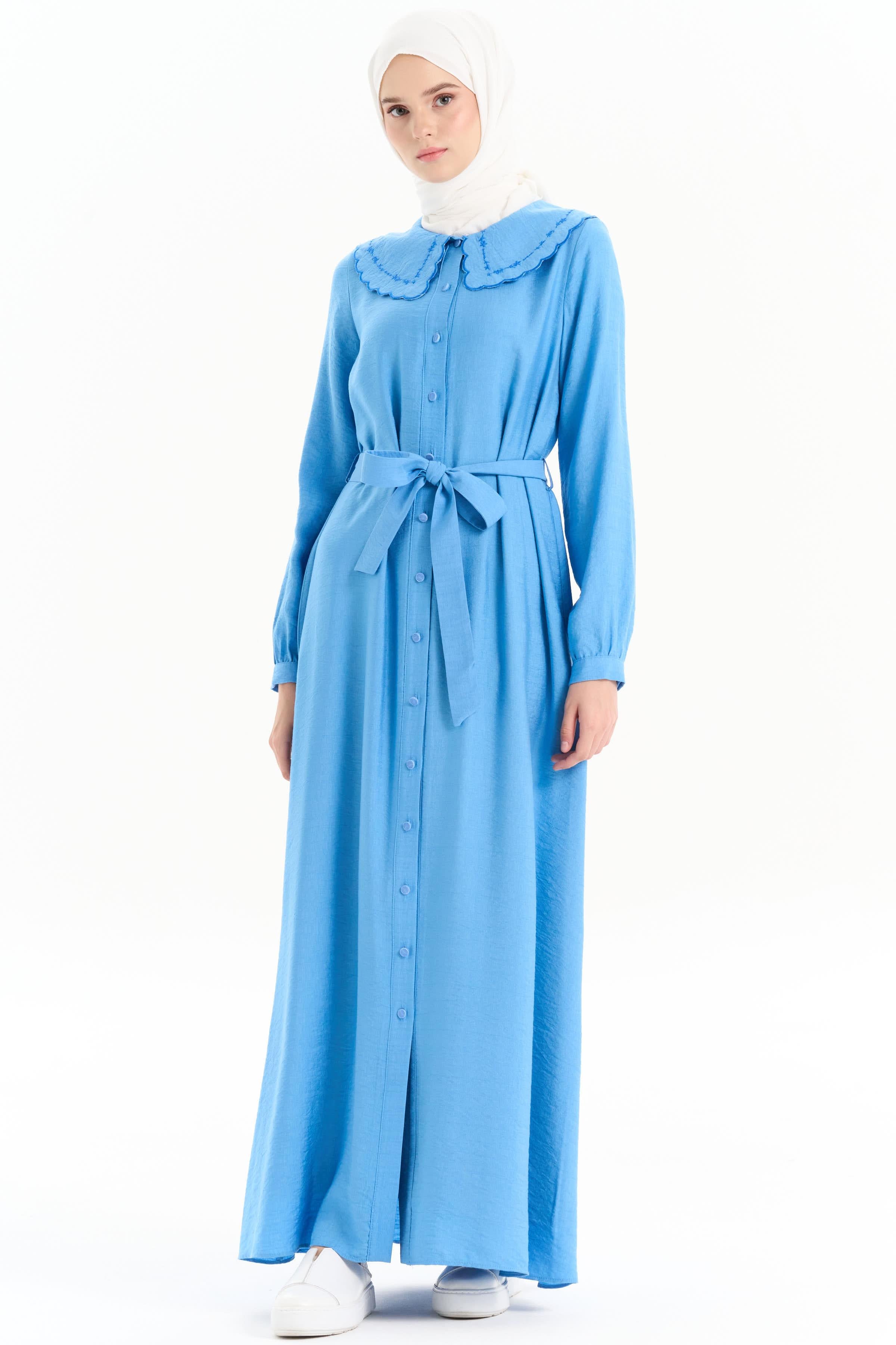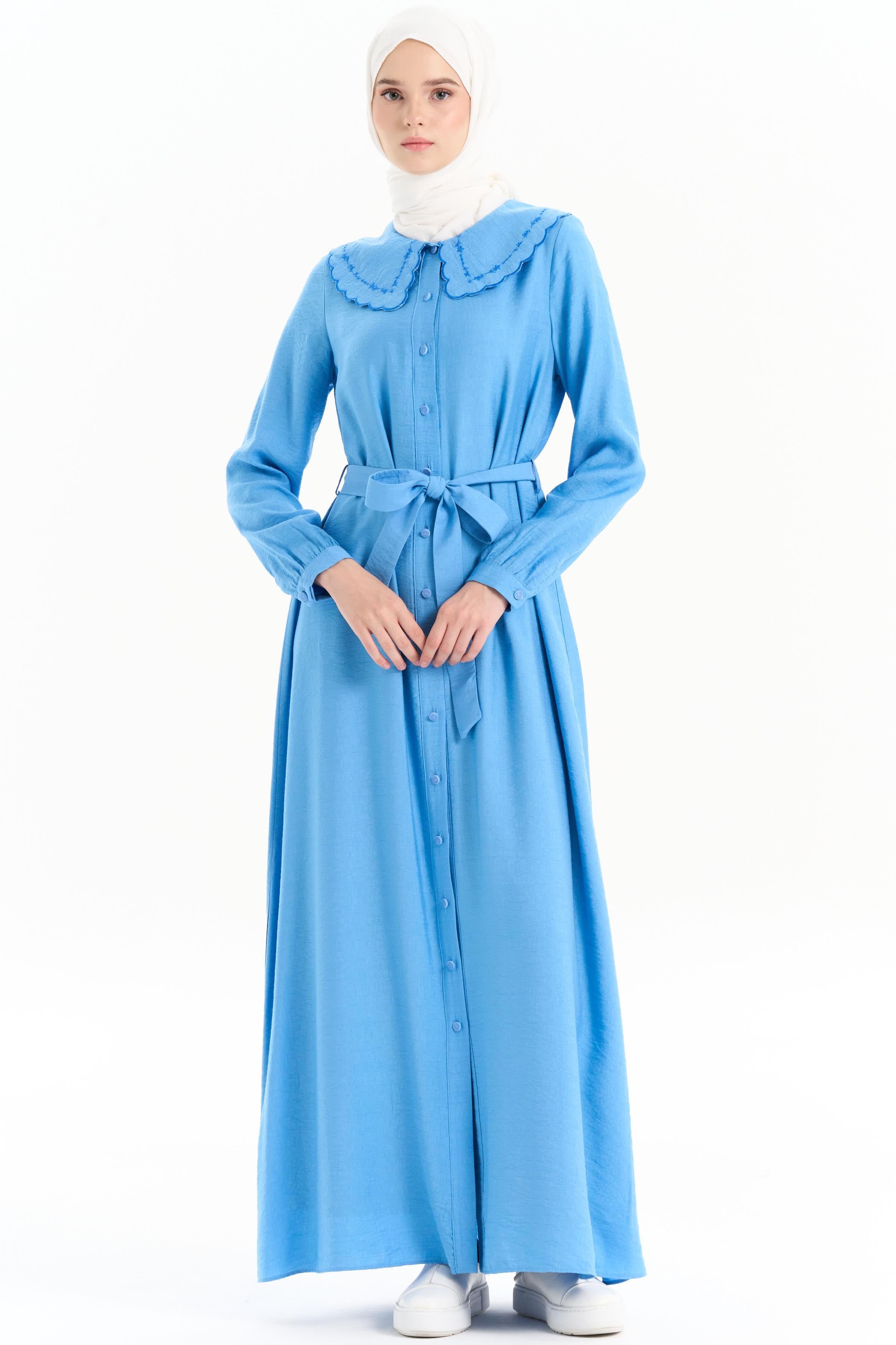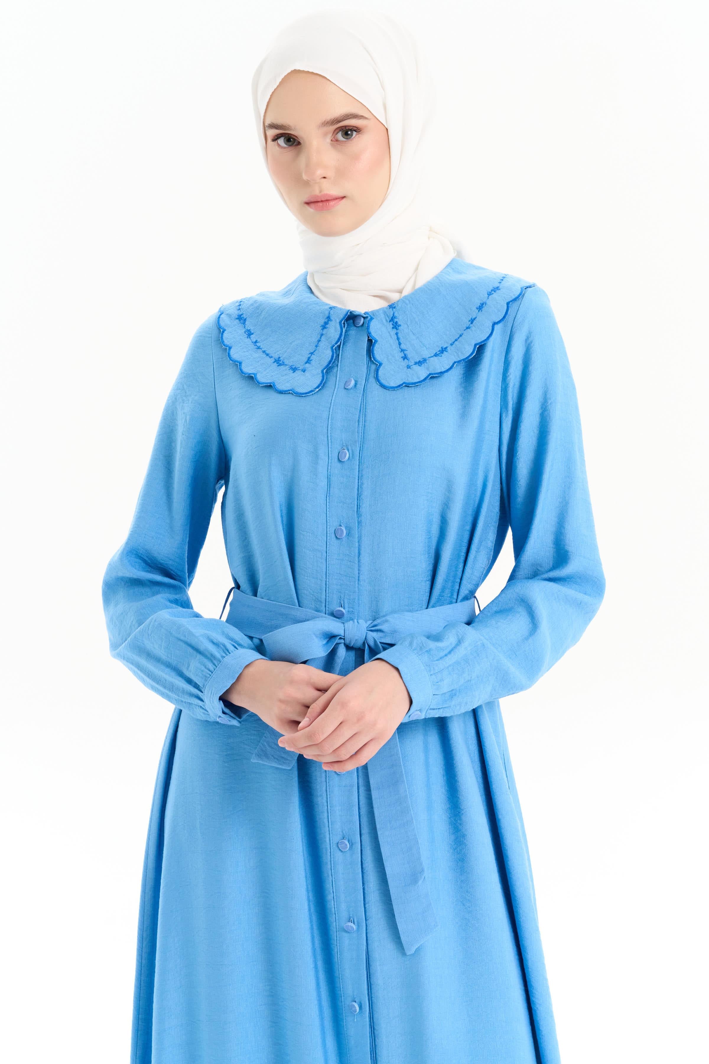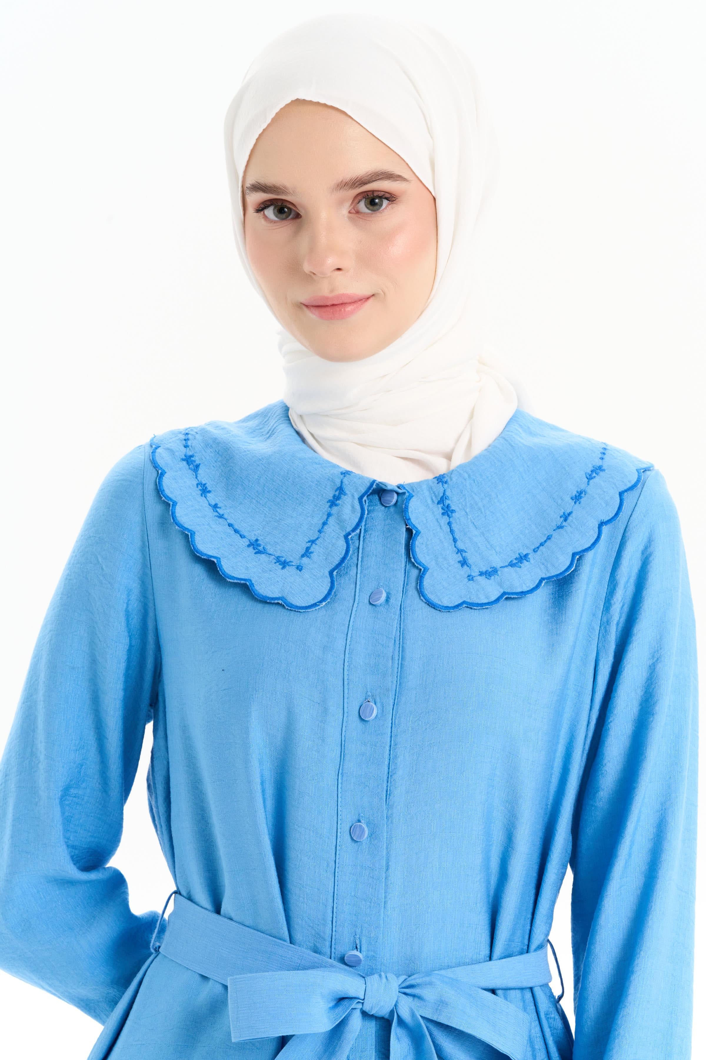 Nakışlı Bebe Yakalı Bel Kuşaklı Elbise - Mavi