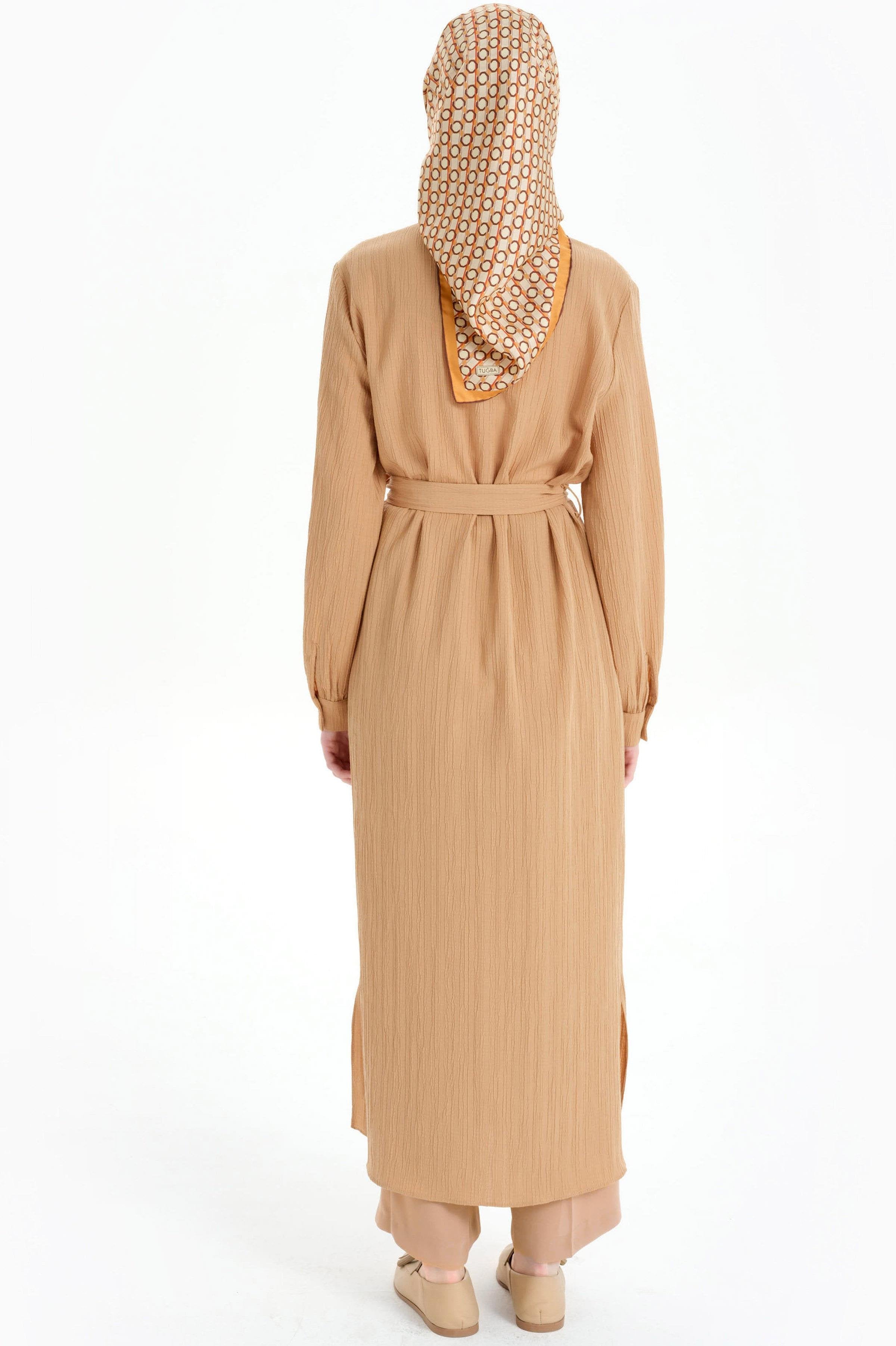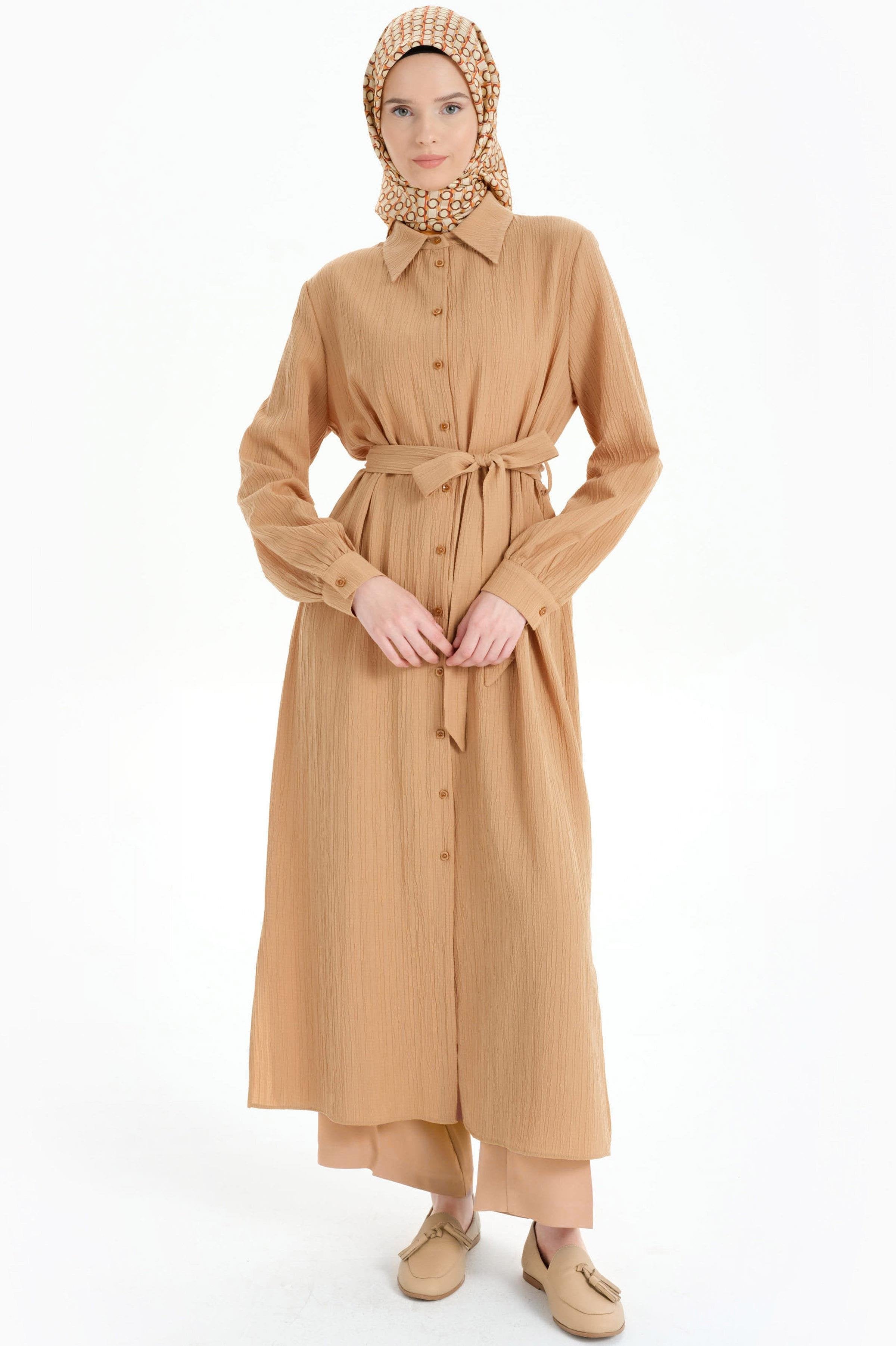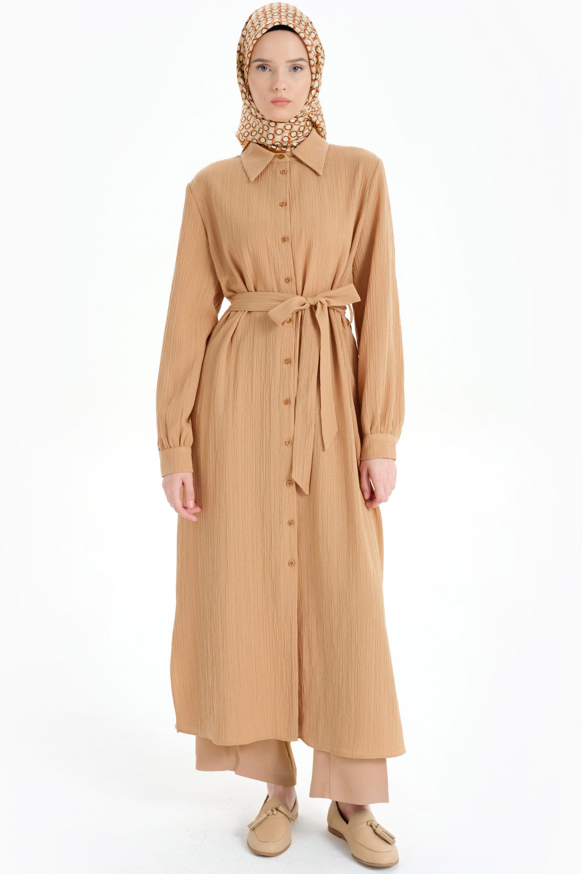 Bel kuşaklı uzun tunik, zarif ve modern tasarımıyla öne çıkar. Bel kısmındaki kuşak detayı, tunikte şık bir siluet oluştururken, uzun kesimi sayesinde hem rahat hem de şık bir görünüm sunar. Yumuşak ve hafif kumaşıyla gün boyu konfor sağlar.