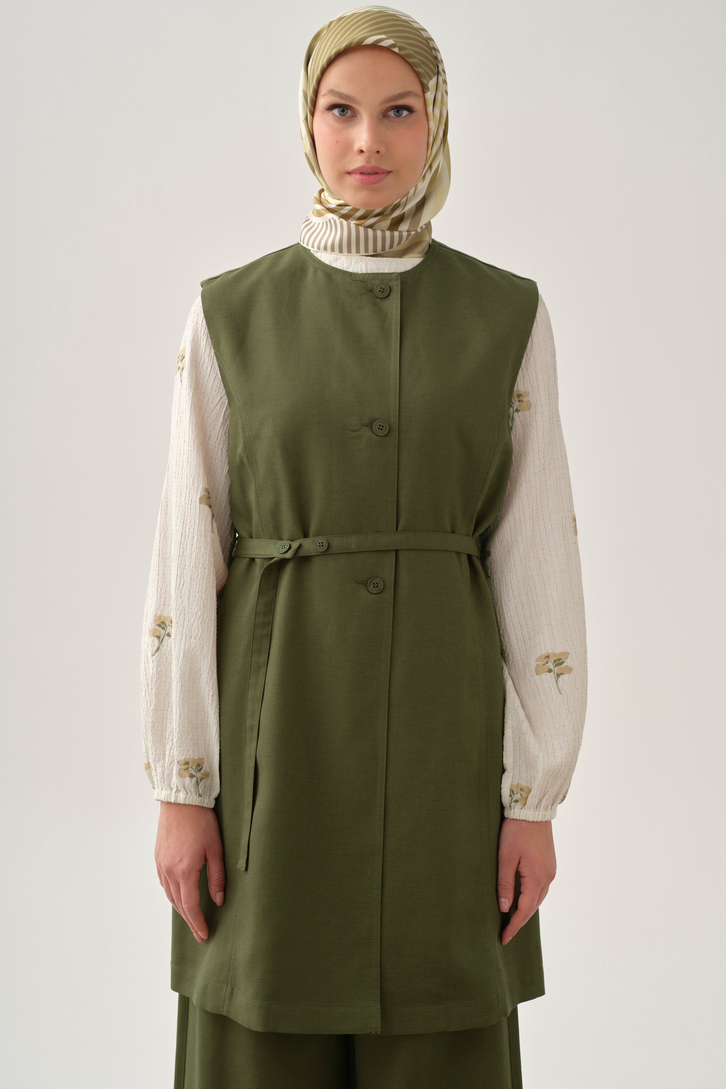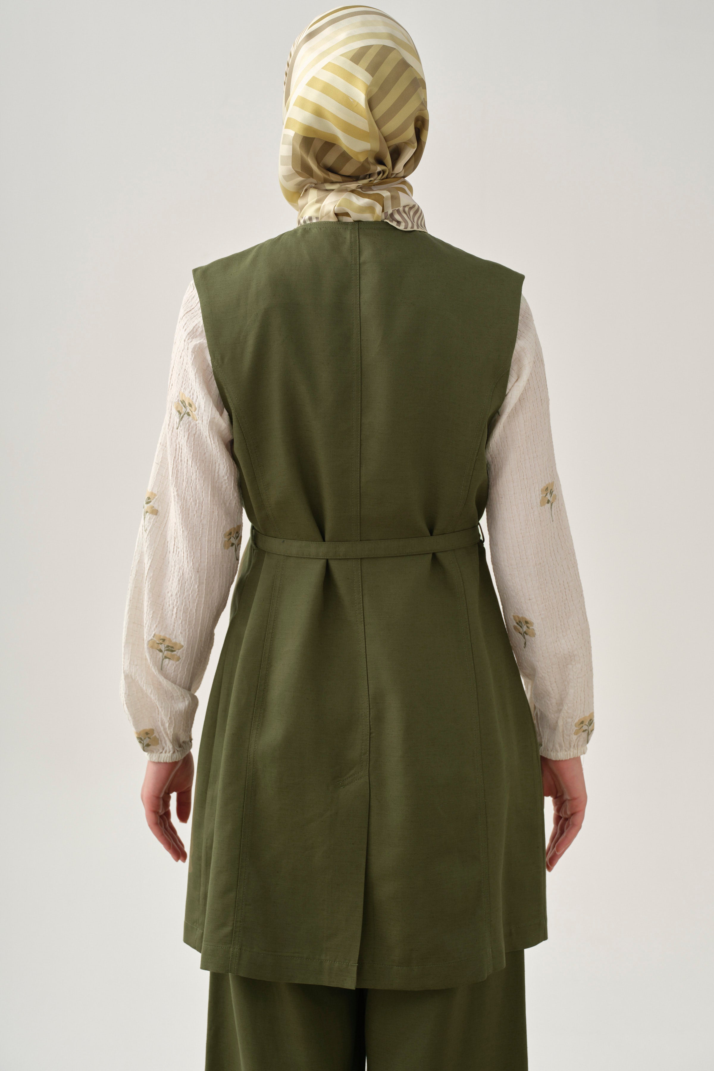 Kemerli Sıfır Yaka Yelek - Haki