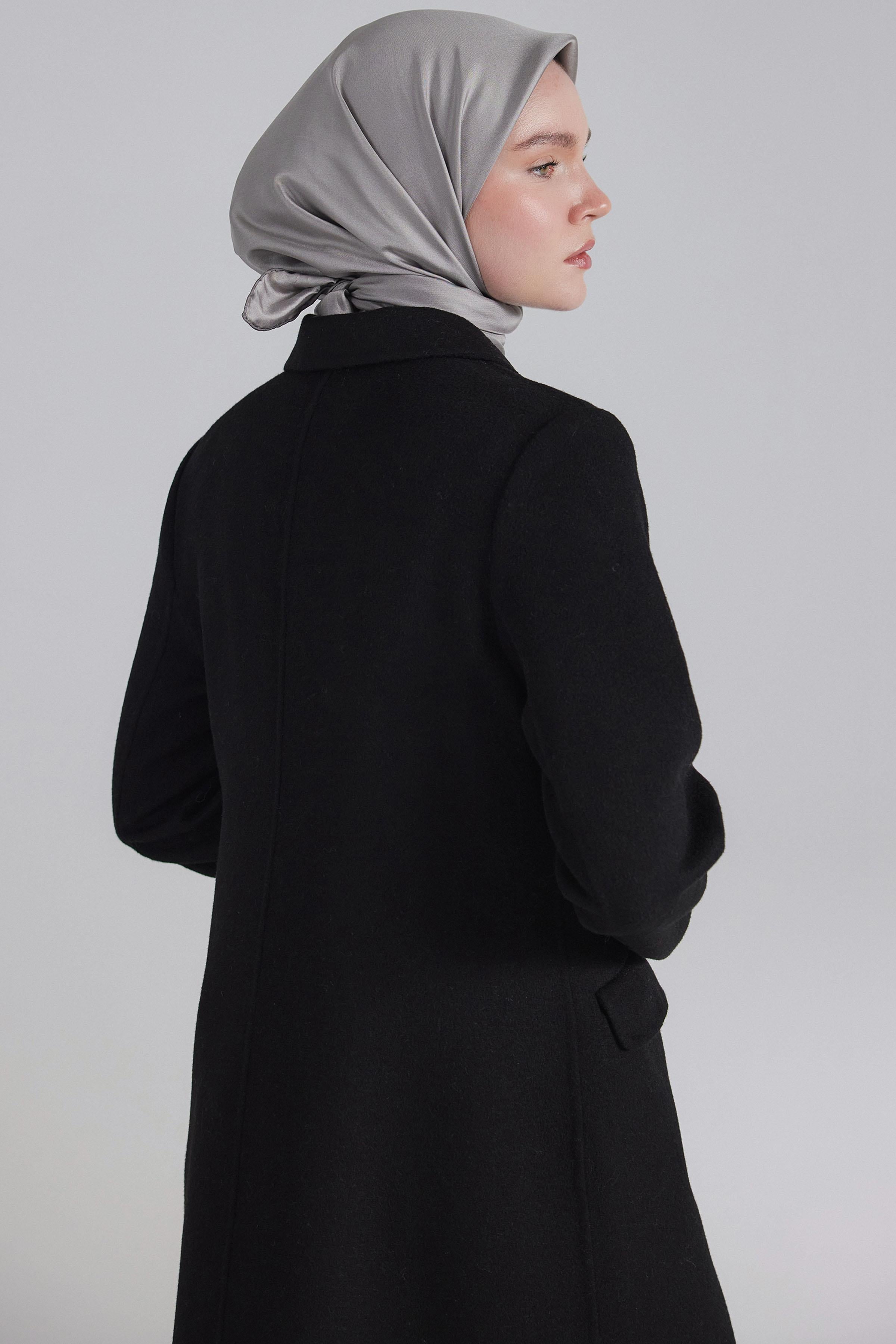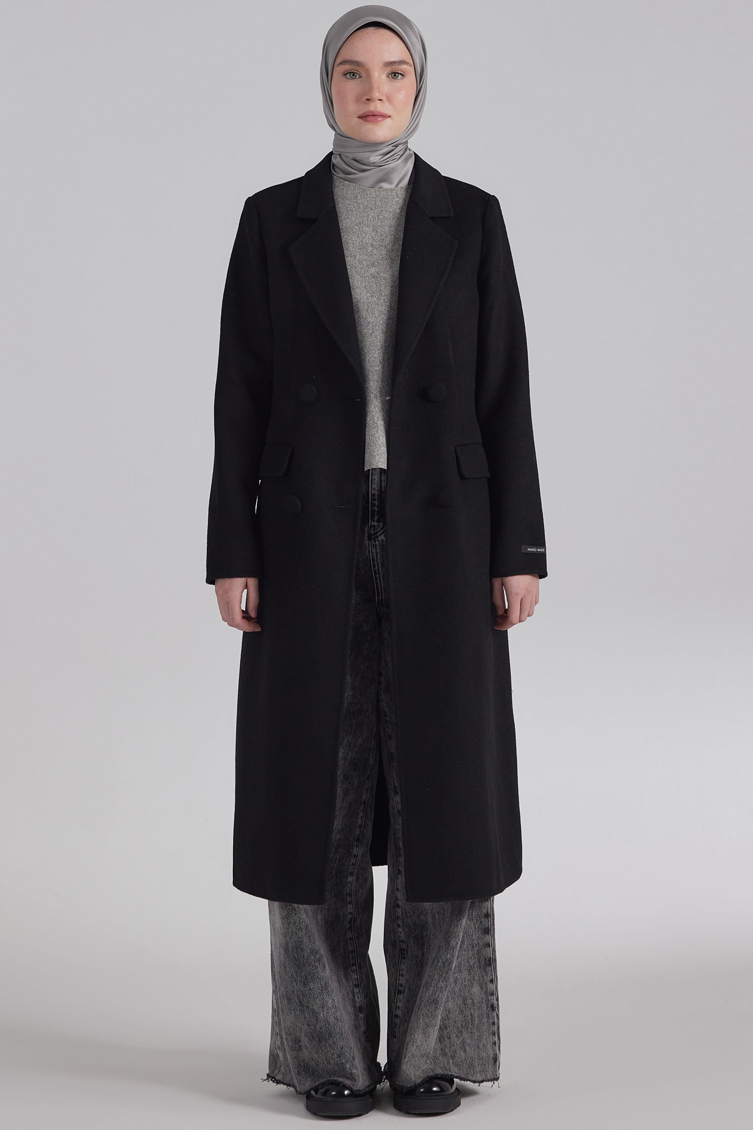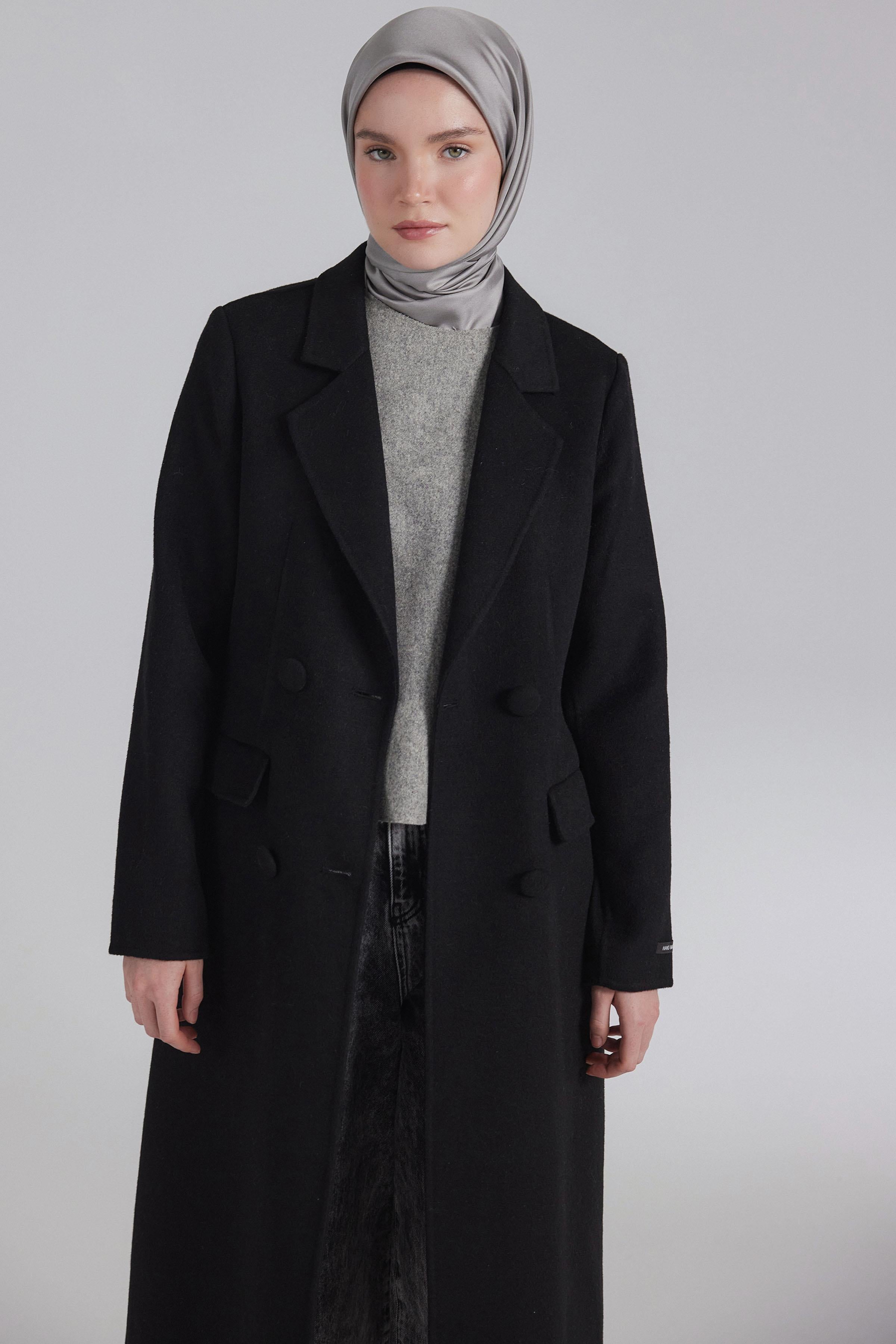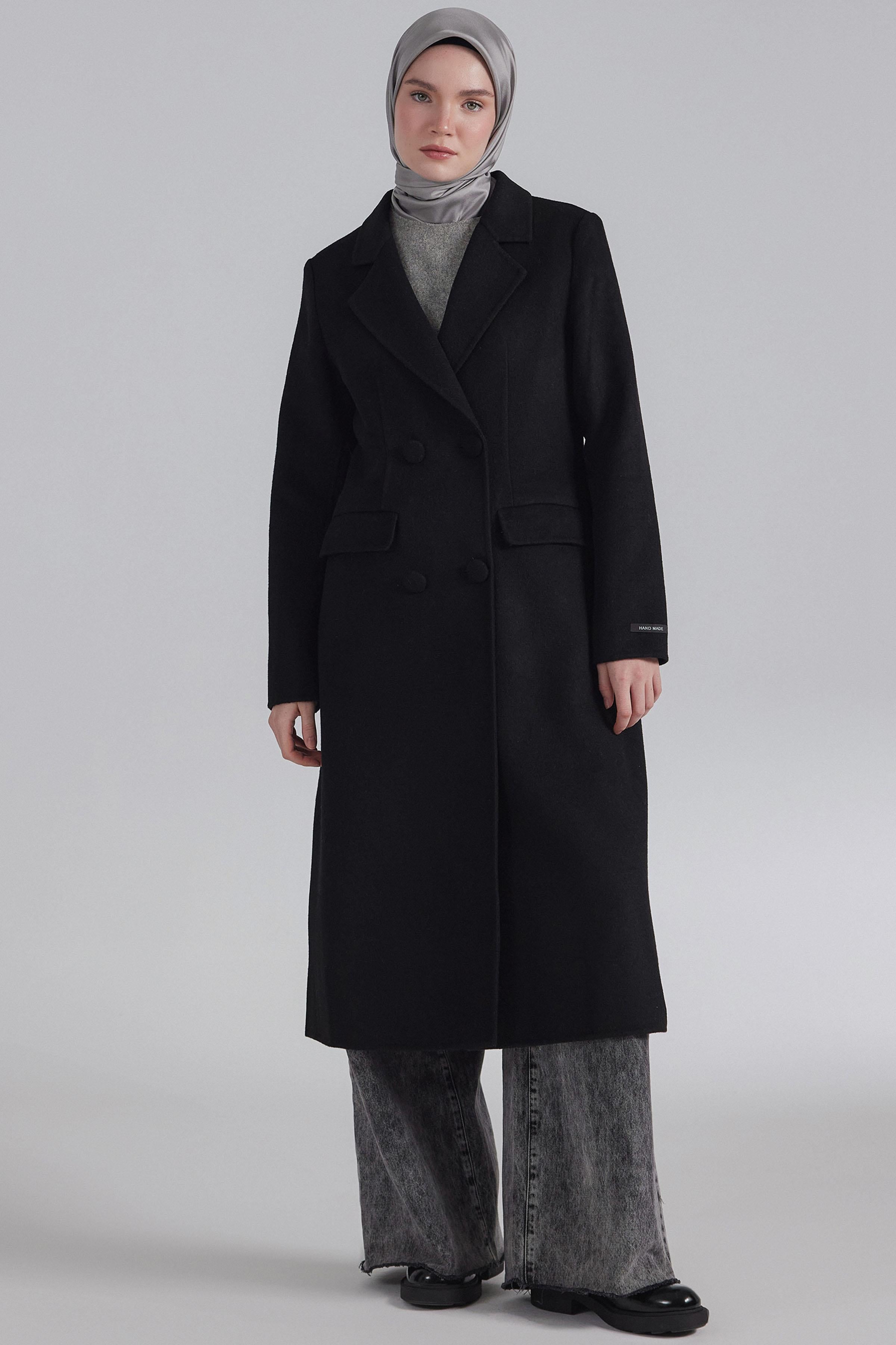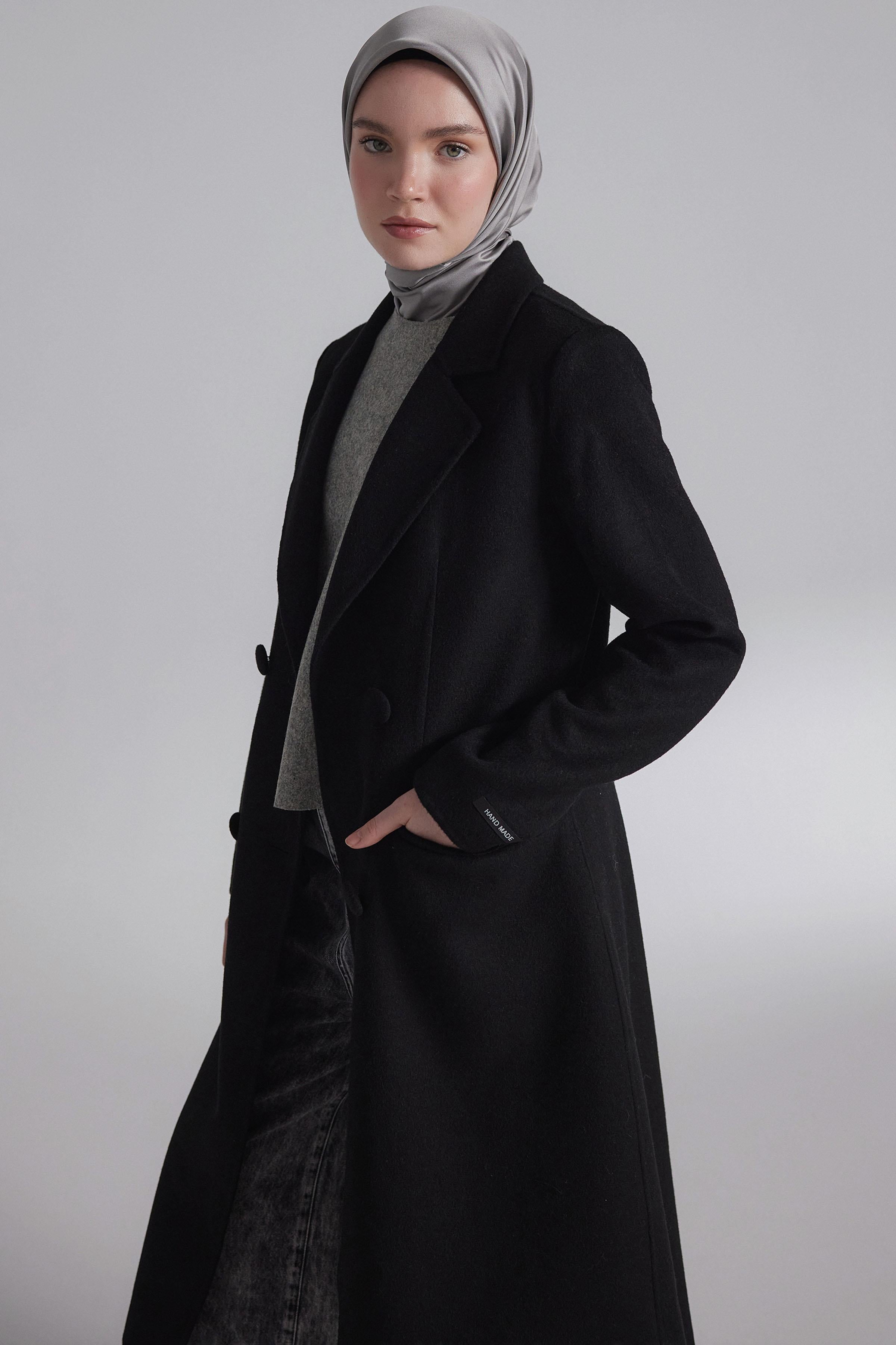 Ön bölümdeki kruvaze kapanış, bedeni daha derli toplu gösterirken tasarıma da asil bir hava katıyor. Yumuşak dokusu, düzgün omuz yapısı ve tok duruşuyla kış gardırobunun en iddialı parçalarından biri.